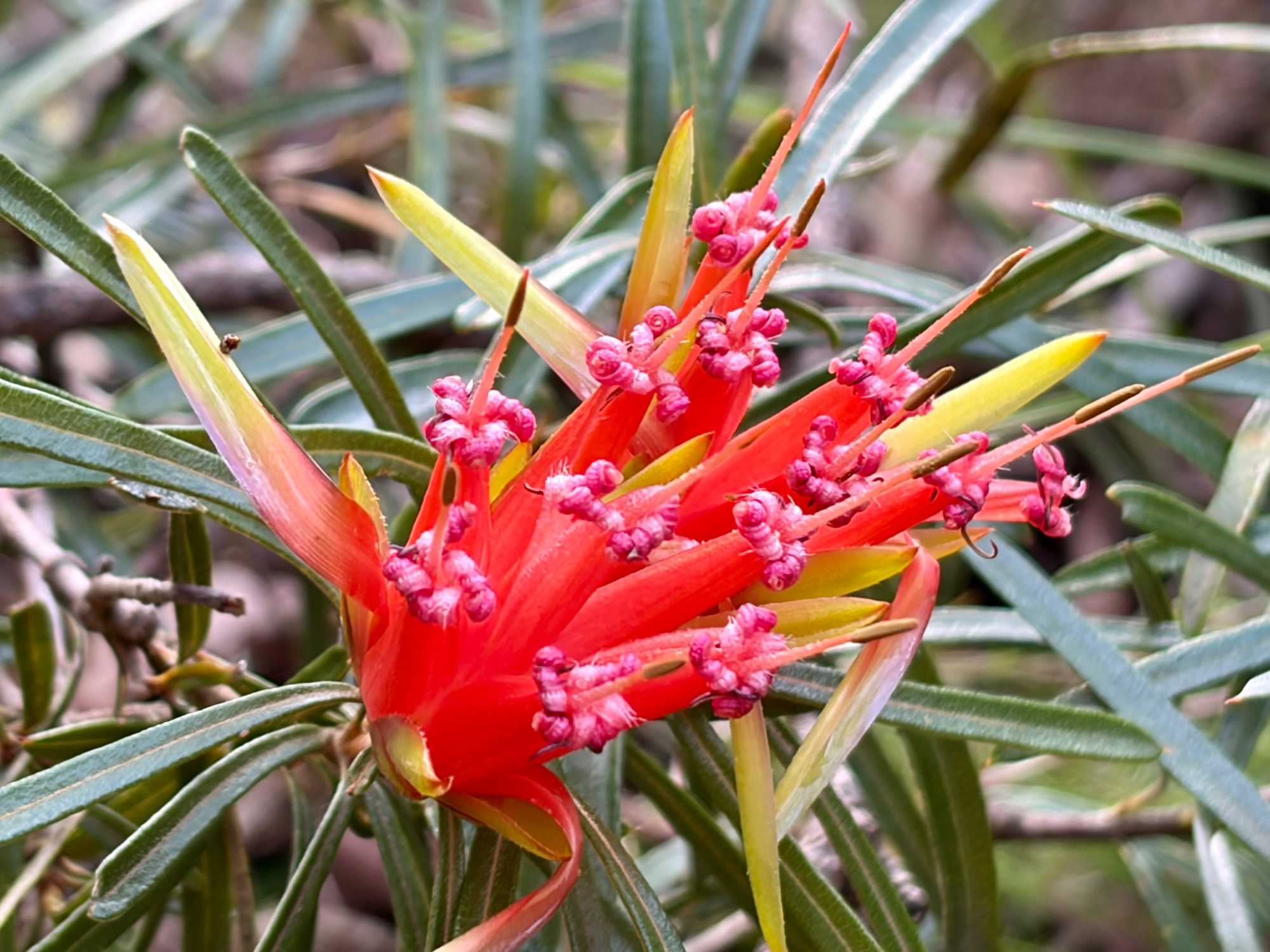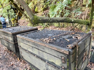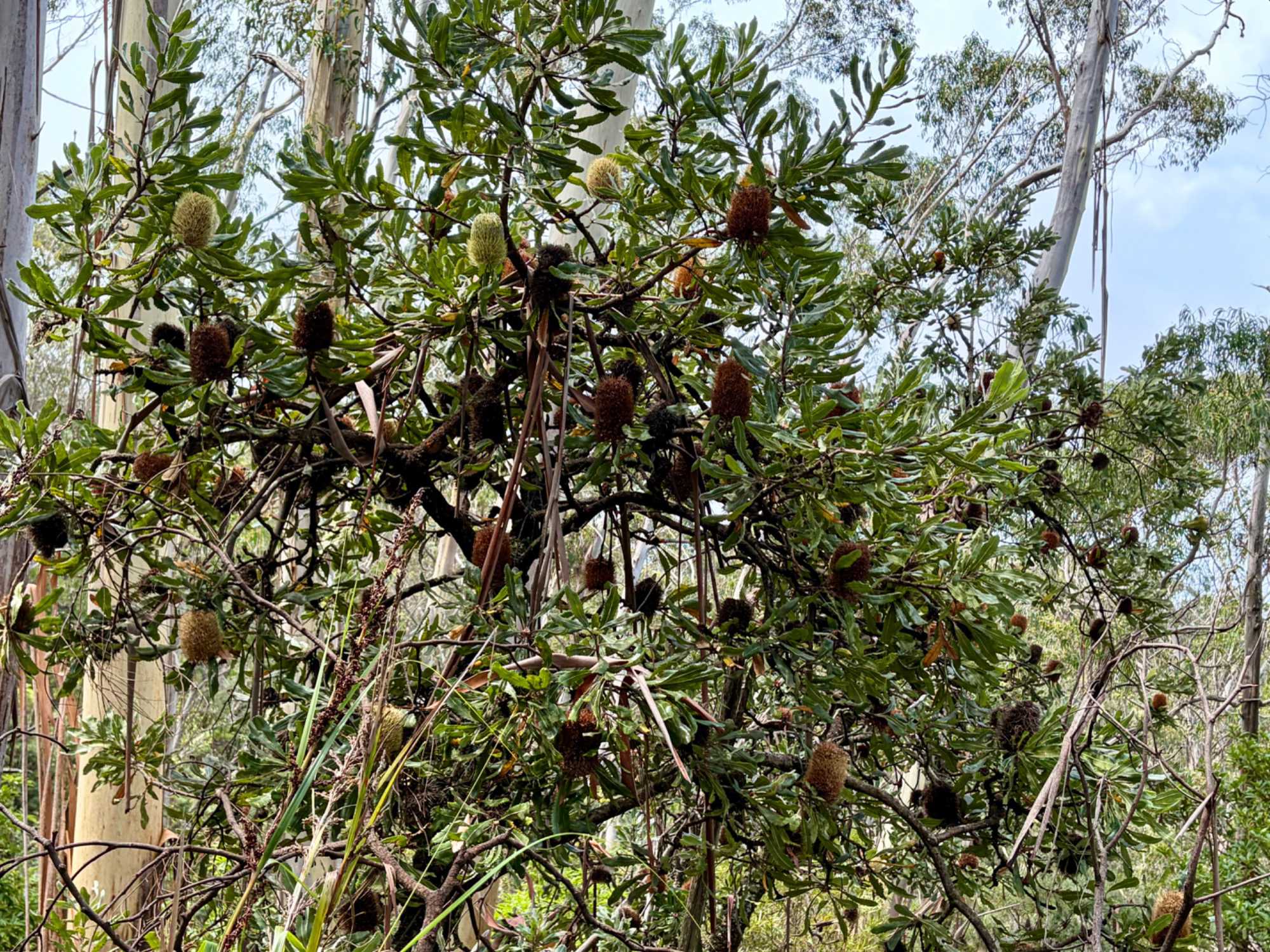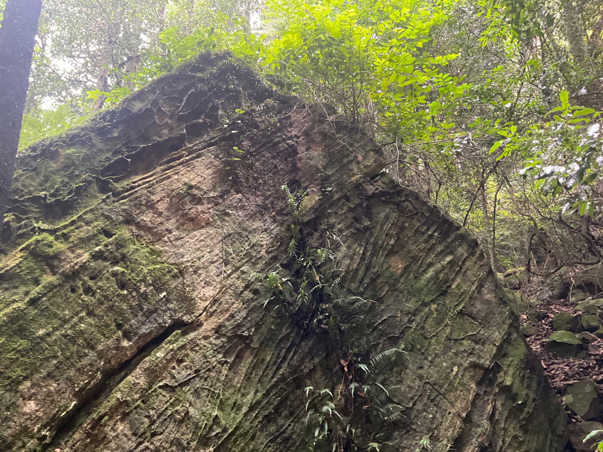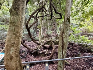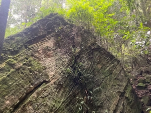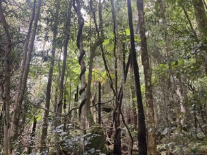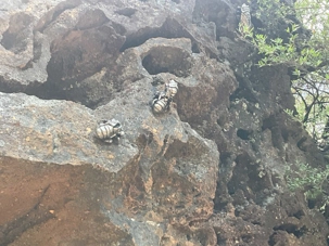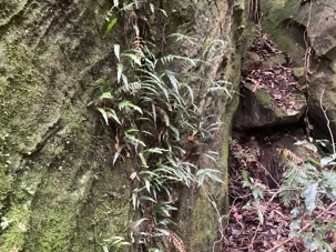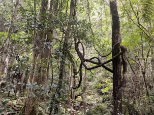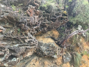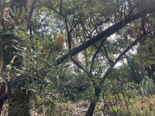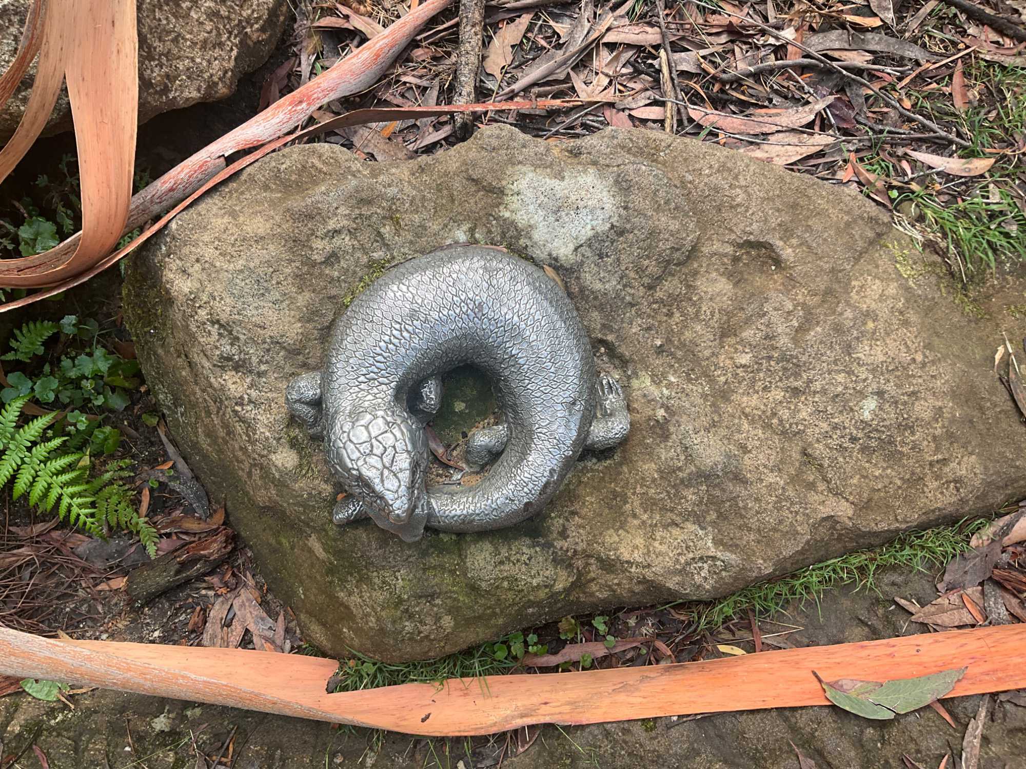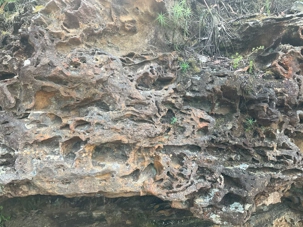 Willya nous invite donc à parcourir un petit sentier qui renferme nombre de curiosités fascinantes, comme des liannes, les racines à nue sur les rochers, des arbres présentant des cocottes … de fleurs, des sculptures miniatures en métal déposées ici et là pour nous rappeler la faune présente comme ces cigales que l’on entend