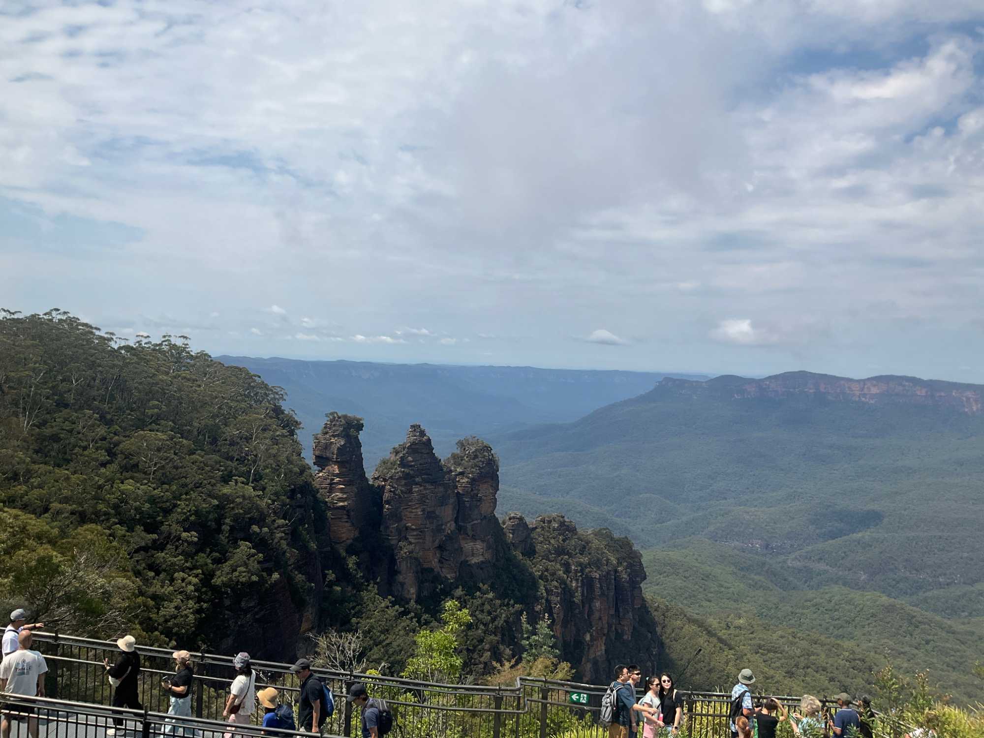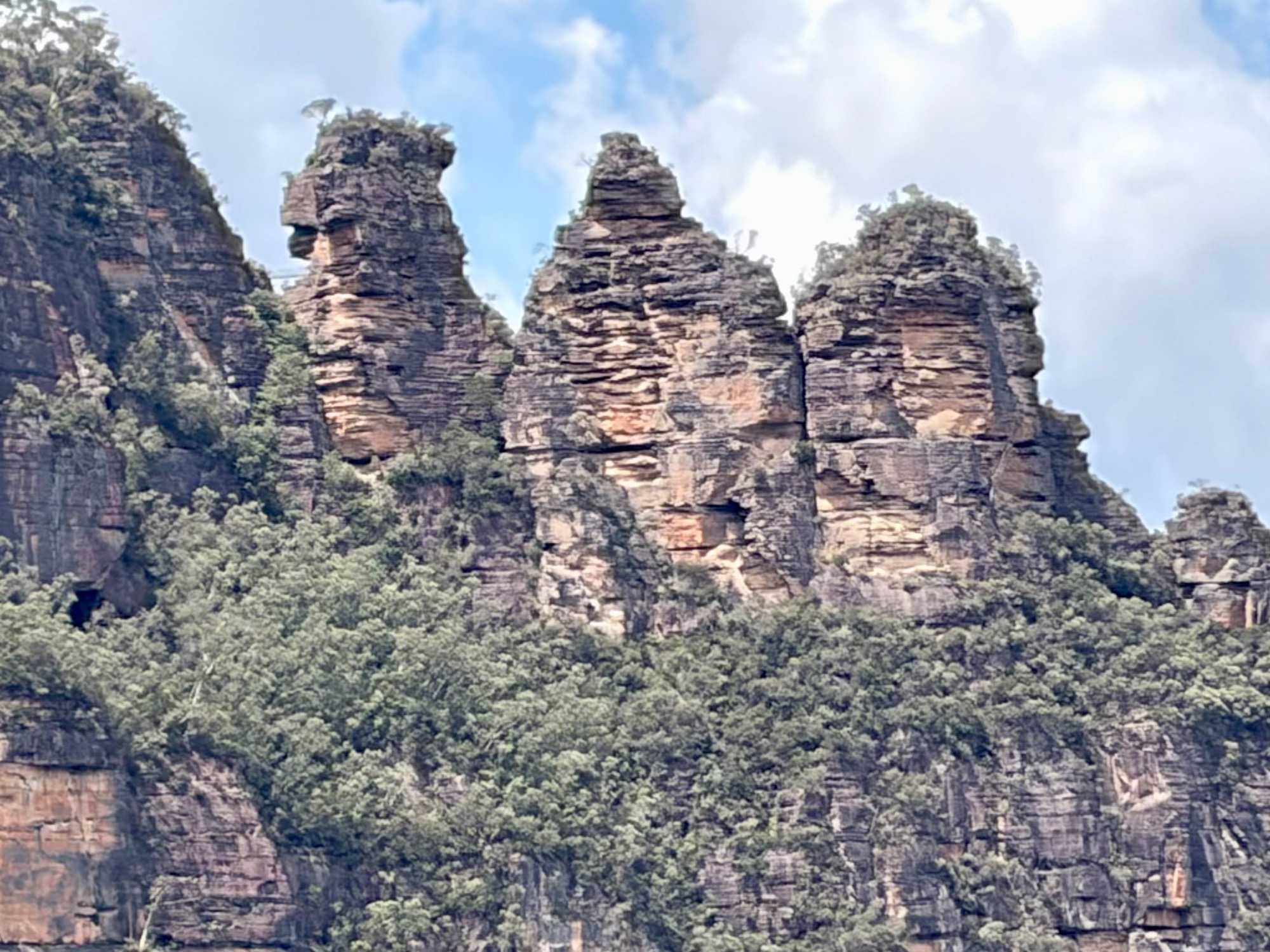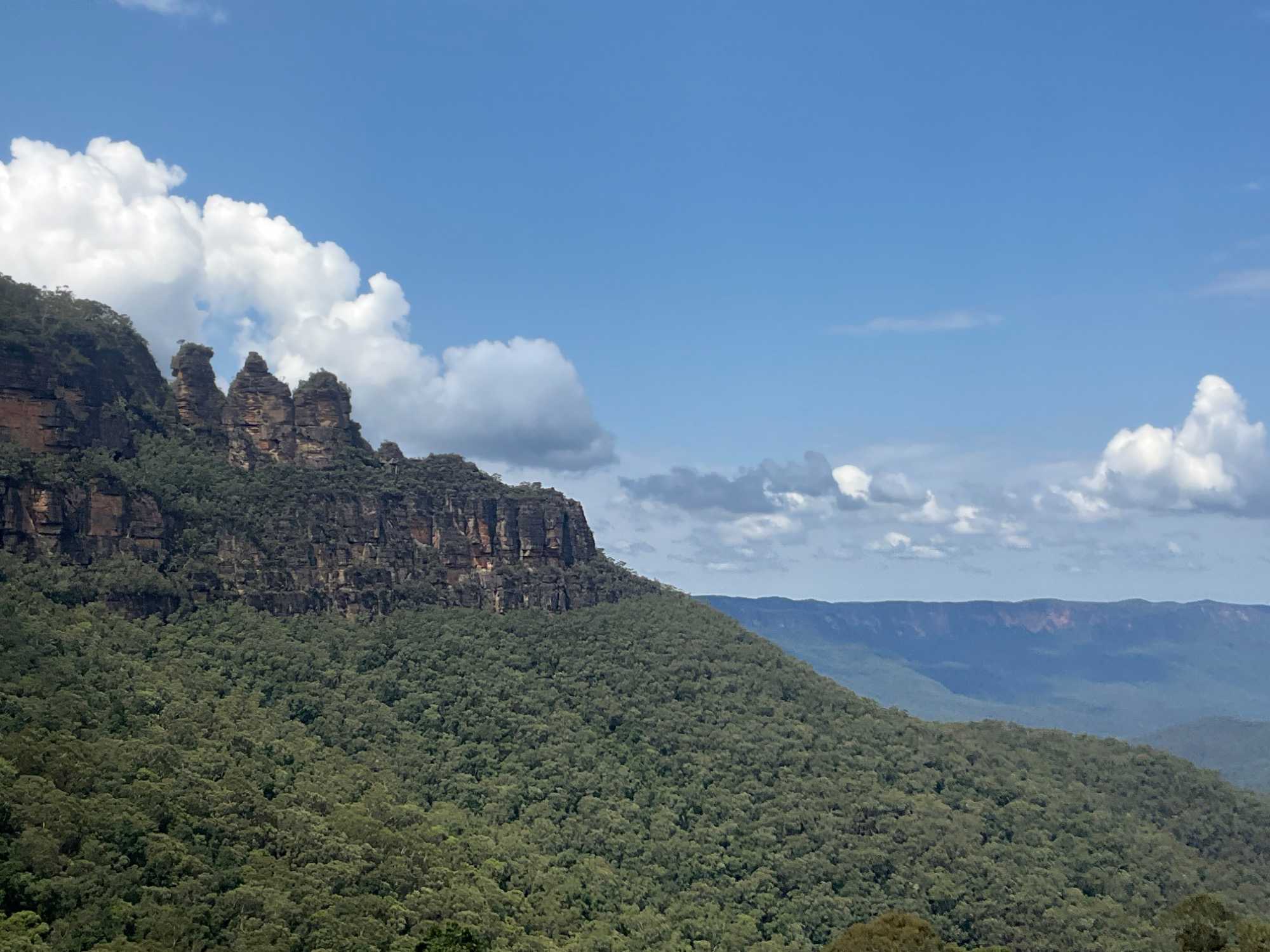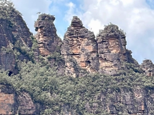 Cette formation géologique côtoie les contreforts d’une falaise surplombant la vallée Jamison. Elle se découpe sur un paysage fascinant de montagnes. Les trois rochers ont été nommés d’après les noms aborigènes de Meehni (922 m), Wimlah (918 m), et Gunnedoo (906 m). L’érosion par le vent et la pluie a façonné et modèle encore, ces trois rochers. La chaîne de montagnes de grès atteint 1111 mètres d’altitude à son point culminant, One Tree Hill, et forme une partie de la Cordillère …australienne longue de 3000 km (1436 km2 de superficie), beaucoup moins connue que sa cousine la Cordillère des ...Andes en Amérique du sud. Ce ‘’tableau naturel’’ détient le titre de l’une des plus belles vues panoramiques d’Australie. Elles étaient là, dans toute leur majesté. Une formation rocheuse incomparable.