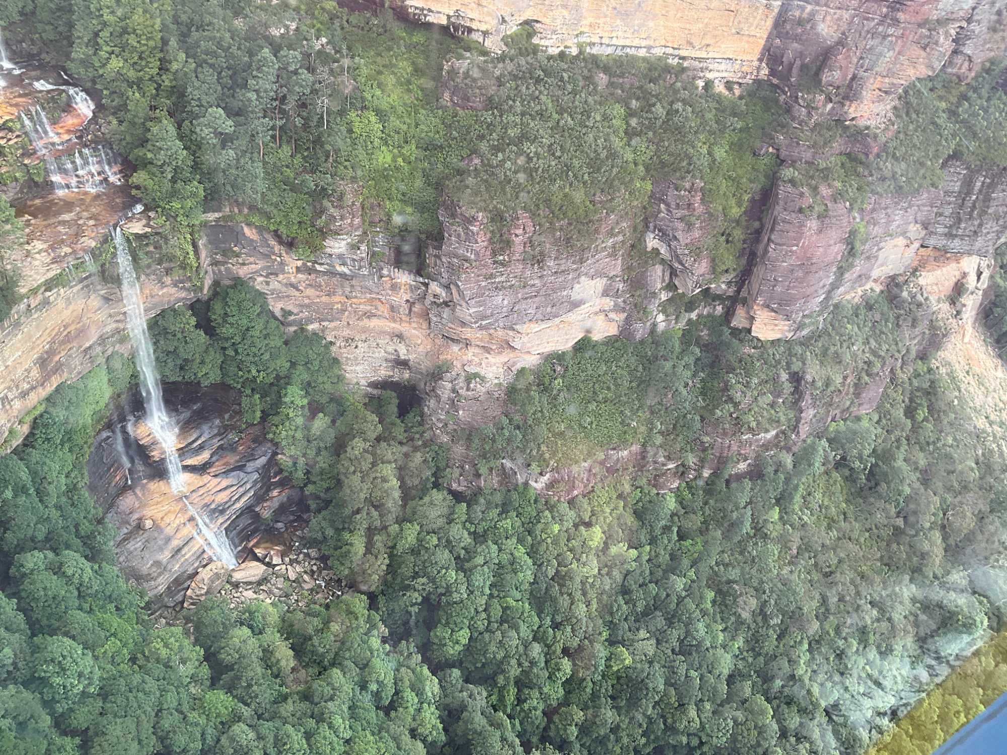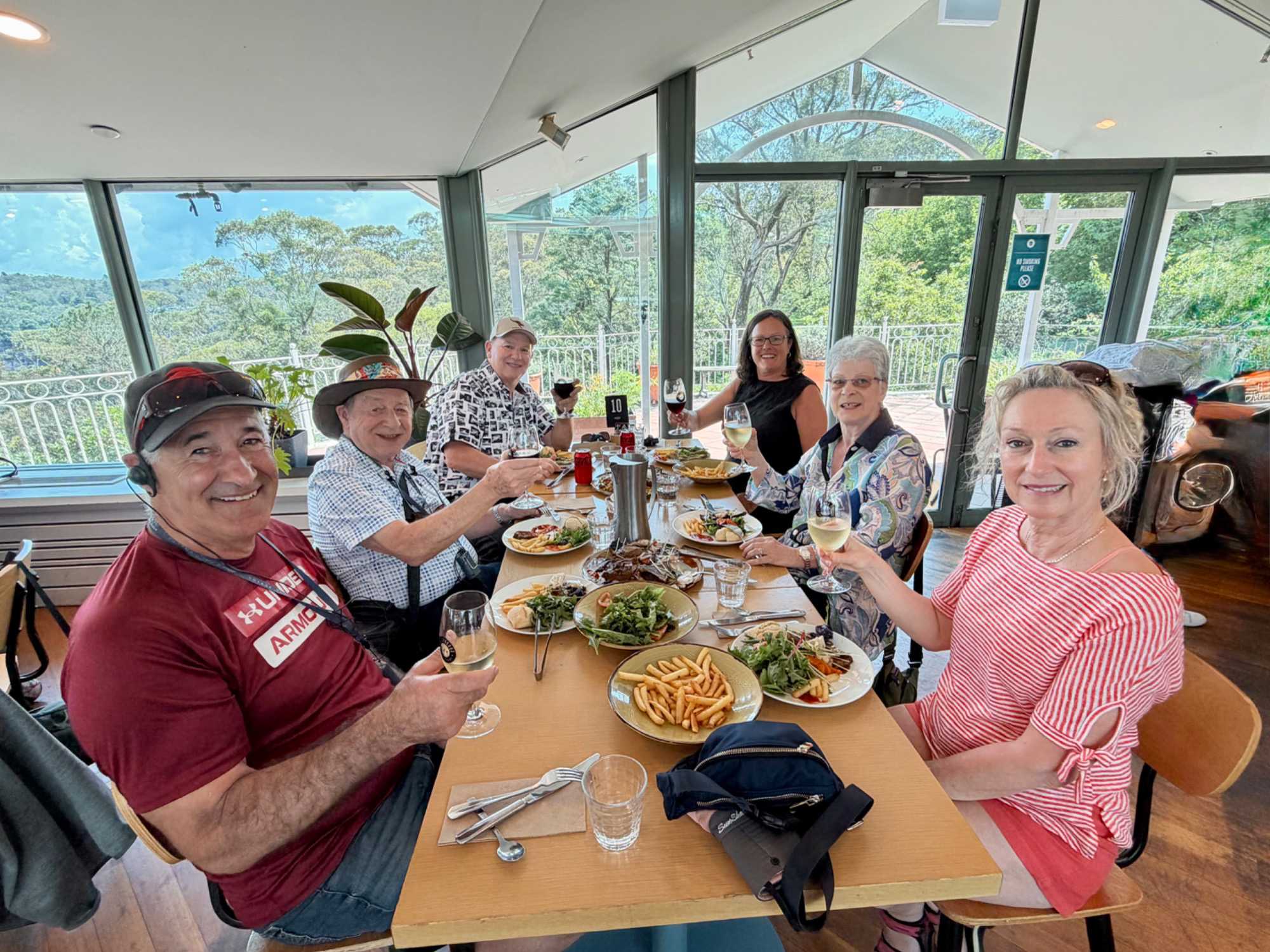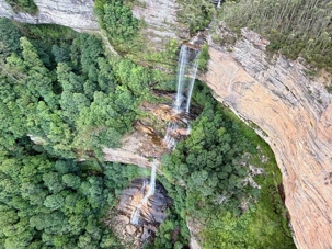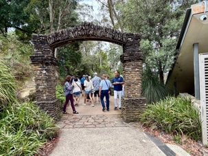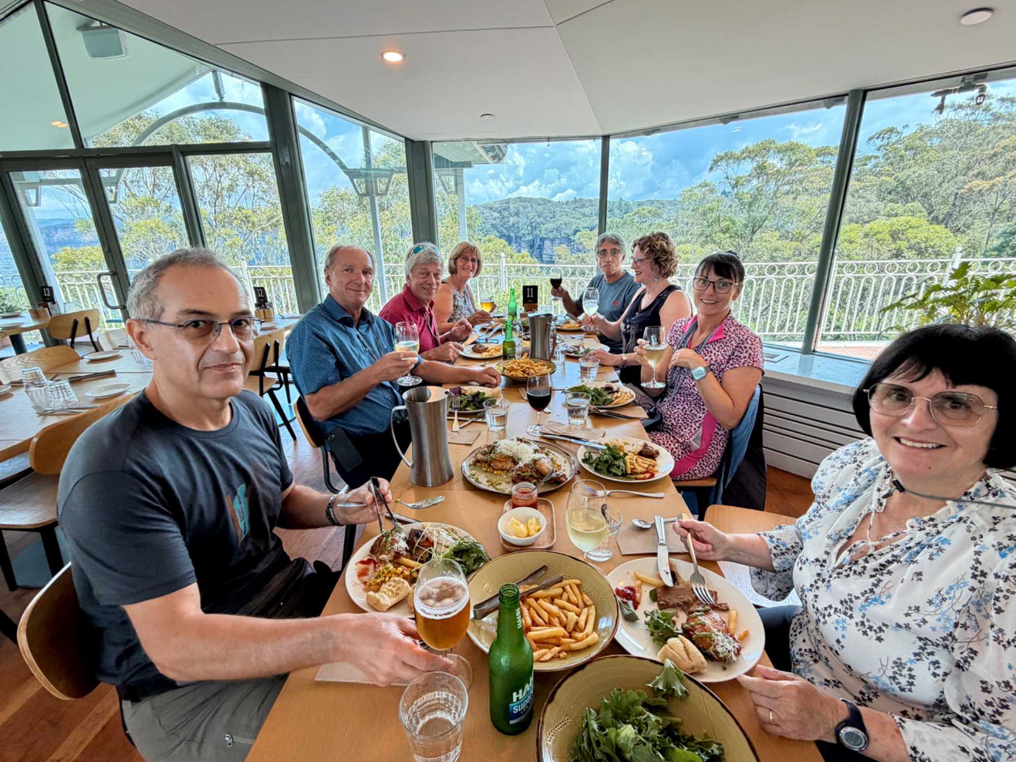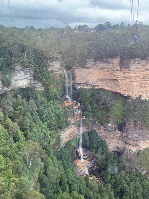 Notre guide nous a invité à descendre la falaise ayant la pente la plus raide au monde …n’ayez crainte, personne d’entre nous n’est alpiniste alors nous optons pour… cet espèce de funiculaire. Selon le Livre Guinness des records, ce funiculaire qui ressemble en fait à un train, serait le plus incliné au monde. Construit entre 1878 et 1900, il servit pour le transport du charbon de la mine de Katoomba. Il descend de 415 mètres sur des falaises de grès, via un tunnel au gradient impressionnant : 52 degrés. Les petits cœurs de certains de nos voyageurs ont eu quelques joyeuses palpitations. En bas, un sentier nous invitait à explorer la magnifique forêt avec ses arbres immenses, ses pannneaux didactiques sur cet ancien lieu minier où de vieux outils furent reconnus par les hommes du groupe, divertissant. Pour ajouter à notre expérience et voir la montagne sous un autre volet, nous sommes remontés par la télécabine au format impressionnant en quelques minutes seulement. Puis, pendant que certains ou plutôt “certaines “ magasinaient, d’autres ont traversé la gorge en téléphérique qui nous a permis d’apprécier la gorge dans toute sa splendeur et de voir l’étroite mais très haute cascade discrètement déposé dans le paysage. Willya a su nous dévoiler tous les secrets de ces Montagnes bleues à la végétation luxuriante, ses oiseaux envoûtants aux couleurs éclatantes, ses gorges impressionnantes.