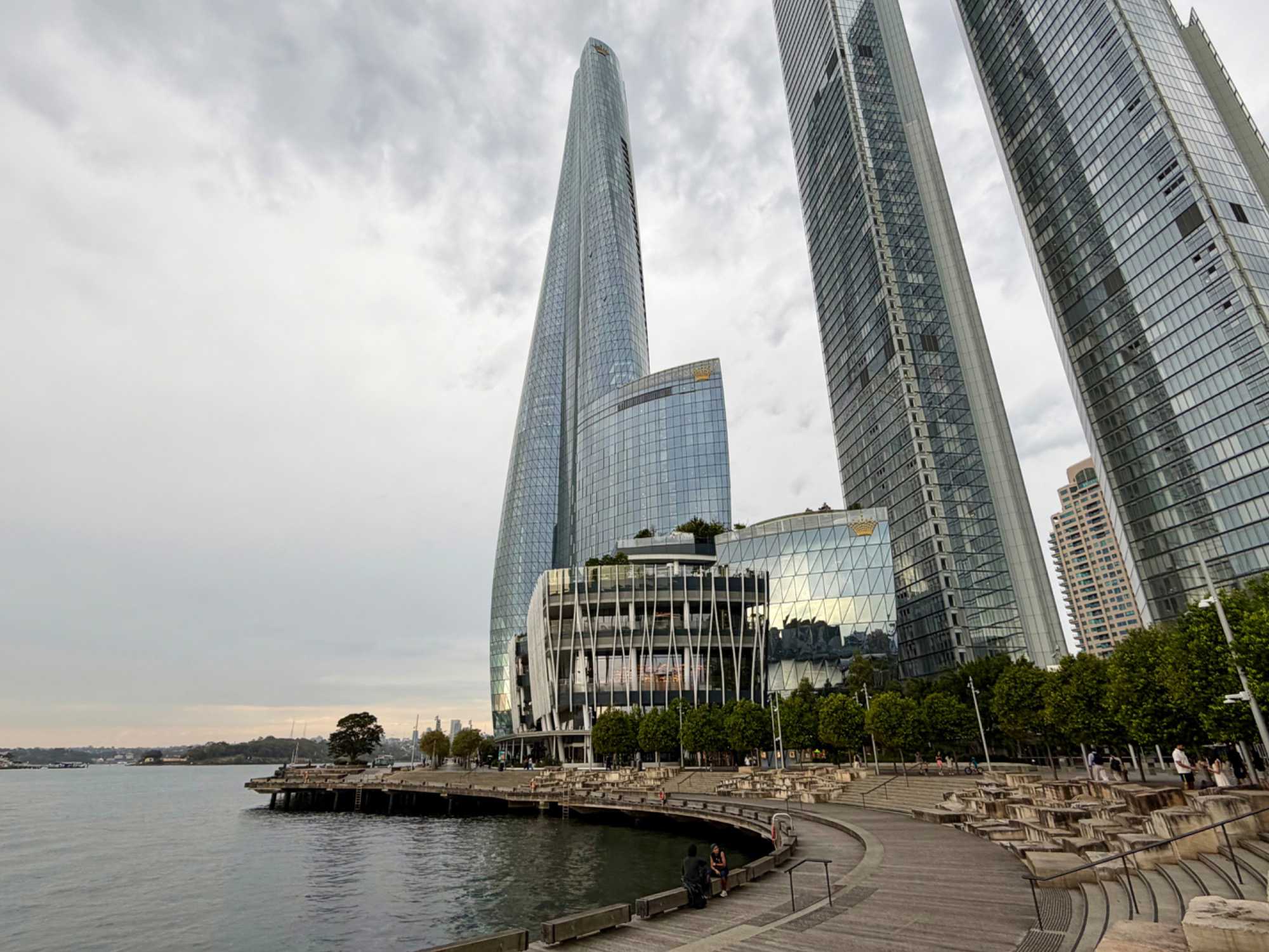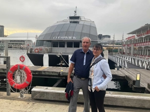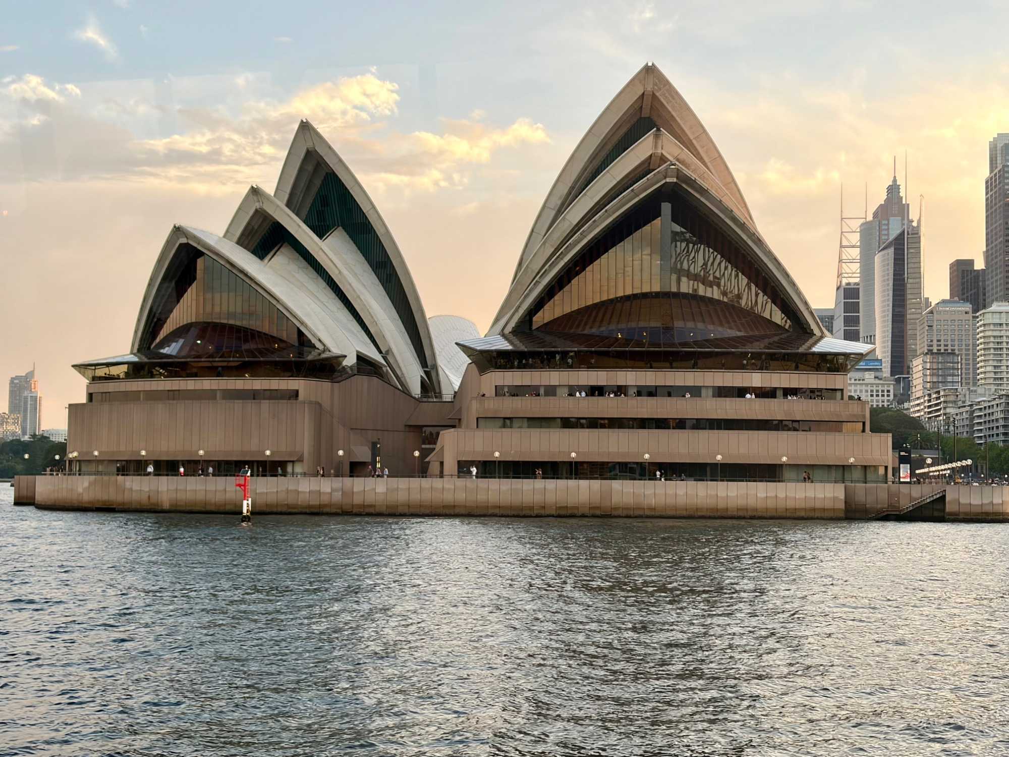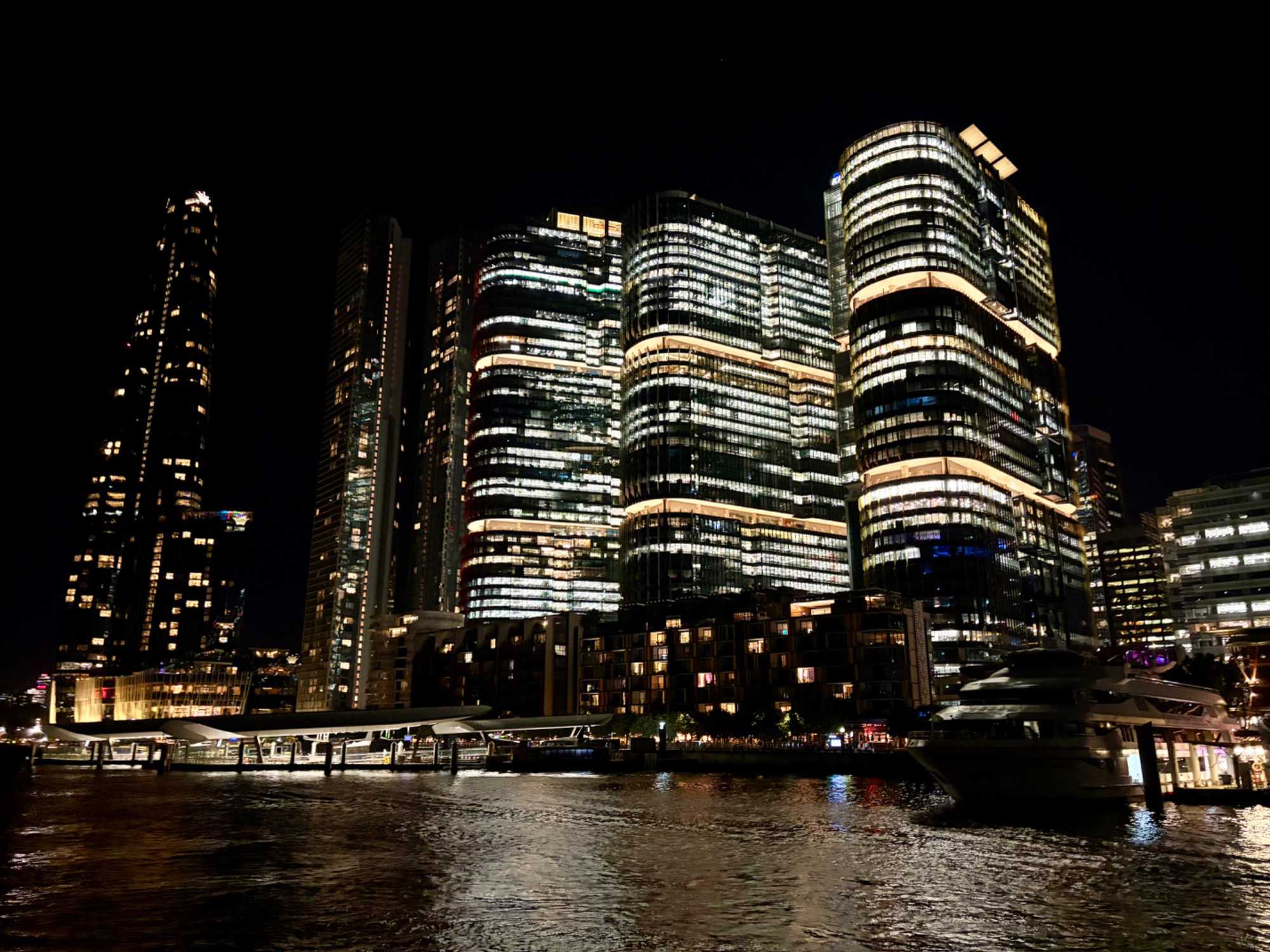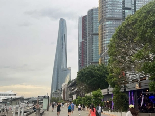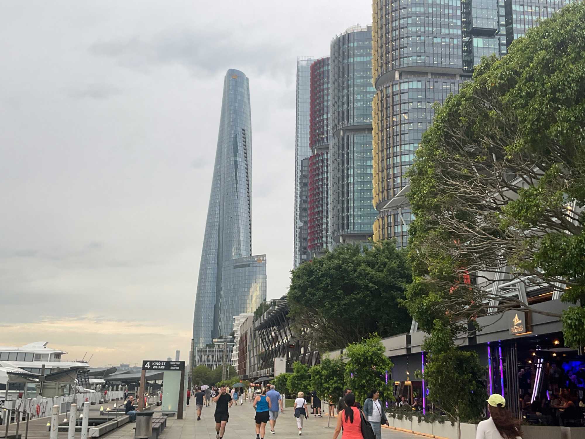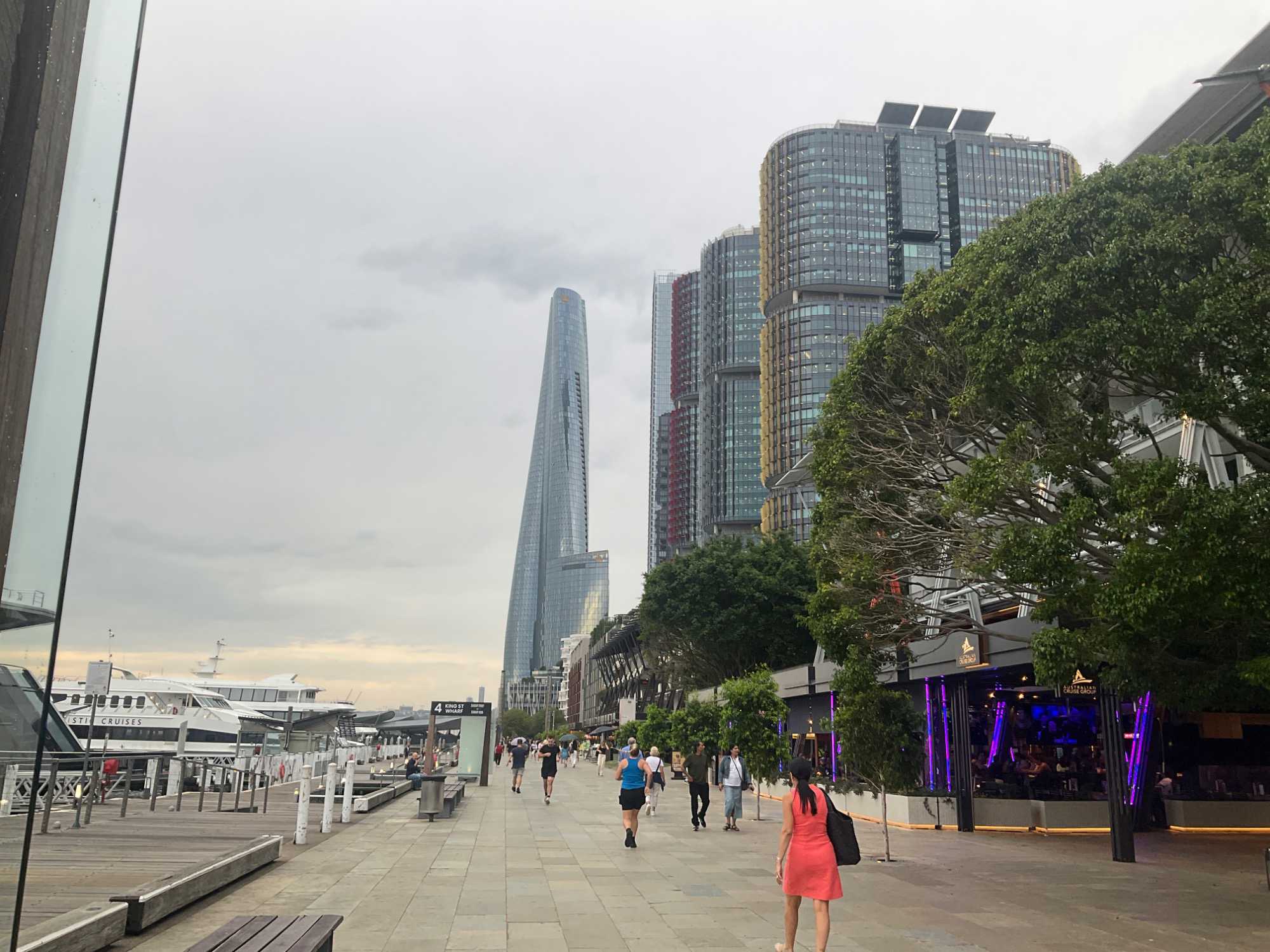 En après-midi, en route pour notre retour à Sydney en deux heures de trajet car nous devrons faire vite pour déposer nos sacs à l’hôtel et atteindre le centre-ville pour notre sortie de ce soir, un souper-croisière à bord du tout nouveau et splendide Clearview Glassboat pour voir Sydney au coucher de soleil. 18:15, nous sommes fidèles pour notre rendez-vous. La température est sublime: ensoleillée, 30 degrés Celsius, aucun vent, un ciel gris bleu à l’horizon. Comme nous sommes en avance, notre guide ne perds pas une seconde et nous invite à faire une balade le long de la marina. Les gratte-ciels rivalisent entre eux en terme de style, de modernité, de hauteur, de richesse et de verre. On se dirige droit vers eux et la guide nous fait entrer au casino où la valeur minimale de la mise est de …5 000 dollars. Ça nous a fait plaisir de le voir mais…on est sorti. On préfère la balade. L’endroit est magnifique pour ses restaurants bondés de clients même au milieu de cette semaine.