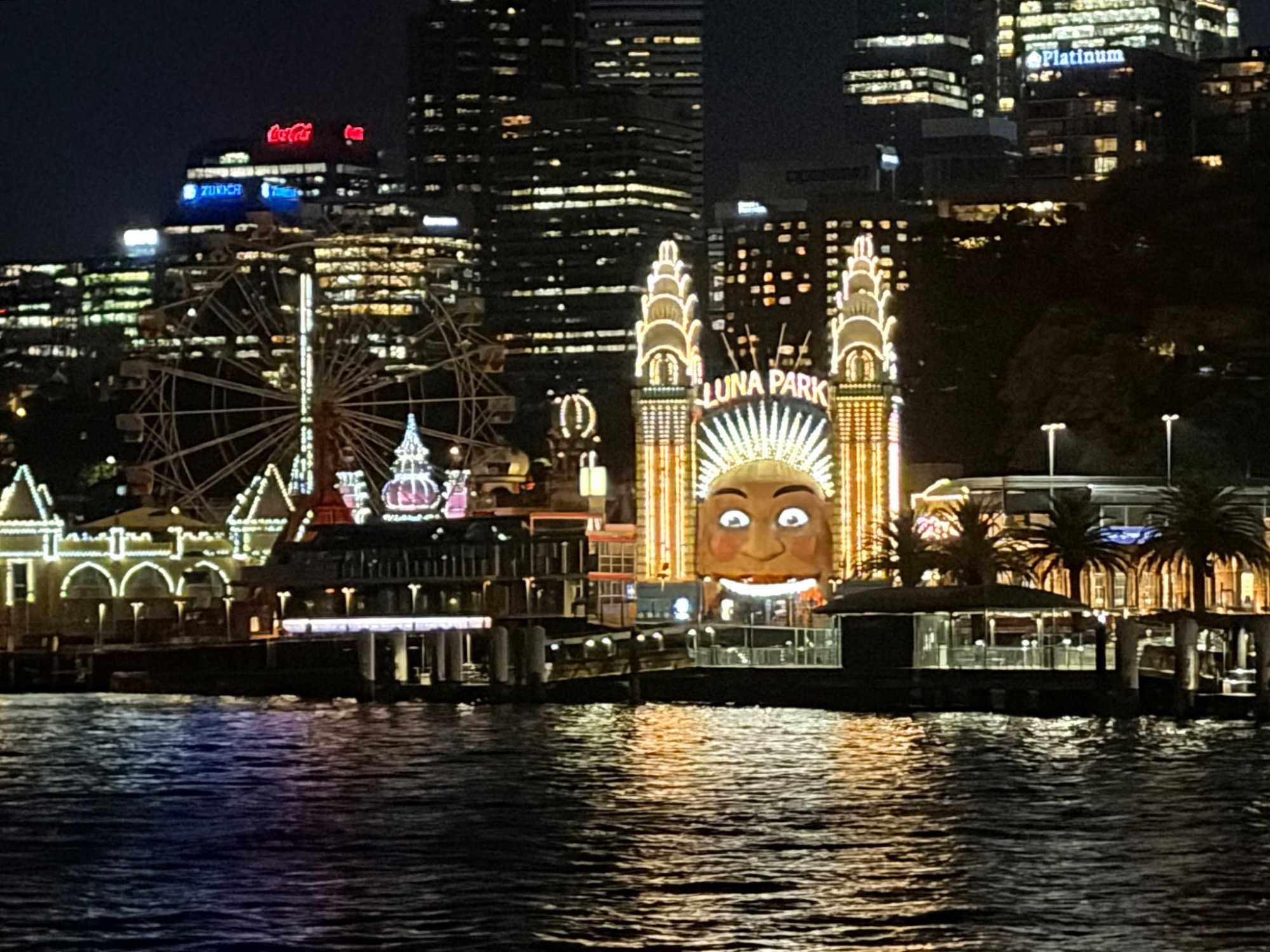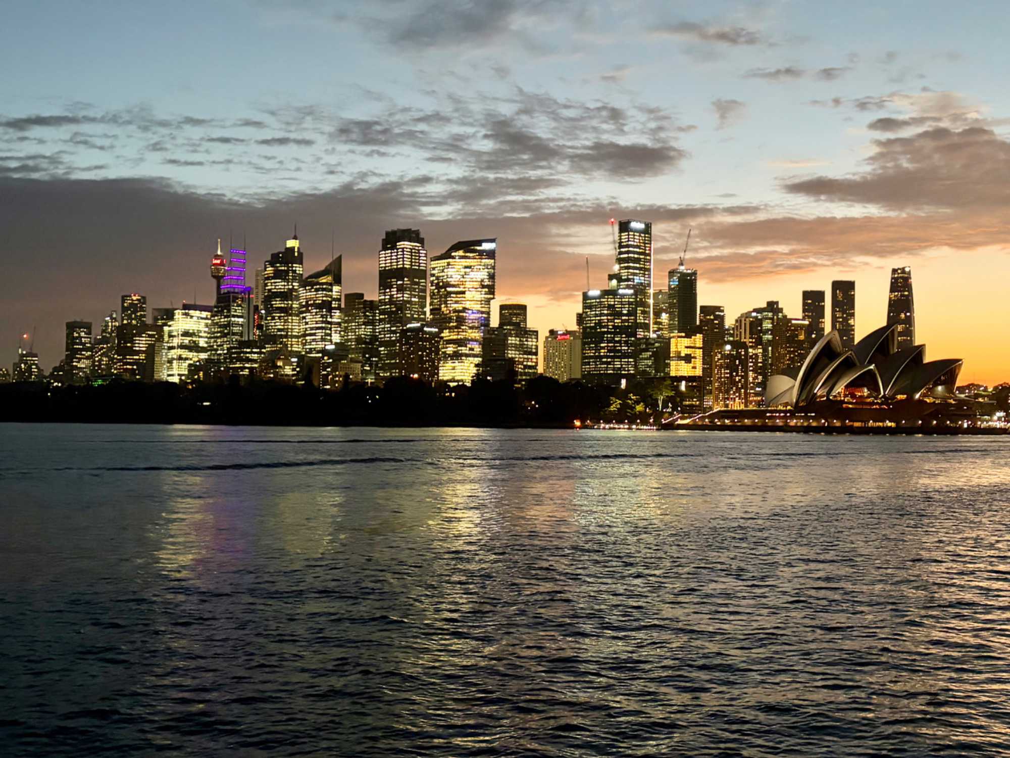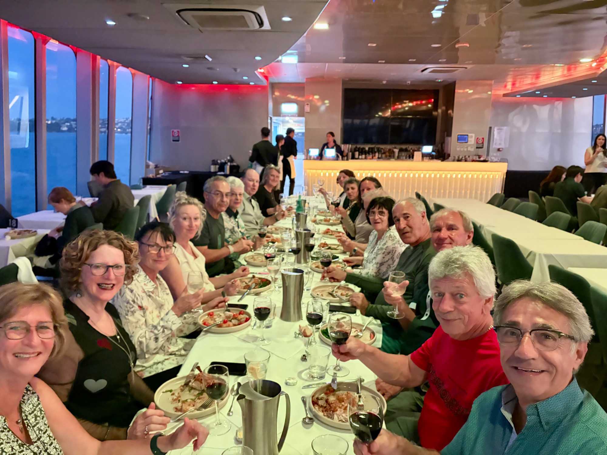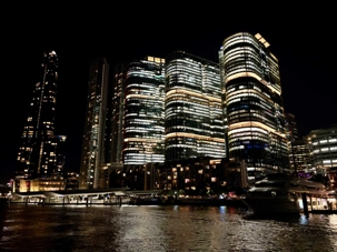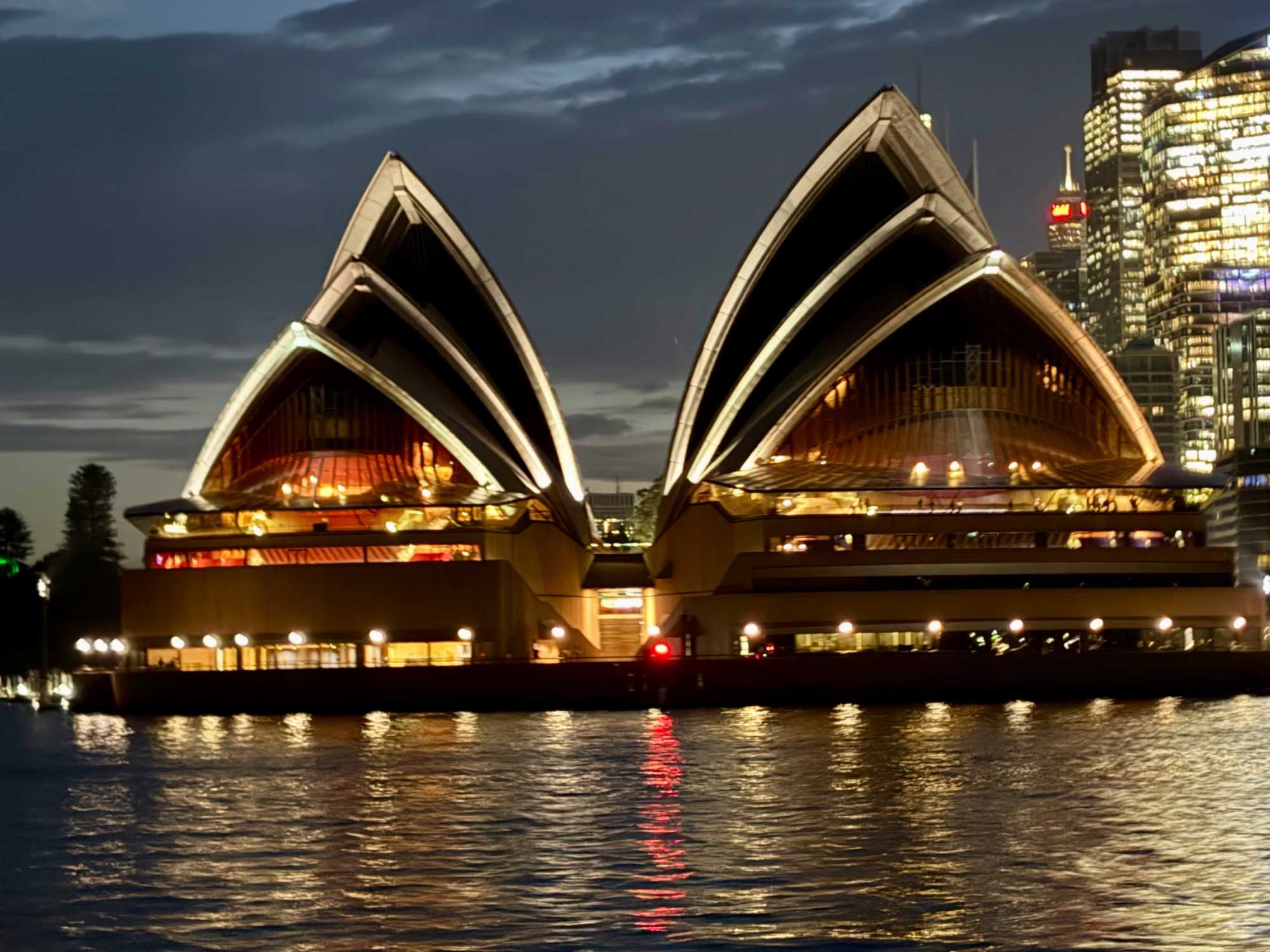 Le navire nous accueille, et c’est un départ… mousseux en main. Les entrées de fruits de mer sont succulentes et les présentations superbes. Cette prestation de premier plan nous dirige vers l'Opéra sous un autre angle, tout illuminé, le Circular Quay, les Rocks, accompagné du pont Harbour Bridge et… du soleil couchant. Un spectacle inouï d’attractions emblématiques de Sydney illuminées la nuit. Oui oui, toutes les photos de vos amies et parents seront de vrais clichés, non retravaillés, ne vous manquera que notre ivresse (non pas à cause des bulles) du moment présent. Ce repas gastronique de cinq services nous a permis de découvrir la subtilité des saveurs australiennes et de tout ce qu'on peut concocter en cuisine, poissons, poulet dans toutes ses subtilités avec les vins en accord qui accompagnait chacun des plats. On était comme les oiseaux vus au cours de la journée, ça jacassait les yeux rivés sur les gratte-ciels de la ville, le petit cirque, les plans d'eau et les lumières qui présentaient la ville de Sydney sous ses meilleurs angles. L’Opéra sous la nuit demeure notre coup de coeur. Nous avons également eu droit à un service exceptionnel. Un savoir-faire d'une grande qualité. Un autre bon repas en sol australien. Une soirée magique qui s’est terminé par un feu d’artifice devant nous! Un chausson avec ça?