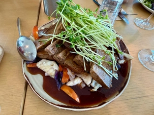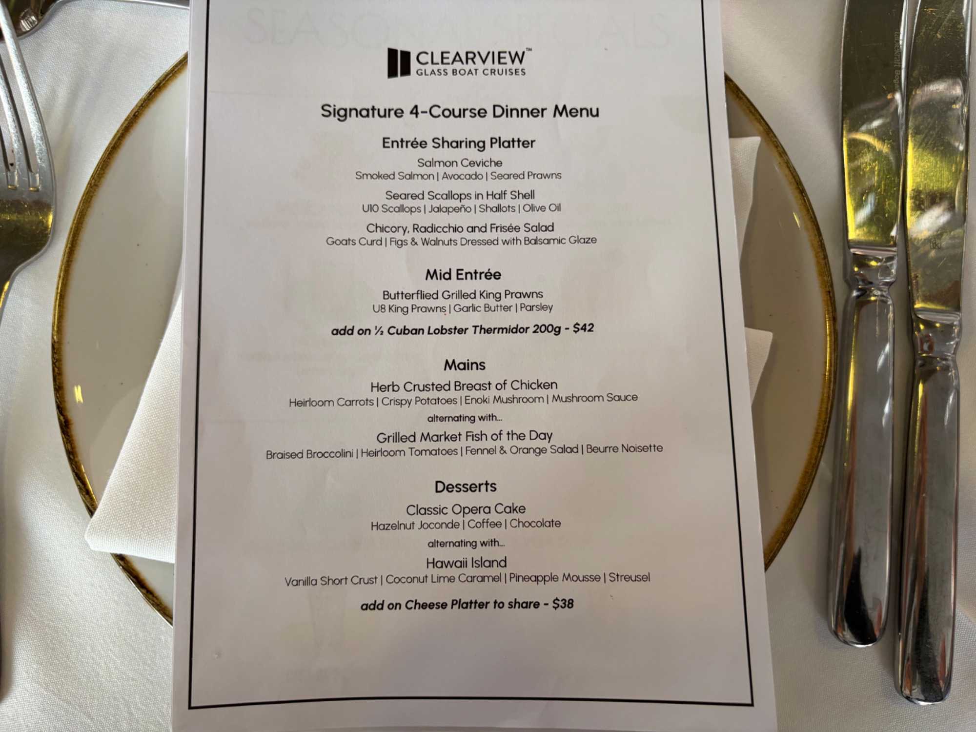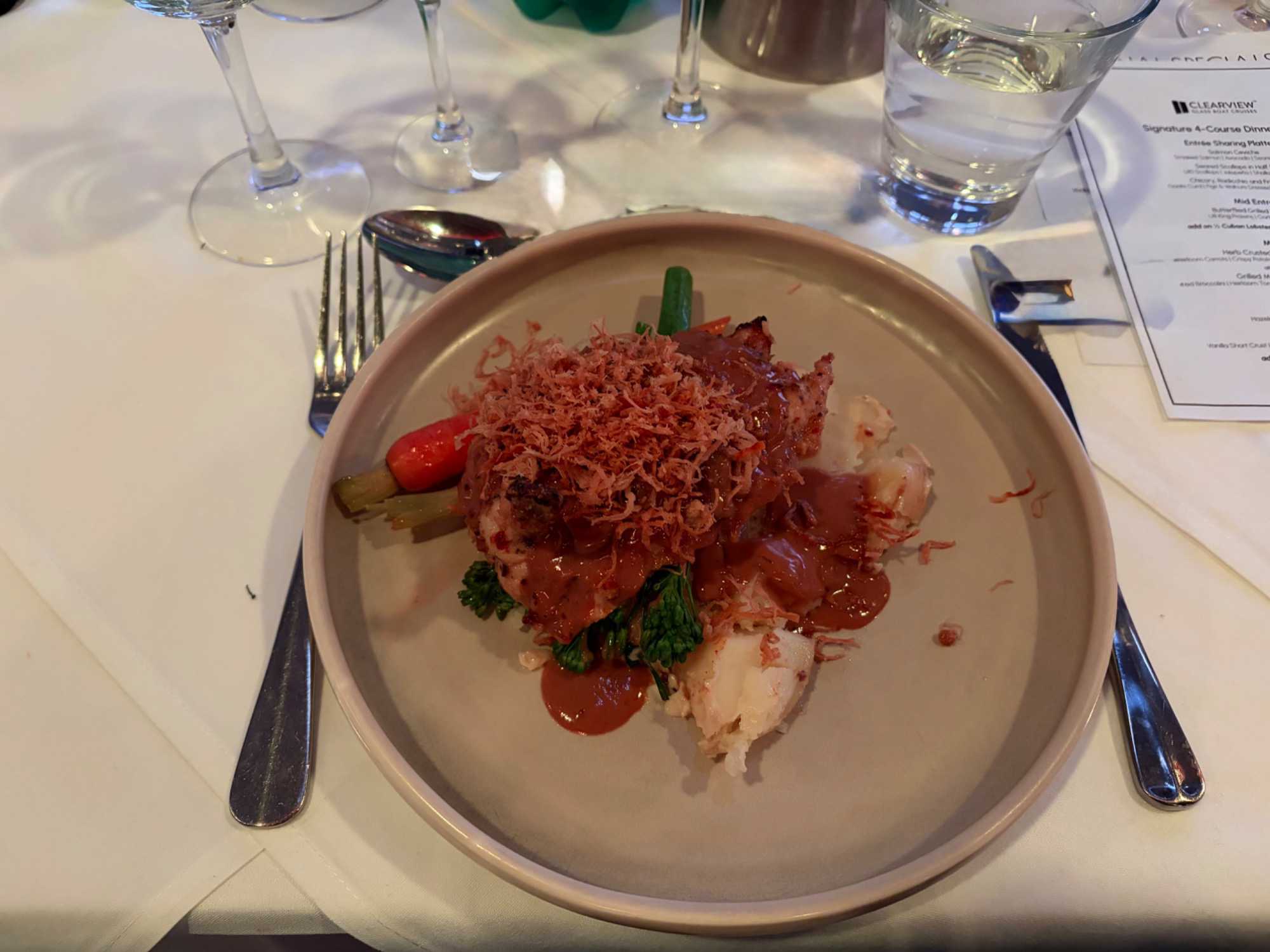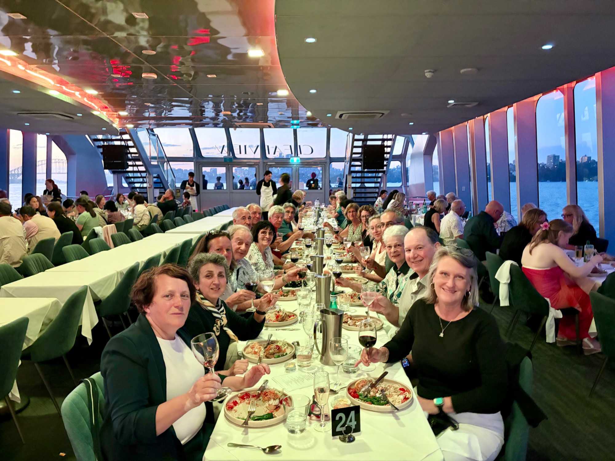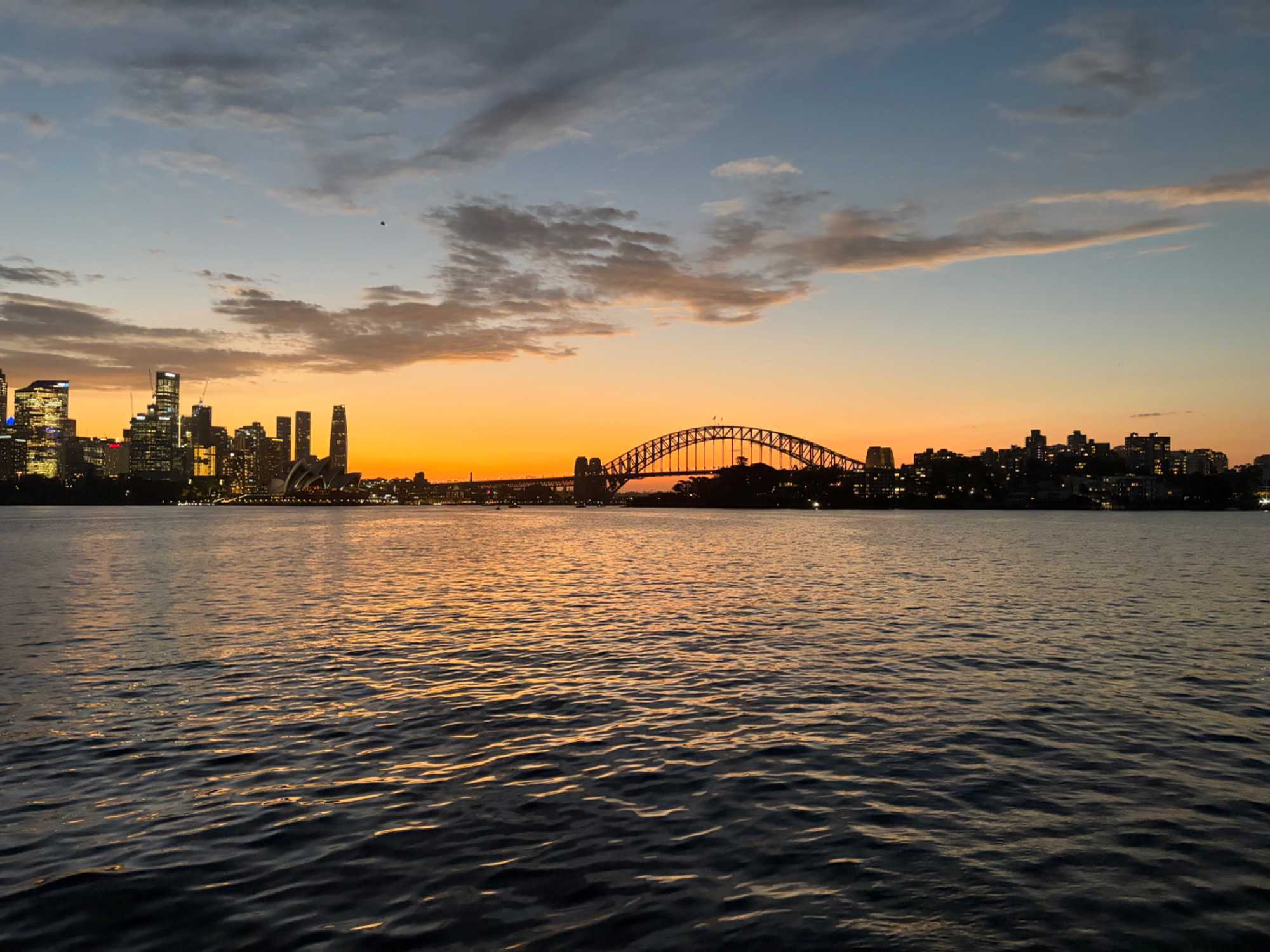 Le navire nous accueille, et c’est un départ… mousseux en main. Les entrées de fruits de mer sont succulentes et les présentations superbes. Cette prestation de premier plan nous dirige vers l'Opéra sous un autre angle, tout illuminé, le Circular Quay, les Rocks, accompagné du pont Harbour Bridge et… du soleil couchant. Un spectacle inouï d’attractions emblématiques de Sydney illuminées la nuit. Oui oui, toutes les photos de vos amies et parents seront de vrais clichés, non retravaillés, ne vous manquera que notre ivresse (non pas à cause des bulles) du moment présent. Ce repas gastronique de cinq services nous a permis de découvrir la subtilité des saveurs australiennes et de tout ce qu'on peut concocter en cuisine, poissons, poulet dans toutes ses subtilités avec les vins en accord qui accompagnait chacun des plats. On était comme les oiseaux vus au cours de la journée, ça jacassait les yeux rivés sur les gratte-ciels de la ville, le petit cirque, les plans d'eau et les lumières qui présentaient la ville de Sydney sous ses meilleurs angles. L’Opéra sous la nuit demeure notre coup de coeur. Nous avons également eu droit à un service exceptionnel. Un savoir-faire d'une grande qualité. Un autre bon repas en sol australien. Une soirée magique qui s’est terminé par un feu d’artifice devant nous! Un chausson avec ça?