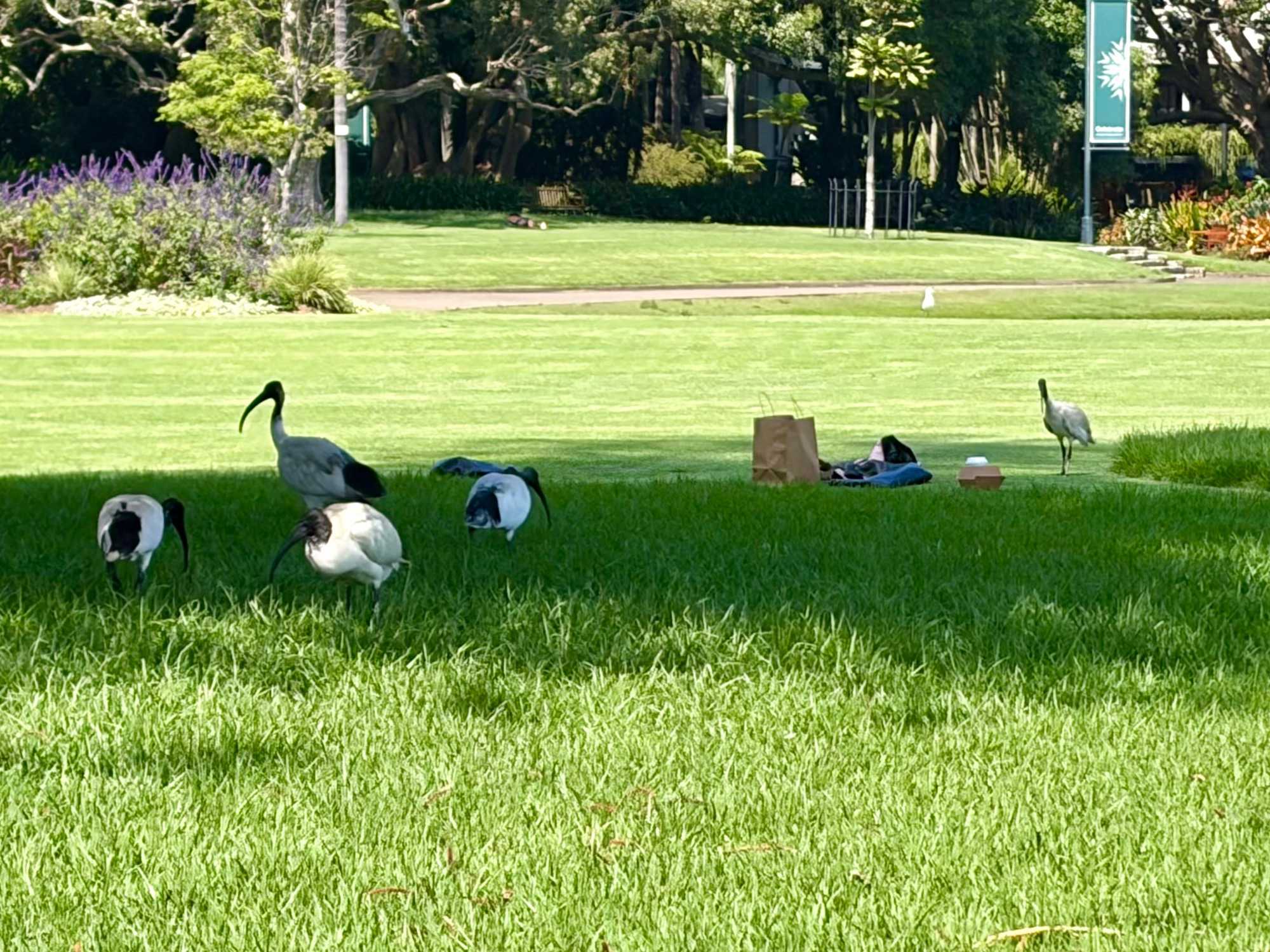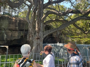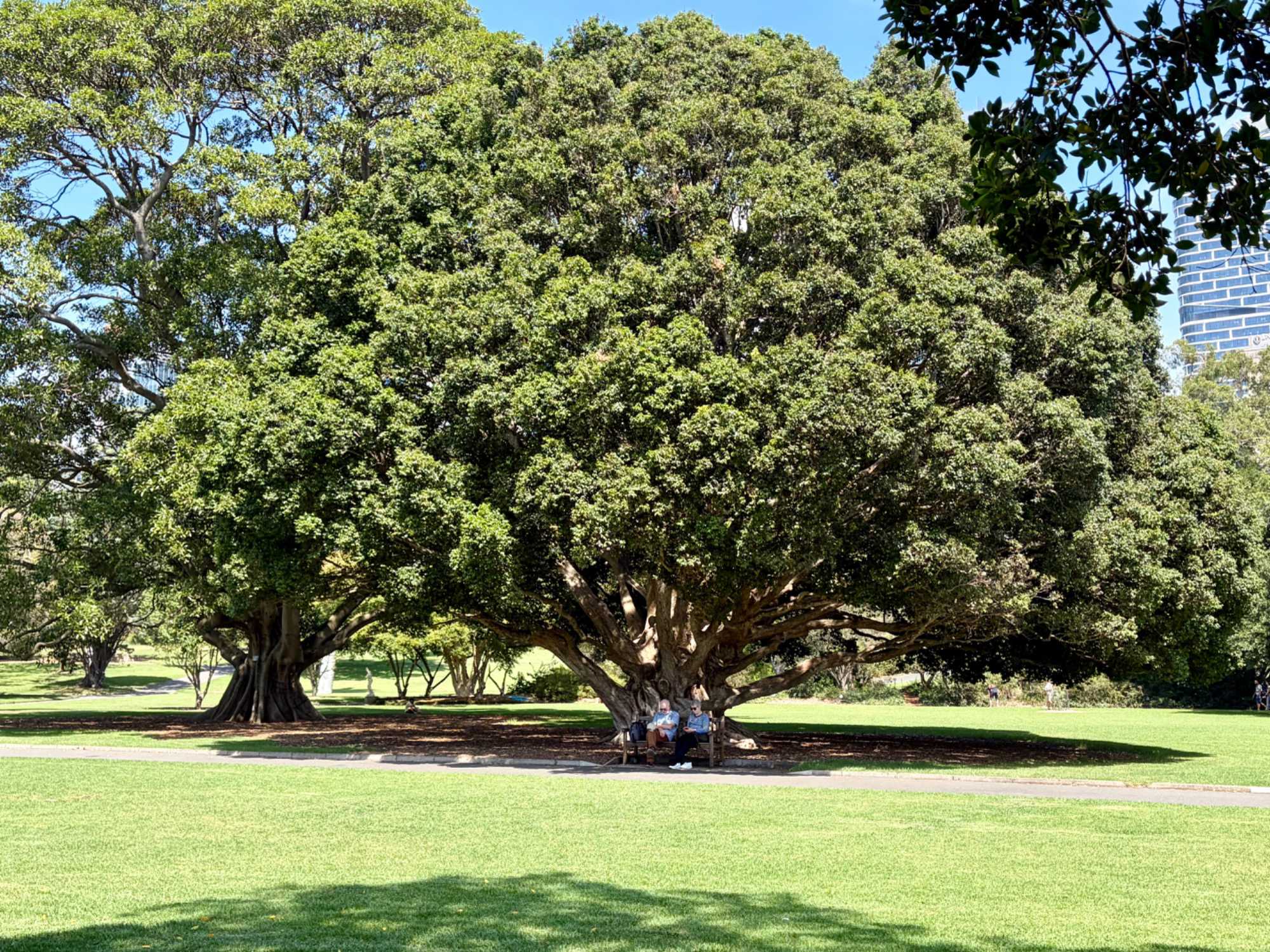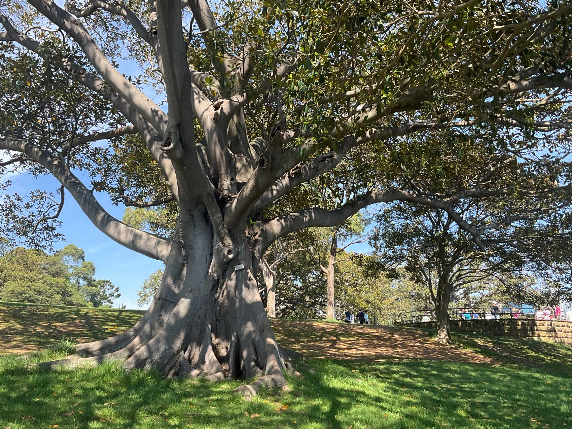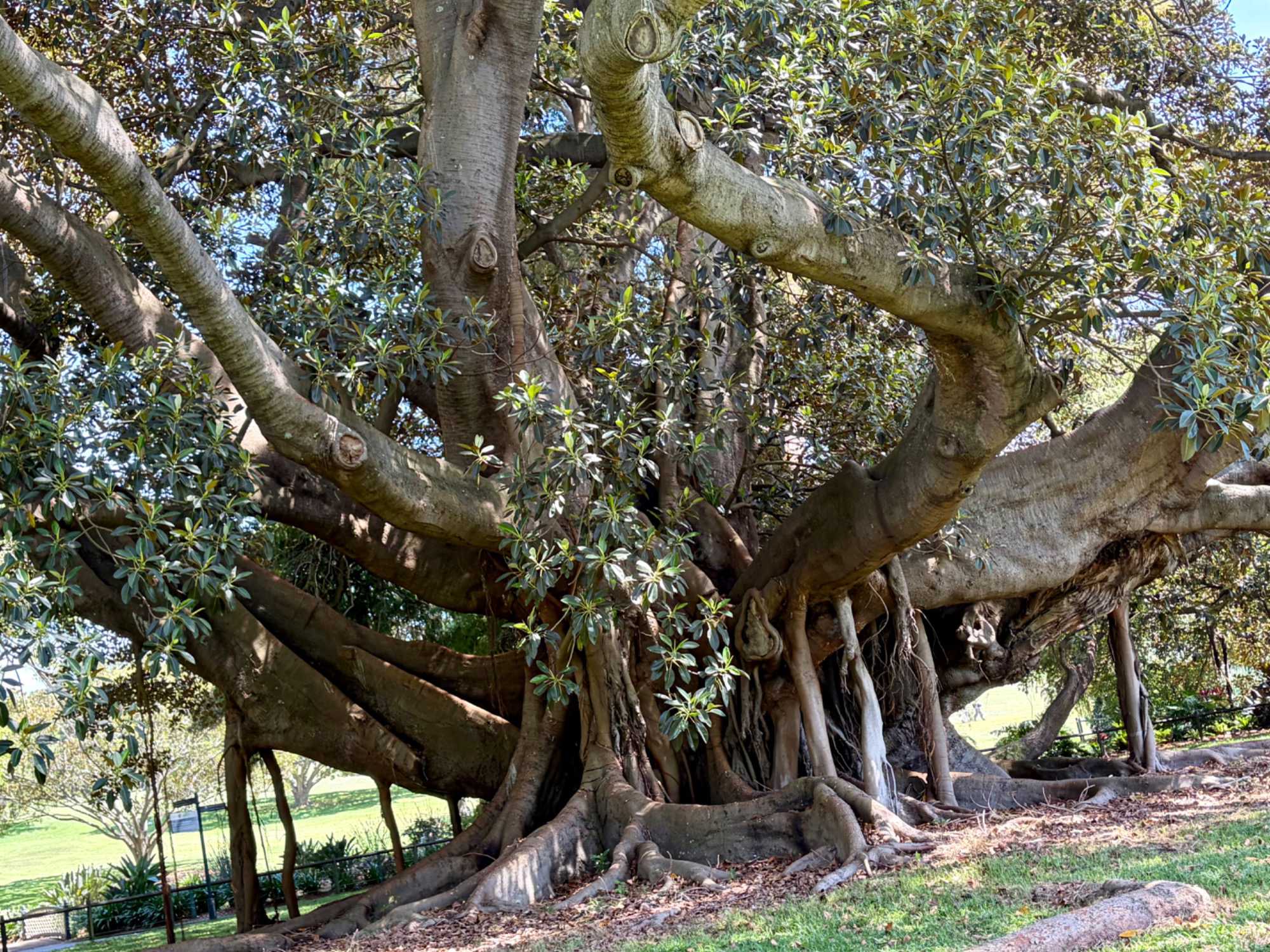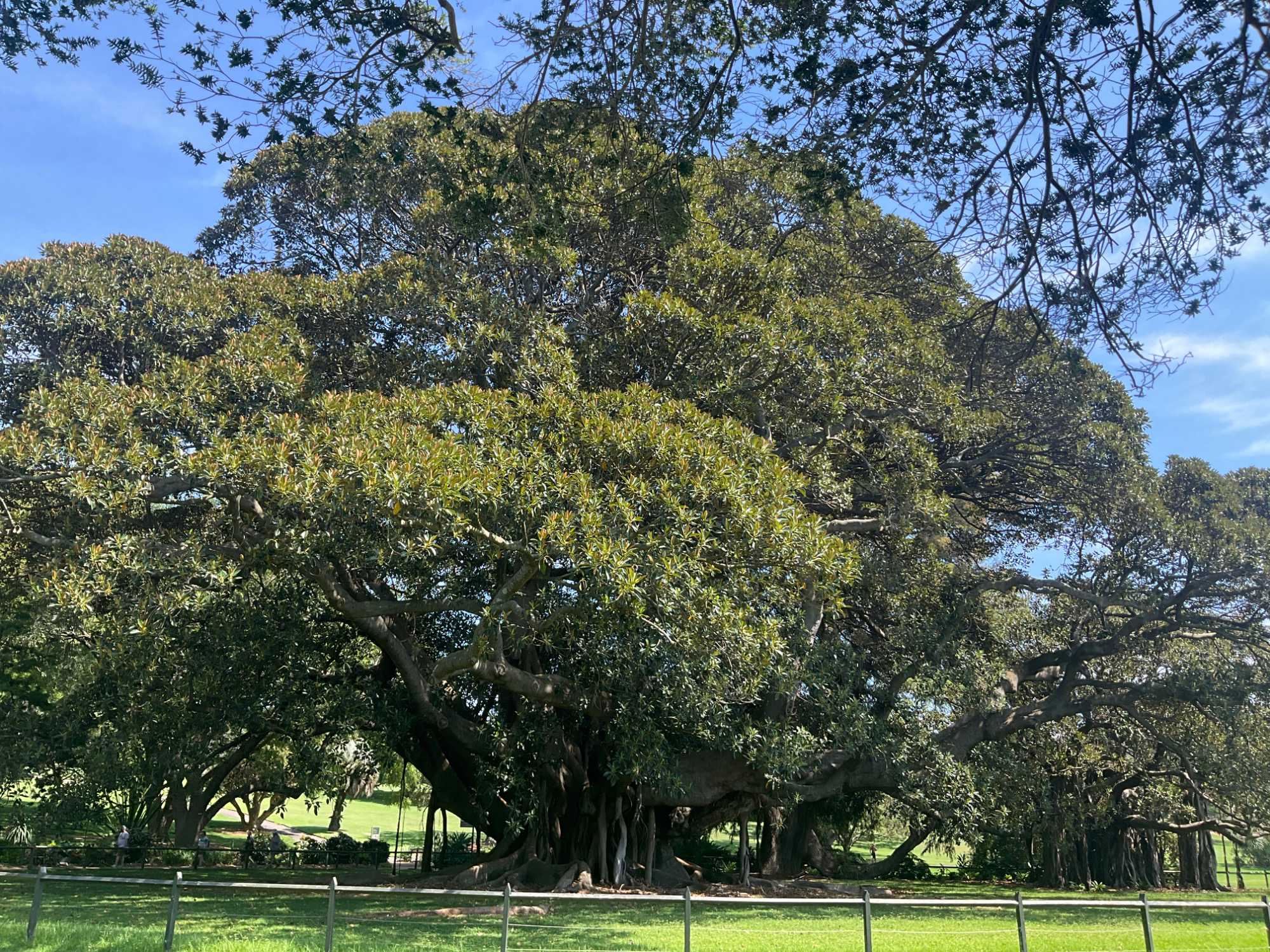Situé sur le bord de l'eau, les arbres (4800 espèces) procurent heureusement un peu de fraîcheur. L'immensité de leur taille est impressionnante. Comme ils croissent rapidement à cause de la température clémente, ces arbres de 150 ans, en auraient chez-nous 500 à 600 si on comparait leur taille. Il y a le "tea paper oil", l'eucalyptus, les ficus, les bambous, dont on dirait des percussions chaque fois qu'ils se croisent. Il y a eu les oiseaux aussi qui profitent du jardin, les ibis, les kookadurra (l'oiseau qui rigole), les magpies, les cacatoès tout blanc. Justement, en s’arrêtant à la fin de la balade au plus vieil arbre un ficus celui-là. Attention ! Respect pour ce plus que centenaire! Je crois qu’on l’a pris en photos sous toutes ces coutures. Un noble champion.
