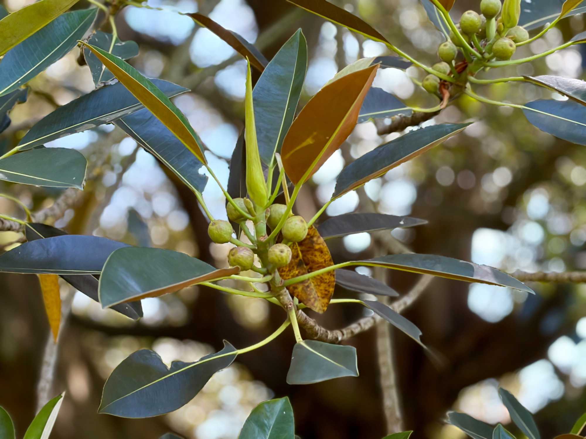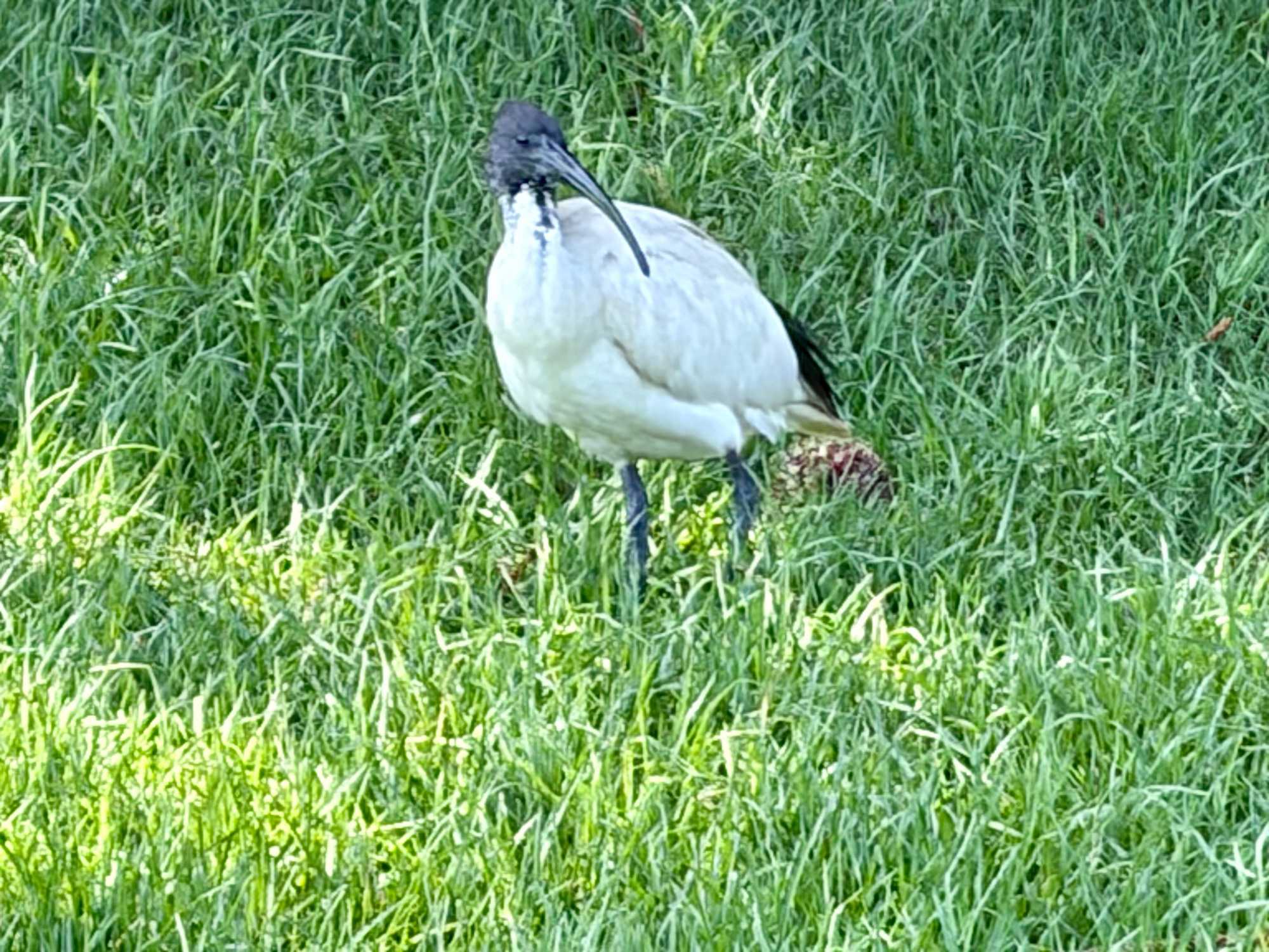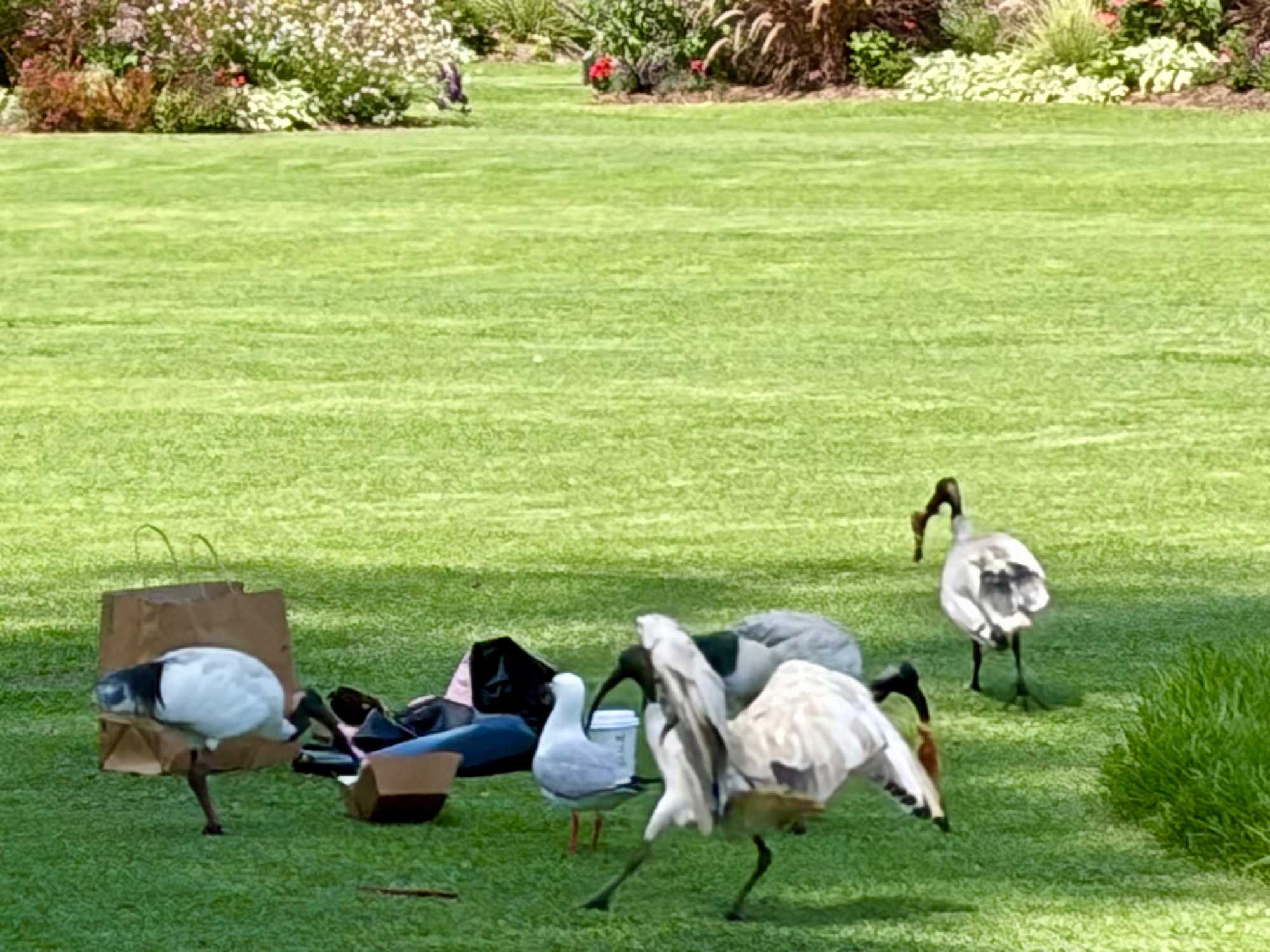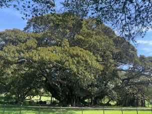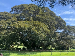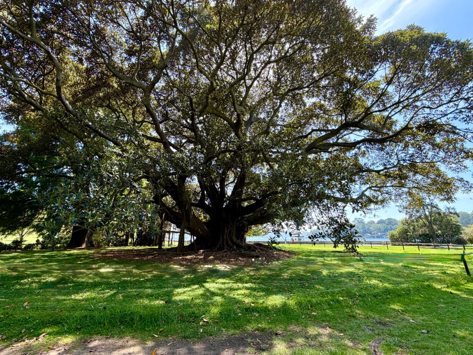 Situé sur le bord de l'eau, les arbres (4800 espèces) procurent heureusement un peu de fraîcheur. L'immensité de leur taille est impressionnante. Comme ils croissent rapidement à cause de la température clémente, ces arbres de 150 ans, en auraient chez-nous 500 à 600 si on comparait leur taille. Il y a le "tea paper oil", l'eucalyptus, les ficus, les bambous, dont on dirait des percussions chaque fois qu'ils se croisent. Il y a eu les oiseaux aussi qui profitent du jardin, les ibis, les kookadurra (l'oiseau qui rigole), les magpies, les cacatoès tout blanc. Justement, en s’arrêtant à la fin de la balade au plus vieil arbre un ficus celui-là. Attention ! Respect pour ce plus que centenaire! Je crois qu’on l’a pris en photos sous toutes ces coutures. Un noble champion.