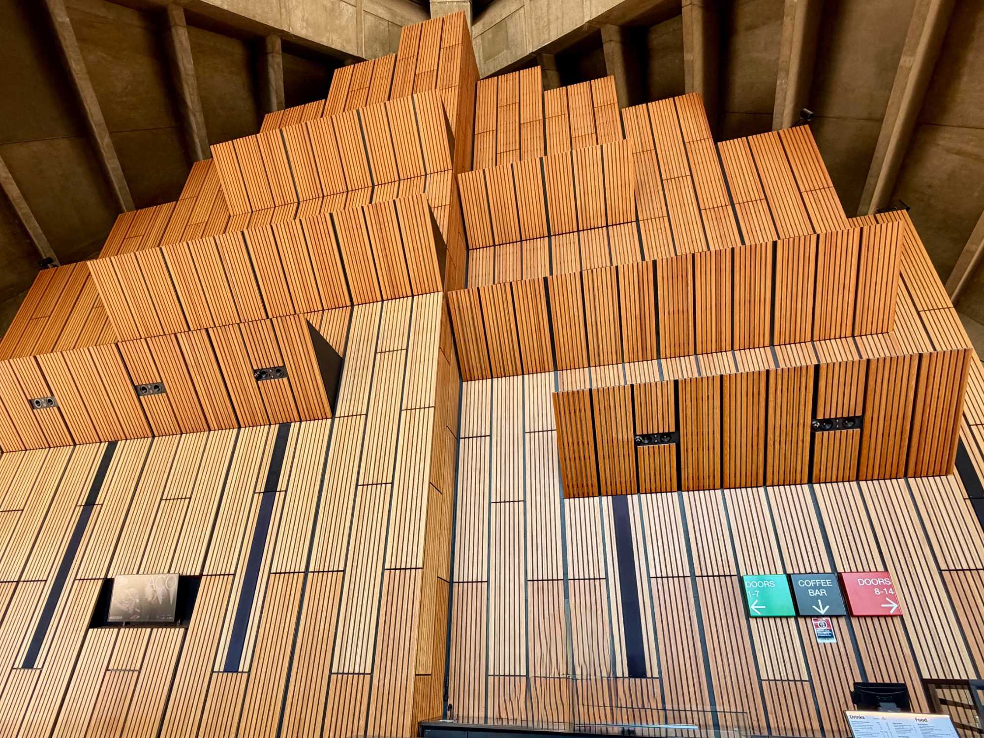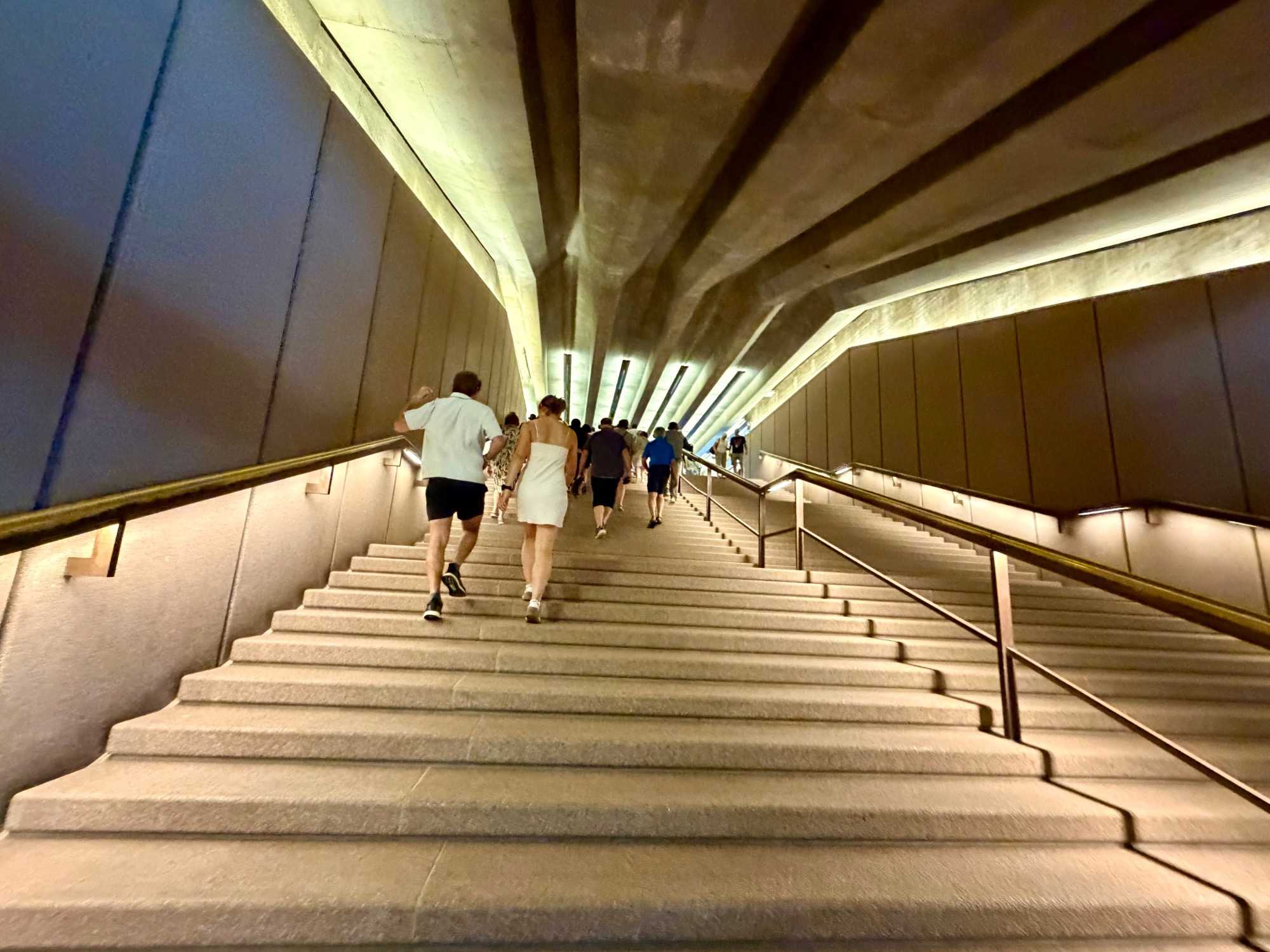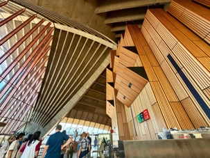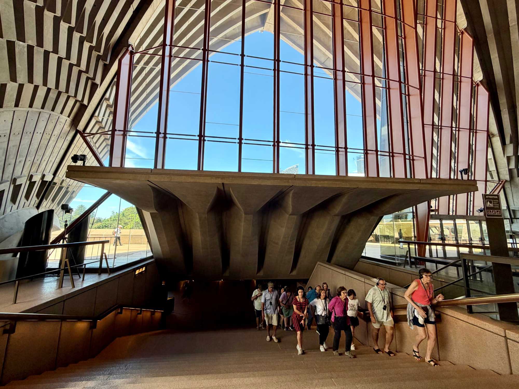 Oui, on y arrive à cette visite de ce bâtiment à l'architecture si particulière, l'opéra de Sydney. Le guide de l’Opéra, nous en a mis plein la vue et les oreilles pendant une heure avec ses informations détaillées. Un vrai passionné. Il raconte qu’un danois nommé précédemment, a d'abord entrepris les travaux en...1953, non mais il était d'avant-garde cet architecte. Des mésententes ont réduit son travail et les plans furent complétés par trois architectes australiens. La construction avait des similitudes avec la construction d'une église et ses voûtes. Du béton de l'ordre de 25 tonnes ont été nécessaire. Des bandes de métal ont été insérées et ont fait en sorte qu'aucune colonne ne fut nécessaire pour soutenir l'infrastructure. Cet opéra possède une particularité avec votre four. Laquelle? Ses tuiles sont autonettoyantes. Elles sont de couleur blanche comme pour imiter les voiles d'un bateau ou d'un coquillage. Ses murs sont faits de bois dur et mou, ce qui en fait une sonorité exceptionnelle. Au premier abord, on y trouve des similitudes avec la maison symphonique de Montréal. Elle est classée parmi les 16 meilleures salles de concert pour sa sonorité. Ce n'est qu'en 1973 que la reine Élisabeth II a procédé à son inauguration. Pavarotti y est allé pour quelques notes mais n'a jamais voulu traverser la moquette violette par pure superstition. Ah bon, il n'y a pas juste Céline qui est superstitieuse alors? À pleine capacité, la salle peut accueillir 2500 spectateurs et 900 chanteurs pour la chorale. 10 000 tuyaux ont été nécessaire pour construire l'orgue et ce, sur une période de 10 ans, 25 km de tuyaux ont servi à diriger le système de la climatisation. Lors de notre visite, le trio rock ontarien, Tea party, se pratiquait pour leur spectacle dans la salle voisine.