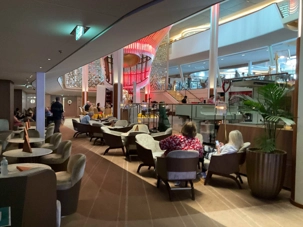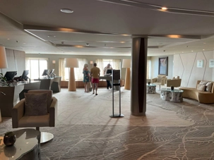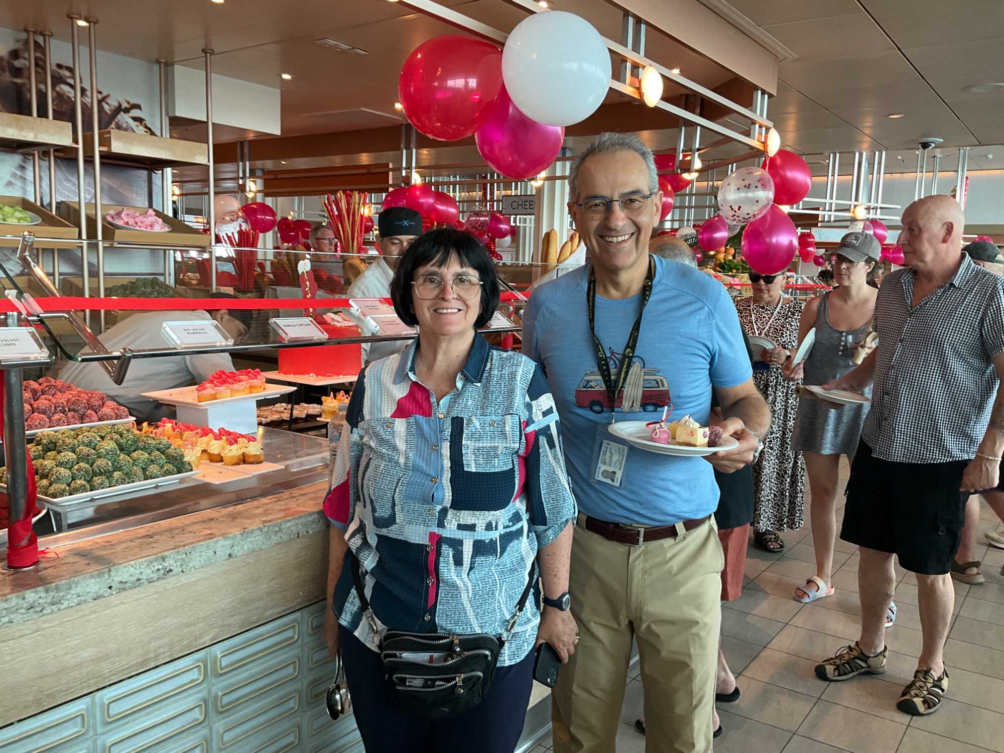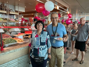 Lors des journées en mer, il y a ce qu'on appelle la table d'hospitalité Voyage Louise Drouin où je réponds à des questions sur nos excursions, les activités prochaines à bord du navire, les soirées thématiques ou, dans certains cas, de gentils voyageurs viennent à ma table simplement pour venir me tenir compagnie. Non mais ils sont gentils nos voyageurs non?