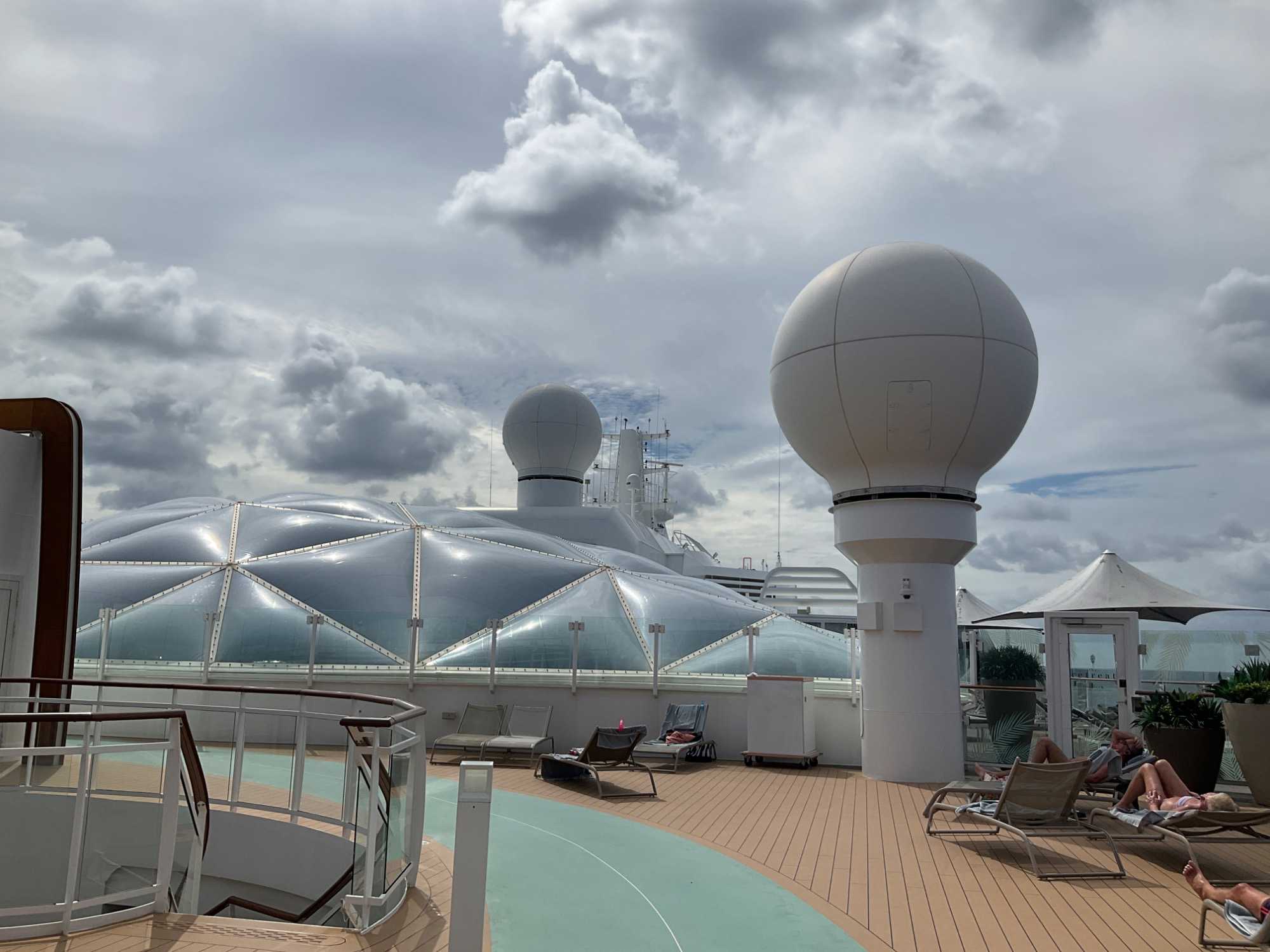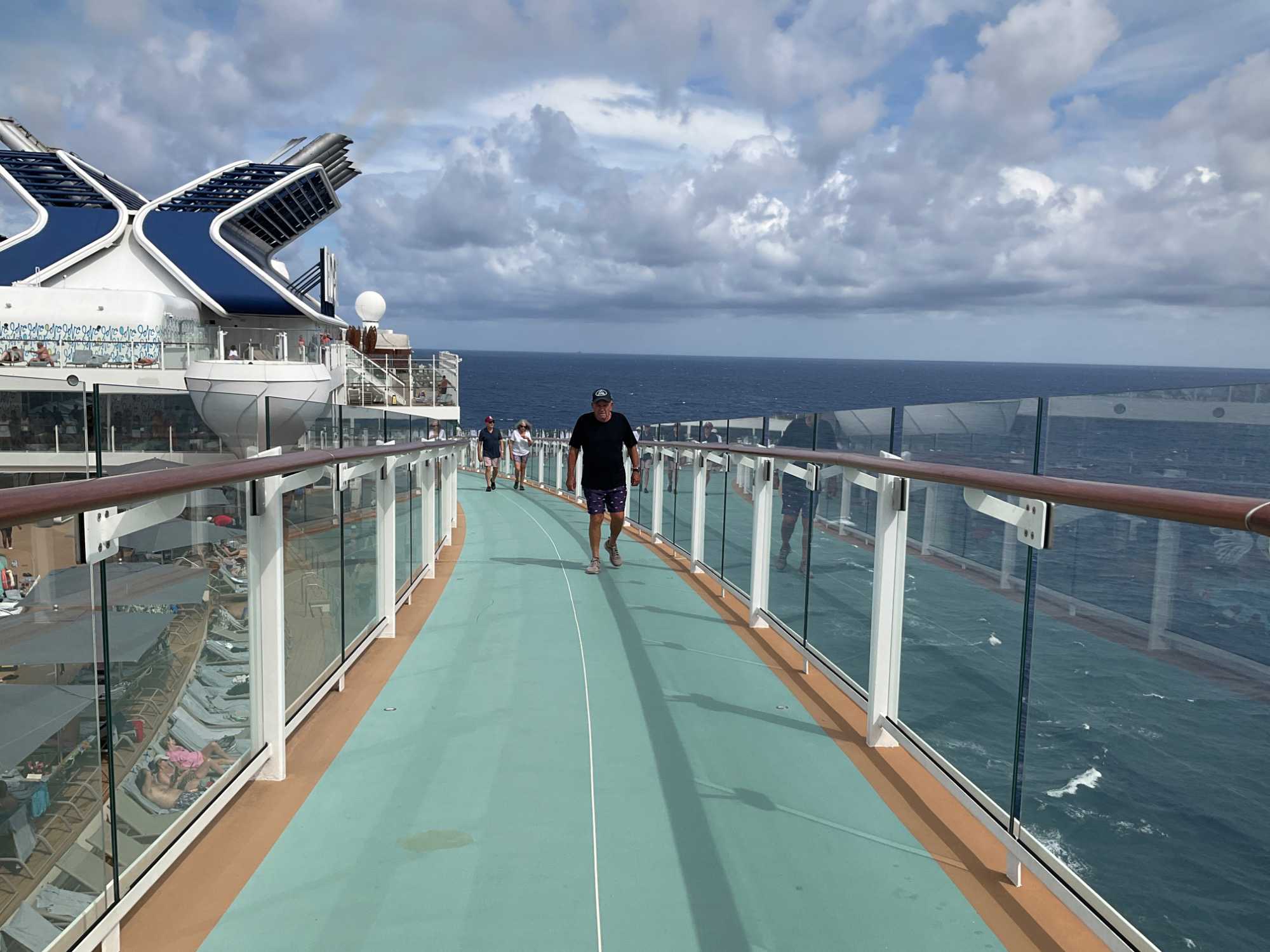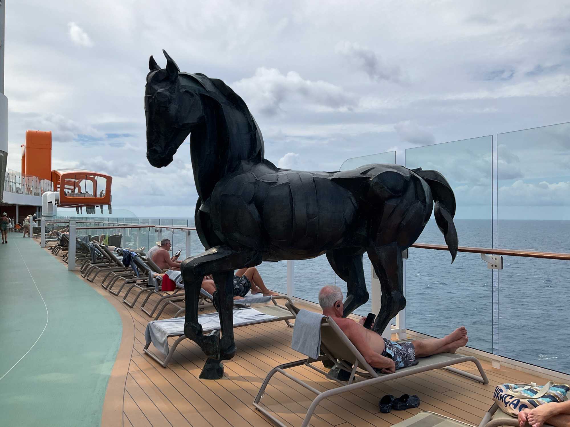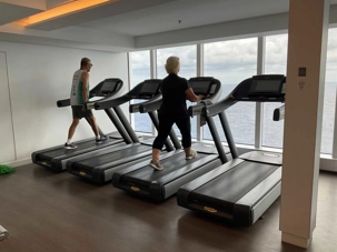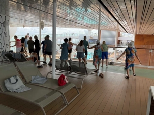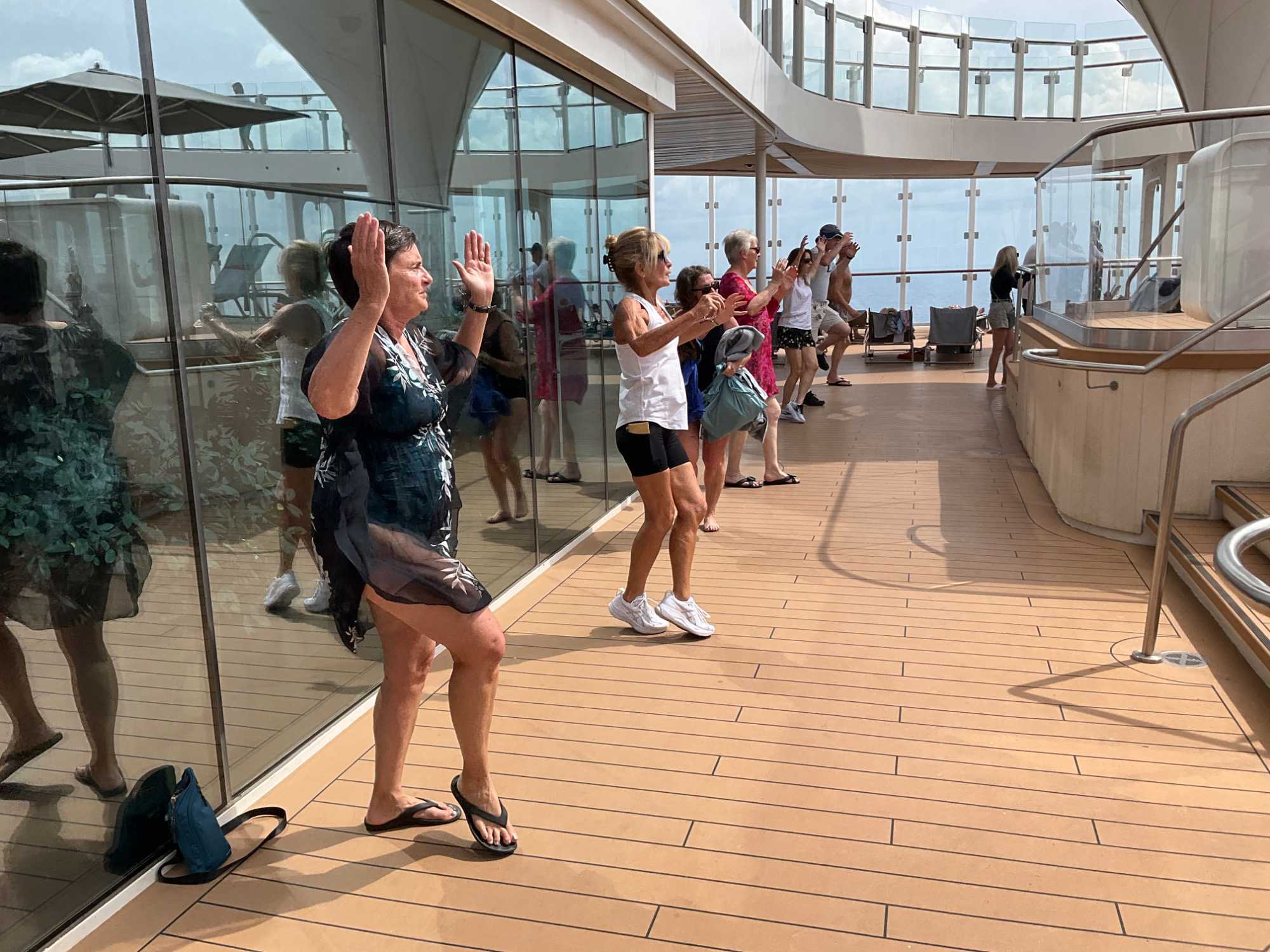 Je peux vous confirmer que nos athlètes, comme lors de la première journée en mer, en ont profité tôt en début de journée pour reprendre l’entraînement à la piscine en effectuant des longueurs pour Denis et Jocelyn et au gym pour Brigitte et André. Bien que seule de son groupe, Hélène de son côté, avec toute l’énergie que nous lui connaissons, a rejoint les danseurs du navire pour une leçon de danse en ligne. De nombreux autres voyageurs ont profité de la matinée avant que le mercure ne grimpe, pour faire quelques tours sur la poste de jogging… mais à la marche, activité qui a compté quelques adeptes. Nous n’avions pas été recrutés pour les olympiques quand même ! On voulait seulement diminuer le nombre de calories …tout en sachant que nous en reprendrons aux repas suivants.