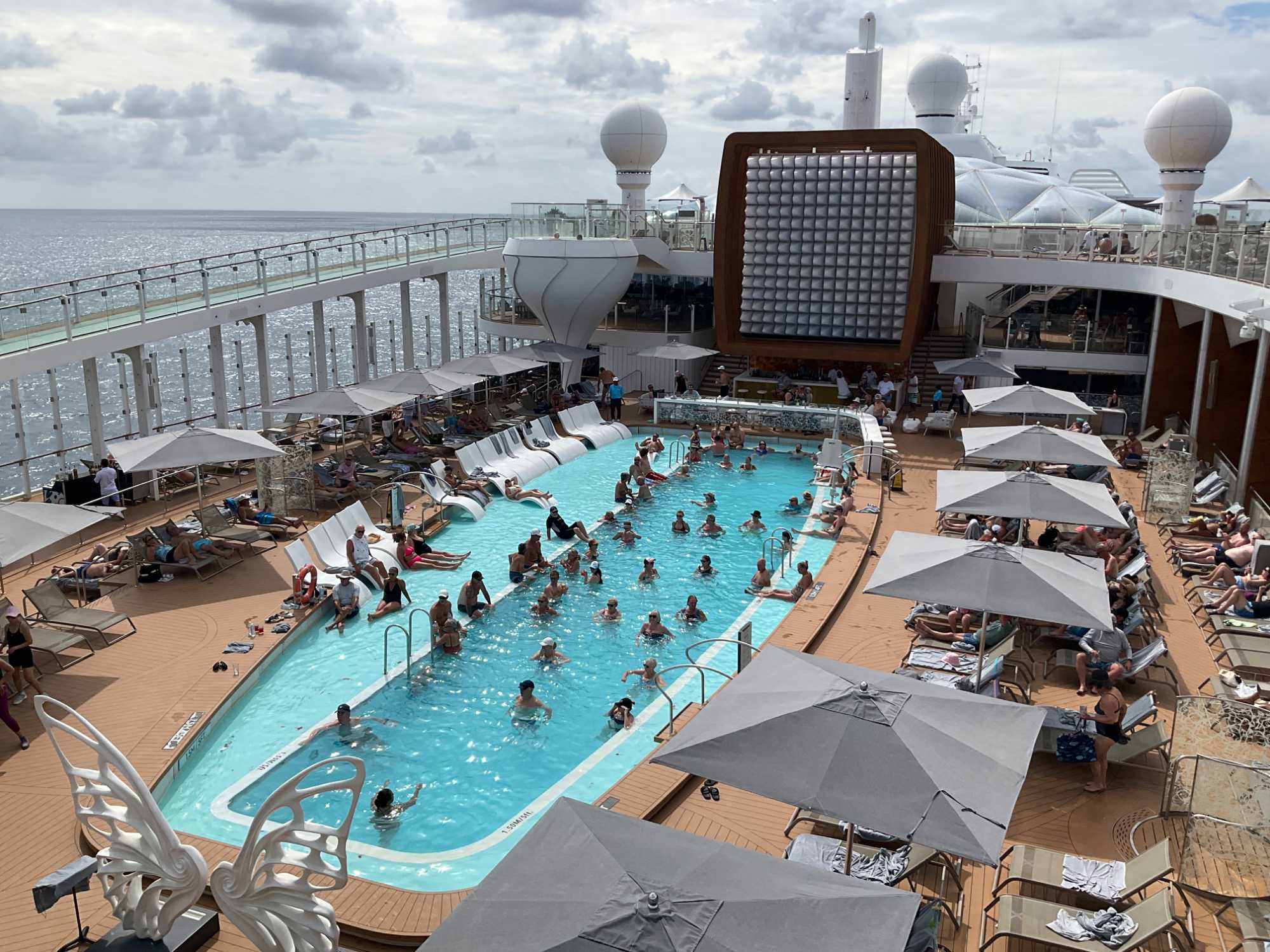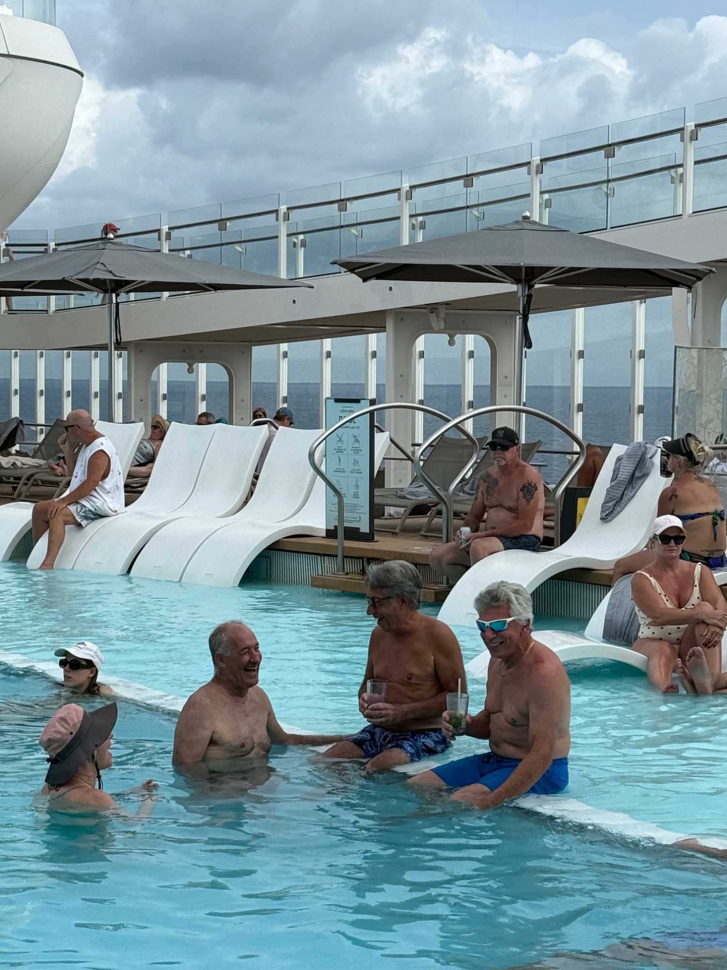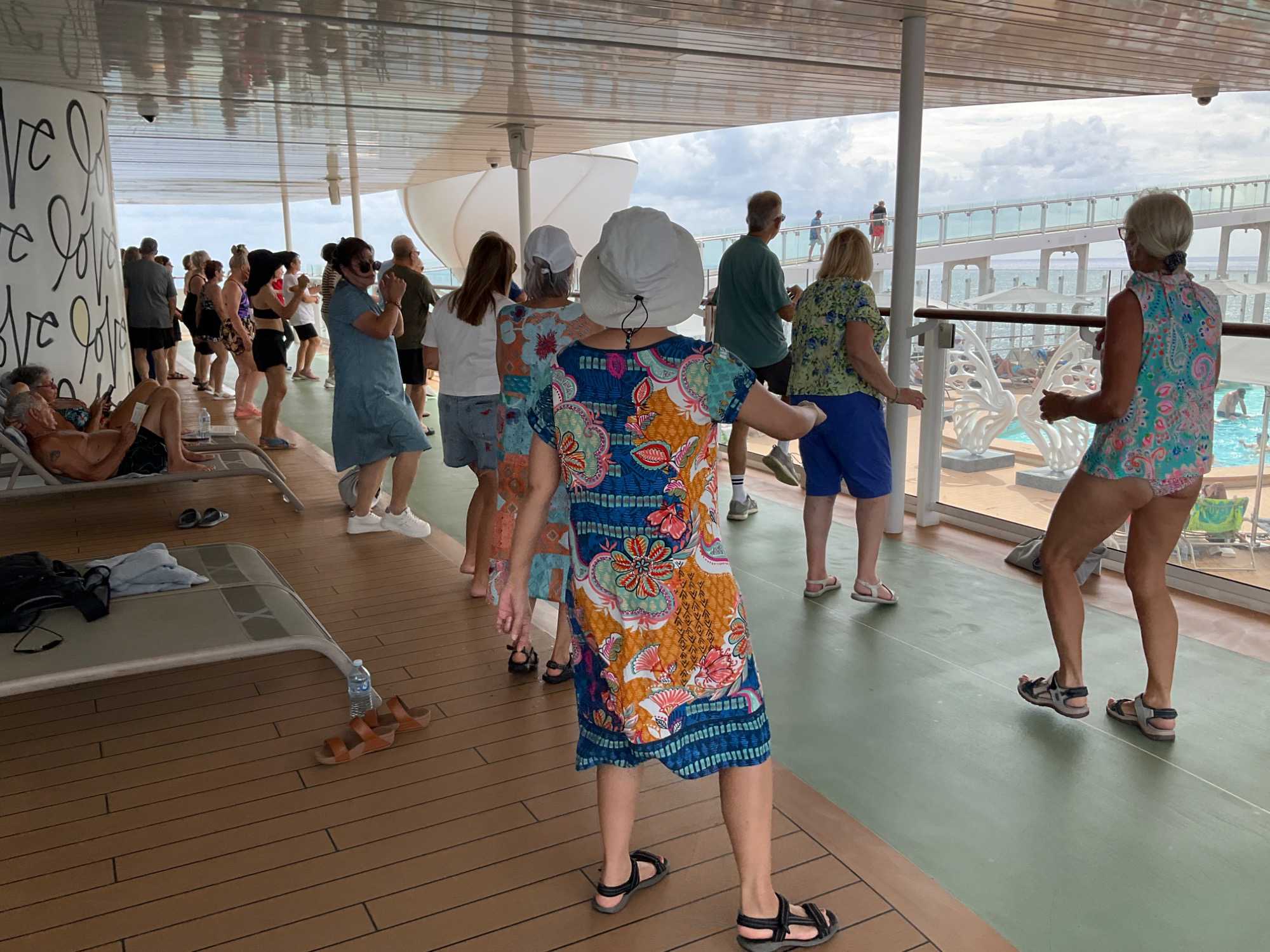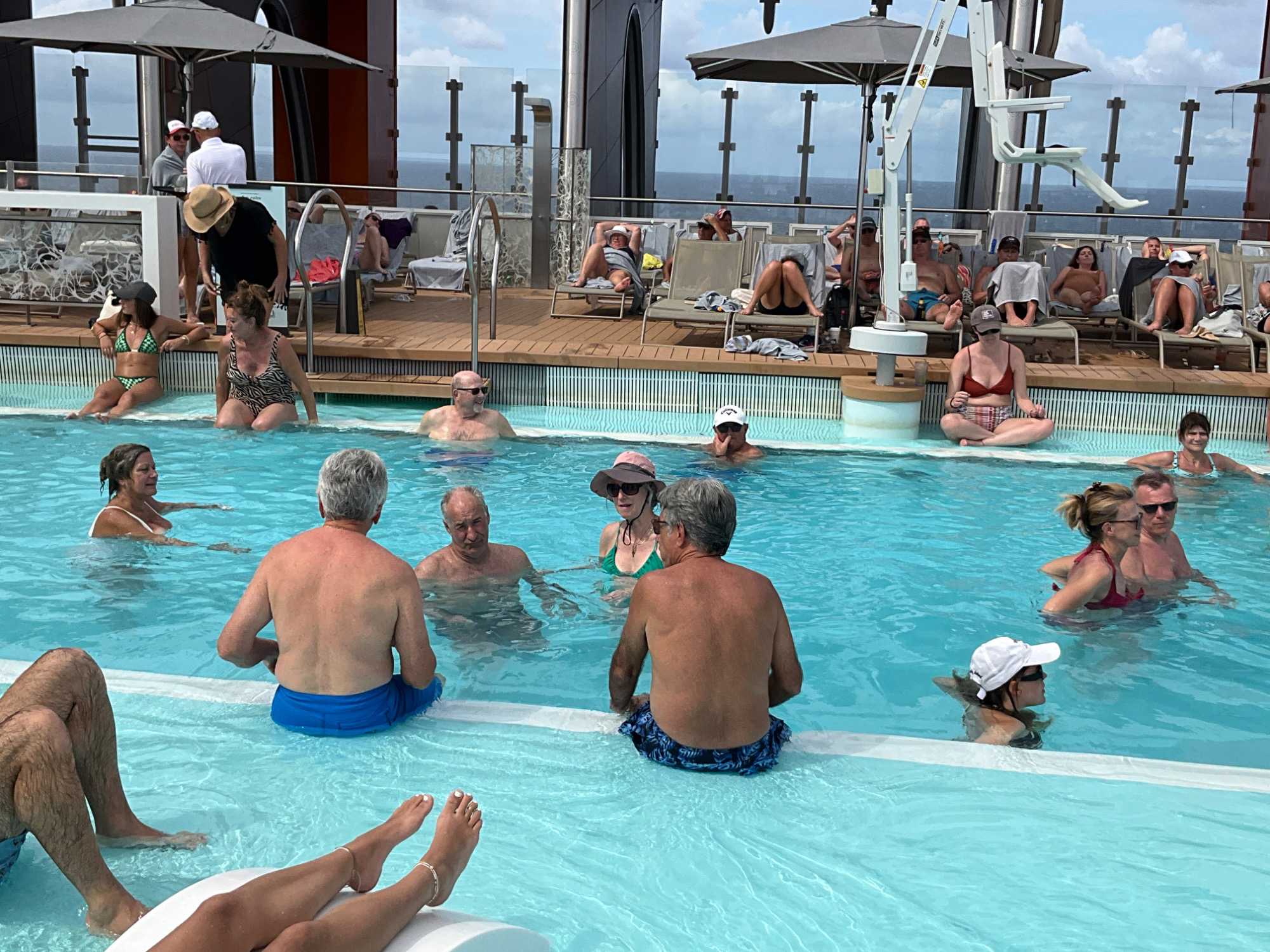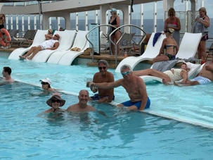 J'espérais voir des danseurs de notre groupe au cours des exercices physiques animés près de la piscine mais non, aucun. On vous promet de nous reprendre lors de la disco silencieuse. Par contre, plusieurs hommes du groupe, au lieu de faire des longueurs dans l’immense piscine, en profitaient pour …régler le sort du monde. À leur défense, il faut dire que cet endroit était fort occupé avec ce beau soleil qui nous accompagnait.