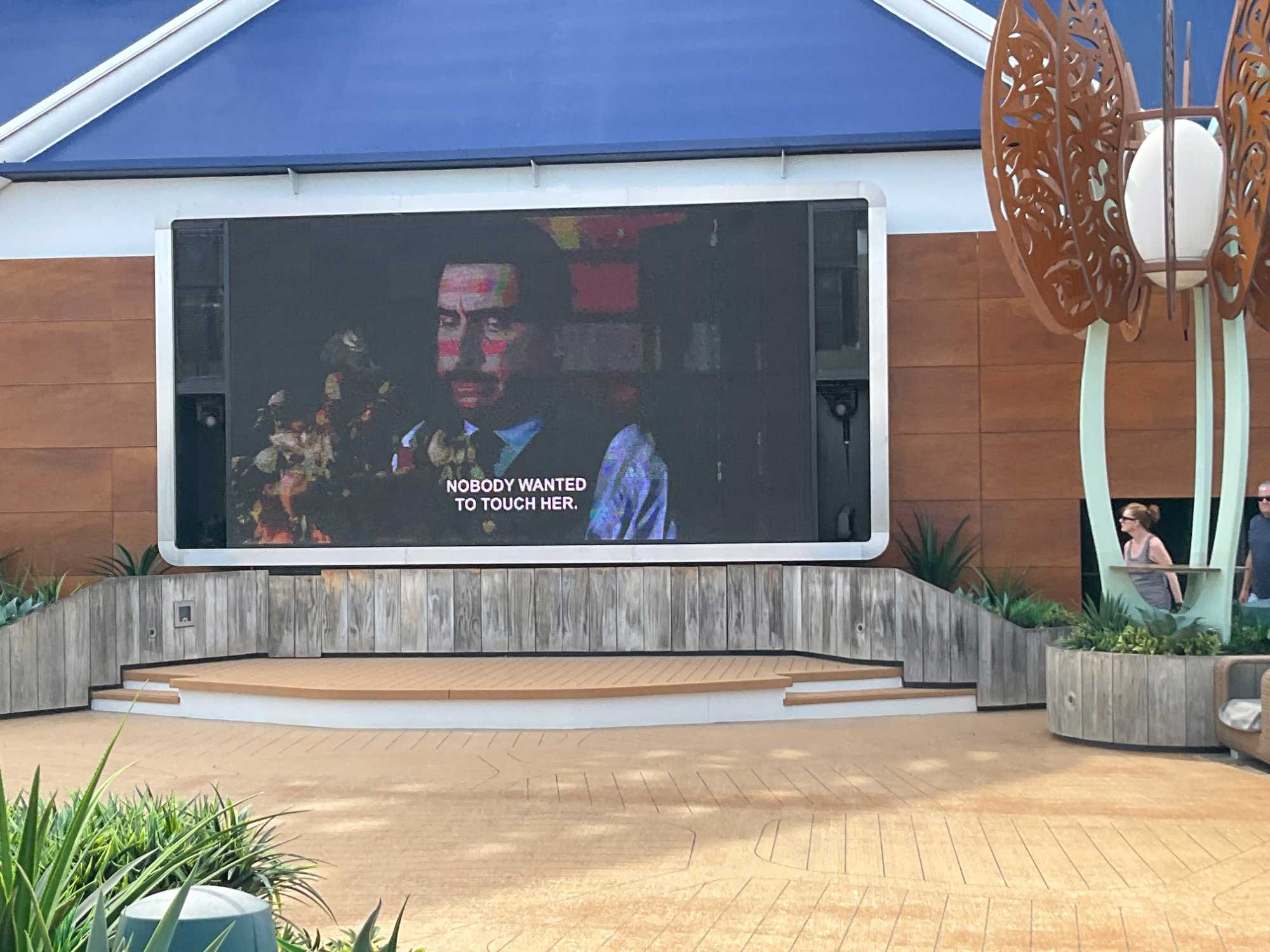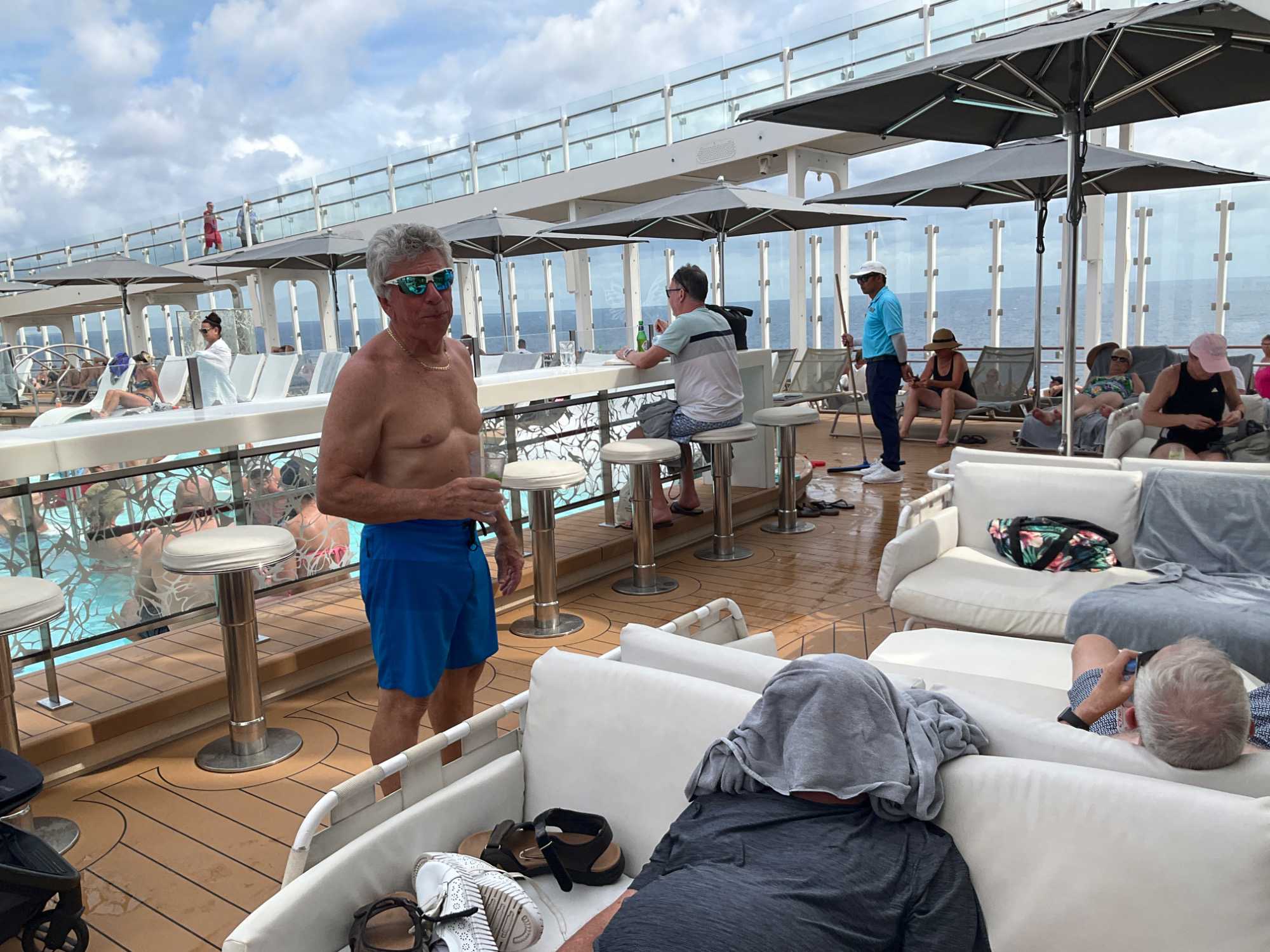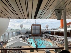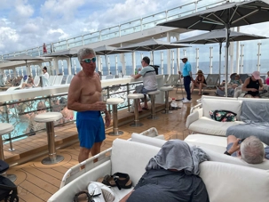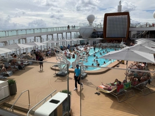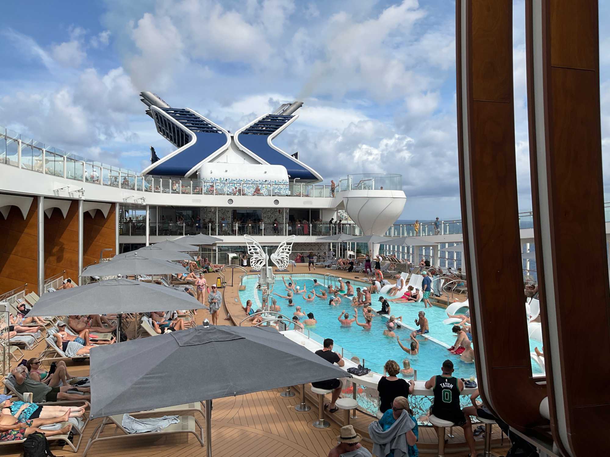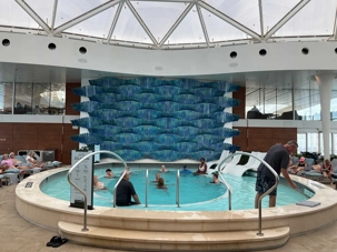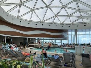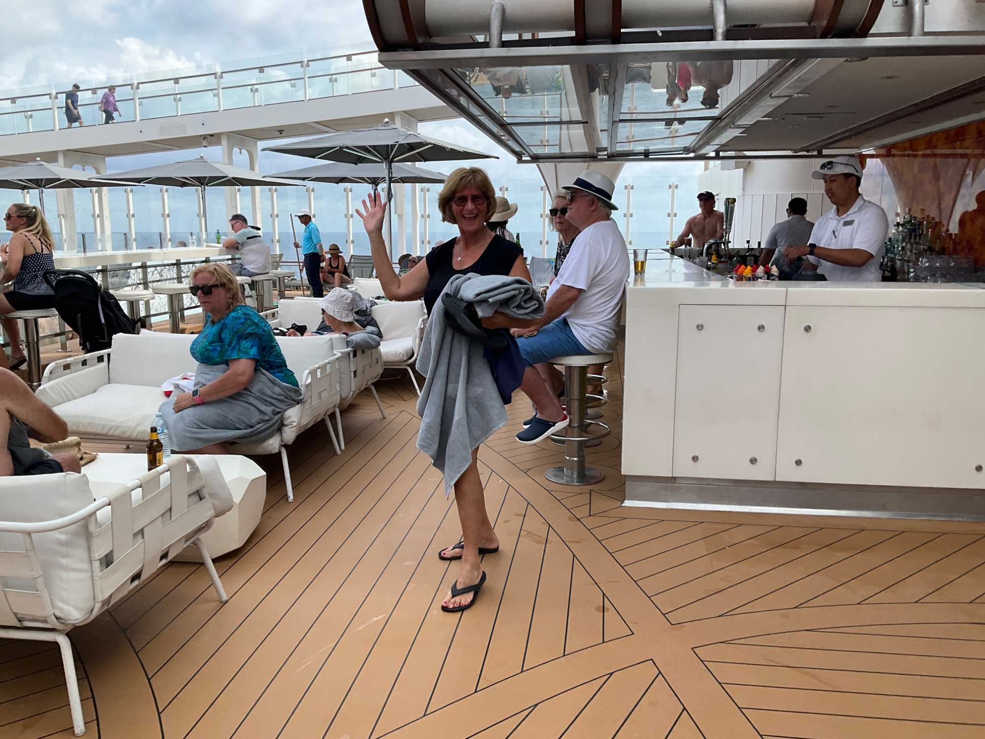 J'espérais voir des danseurs de notre groupe au cours des exercices physiques animés près de la piscine mais non, aucun. On vous promet de nous reprendre lors de la disco silencieuse. Par contre, plusieurs hommes du groupe, au lieu de faire des longueurs dans l’immense piscine, en profitaient pour …régler le sort du monde. À leur défense, il faut dire que cet endroit était fort occupé avec ce beau soleil qui nous accompagnait.