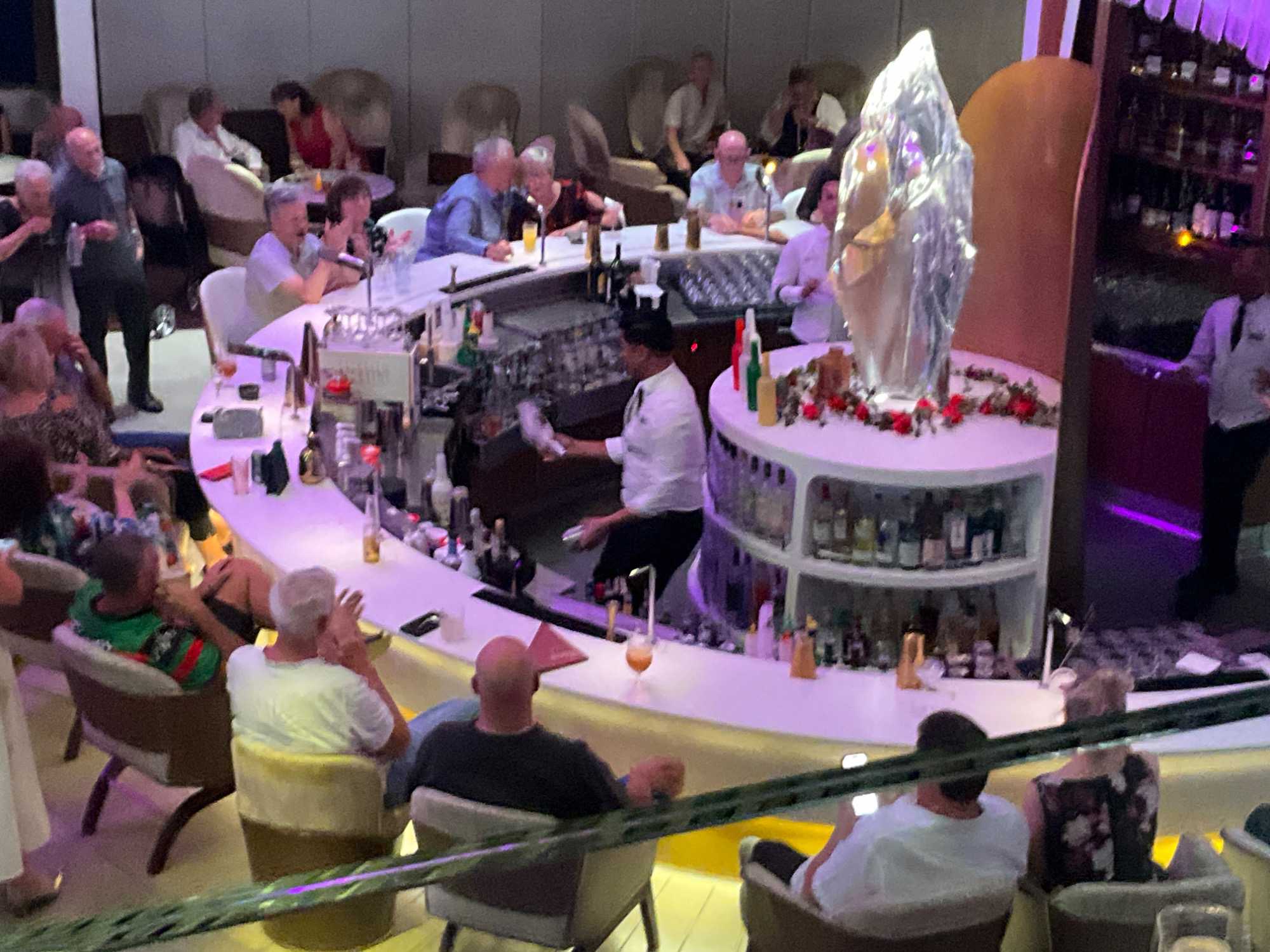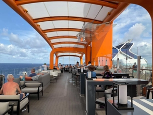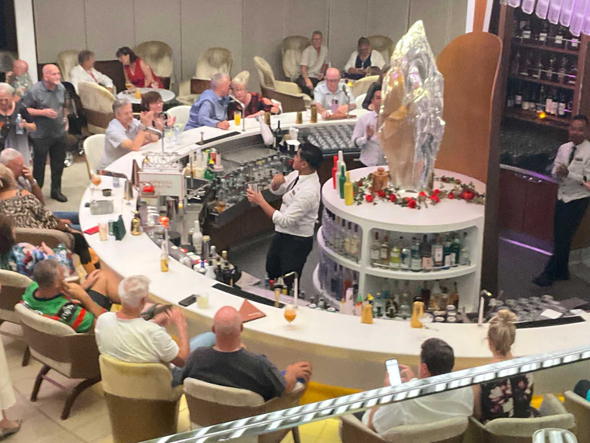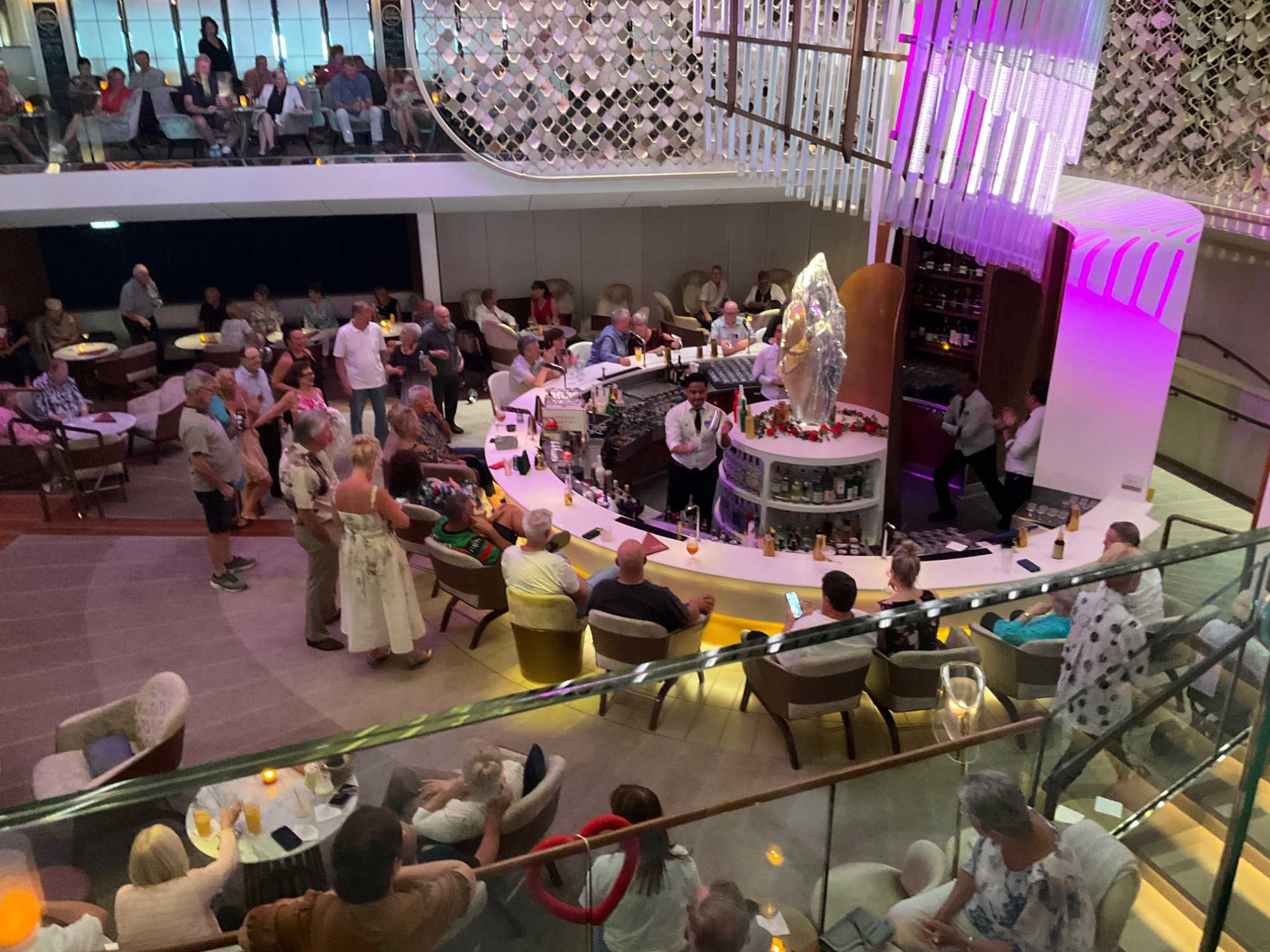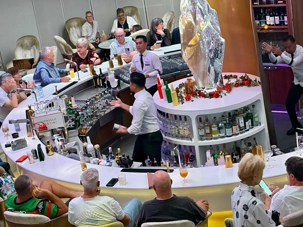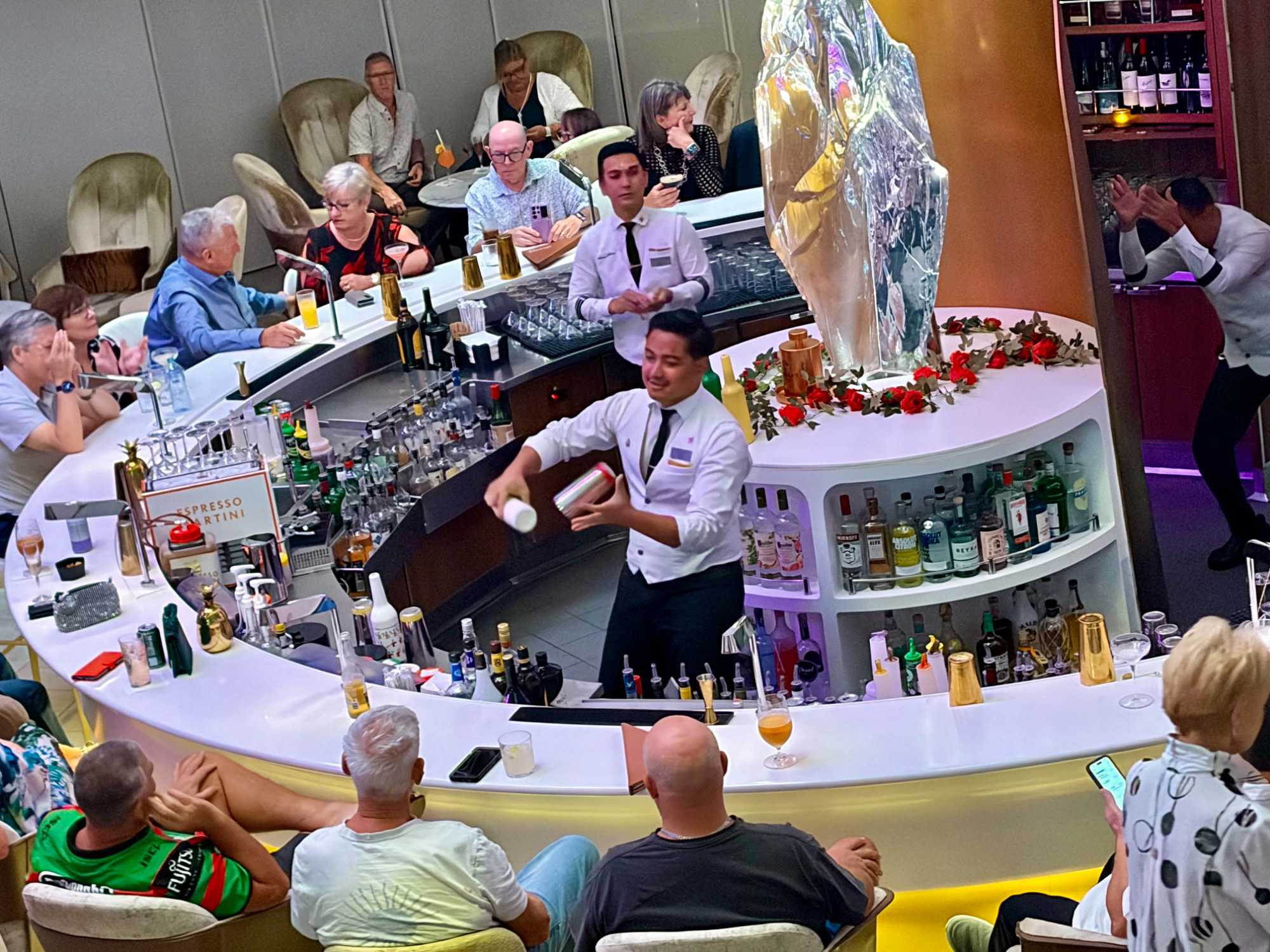 Vous aimez les 5 à 7? Nous aussi. Comme on fait la tournée des bars sur le navire, on avait donné rendez-vous cette fois-ci au Martini Bar mais il semble que nous n’étions pas les seuls puisque l’endroit débordait de monde, nous avons donc monté d’un étage pour nous retrouver au Café Il Bacio. Tout le groupe était présent un verre à la main. Puis, chacun y allait de ses préférences pour choisir le restaurant pour le souper. On a laissé Richard et Hélène en amoureux se rendre au restaurant de spécialité l’Éden. Même après 50 ans de mariage on a encore des petits mots d’amour à se dire en privé. Notre quatuor préféfé composé de Monique, Jocelyn, France et Pierre, ont essayé le restaurant de spécialité le Roof Garden, on en prendra des nouvelles demain. Huit d’entre nous avons profité d’un excellent »Surf & Turf » au Normandie et avons opté pour la formule improvisée « Parle parle jase jase » à la Janette pour en apprendre un peu plus sur nos ami(es). Une belle soirée!