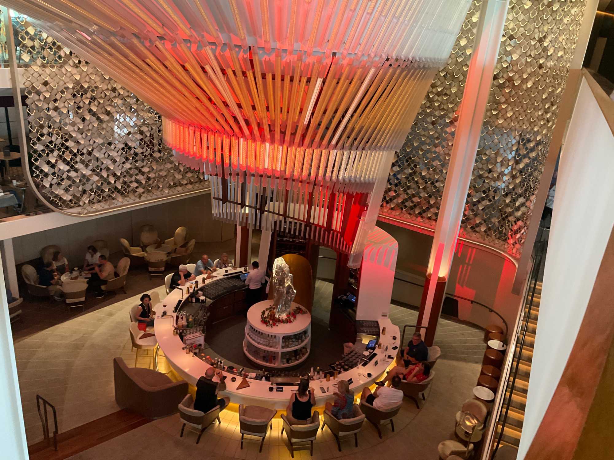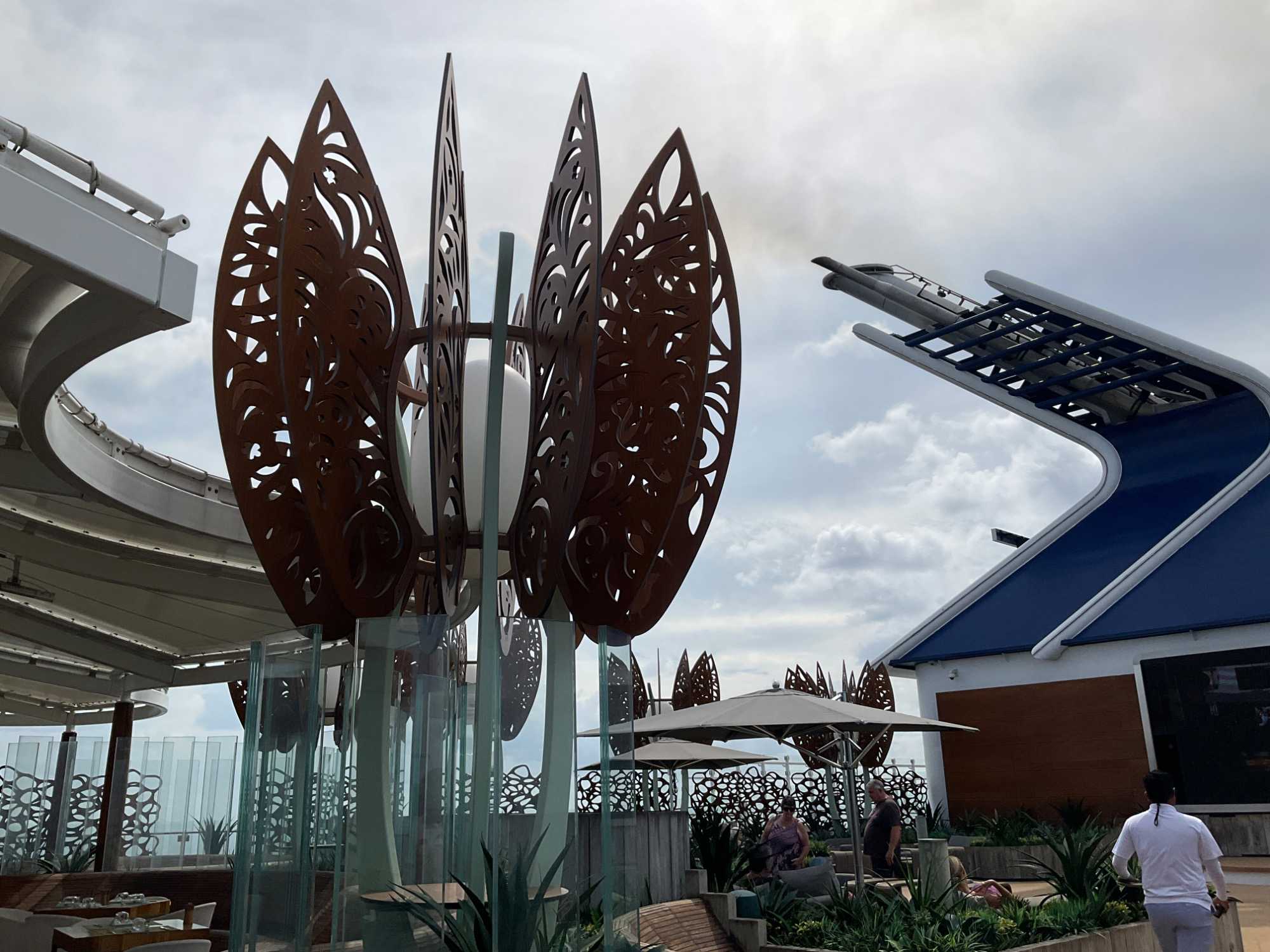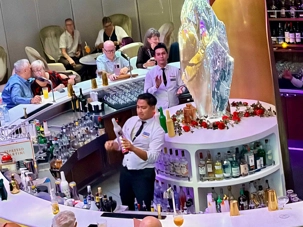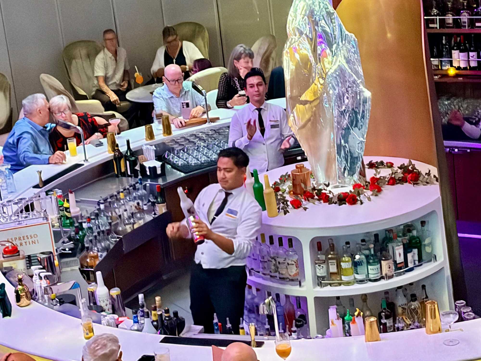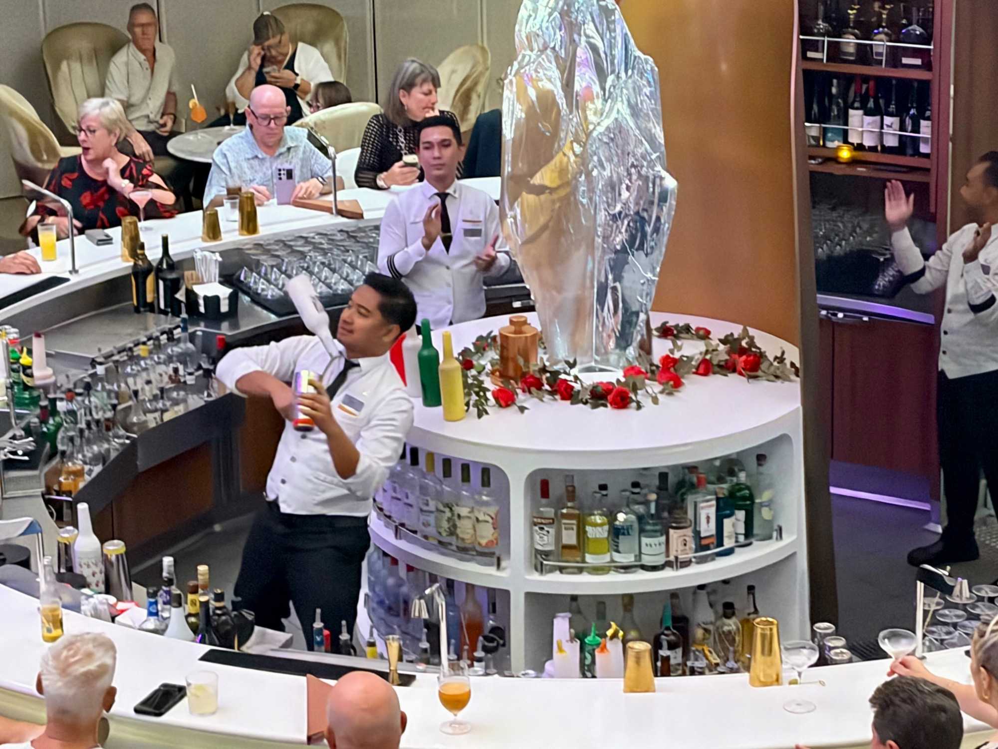 Vous aimez les 5 à 7? Nous aussi. Comme on fait la tournée des bars sur le navire, on avait donné rendez-vous cette fois-ci au Martini Bar mais il semble que nous n’étions pas les seuls puisque l’endroit débordait de monde, nous avons donc monté d’un étage pour nous retrouver au Café Il Bacio. Tout le groupe était présent un verre à la main. Puis, chacun y allait de ses préférences pour choisir le restaurant pour le souper. On a laissé Richard et Hélène en amoureux se rendre au restaurant de spécialité l’Éden. Même après 50 ans de mariage on a encore des petits mots d’amour à se dire en privé. Notre quatuor préféfé composé de Monique, Jocelyn, France et Pierre, ont essayé le restaurant de spécialité le Roof Garden, on en prendra des nouvelles demain. Huit d’entre nous avons profité d’un excellent »Surf & Turf » au Normandie et avons opté pour la formule improvisée « Parle parle jase jase » à la Janette pour en apprendre un peu plus sur nos ami(es). Une belle soirée!