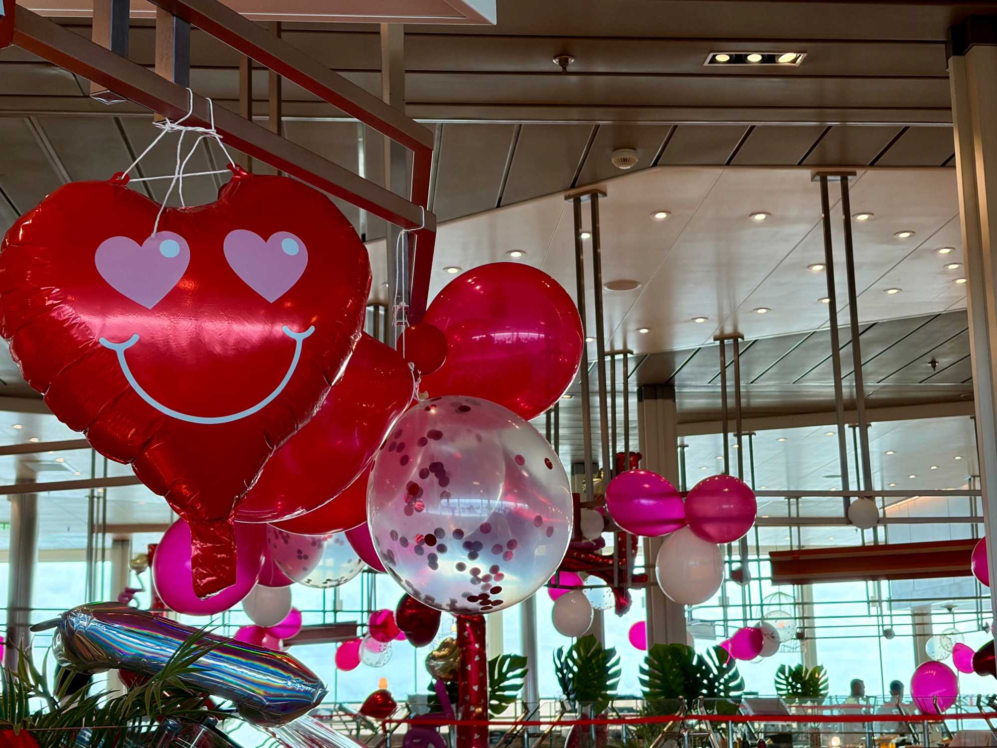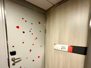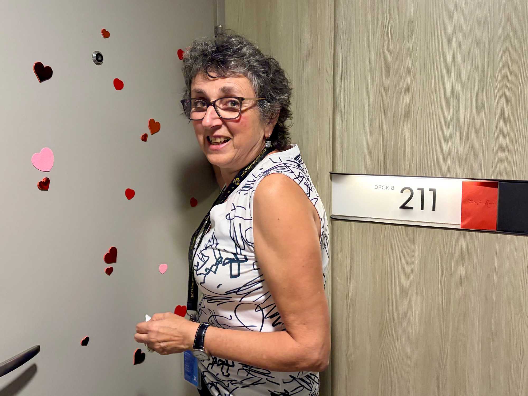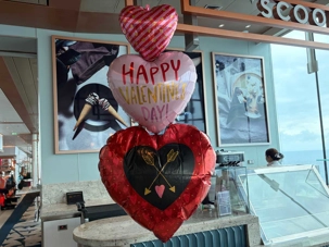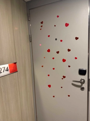 Hey oui, j’imagine que les bâillements se sont faits entendre ce matin dans le creux des cabines. Chut, nos voyageurs profitent de cette deuxième journée en mer pour reprendre quelques heures de sommeil perdues. Mais, lors de la sortie de leur chambre pour aller prendre leur petit déjeuner, ils ont eu droit à une petite surprise. Des fées « de l’amour » avec leur baguette magique, avaient laissé tombé au cours de la nuit, des « vagues » de petits coeurs sur leur porte pour leur rappeler la thématique de la journée « la fête des amoureux ». Une petite carte accompagnait ce « déluge » de petits coeurs rouges et roses. Et des chocolats. Un petit geste pour les faire sourire et leur rappeler l’importance de l’amour dans nos vies.