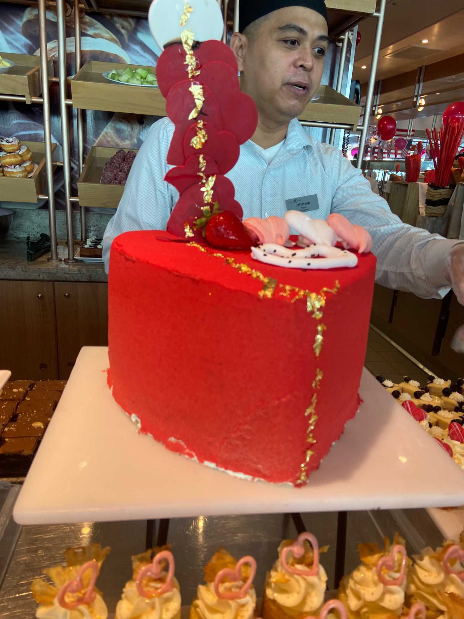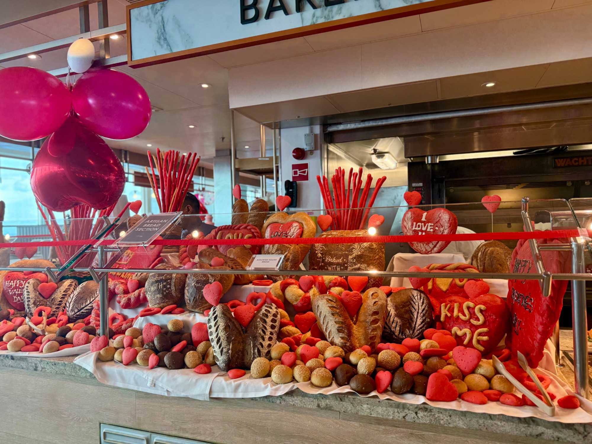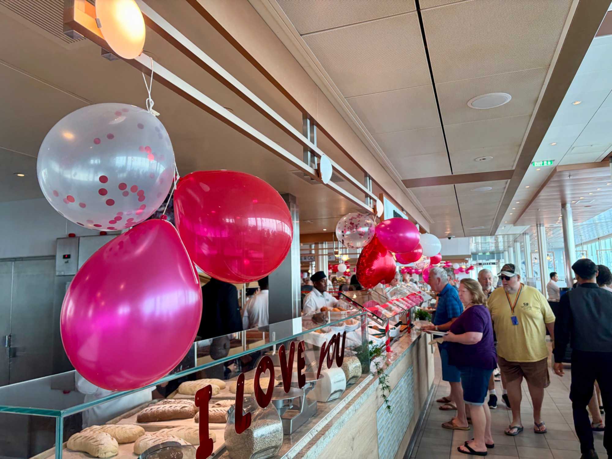 Hey oui, j’imagine que les bâillements se sont faits entendre ce matin dans le creux des cabines. Chut, nos voyageurs profitent de cette deuxième journée en mer pour reprendre quelques heures de sommeil perdues. Mais, lors de la sortie de leur chambre pour aller prendre leur petit déjeuner, ils ont eu droit à une petite surprise. Des fées « de l’amour » avec leur baguette magique, avaient laissé tombé au cours de la nuit, des « vagues » de petits coeurs sur leur porte pour leur rappeler la thématique de la journée « la fête des amoureux ». Une petite carte accompagnait ce « déluge » de petits coeurs rouges et roses. Et des chocolats. Un petit geste pour les faire sourire et leur rappeler l’importance de l’amour dans nos vies.