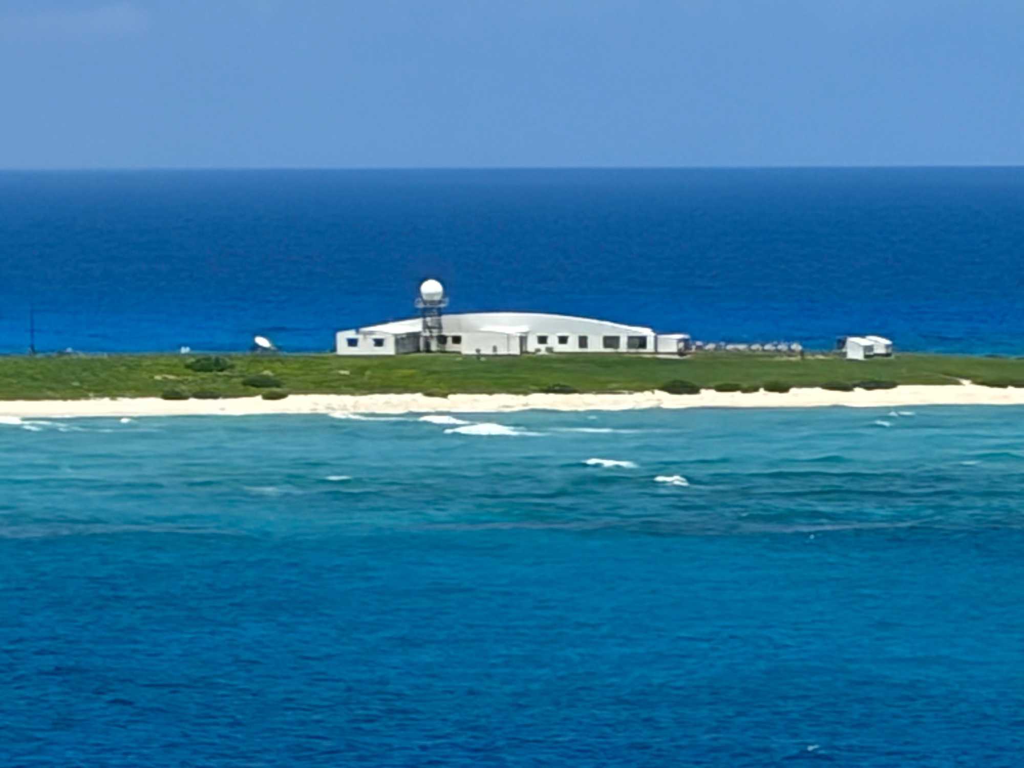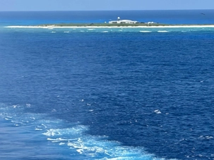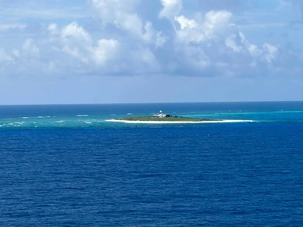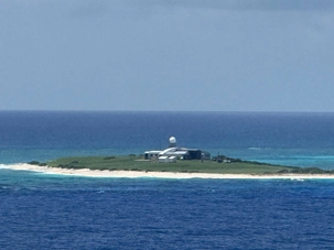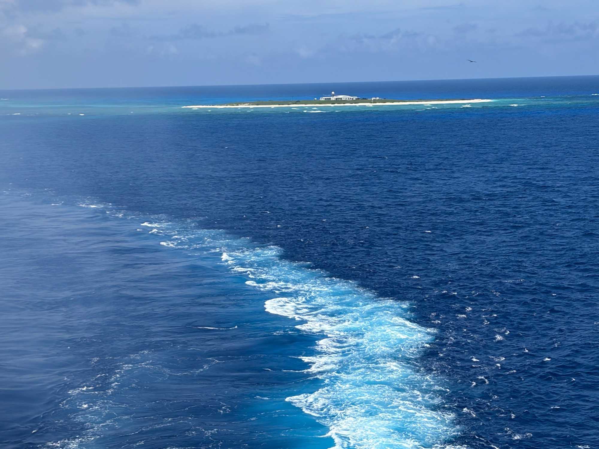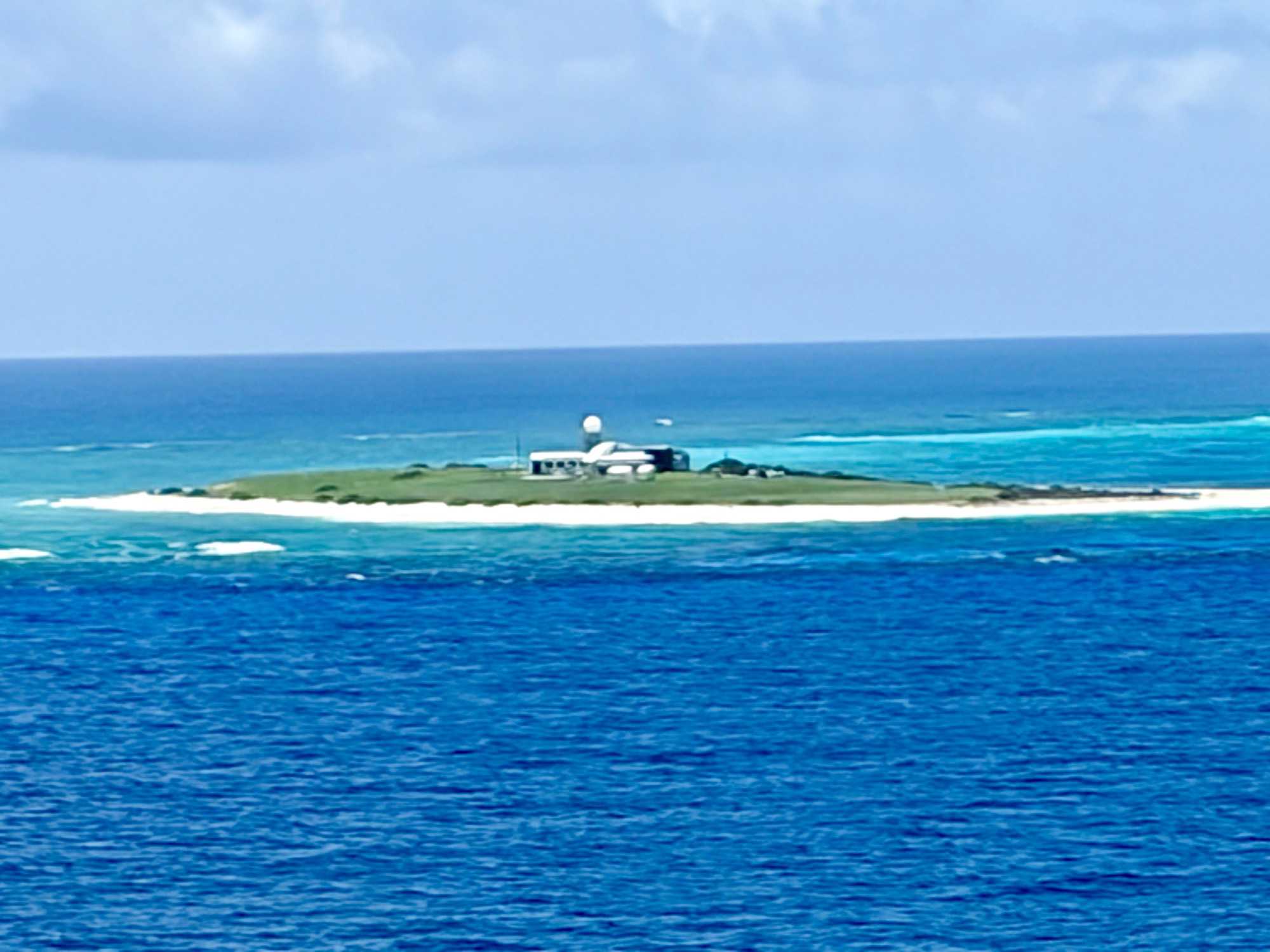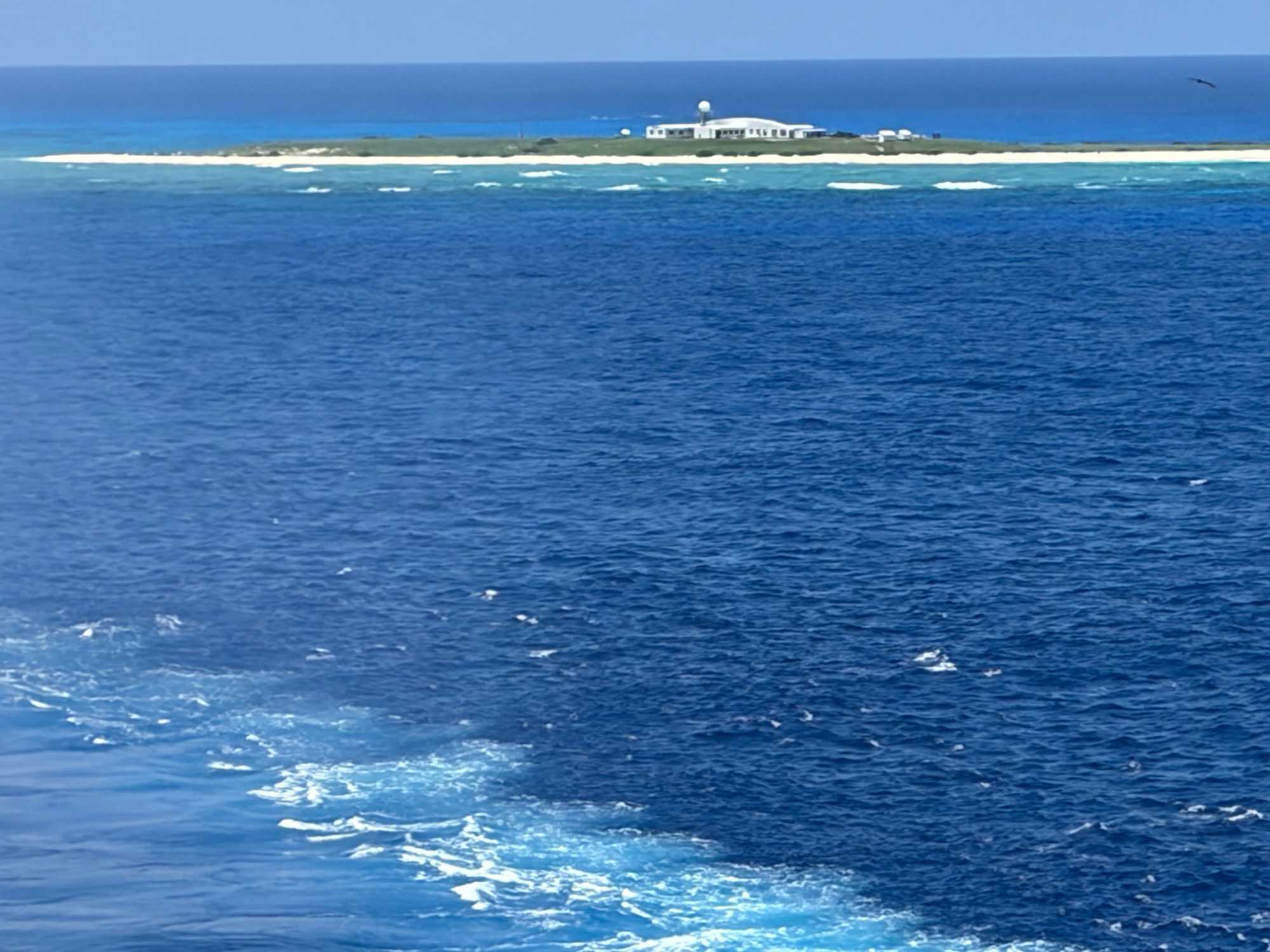 Quelle ne fut pas notre surprise de voir au loin, parmi cette mer émeraude, entourée de massifs coraliens, un bâtiment plat isolé, et aucun voisin à l’horizon. Bien sûr, nous ne pouvions pas accoster sur cette réserve protégée. Les espèces de la faune aviaire qui y ont élu domicile en ont fait un lieu de nidification et de reproduction important pour chacune des nombreuses espèces d'oiseaux marins, notamment des fous.