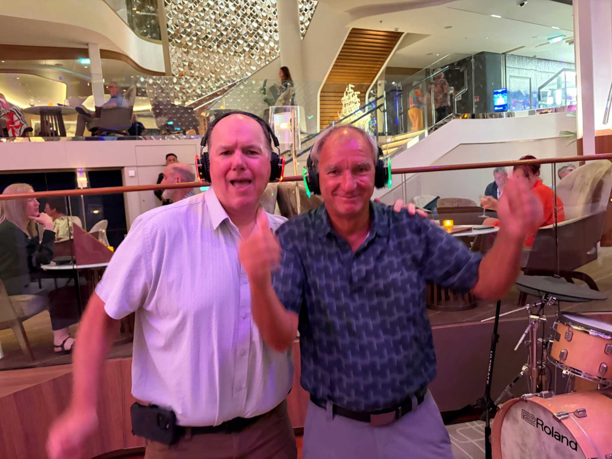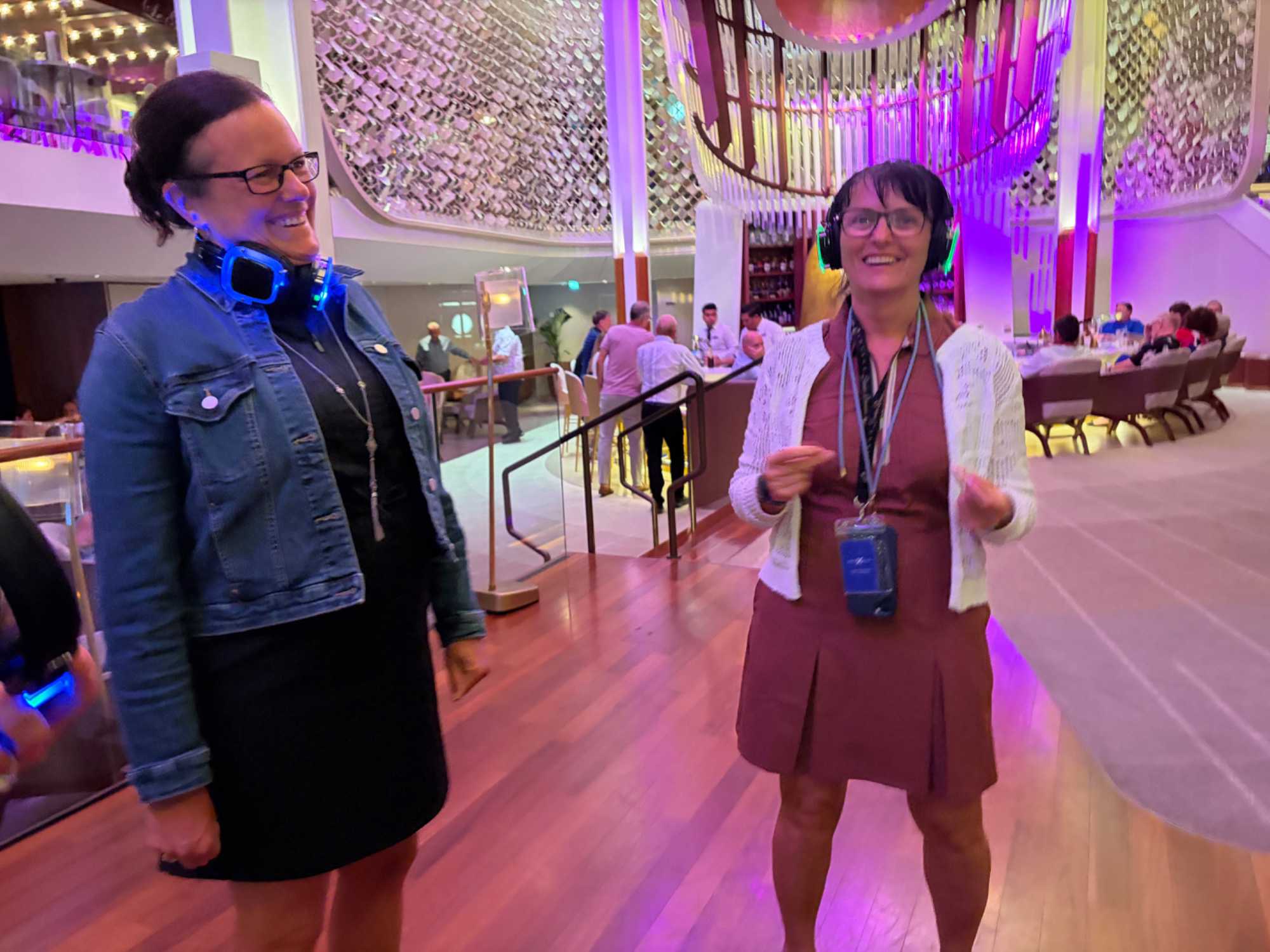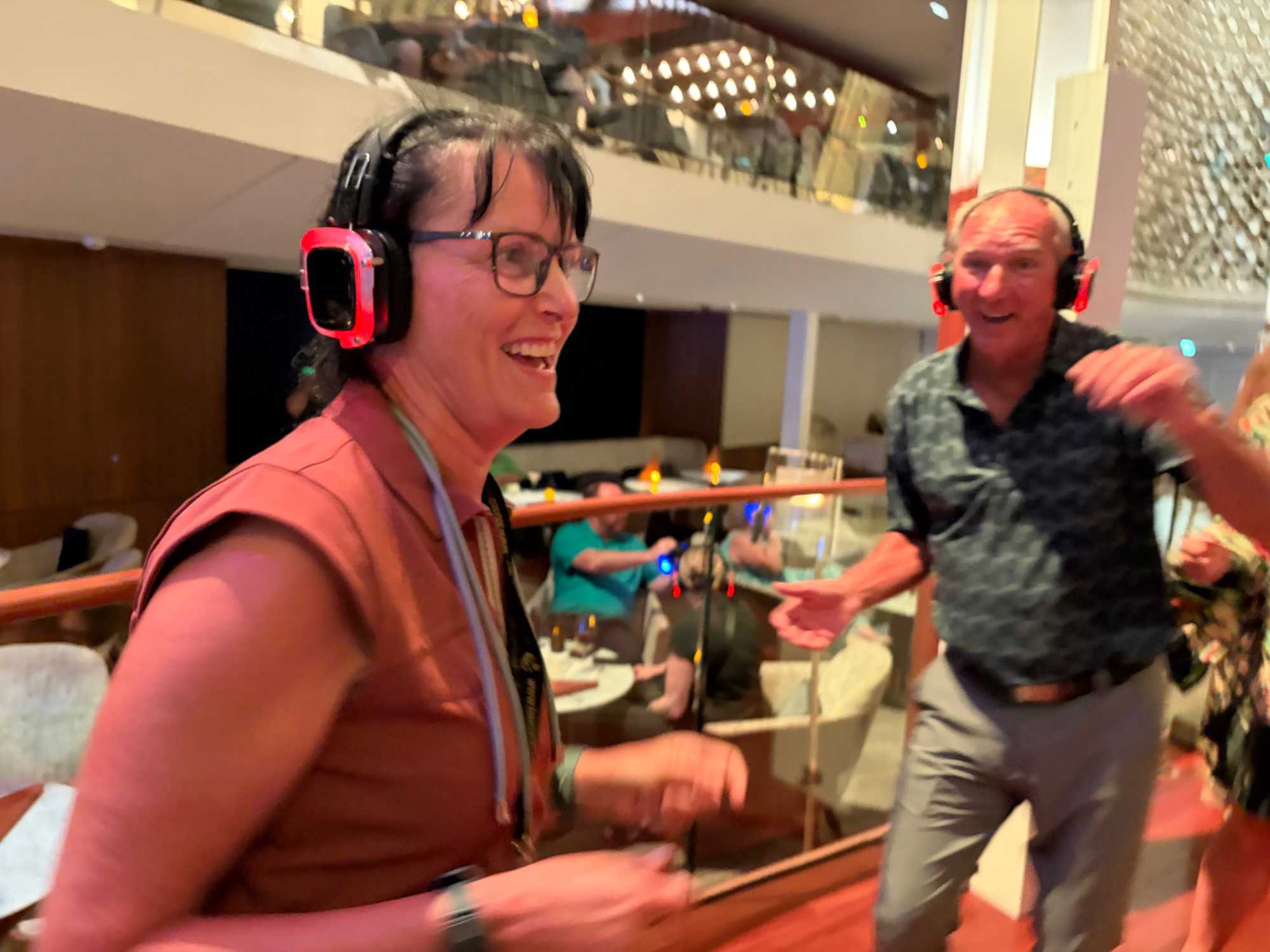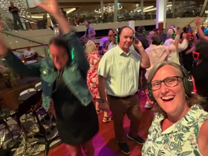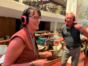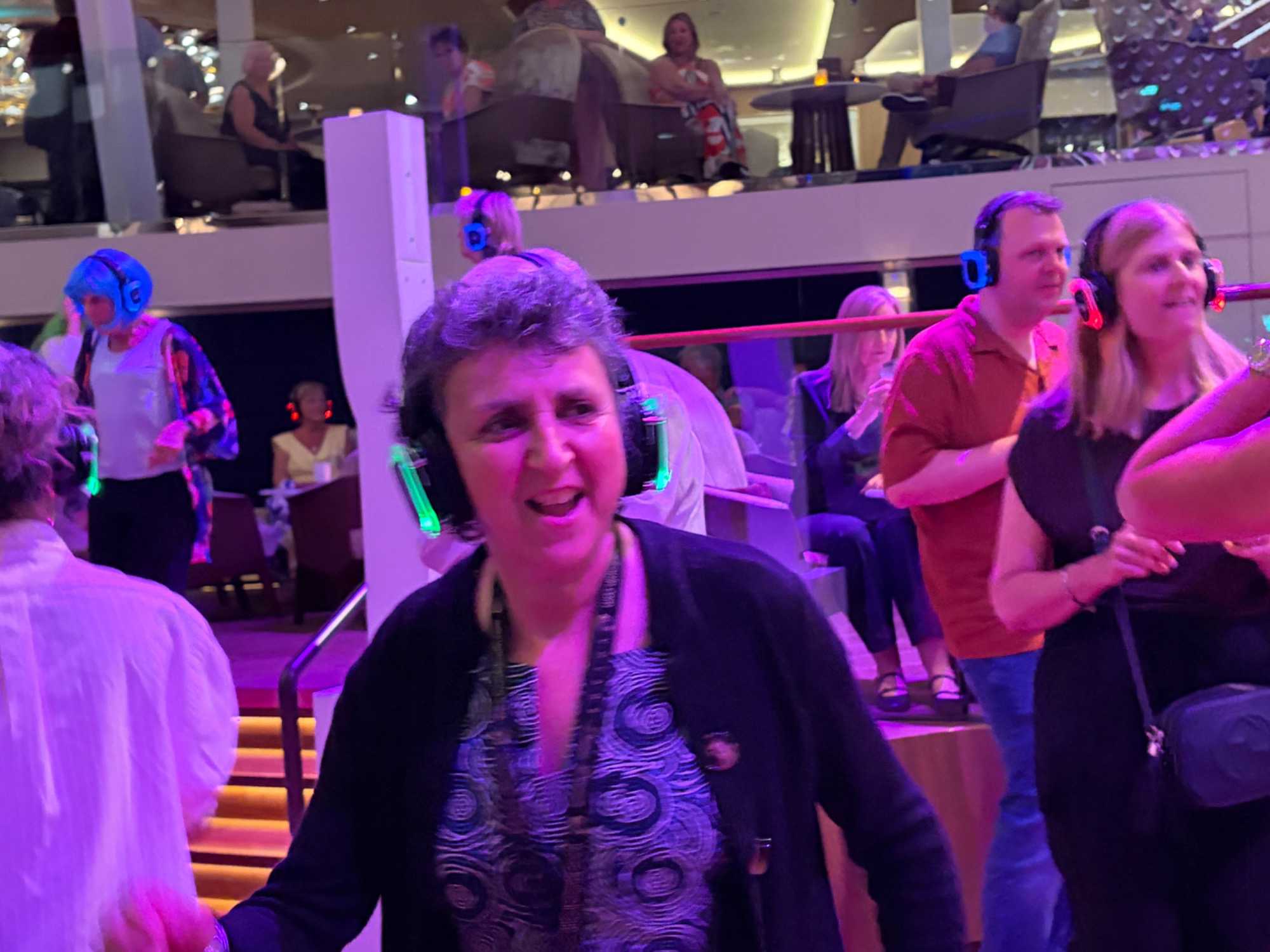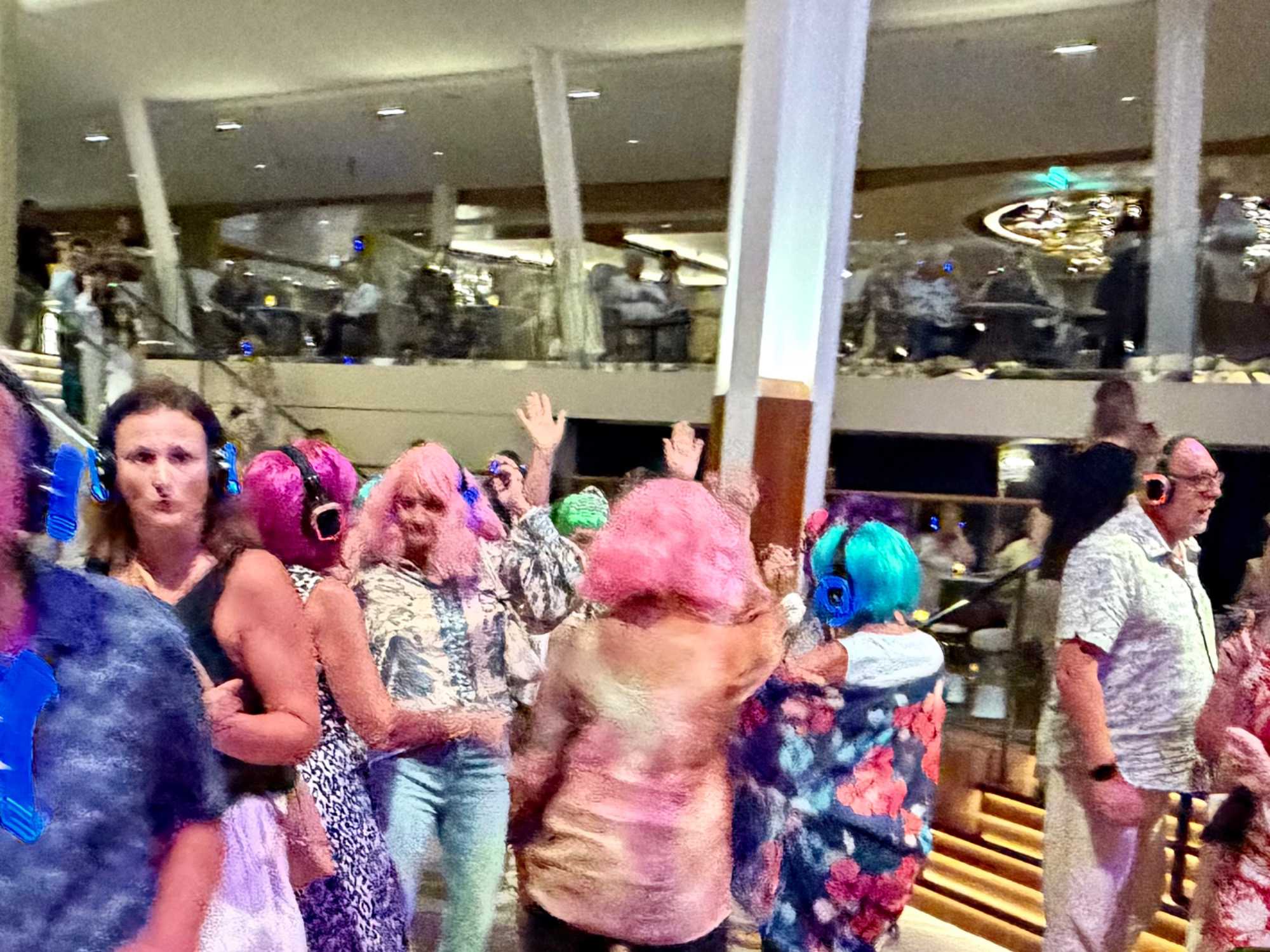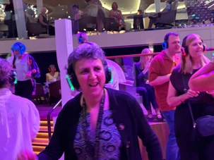 Pour les plus courageux qui acceptent de se coucher plus tard, il y a eu la célèbre discothèque silencieuse où nous portons un casque d’écoute avec un choix de trois musique différentes. Brigitte, Renée, André, Josée, moi-même sans oublier notre valeureux danseur Yvon, nous nous sommes bien amusés en alternant nos choix musicaux passant du latino, aux disco des années 70-80 et nous déhanchant également sur des musiques plus récentes mais, nous n’étions pas les seuls. La piste de danse affichait complète surtout avec ce groupe de dames aux perruques de toutes les couleurs qui avaient vraisemblablement décider de se laisser aller en suivant le rythme d’une petite dame noire ma foi fort énergique. Une expérience à vivre au moins une fois lors d‘une croisière.