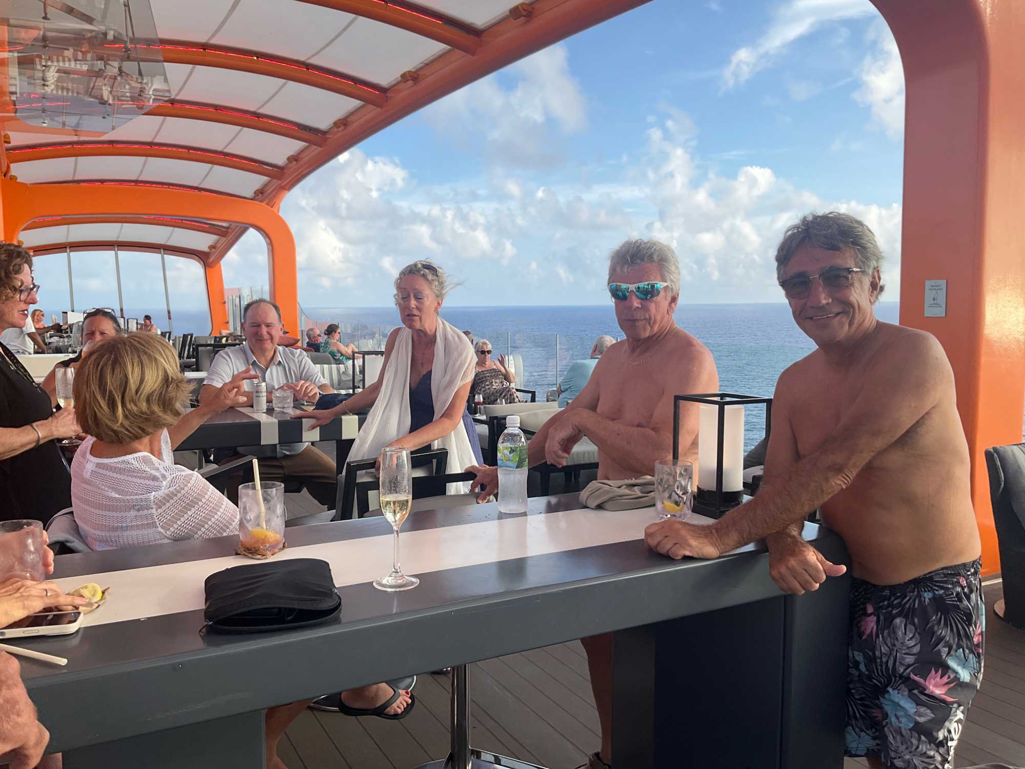Petit après-midi relaxe sur les ponts. Puis, en fin d’après-midi, on s’était donné rendez-vous au bar de ce fameux Magic Carpet sur le pont 15. Quel soleil et …quelle chaleur. Finalement, on a su qu’hier à Port Douglass, il avait fait 44 degrés Celsius et avec l’humidité, la température doit être sensiblement la même aujourd’hui. Une belle fin d’après-midi dans cette plate-forme accrochée au sommet du navire. On y a vu le soleil nous laisser à nos rires et nos souvenirs de voyage. Cette rencontre se termine par un succulent souper entre amis à la salle à manger Normandie.
