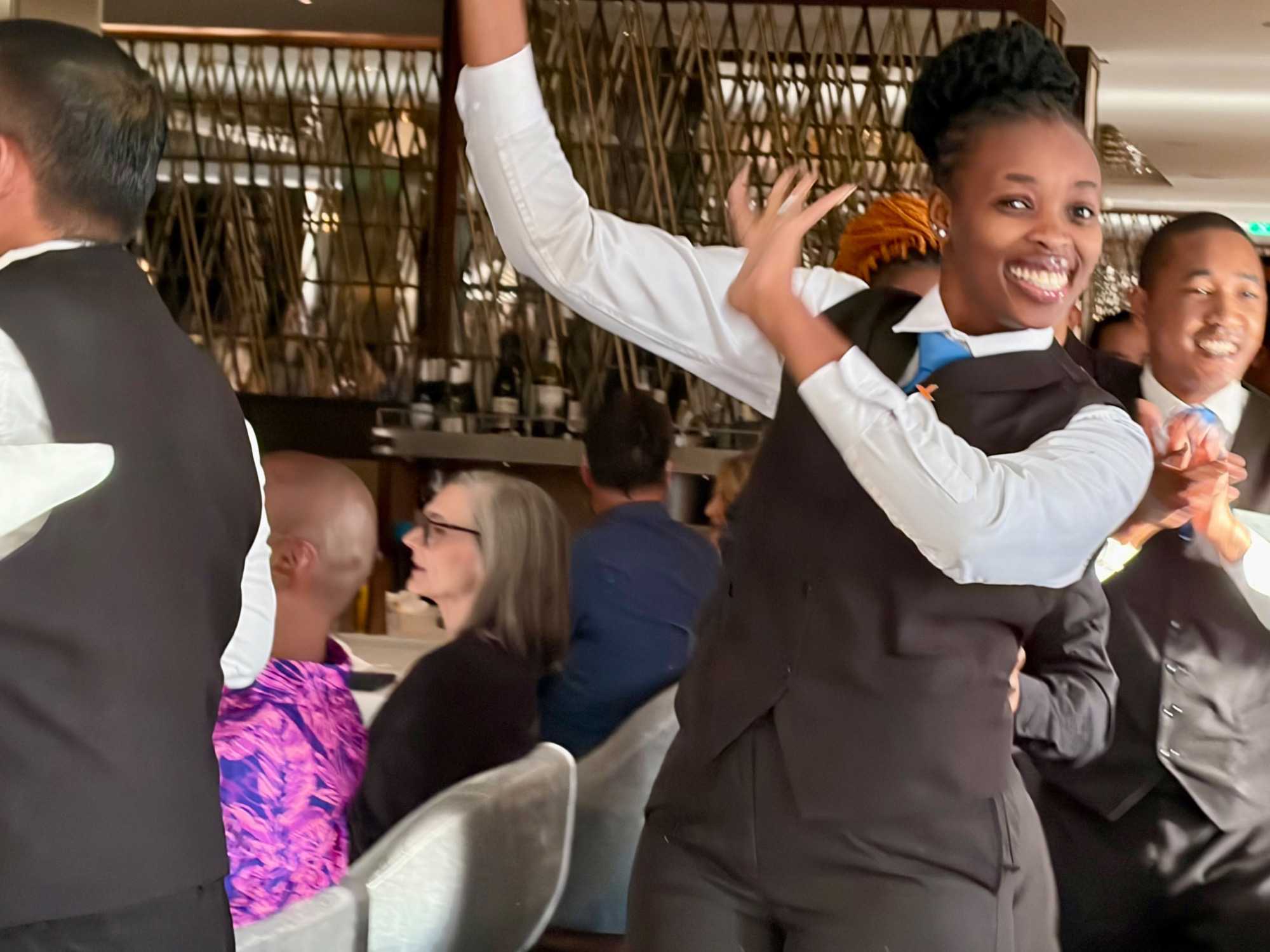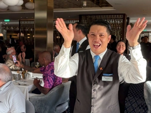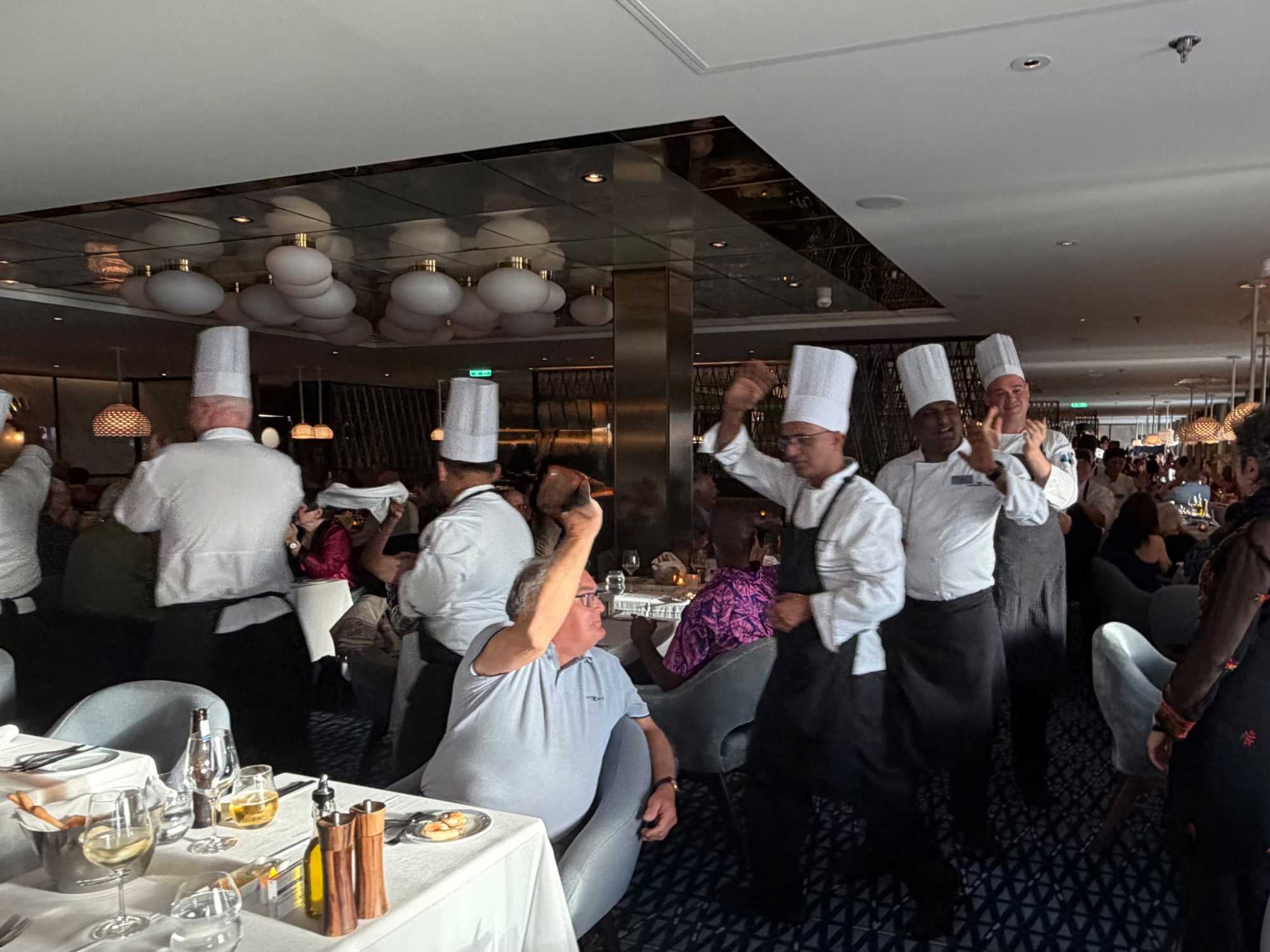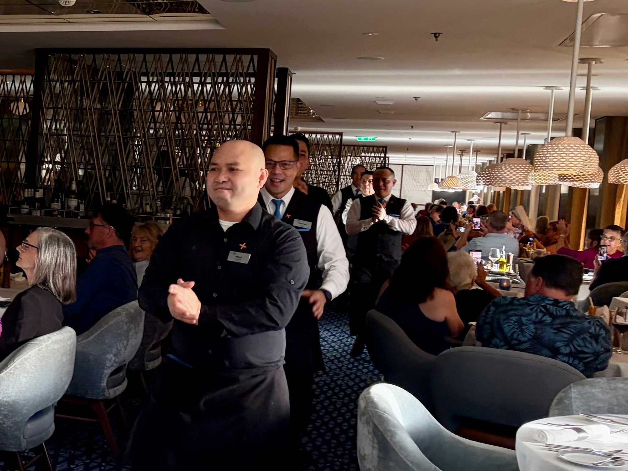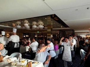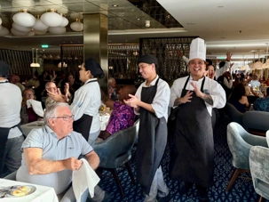 À l’aide de nos photos, on tenait à vous présenter toute l’équipe de l’une des quatre salles à manger, qui comme à chaque croisière, fait le tour de la salle pour nous remercier mais il est bien évident que c’est à nous de les remercier pour l’excellent travail qu’ils font pour rendre notre séjour agréable. Chapeau à tout le personnel qui est là, au travail, et pendant six mois pendant que nous nous amusons…et mangeons abondamment!