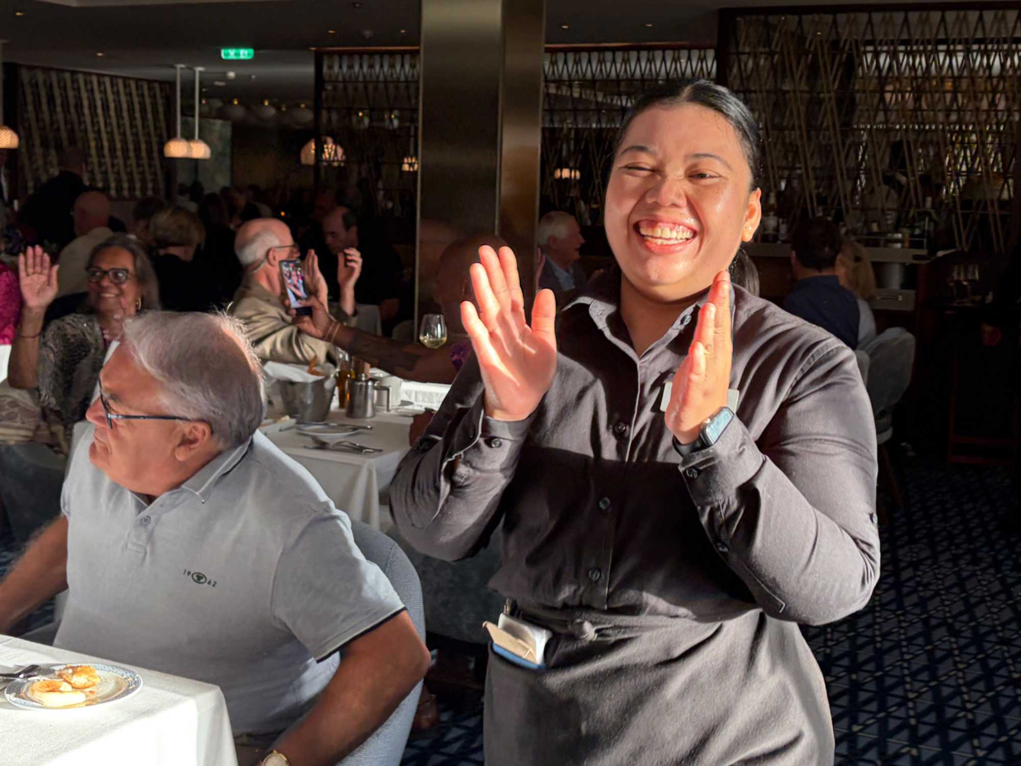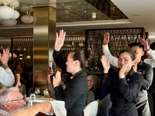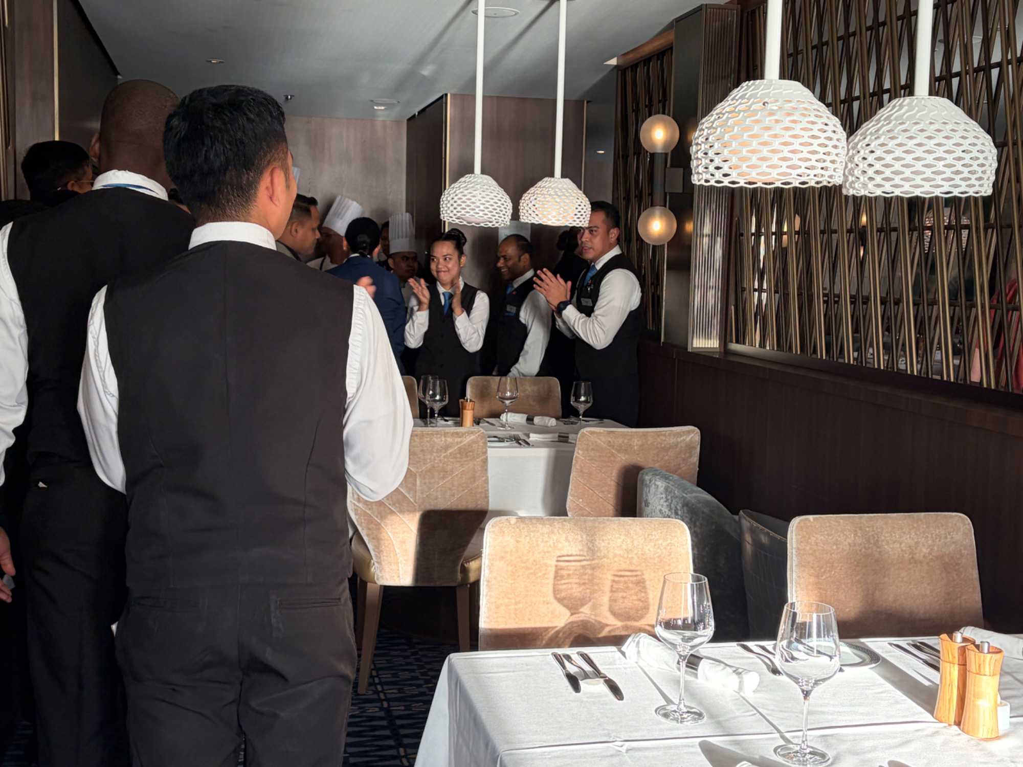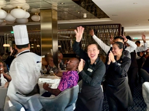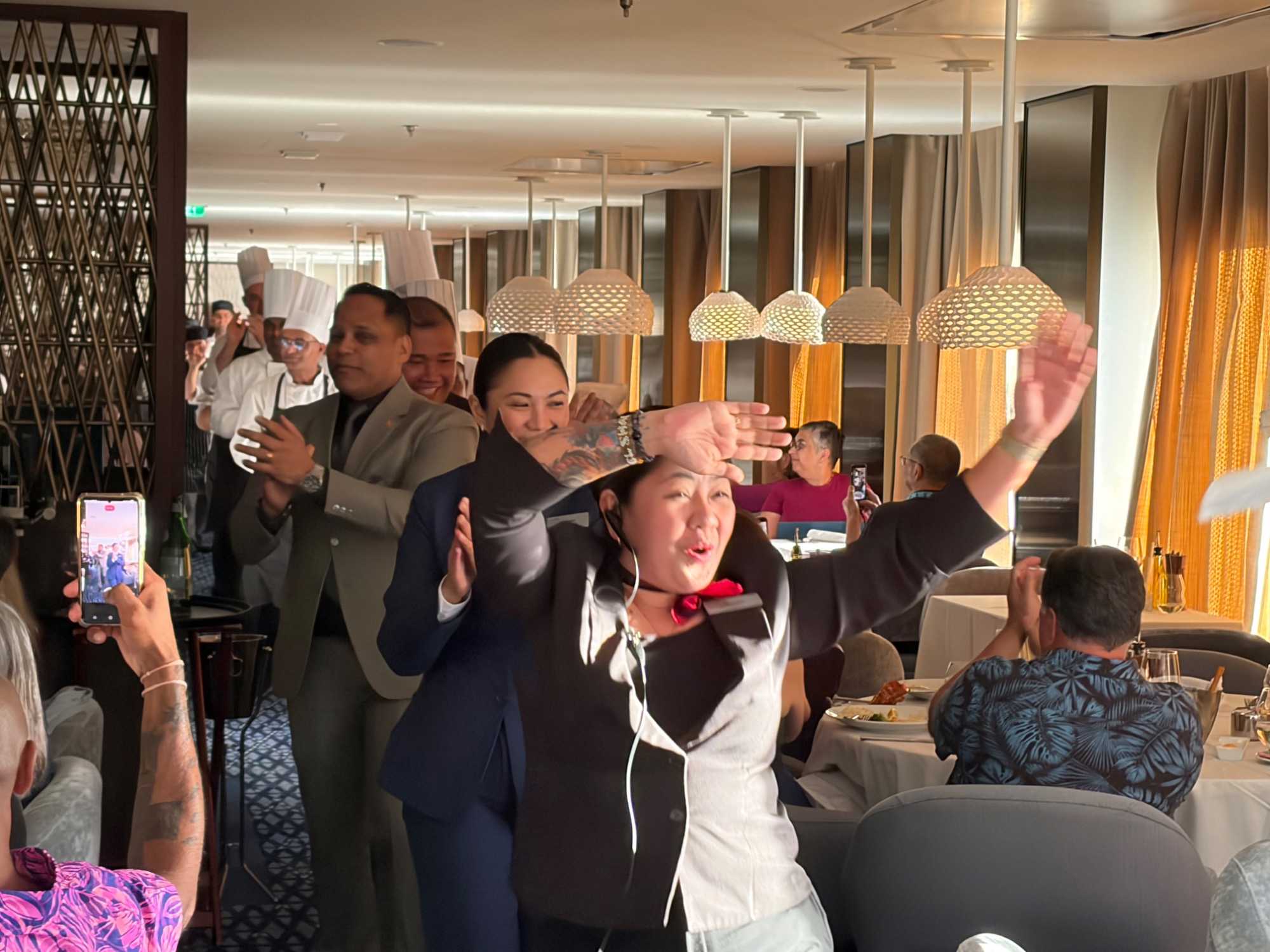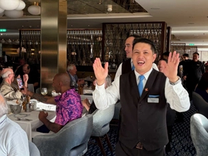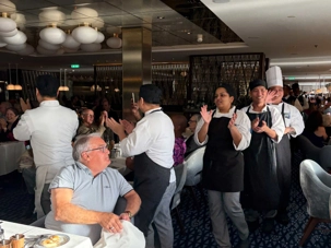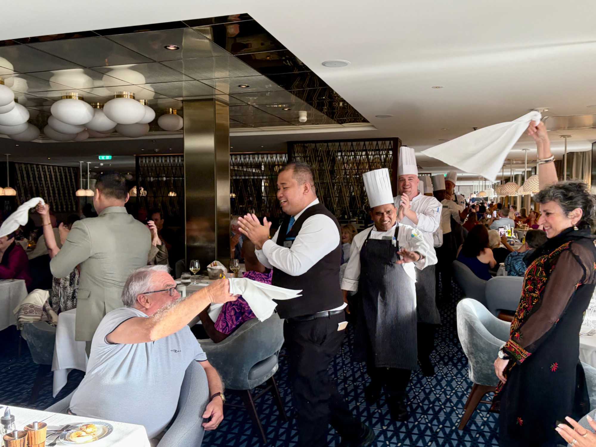 À l’aide de nos photos, on tenait à vous présenter toute l’équipe de l’une des quatre salles à manger, qui comme à chaque croisière, fait le tour de la salle pour nous remercier mais il est bien évident que c’est à nous de les remercier pour l’excellent travail qu’ils font pour rendre notre séjour agréable. Chapeau à tout le personnel qui est là, au travail, et pendant six mois pendant que nous nous amusons…et mangeons abondamment!