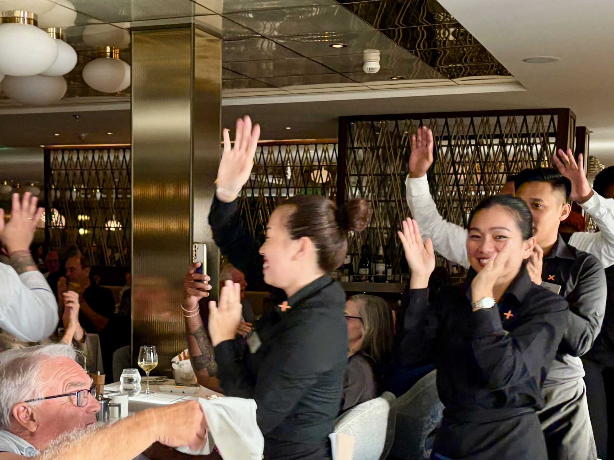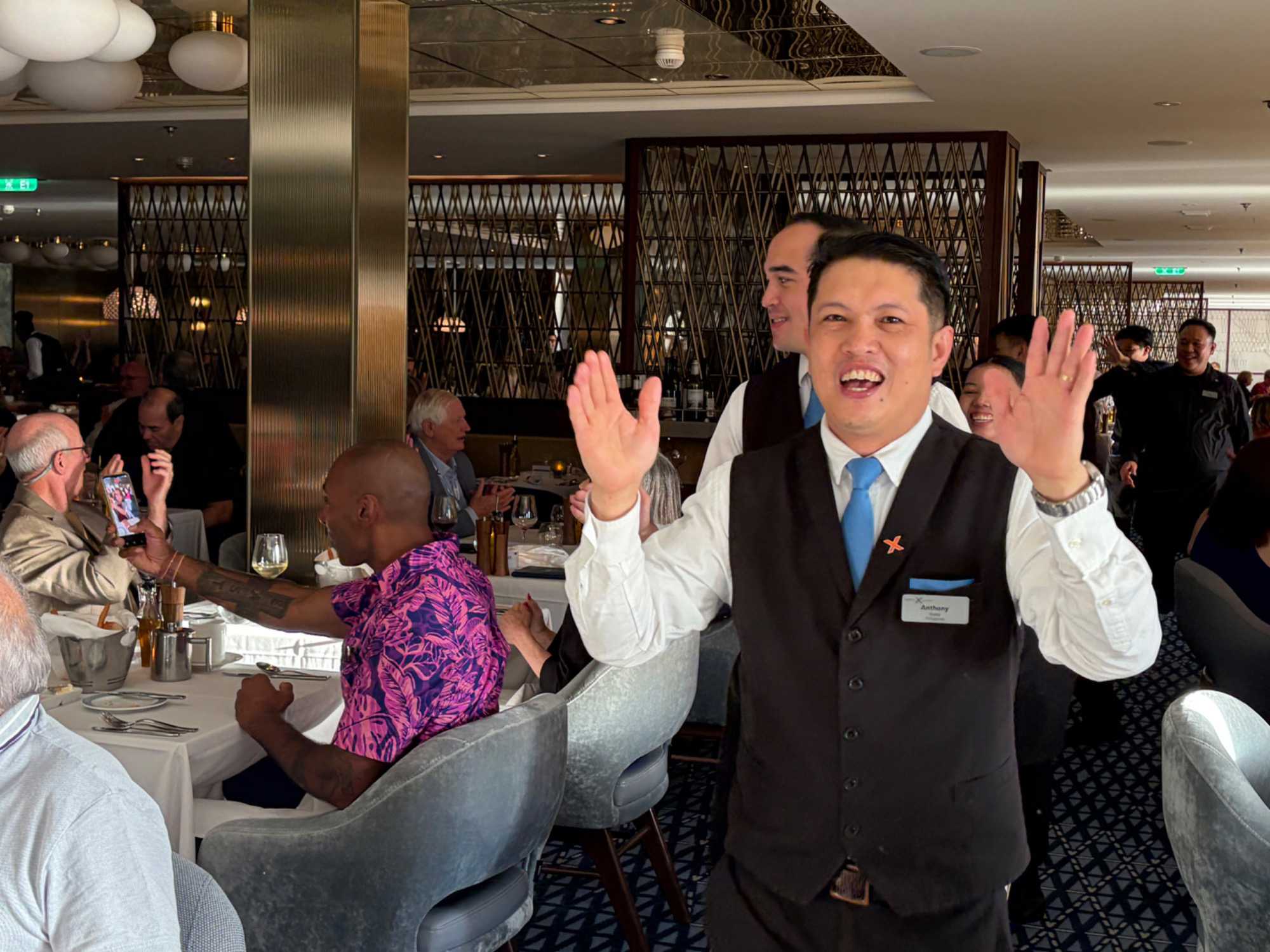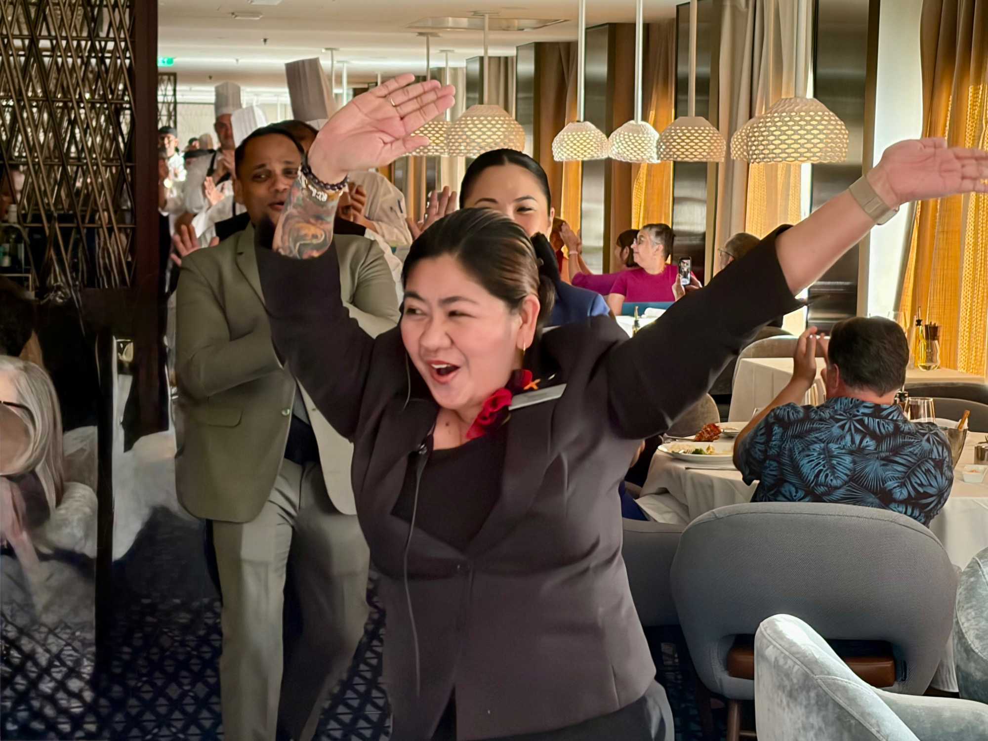 À l’aide de nos photos, on tenait à vous présenter toute l’équipe de l’une des quatre salles à manger, qui comme à chaque croisière, fait le tour de la salle pour nous remercier mais il est bien évident que c’est à nous de les remercier pour l’excellent travail qu’ils font pour rendre notre séjour agréable. Chapeau à tout le personnel qui est là, au travail, et pendant six mois pendant que nous nous amusons…et mangeons abondamment!