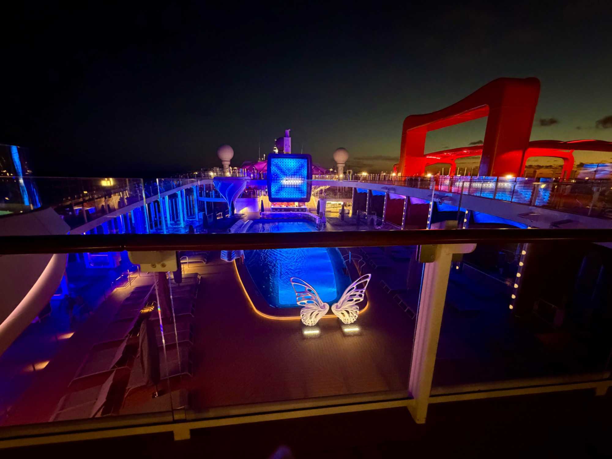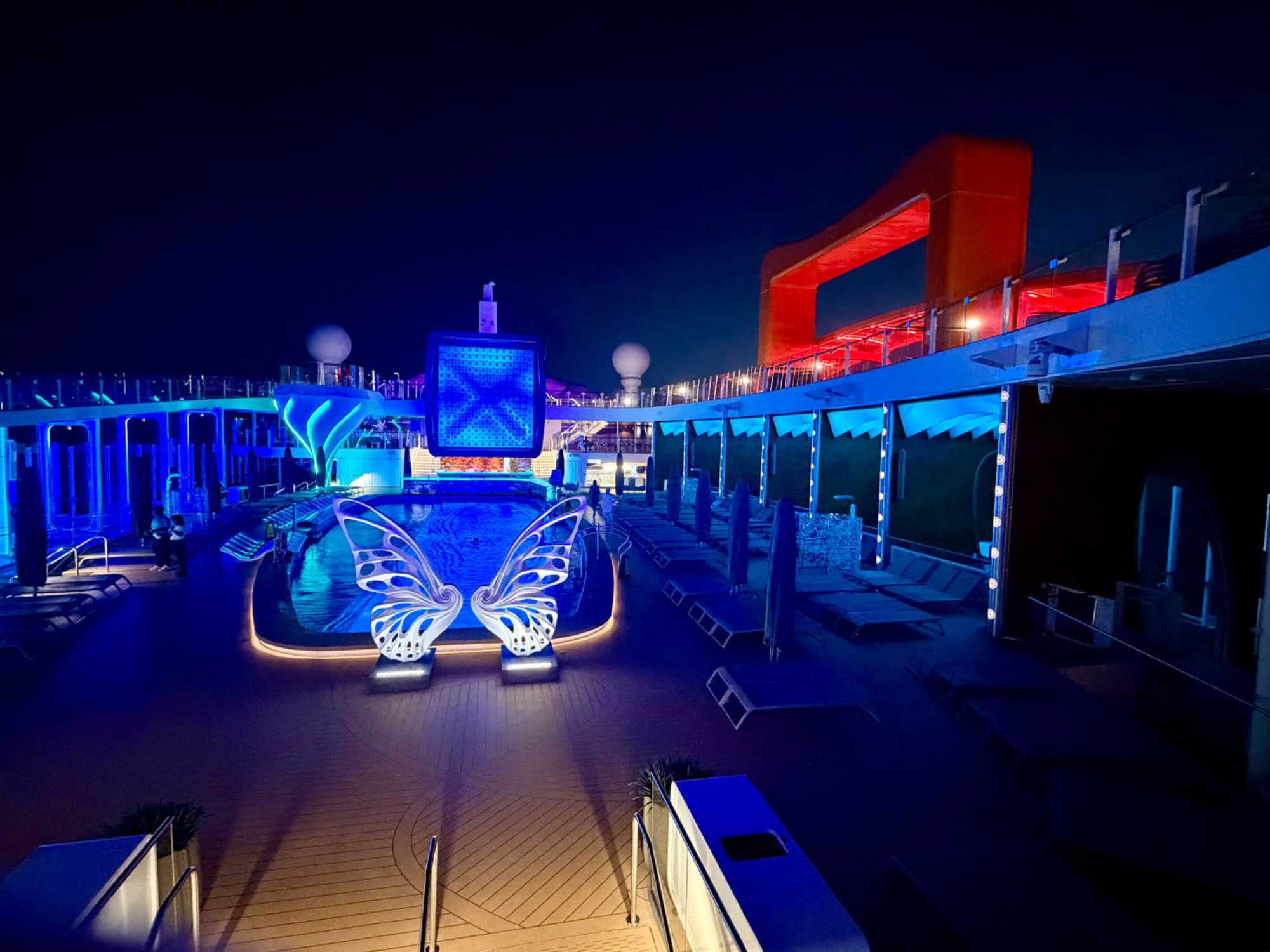 Une des spécificités du Edge demeure son Magic Carpet où nous sommes allés hier pour notre 5 à 7. On vous en parle un peu plus longuement aujoud’hui. En entrant sur le navire lors de notre embarquement, on avait bien vu cette plateforme mobile, une première dans l'industrie. Cette plateforme flottante orange en porte-à-faux a la taille d'un court de tennis, située sur le côté tribord du navire, elle se déplace entre les ponts 2 et 16 pour changer de fonction. Elle sert également de plateforme d'embarquement pour les annexes au pont 2, d'extension extérieure pour le restaurant Raw on 5 au pont 5, de bar au pont 14, et de lieu pour des dîners exclusifs, pour des repas avec vue au pont 16. Y prendre un verre à l’occasion fut bien agréable.