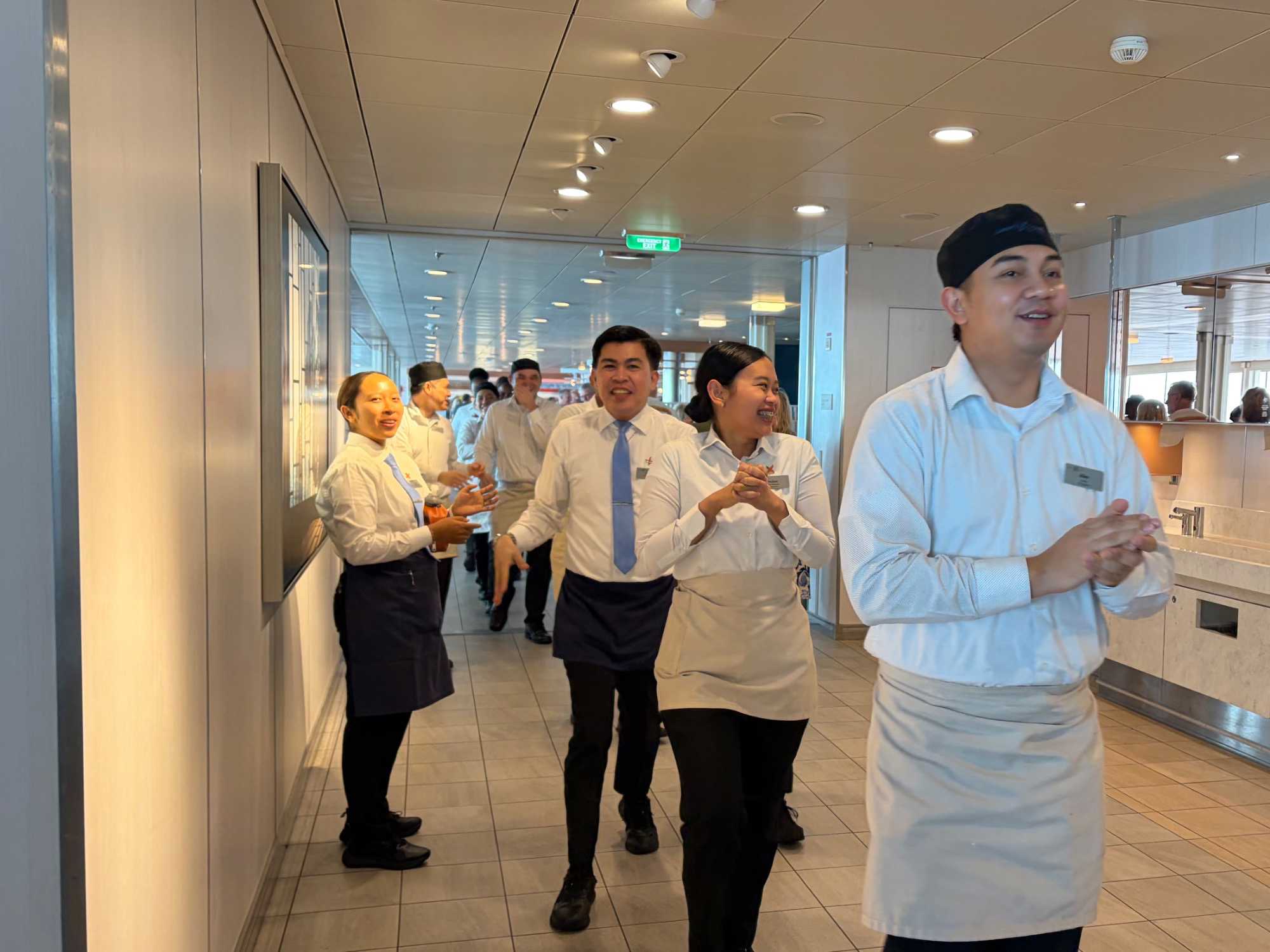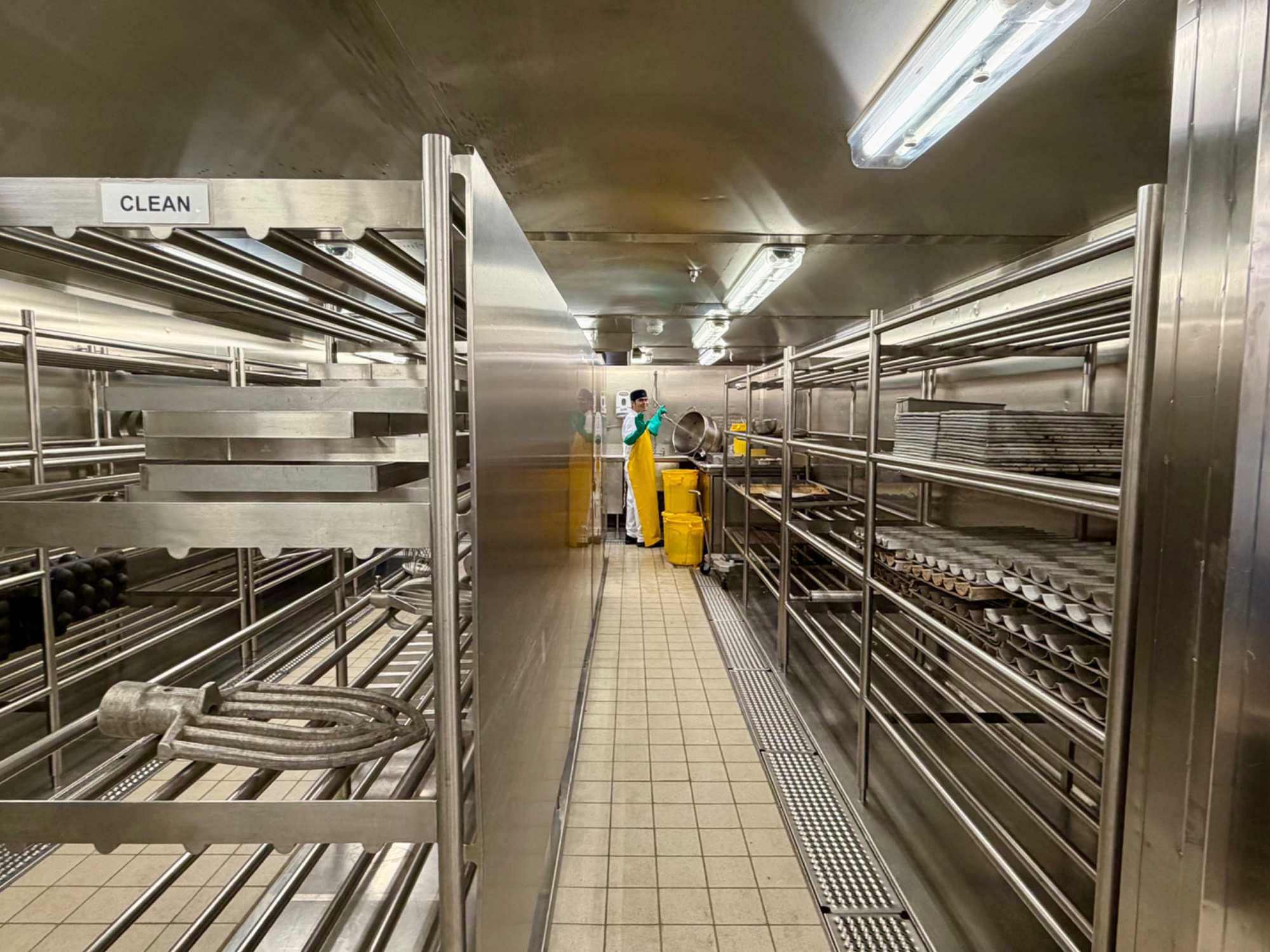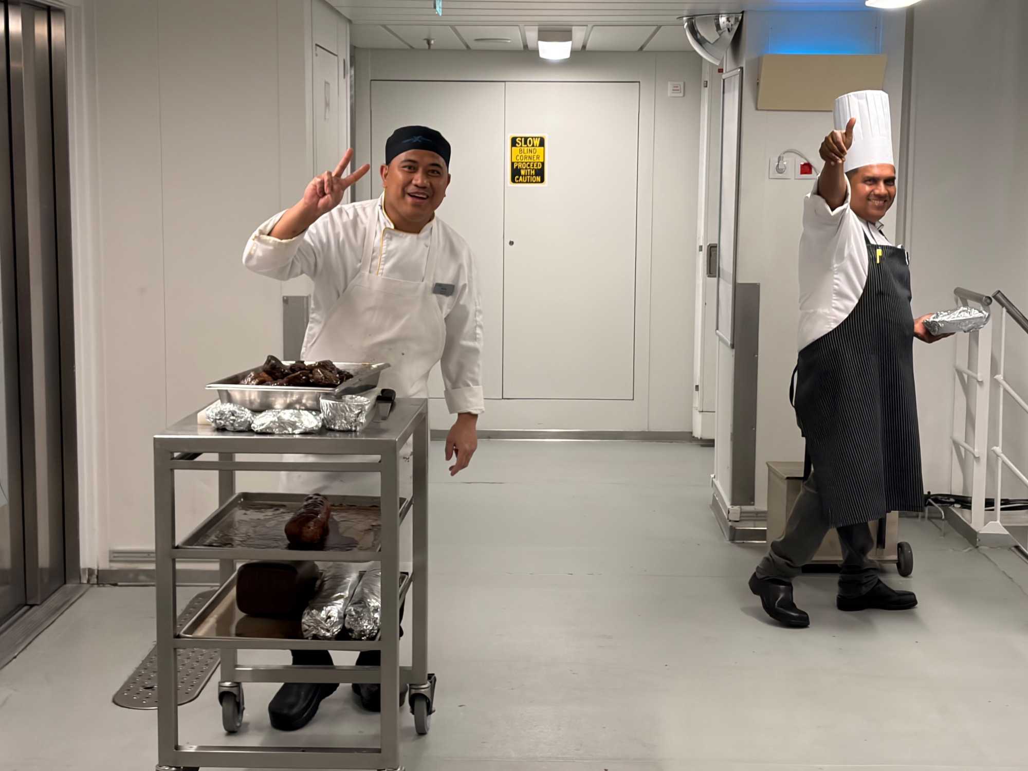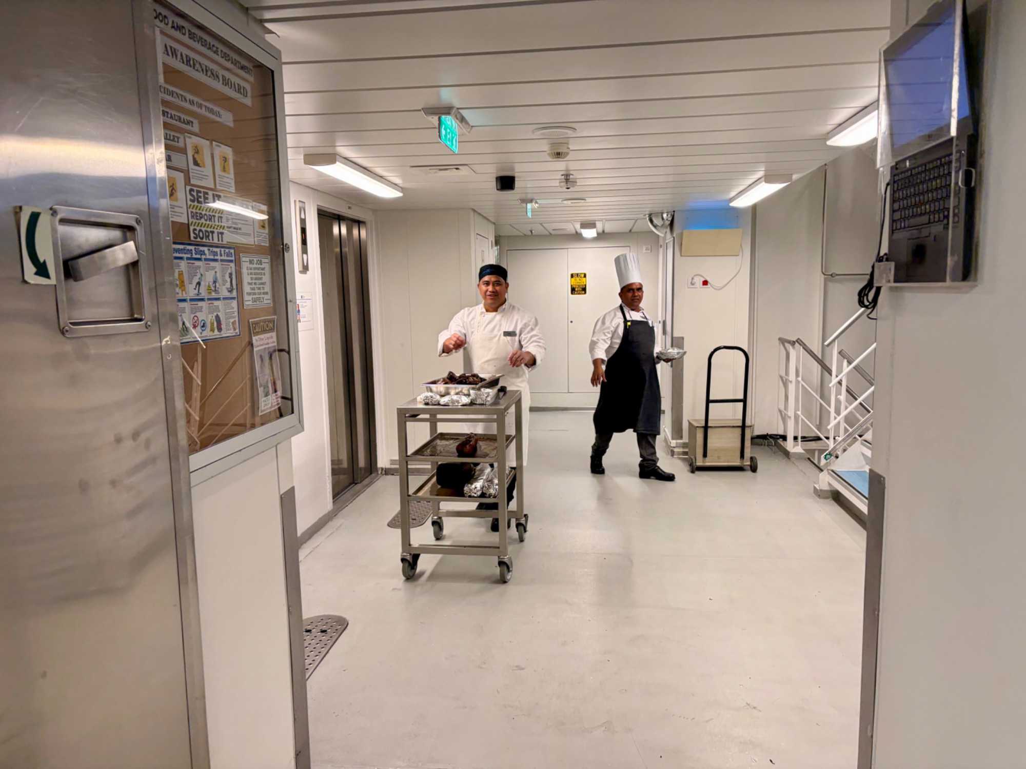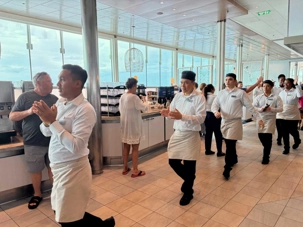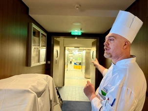 Après le dîner, notre groupe a eu la chance de faire une visite guidée spéciale des coulisses des cuisines et plus spécialement des salles à manger le Cyprus et le Cosmopolitain. Davide, l’assistant chef nous a accueilli en nous mentionnant comment la visite allait se dérouler et nous a fait passer par la porte magique En fait, il y en a deux, car pour éviter la circulation alors que les serveurs transportent d’immenses cabarets, chacune des portes se veut à sens unique, évitant ainsi des incidents. Les paniers pour recueillir la nourriture sont positionnés à l’entrée près des lave-vaisselle. Et il y a des « laveurs de pot » identifiés pour vaisselle et …pots c’est-à-dire les chaudrons. Quel monde comparé à nos petits îlots pour préparer notre pizza et notre pourding chômeur! C’est près de 10 000 repas par jour qui sont préparés dans ces cuisines soit 60 000 assiettes. Impressionnant de voir les quantités phénoménales d'ingrédients, 150 000 oeufs par jour sont utilisés pour tous les mets...y compris les omelettes. Des tonnes et des tonnes de lait par année. Les comptoirs de pâtisseries et de boulangeries étaient particulièrement intéressant de même que les odeurs. Tous les pains, pâtes à pizza, viennoiseries et « pasta » sont fait maison et à bord du navire. Une section munie d’une plaque de marbre est même réservée pour la confection des pâtes plus délicates comme la pâte à choux, la pâte brisée… Il y a des employés pour chacun des quarts de travail car les cuisines roulent 24 heures sur 24. Ici, la fraîcheur est de mise. Je préfère ne pas voir la facture de leur épicerie. Une visite qui nous a permis d'apprécier encore davantage le travail de plus de 250 cuisiniers et 112 aide-cuisiniers qui sont là jour et nuit pour nous. Nous verrons nos assiettes d'un autre oeil ce soir.
