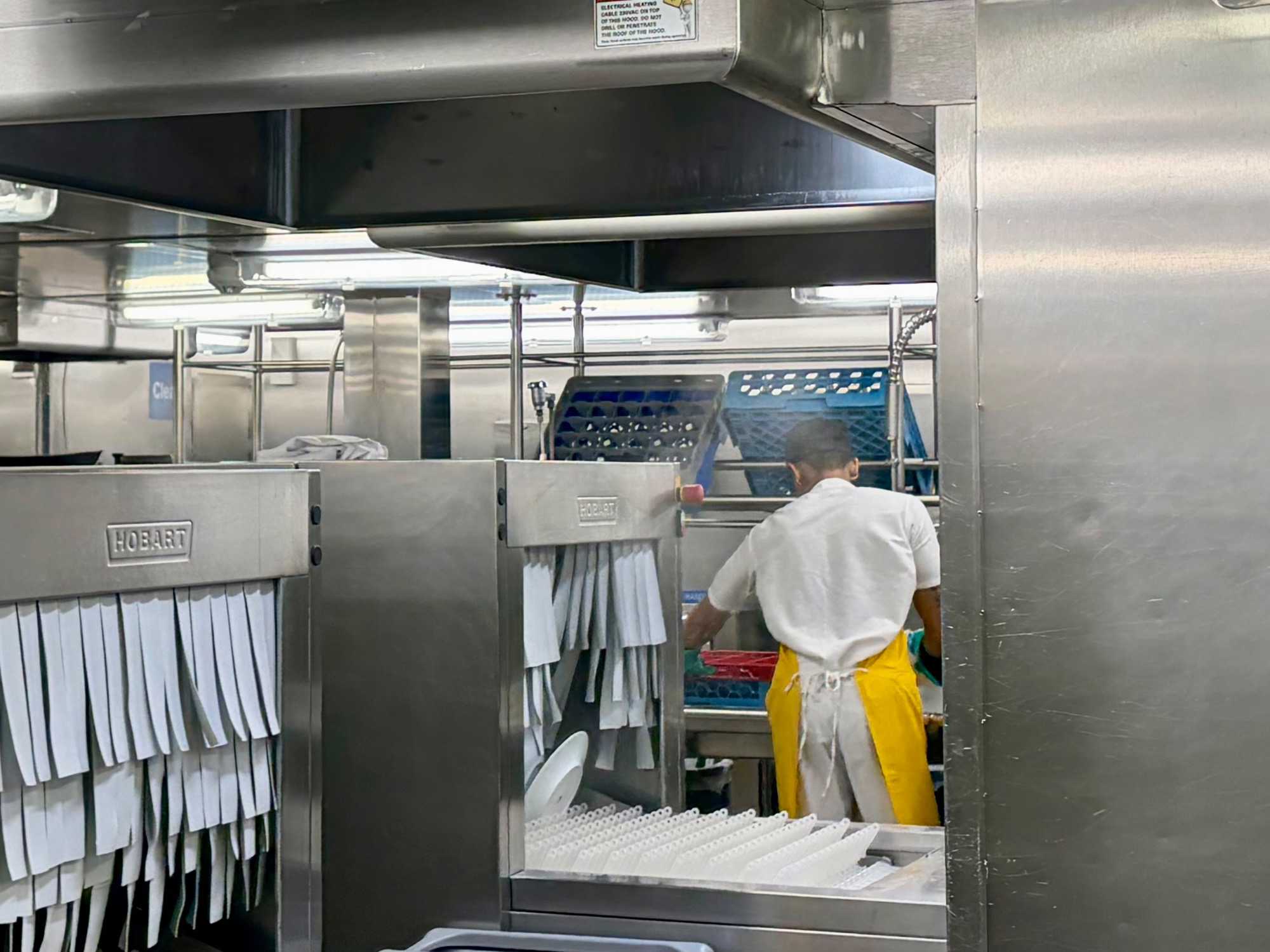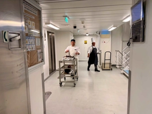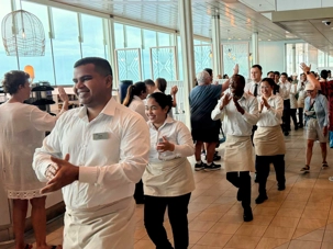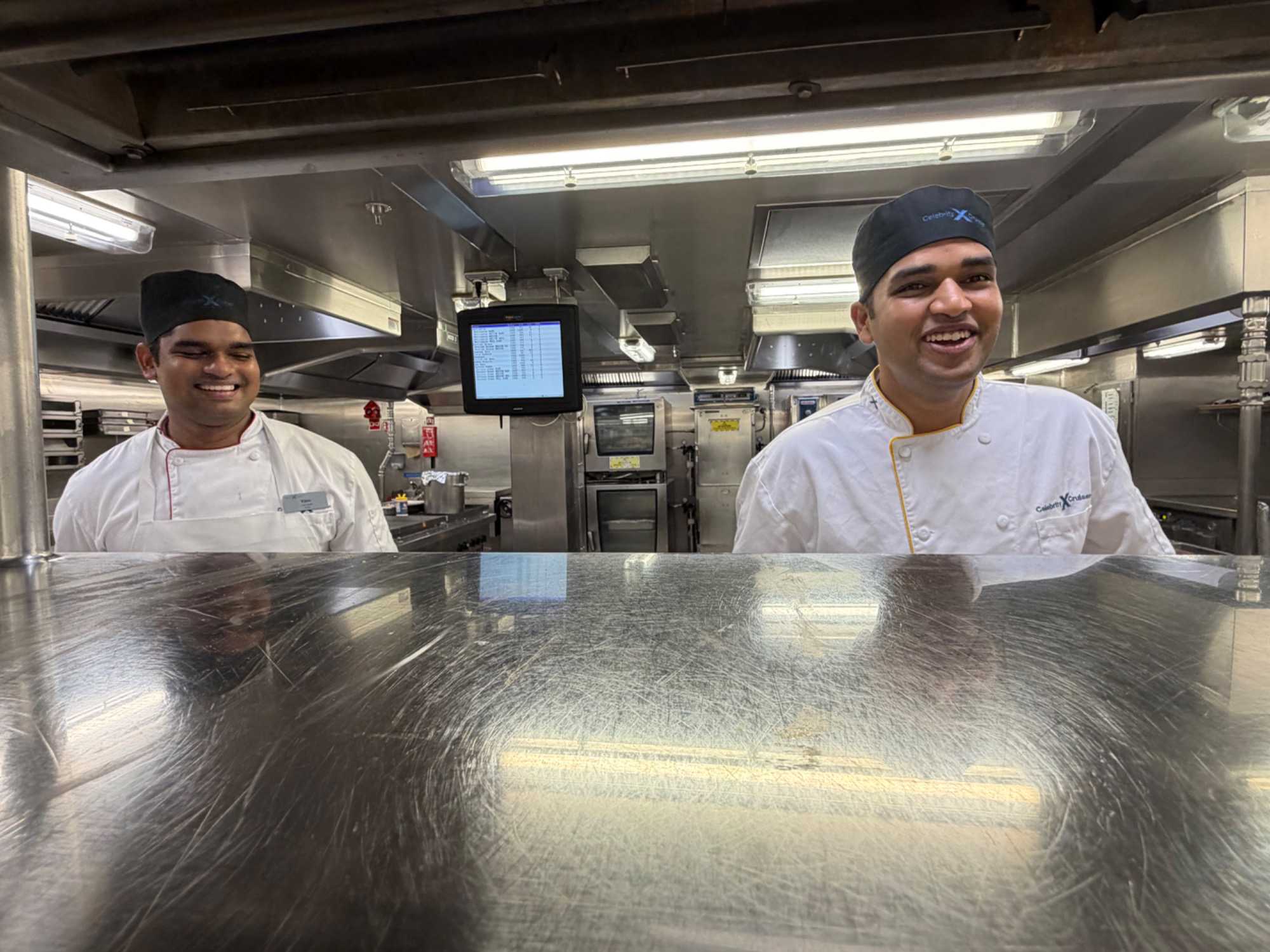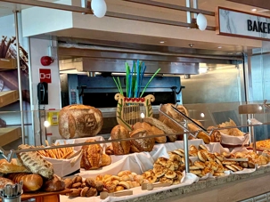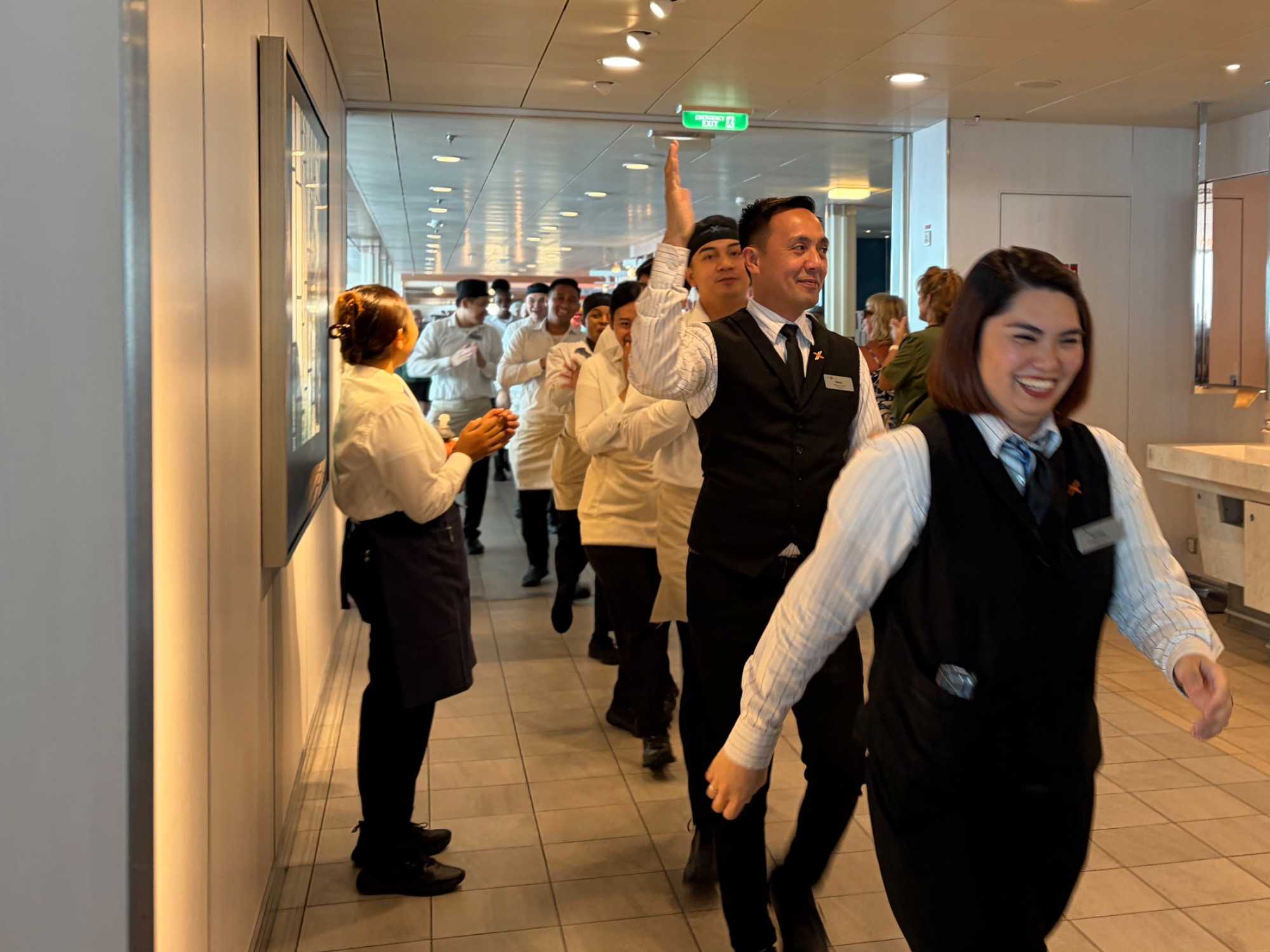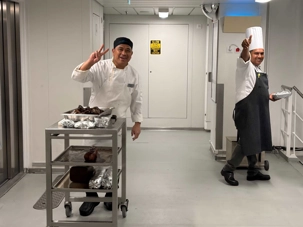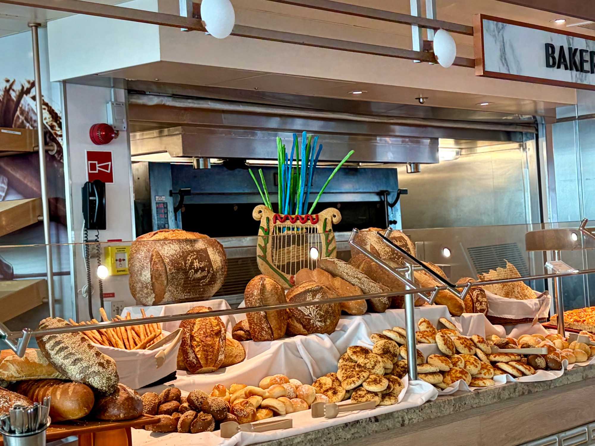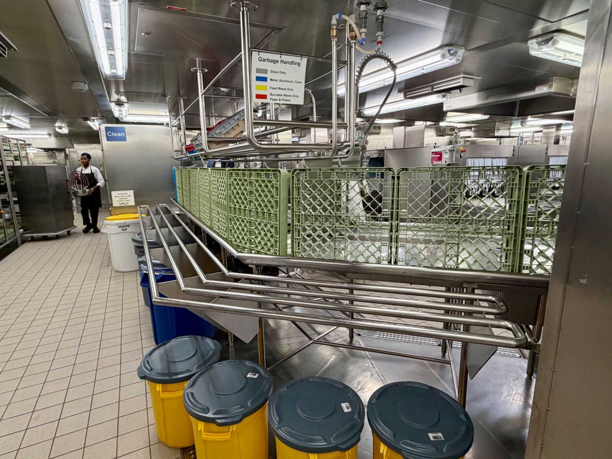 Après le dîner, notre groupe a eu la chance de faire une visite guidée spéciale des coulisses des cuisines et plus spécialement des salles à manger le Cyprus et le Cosmopolitain. Davide, l’assistant chef nous a accueilli en nous mentionnant comment la visite allait se dérouler et nous a fait passer par la porte magique En fait, il y en a deux, car pour éviter la circulation alors que les serveurs transportent d’immenses cabarets, chacune des portes se veut à sens unique, évitant ainsi des incidents. Les paniers pour recueillir la nourriture sont positionnés à l’entrée près des lave-vaisselle. Et il y a des « laveurs de pot » identifiés pour vaisselle et …pots c’est-à-dire les chaudrons. Quel monde comparé à nos petits îlots pour préparer notre pizza et notre pourding chômeur! C’est près de 10 000 repas par jour qui sont préparés dans ces cuisines soit 60 000 assiettes. Impressionnant de voir les quantités phénoménales d'ingrédients, 150 000 oeufs par jour sont utilisés pour tous les mets...y compris les omelettes. Des tonnes et des tonnes de lait par année. Les comptoirs de pâtisseries et de boulangeries étaient particulièrement intéressant de même que les odeurs. Tous les pains, pâtes à pizza, viennoiseries et « pasta » sont fait maison et à bord du navire. Une section munie d’une plaque de marbre est même réservée pour la confection des pâtes plus délicates comme la pâte à choux, la pâte brisée… Il y a des employés pour chacun des quarts de travail car les cuisines roulent 24 heures sur 24. Ici, la fraîcheur est de mise. Je préfère ne pas voir la facture de leur épicerie. Une visite qui nous a permis d'apprécier encore davantage le travail de plus de 250 cuisiniers et 112 aide-cuisiniers qui sont là jour et nuit pour nous. Nous verrons nos assiettes d'un autre oeil ce soir.