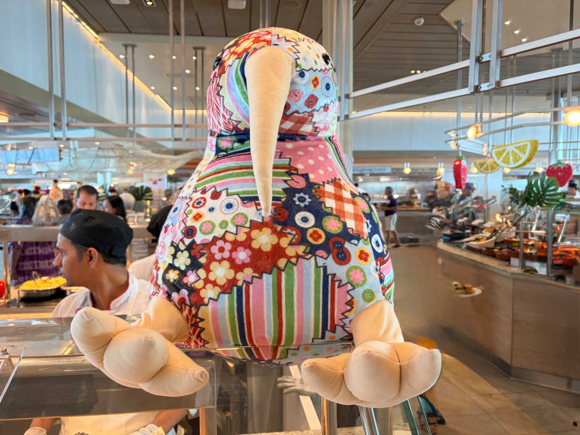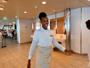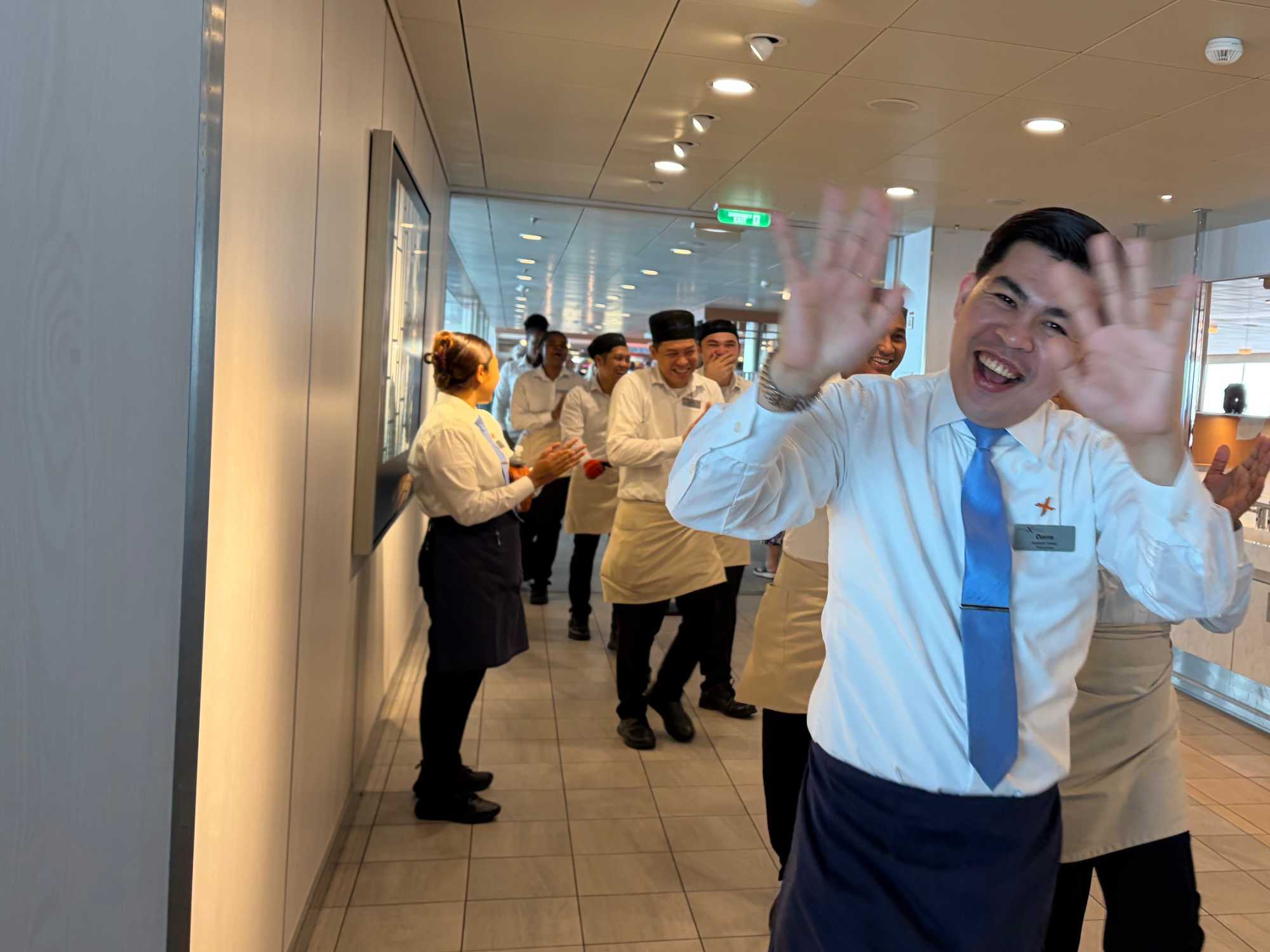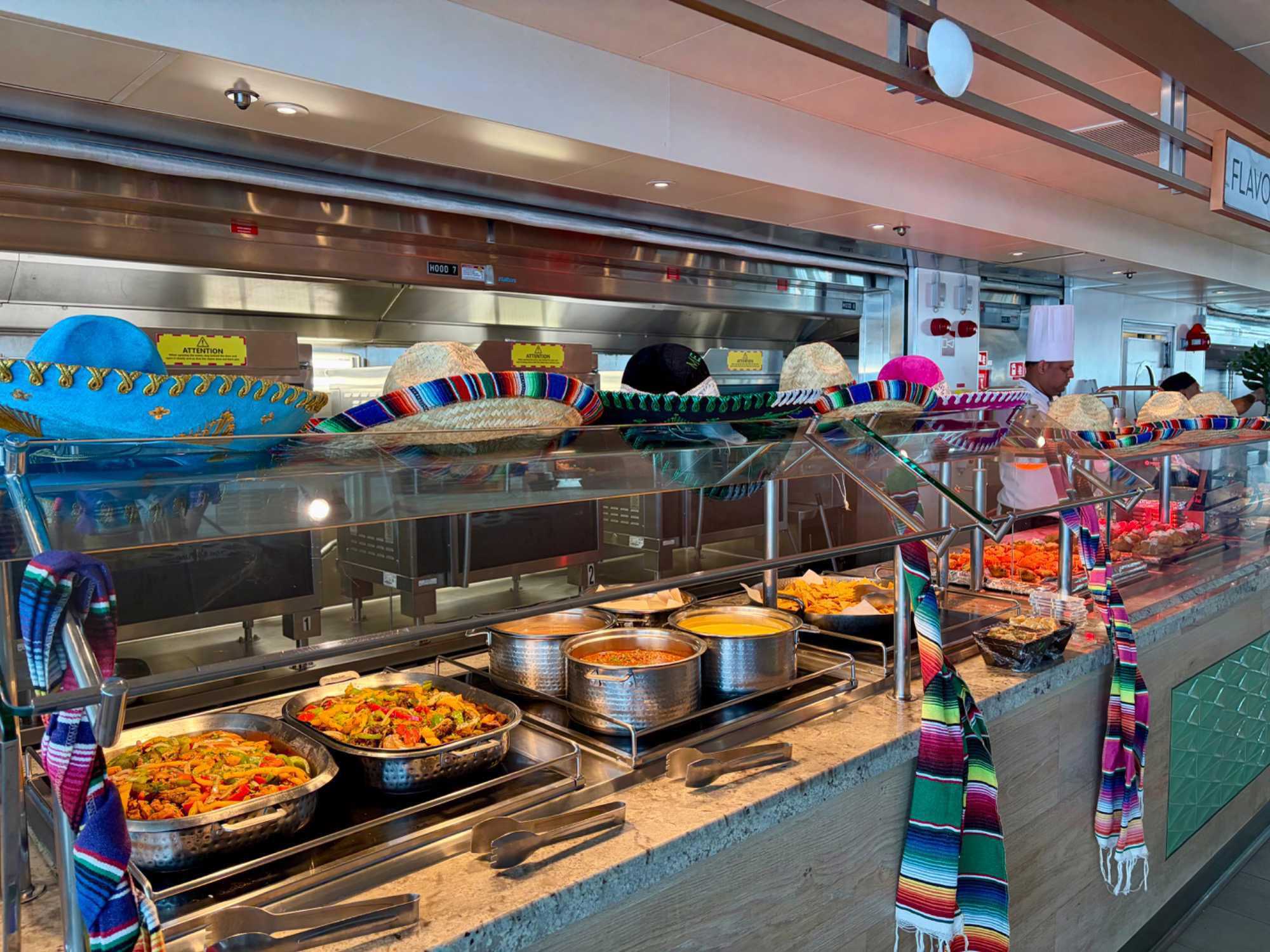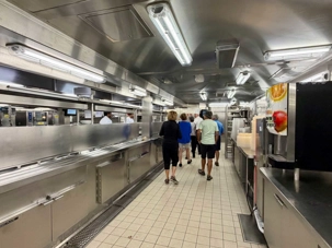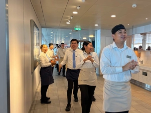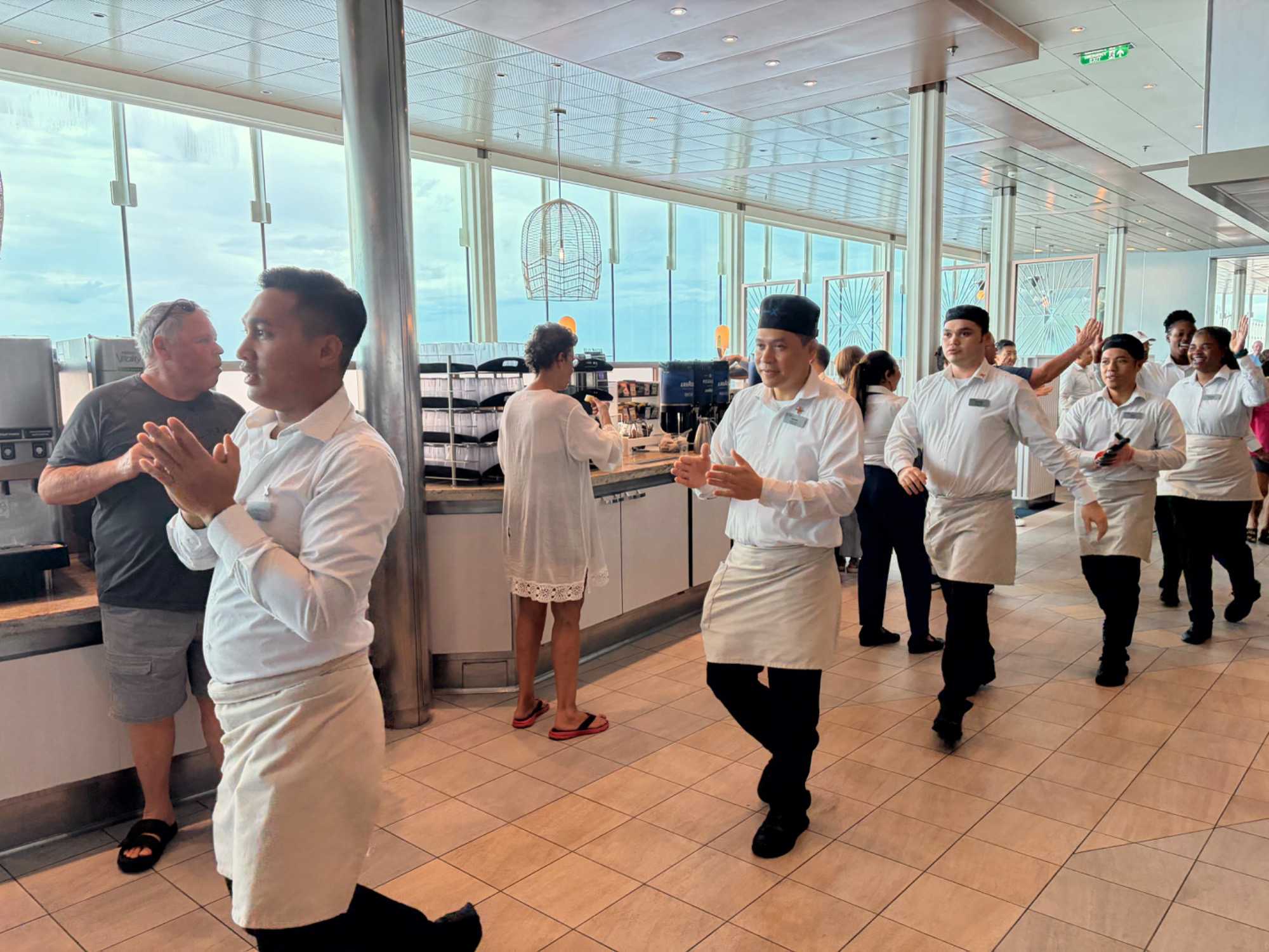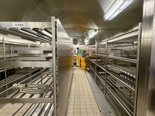 Après le dîner, notre groupe a eu la chance de faire une visite guidée spéciale des coulisses des cuisines et plus spécialement des salles à manger le Cyprus et le Cosmopolitain. Davide, l’assistant chef nous a accueilli en nous mentionnant comment la visite allait se dérouler et nous a fait passer par la porte magique En fait, il y en a deux, car pour éviter la circulation alors que les serveurs transportent d’immenses cabarets, chacune des portes se veut à sens unique, évitant ainsi des incidents. Les paniers pour recueillir la nourriture sont positionnés à l’entrée près des lave-vaisselle. Et il y a des « laveurs de pot » identifiés pour vaisselle et …pots c’est-à-dire les chaudrons. Quel monde comparé à nos petits îlots pour préparer notre pizza et notre pourding chômeur! C’est près de 10 000 repas par jour qui sont préparés dans ces cuisines soit 60 000 assiettes. Impressionnant de voir les quantités phénoménales d'ingrédients, 150 000 oeufs par jour sont utilisés pour tous les mets...y compris les omelettes. Des tonnes et des tonnes de lait par année. Les comptoirs de pâtisseries et de boulangeries étaient particulièrement intéressant de même que les odeurs. Tous les pains, pâtes à pizza, viennoiseries et « pasta » sont fait maison et à bord du navire. Une section munie d’une plaque de marbre est même réservée pour la confection des pâtes plus délicates comme la pâte à choux, la pâte brisée… Il y a des employés pour chacun des quarts de travail car les cuisines roulent 24 heures sur 24. Ici, la fraîcheur est de mise. Je préfère ne pas voir la facture de leur épicerie. Une visite qui nous a permis d'apprécier encore davantage le travail de plus de 250 cuisiniers et 112 aide-cuisiniers qui sont là jour et nuit pour nous. Nous verrons nos assiettes d'un autre oeil ce soir.