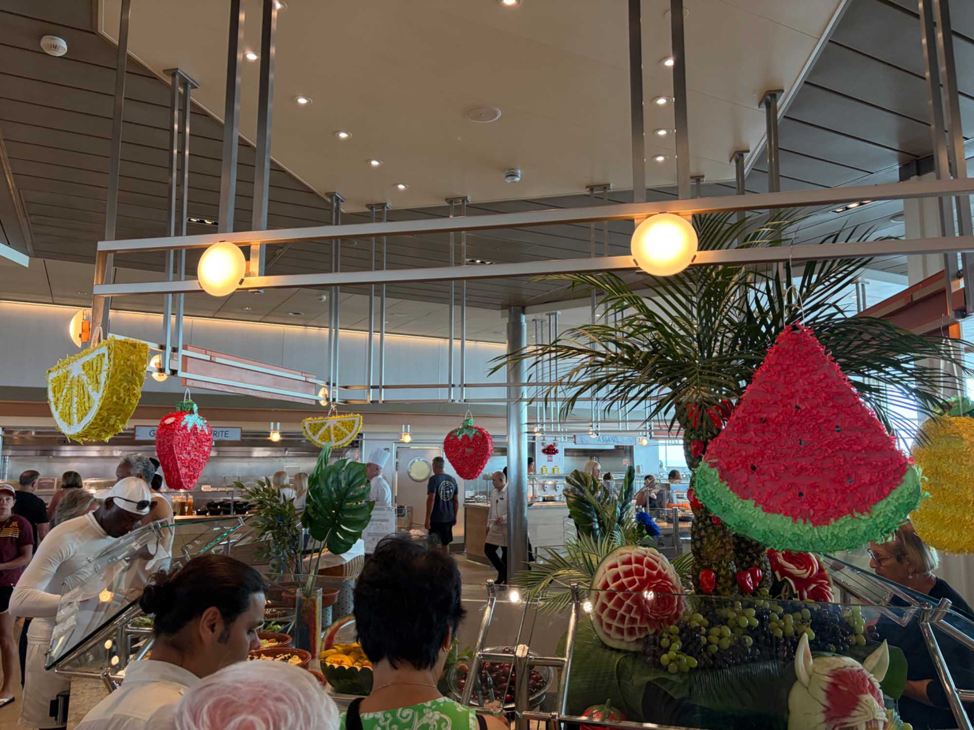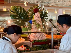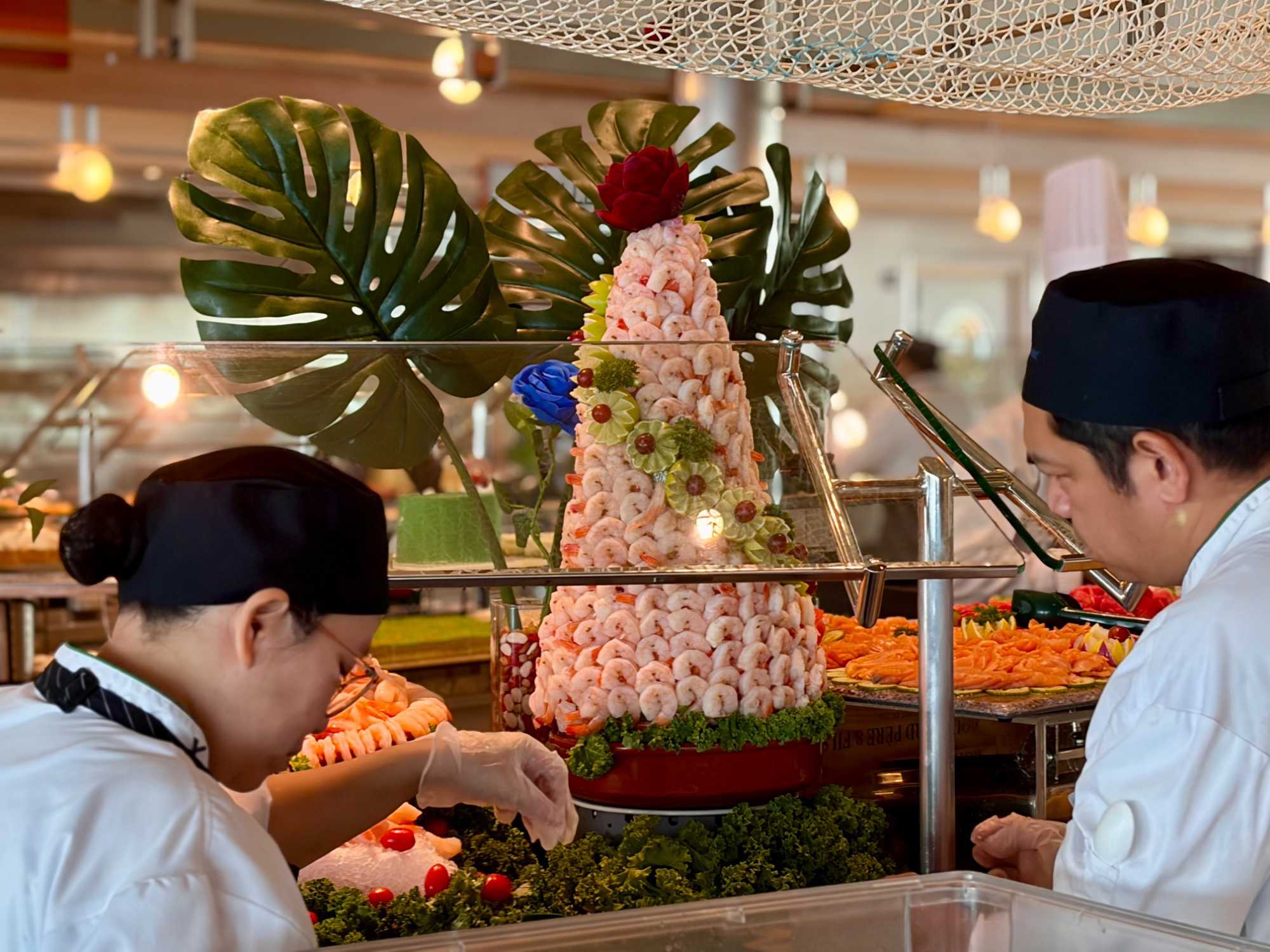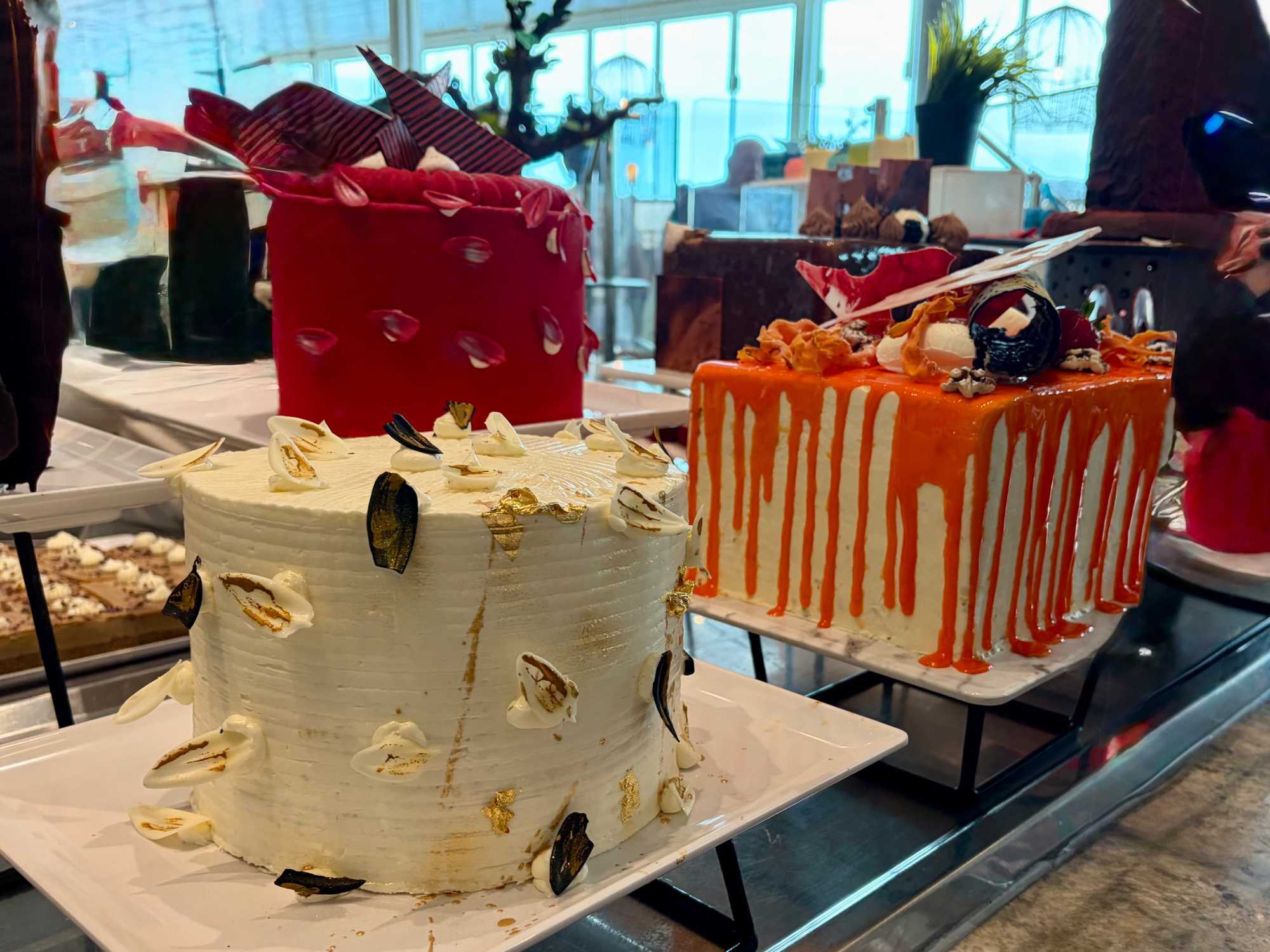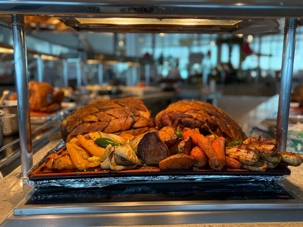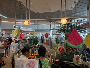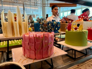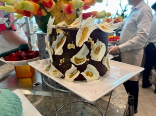 Le « petit lunch » du midi fut …grandiose. Aujourd’hui, tradition oblige au buffet. Appelé « extravagancia », le dernier dîner de chacune des croisières sur la pluplart des navires de Celebrity, sont une occasion pour les chefs de se dépasser. Ce dîner portait bien son nom. Pièces montées de fruits de mer, saumon, des œuvres d'art en dessert, voyez plutôt les photos, elles vous mettront vous aussi l'eau à la bouche. Les chefs et les sous-chefs font la fête et chacun déploie ses talents et plus particulièrement les pâtissiers. Les gâteaux sont de toutes les couleurs et de toutes les formes et…de toutes les saveurs. Ne goûtez qu’à un seul était impossible. Avouez que nos photos vous ont aussi mis l’eau à la bouche! Ils n’étaient pas que beaux mais également délicieux. Cette « extravagance » s’est fait également sentir pour les fruits de mer: crevettes, saumons de toutes sortes incluant des gravlax, poissons…On se serait cru non pas sur la mer mais dans la mer.