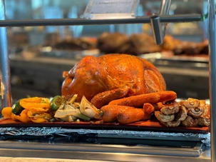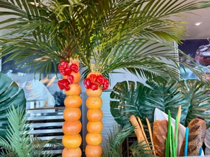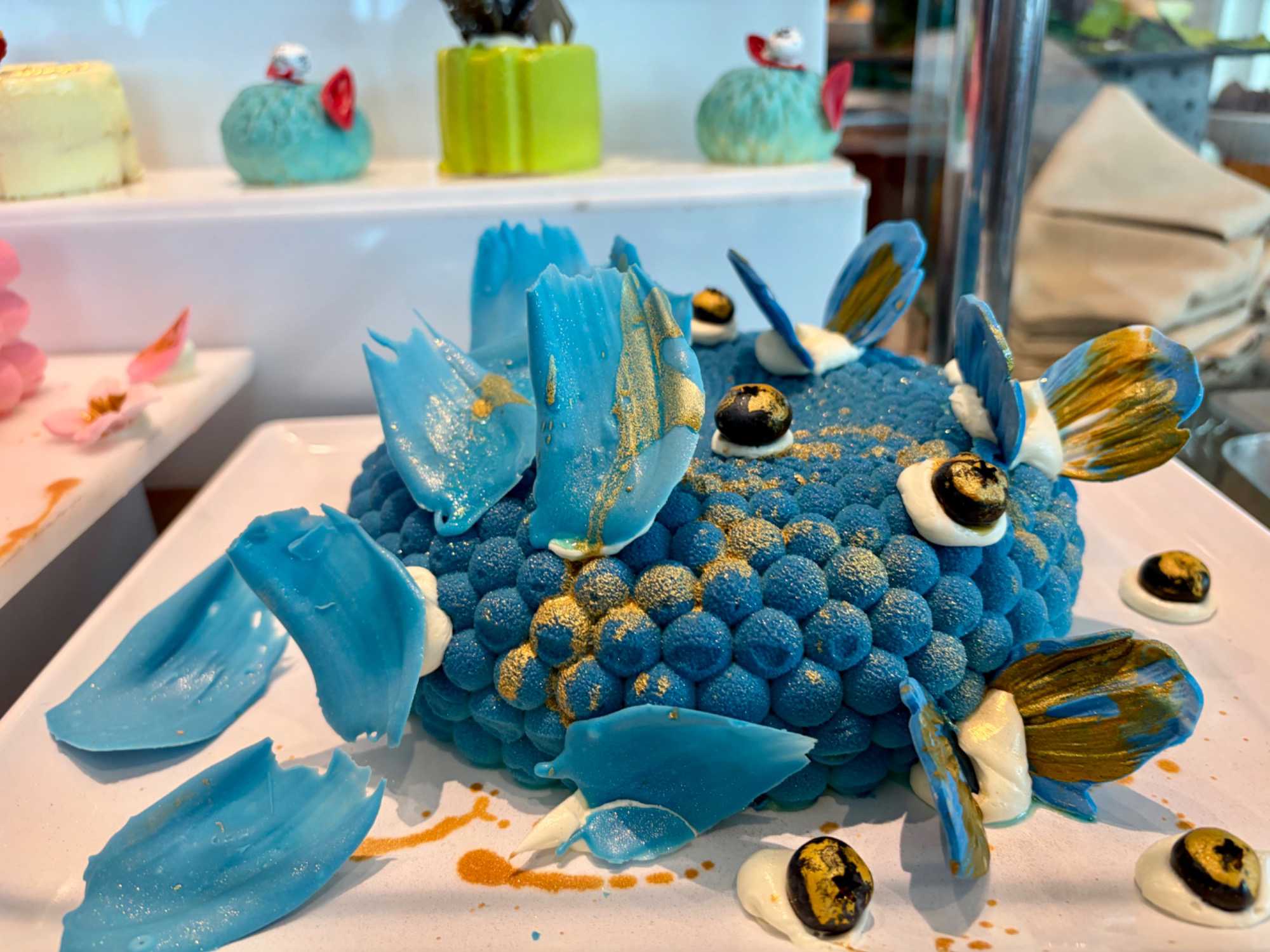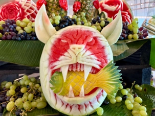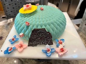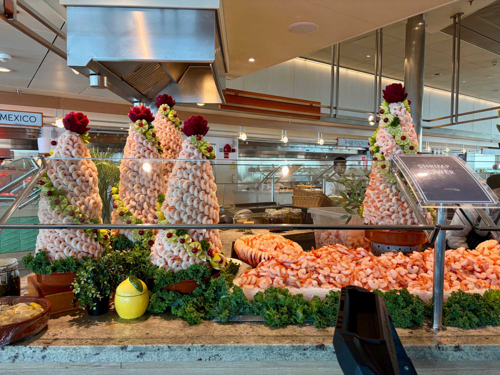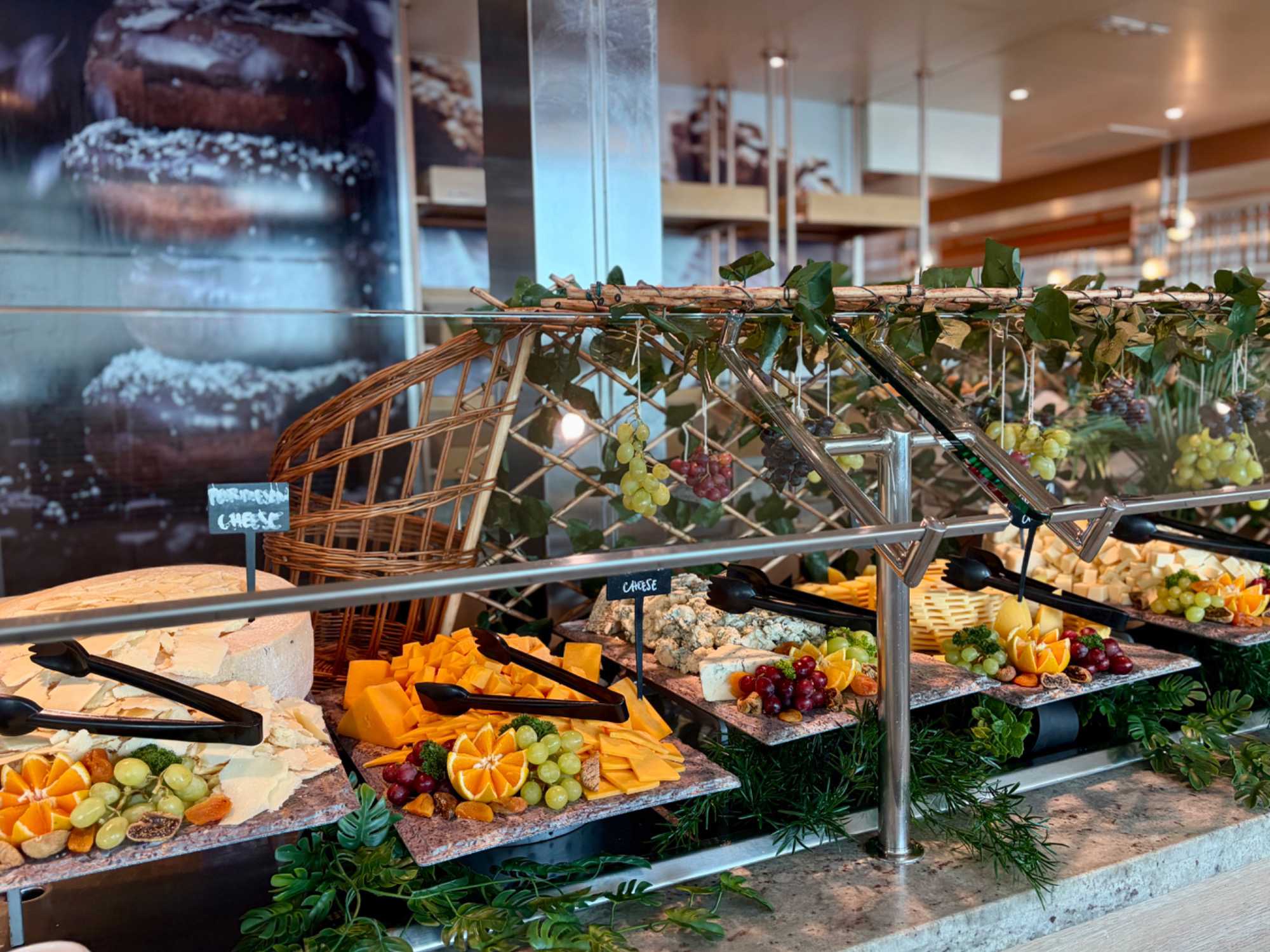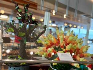 Le « petit lunch » du midi fut …grandiose. Aujourd’hui, tradition oblige au buffet. Appelé « extravagancia », le dernier dîner de chacune des croisières sur la pluplart des navires de Celebrity, sont une occasion pour les chefs de se dépasser. Ce dîner portait bien son nom. Pièces montées de fruits de mer, saumon, des œuvres d'art en dessert, voyez plutôt les photos, elles vous mettront vous aussi l'eau à la bouche. Les chefs et les sous-chefs font la fête et chacun déploie ses talents et plus particulièrement les pâtissiers. Les gâteaux sont de toutes les couleurs et de toutes les formes et…de toutes les saveurs. Ne goûtez qu’à un seul était impossible. Avouez que nos photos vous ont aussi mis l’eau à la bouche! Ils n’étaient pas que beaux mais également délicieux. Cette « extravagance » s’est fait également sentir pour les fruits de mer: crevettes, saumons de toutes sortes incluant des gravlax, poissons…On se serait cru non pas sur la mer mais dans la mer.