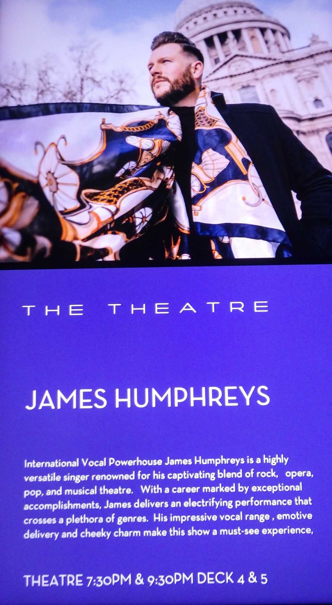 Après le souper, les gens sont allés aux différents spectacles où de talentueux artistes se produisent, danseurs, comédiens et chanteurs sont à bord afin de nous combler de plaisir et de ravissement.