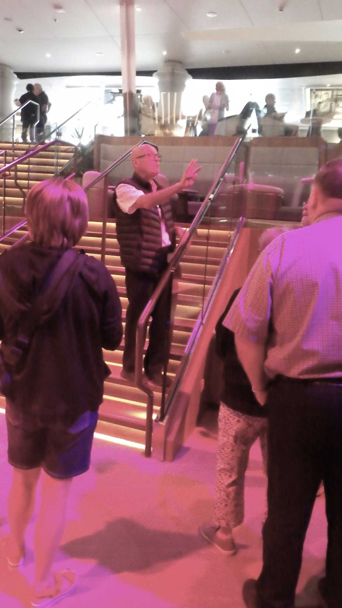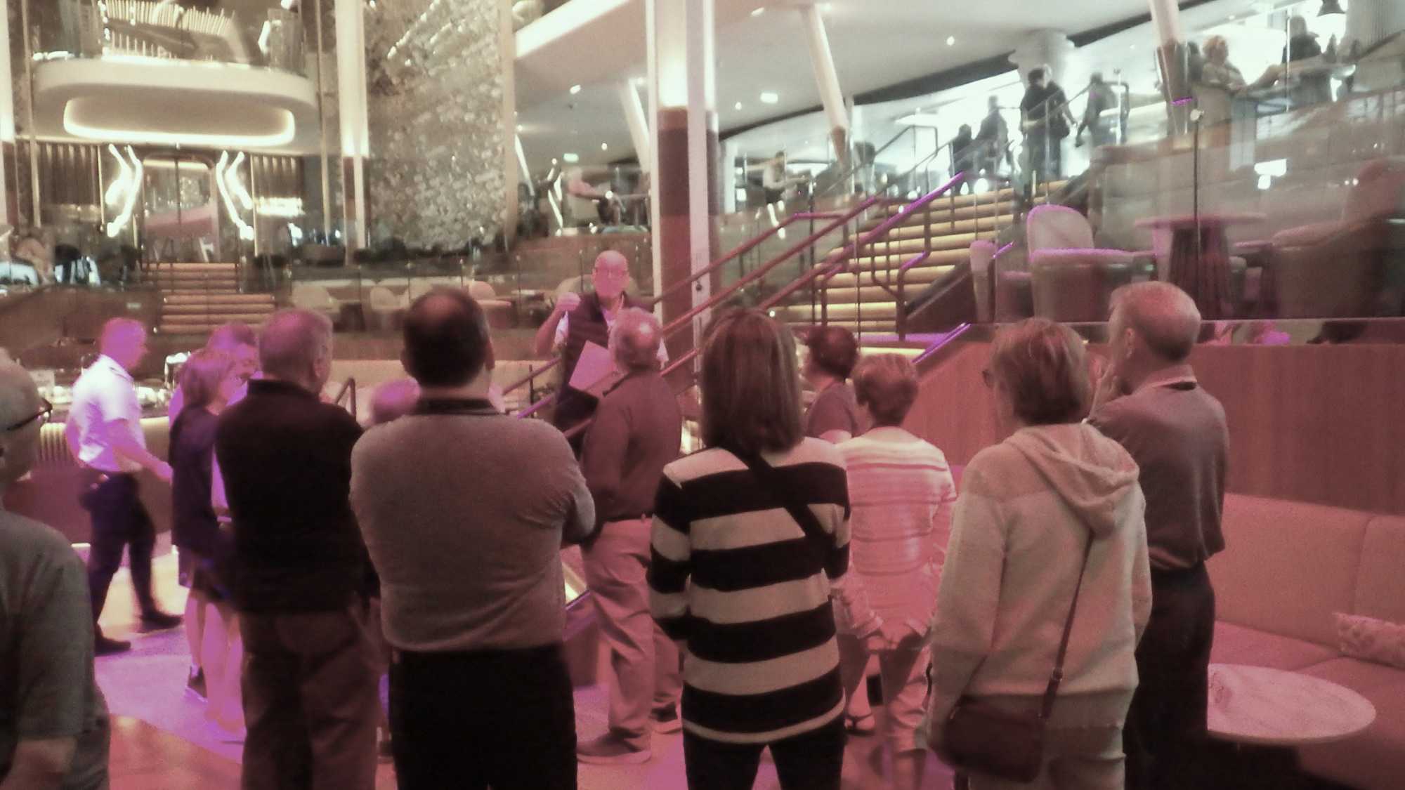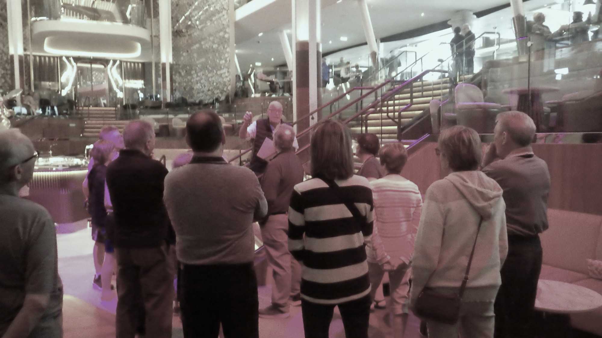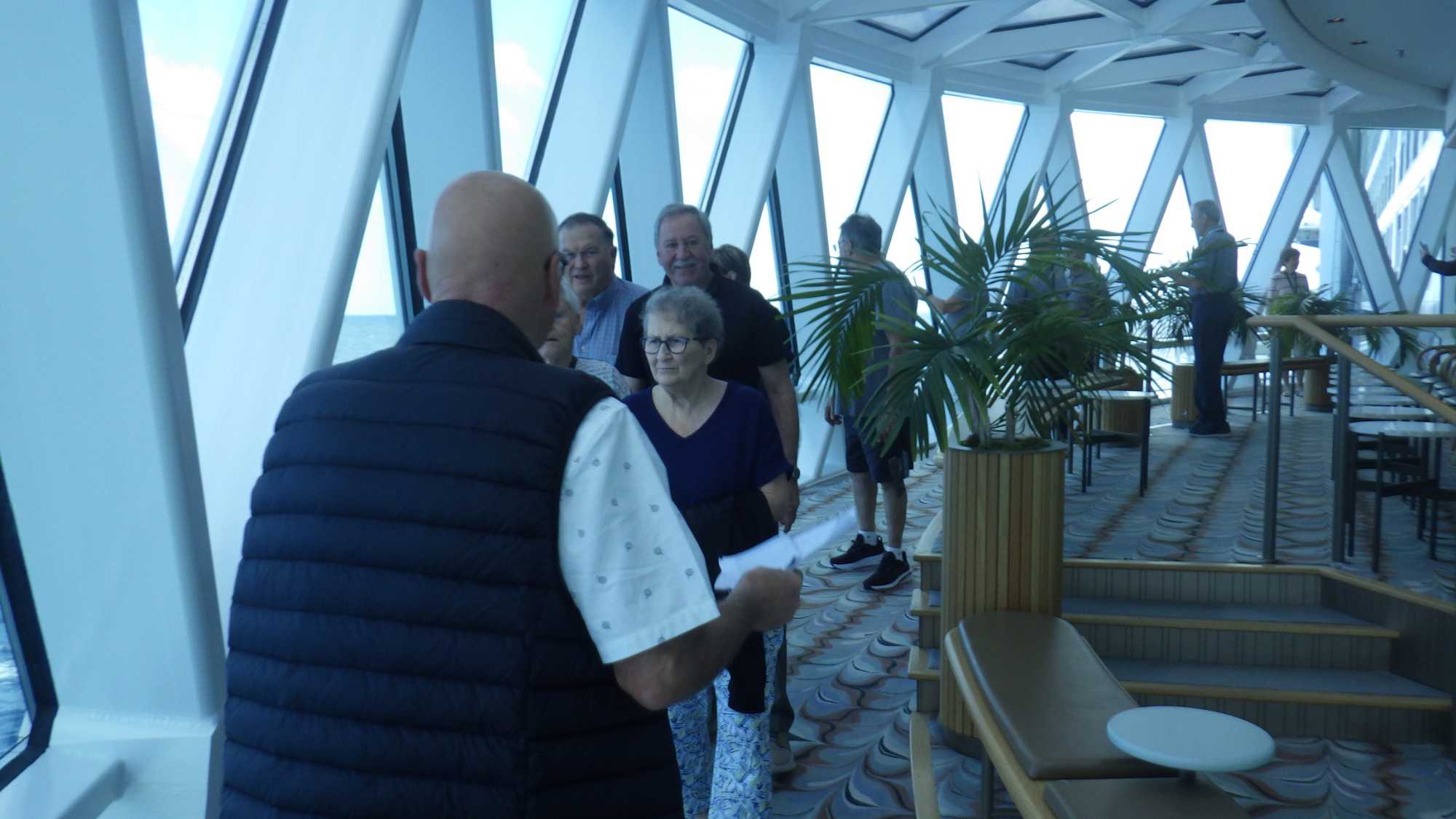 Après le petit-déjeuner que chaque croisiériste pouvait prendre à son rythme et à son heure, nous avons effectué notre visite guidée du navire à 10 h. Pour pouvoir jouir et profiter au maximum de toutes les ressources et les recoins du bateau, je vous jure que cette visite s’impose. J’adore prendre le temps d’orienter les gens dans le navire en observant leur mine réjouie et étonnée devant les enfilades de salles, de salons, de gyms, etc., d’un pont à l’autre. En prime, j’indique à toutes et à tous les nombreuses cachettes secrètes à utiliser en vacances pour s’isoler de la foule ou se jouer des tours pendables ou pas! hi hi hi! Une bonne quinzaine de personnes y ont participé tout en s’amusant franchement. C’est toujours un plaisir pour moi de faire visiter un navire, autant aux nouveaux qu’aux anciens voyageurs. Je cultive le don de toujours voir les choses avec un regard neuf.