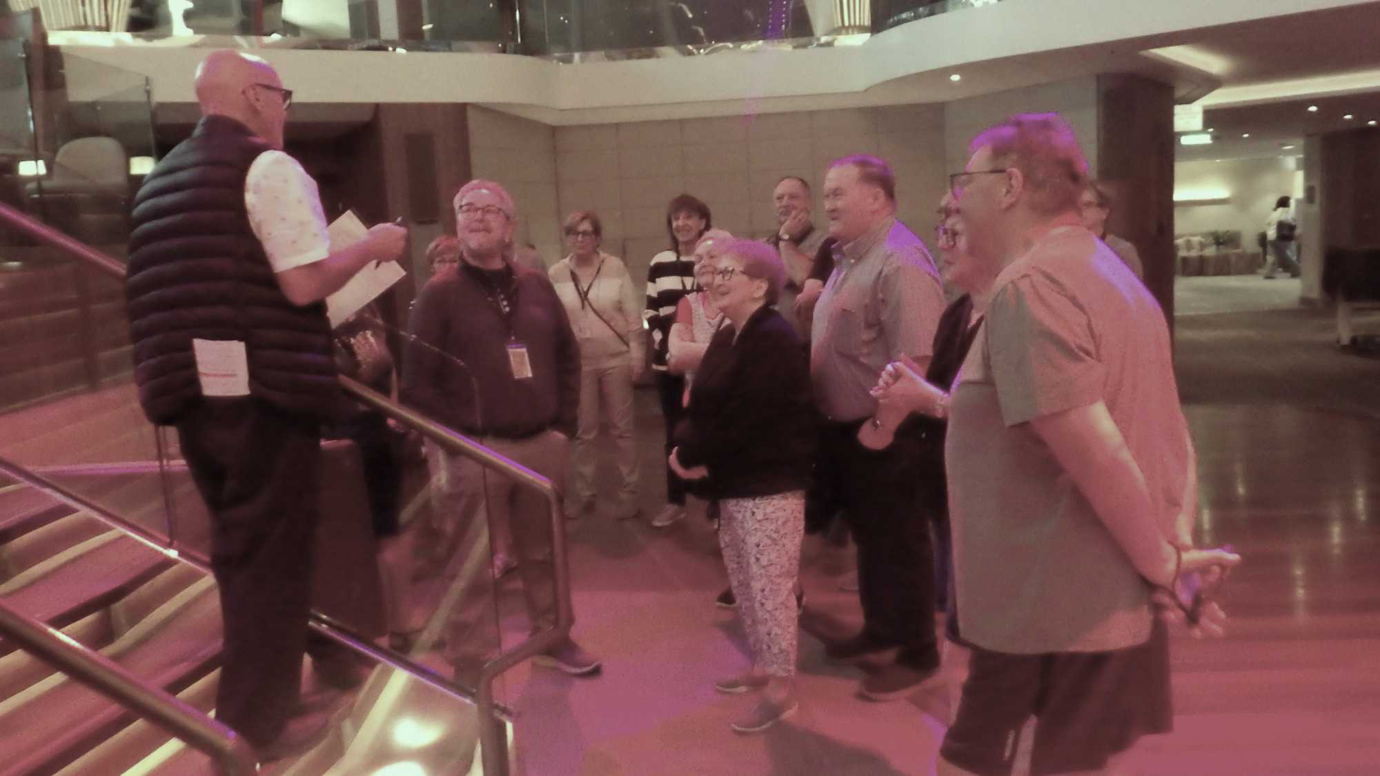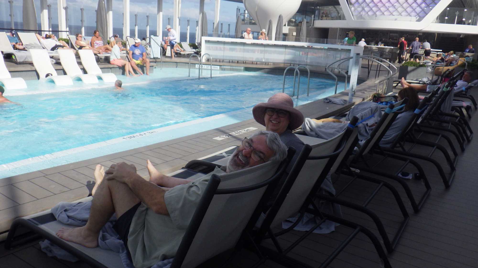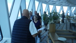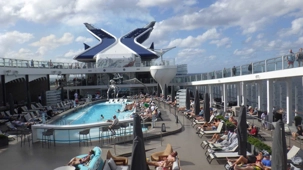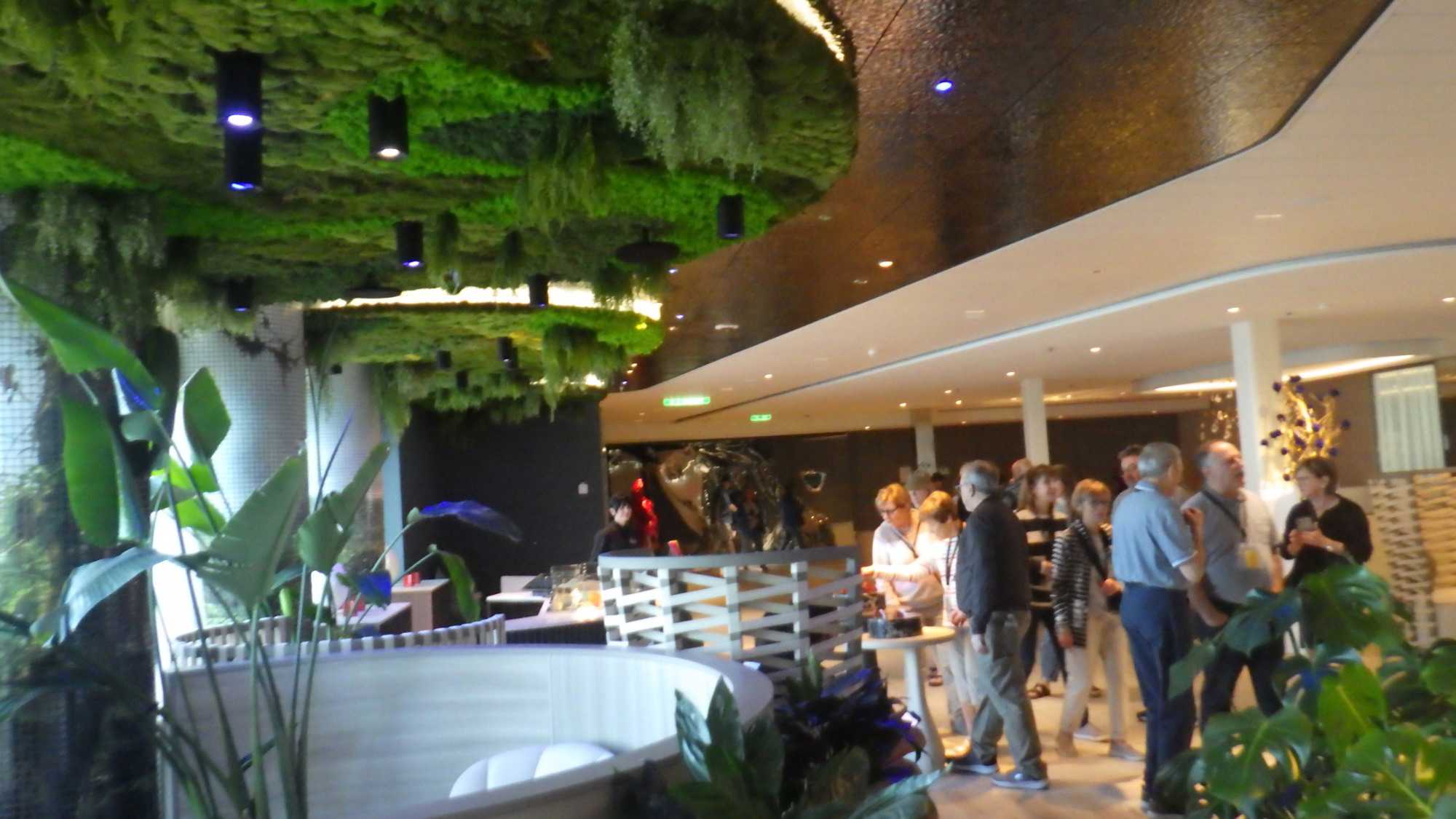 Après le petit-déjeuner que chaque croisiériste pouvait prendre à son rythme et à son heure, nous avons effectué notre visite guidée du navire à 10 h. Pour pouvoir jouir et profiter au maximum de toutes les ressources et les recoins du bateau, je vous jure que cette visite s’impose. J’adore prendre le temps d’orienter les gens dans le navire en observant leur mine réjouie et étonnée devant les enfilades de salles, de salons, de gyms, etc., d’un pont à l’autre. En prime, j’indique à toutes et à tous les nombreuses cachettes secrètes à utiliser en vacances pour s’isoler de la foule ou se jouer des tours pendables ou pas! hi hi hi! Une bonne quinzaine de personnes y ont participé tout en s’amusant franchement. C’est toujours un plaisir pour moi de faire visiter un navire, autant aux nouveaux qu’aux anciens voyageurs. Je cultive le don de toujours voir les choses avec un regard neuf.