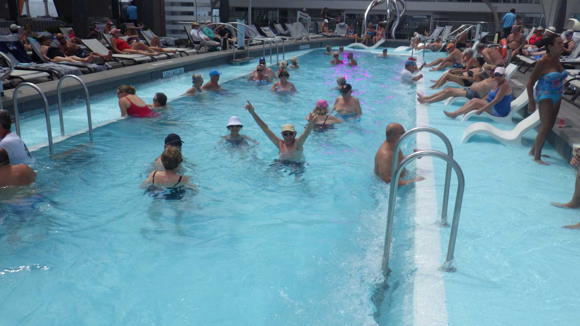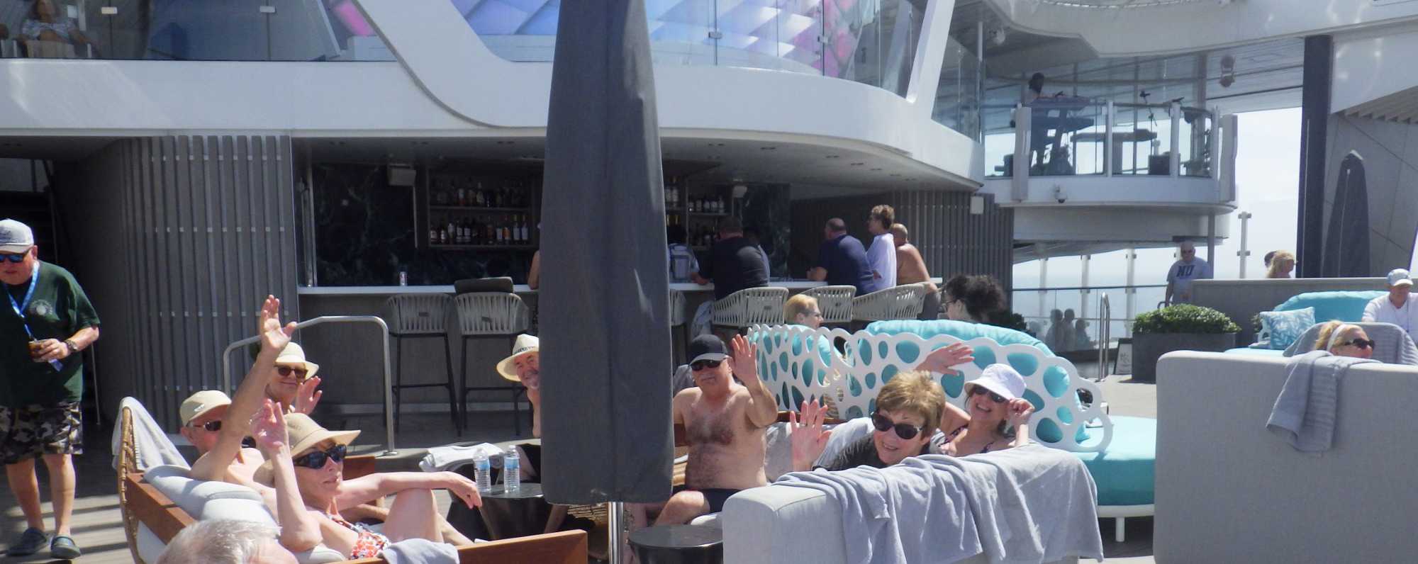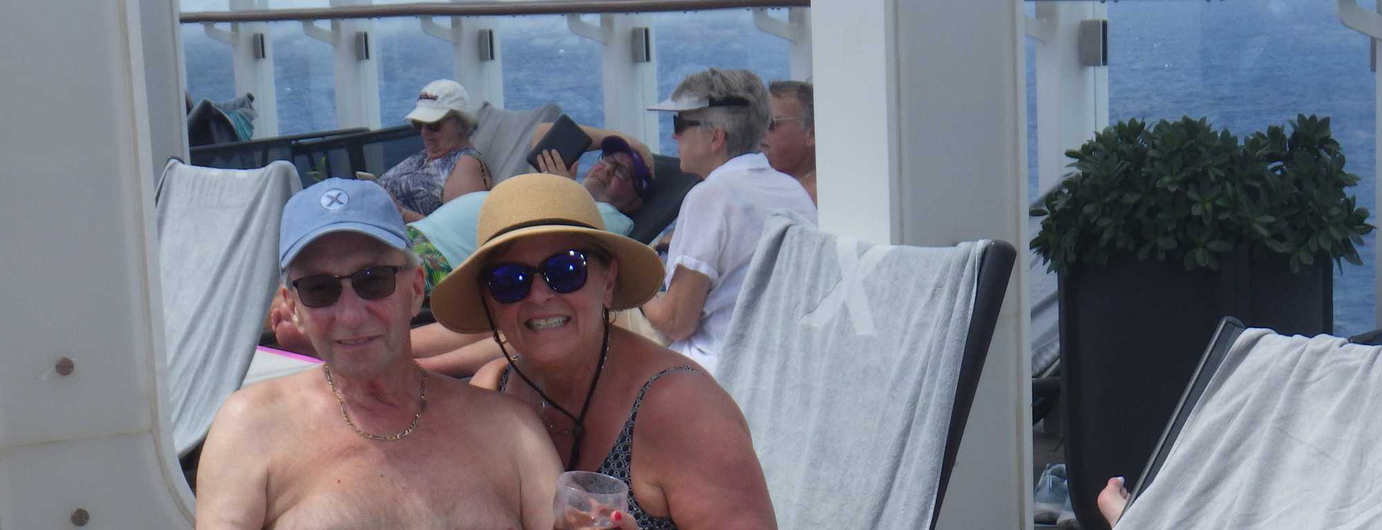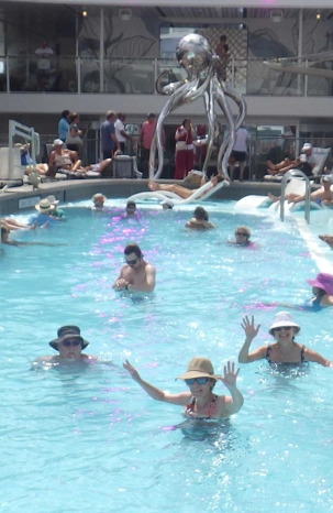 Nous profitons de cette journée cadeau en mer où chacun choisit son rythme… de croisière! Lecture, gym, danse, casino, jeux de dés, tournée des boutiques, conférences, massages, spas, dégustations de vins, cocktails ou mocktails, il y a vraiment de tout pour tous. Parmi les passe-temps populaires, les bains de soleil à l’extérieur sur le pont 14 ont remporté la palme. Bien des voyageurs adorent ça; ça change des manteaux, tuques et mitaines. Tant qu’à y être, pourquoi pas un petit drink, il est sûrement 17 heures quelque part dans le monde. Comme le disait la mère universelle de plusieurs de mes voyageurs lorsqu’ils allaient à la mer : Tiens-toi au bord! Mais plusieurs fins finauds pensent encore avoir entendu au bar! Jetez un coup d’œil aux photos ou demandez à un certain Yves et à sa famille si le temps est long à bord, vous verrez qu’ils vous diront qu’on ne s’ennuie jamais sur un navire en mer.