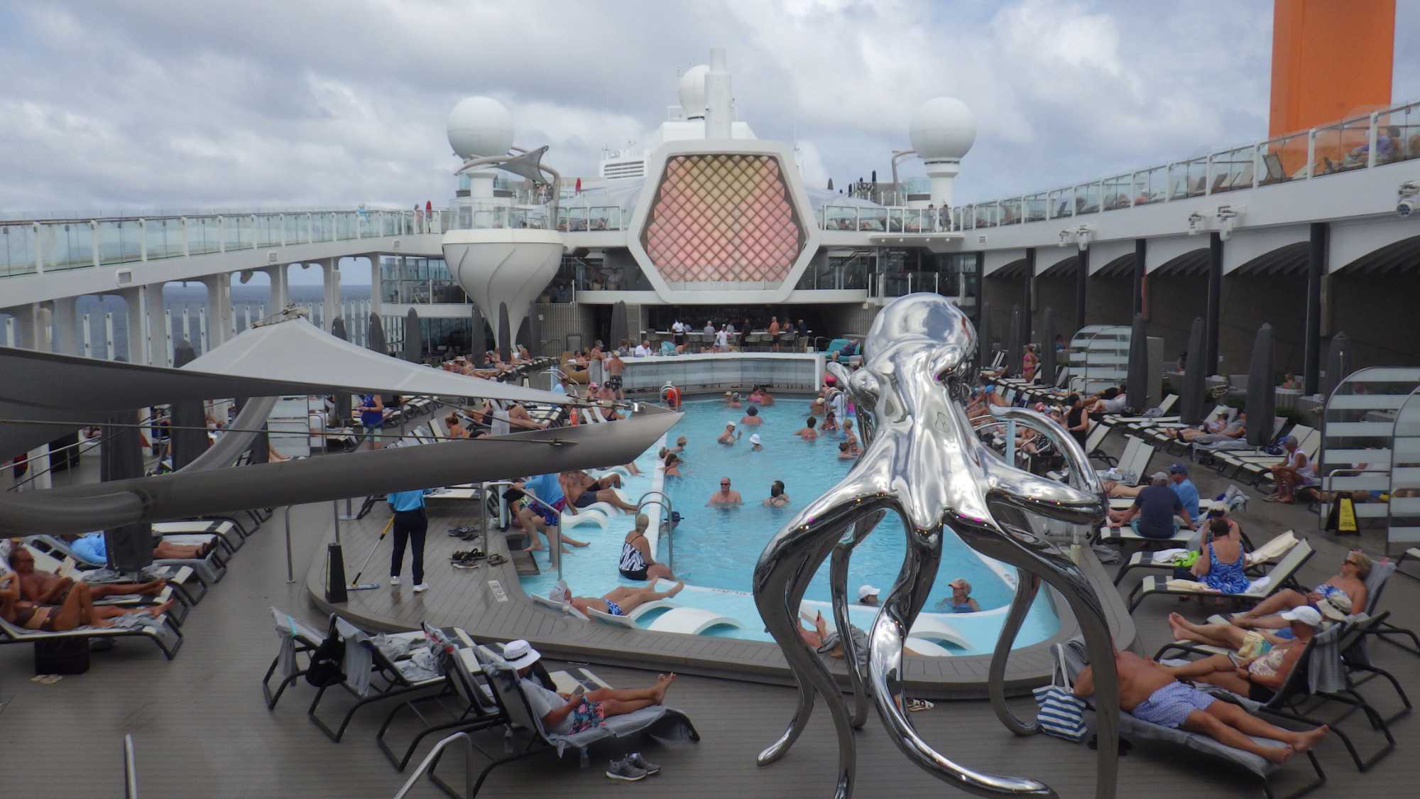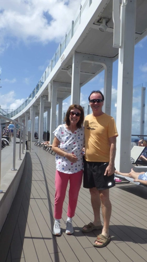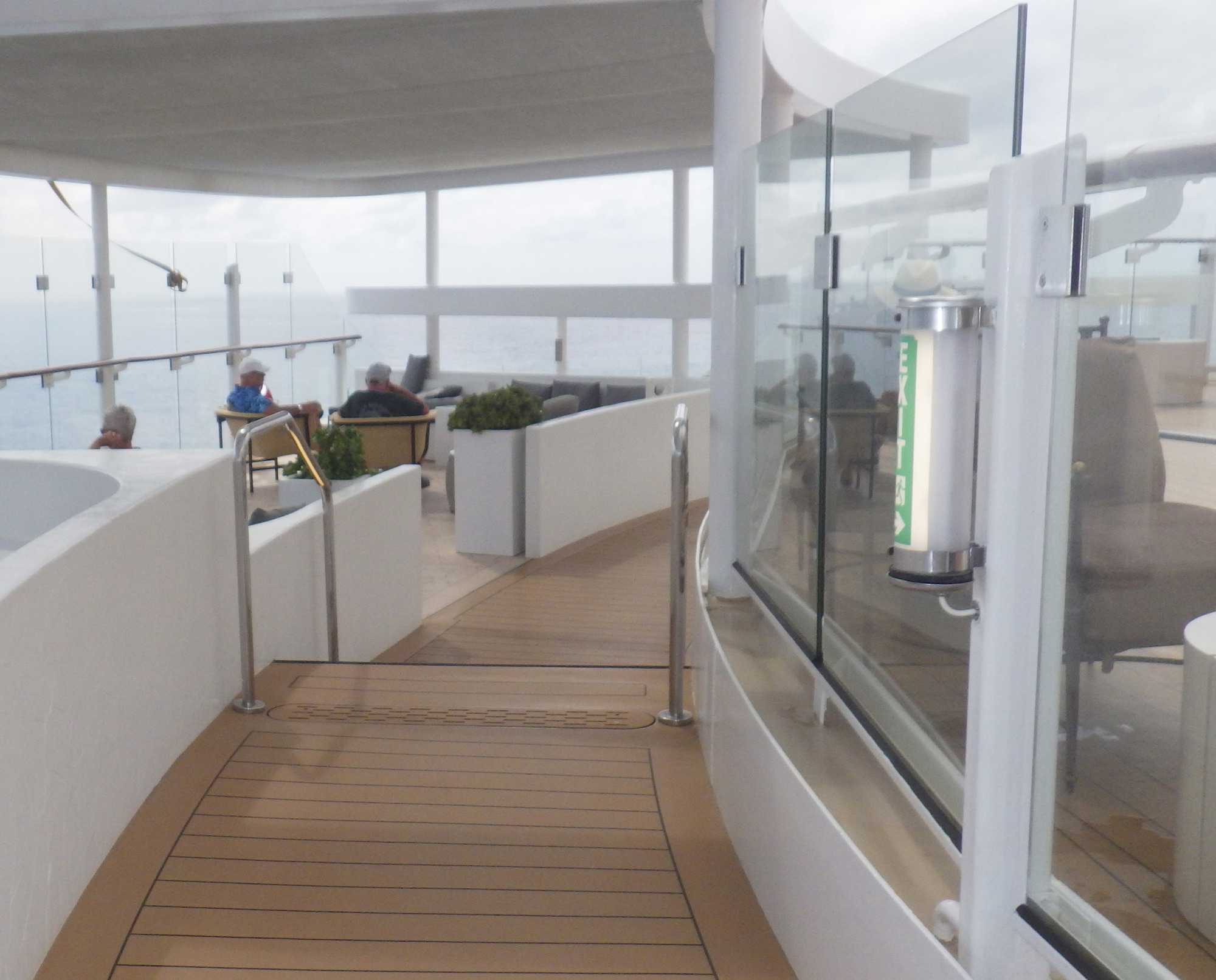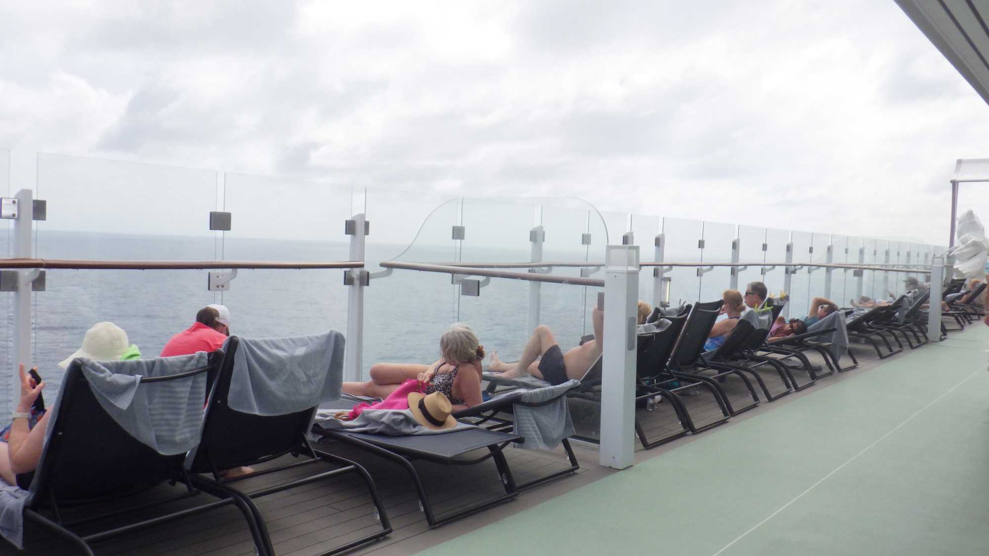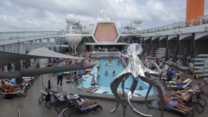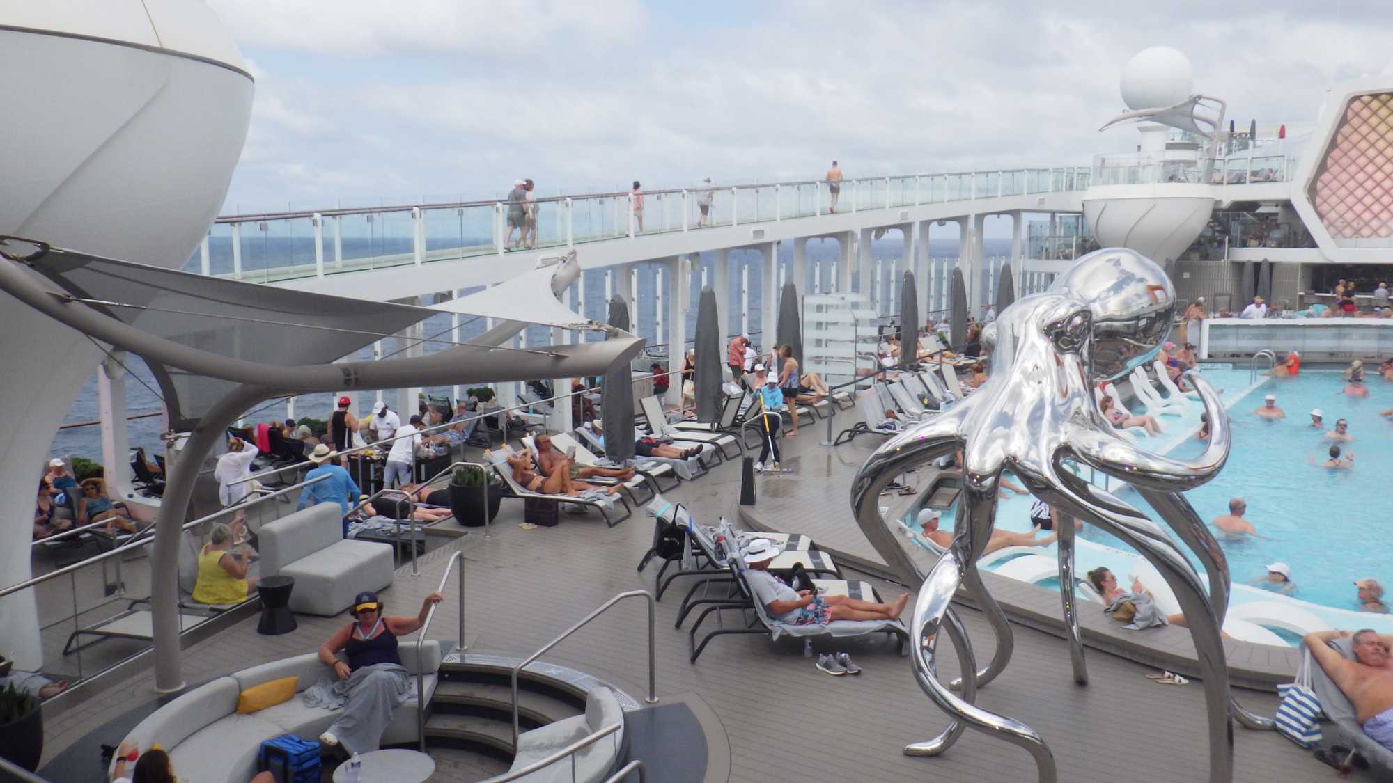 Je peux vous dire que ça fait un bien immense de pouvoir sortir dehors le matin pour respirer l’air du large à pleins poumons, devant un horizon qui s’étire à perte de vue et qui invite à l’introspection ou à la méditation sur notre pur bonheur d’être! Comme sur les navires de Celebrity, il y a du vrai gazon, je peux déambuler pieds nus et presque sentir la rosée du matin, un bonheur dont je ne me prive pas et qui fait du bien à l’âme. Oui, oui, je suis poète à mes heures!