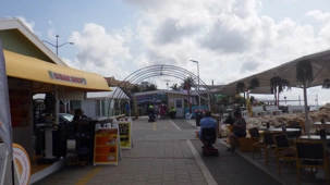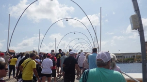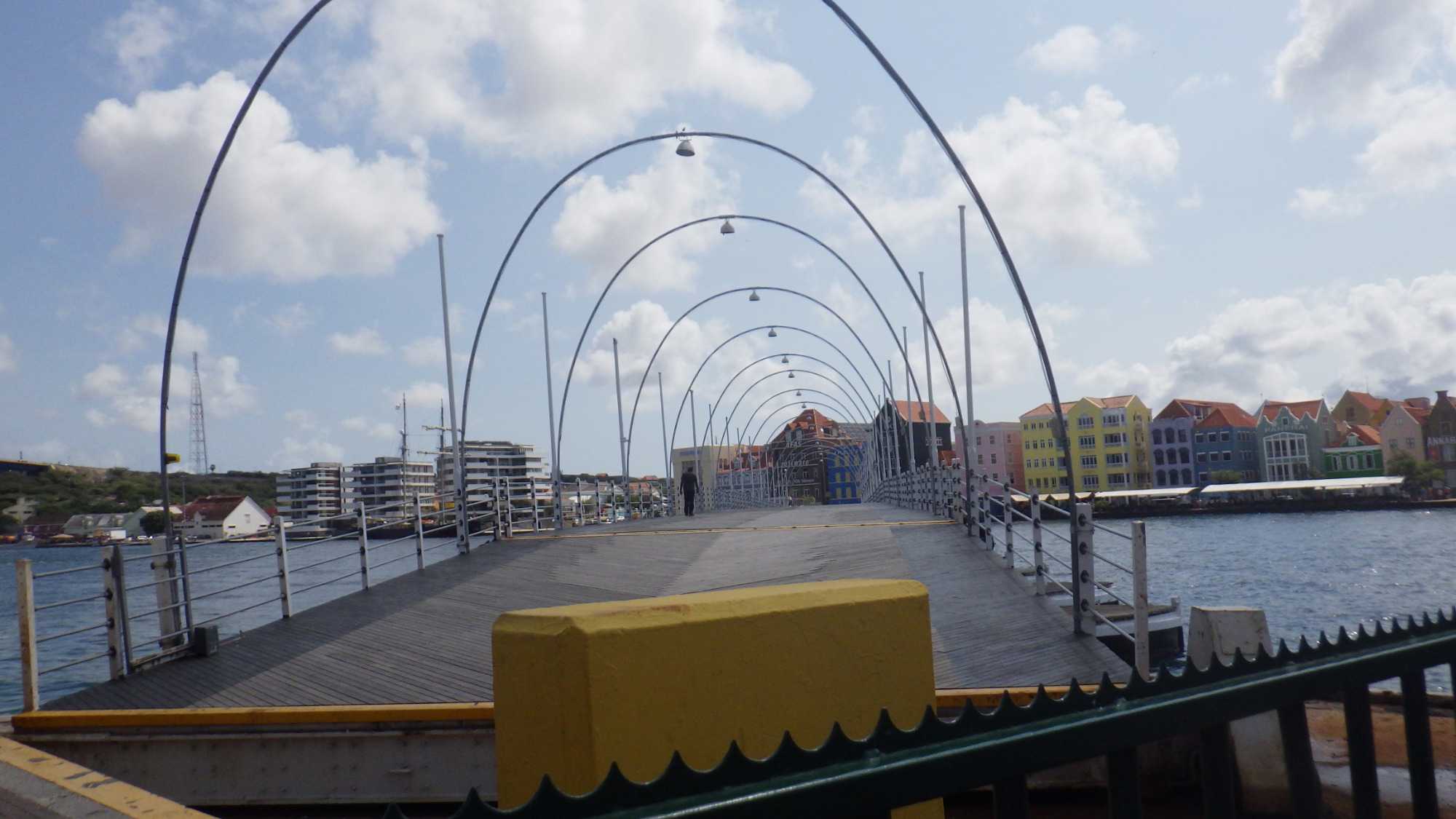 Willemstad est une ville fascinante, partagée par la baie Sainte-Anne en deux quartiers distincts : Punda, d’origine néerlandaise, et Otrabanda, d’origine espagnole. Les deux rives sont reliées par le fameux pont flottant Reine Emma, qui se déplace sur le côté pour laisser passer les navires. Juste ça en soi, ça vaut le déplacement. Quand le pont s’ouvre, un bateau gratuit prend le relais, une solution aussi ingénieuse qu’unique, wow! Ce matin, c’était le cas (deux navires entrants et un sortant) et nous avons attendu qu’il se replace pour traverser.