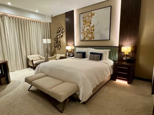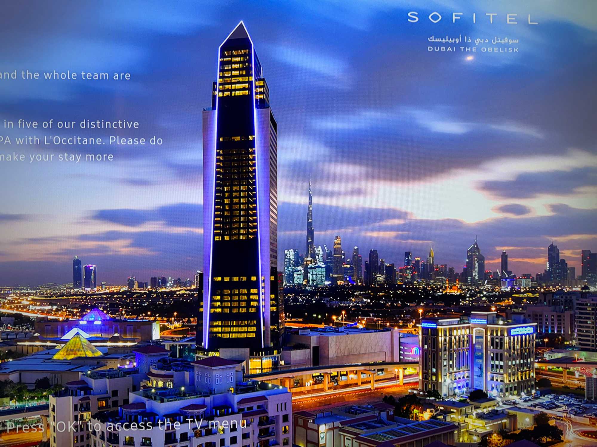 Nous prenons ensuite la route vers notre hôtel, le Sofitel Dubaï The Obelisk, qui sera notre pied-à-terre pour les quatre prochaines nuits. Le trajet nous offre un premier aperçu de Dubaï illuminée. Les gratte-ciel scintillent dans la nuit, les autoroutes sont bordées de lumières et les bâtiments futuristes se dessinent à l’horizon. Même fatigués, les regards sont captivés par cette ville impressionnante qui semble ne jamais dormir.