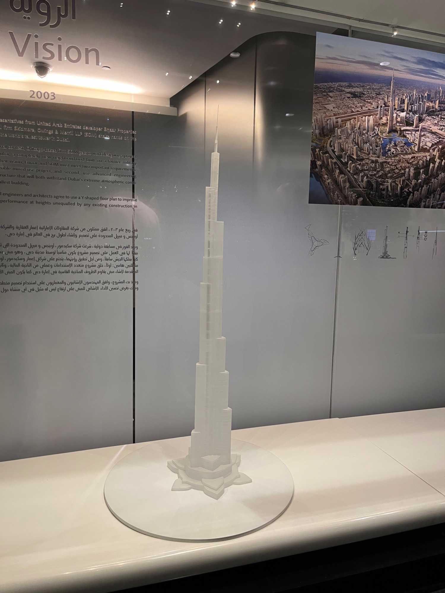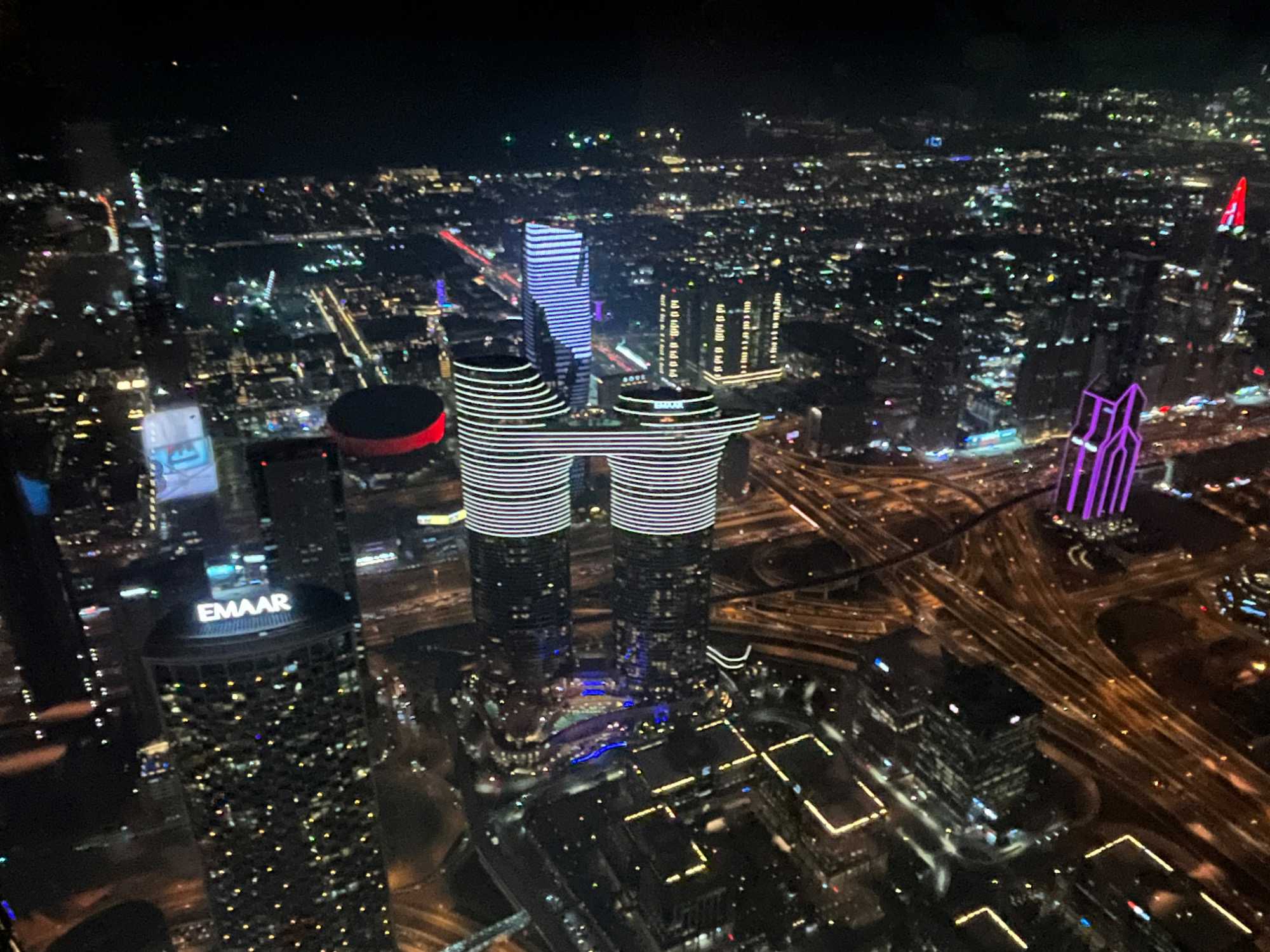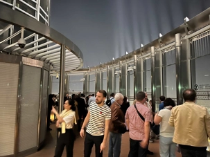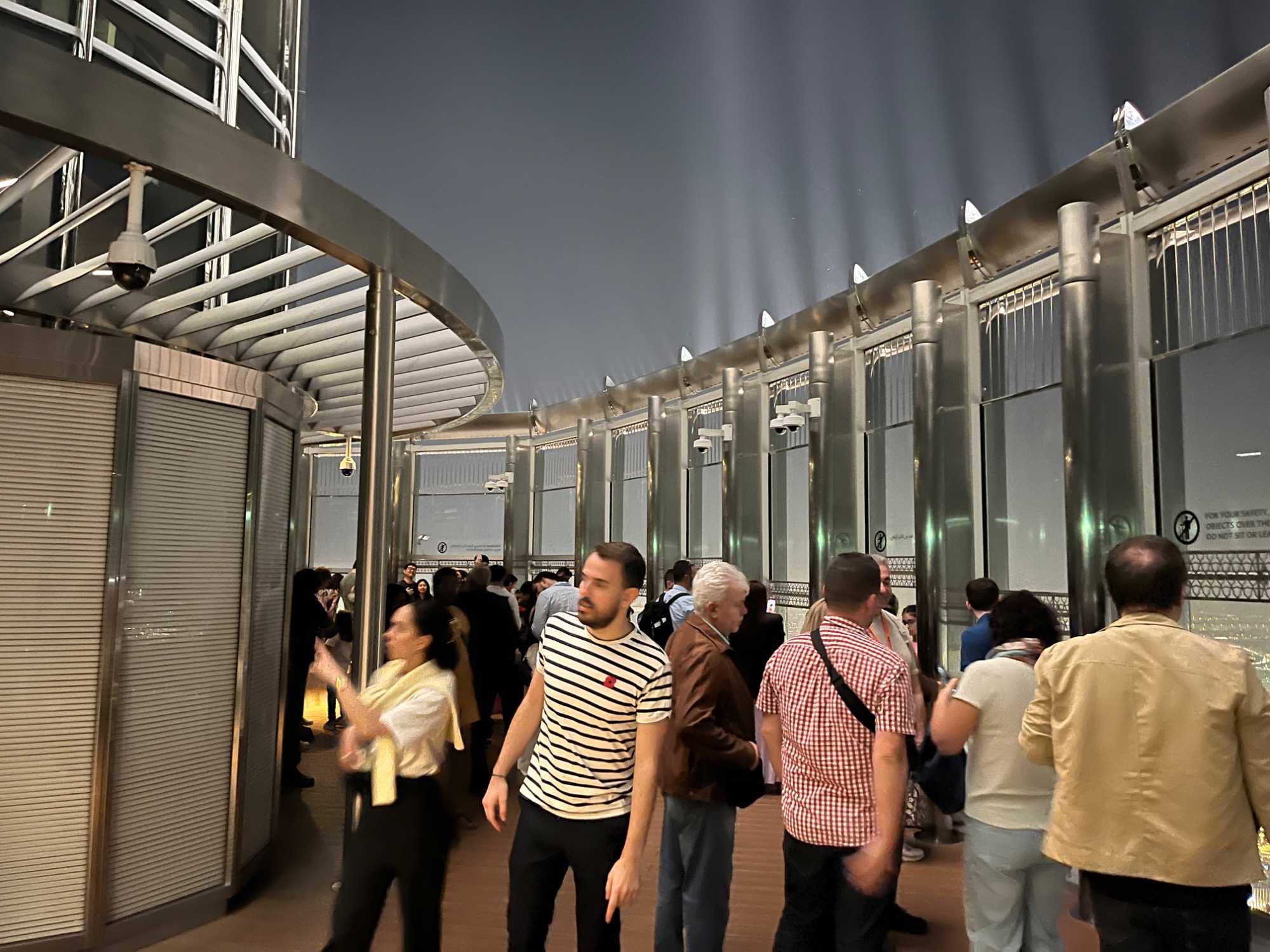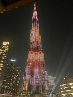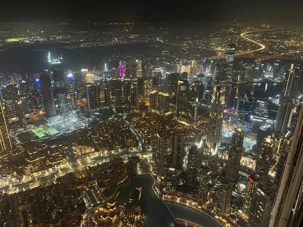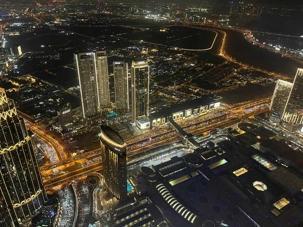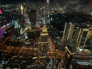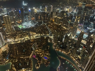 Nous poursuivons vers la célèbre tour Burj Khalifa. Les ascenseurs à double étage, parmi les plus rapides au monde, nous conduisent jusqu’au niveau 125, à 456 mètres d’altitude en une minute seulement. La terrasse panoramique offre une vue imprenable à 360 degrés sur la ville, le désert et le golfe Persique, particulièrement spectaculaire à la tombée du jour.