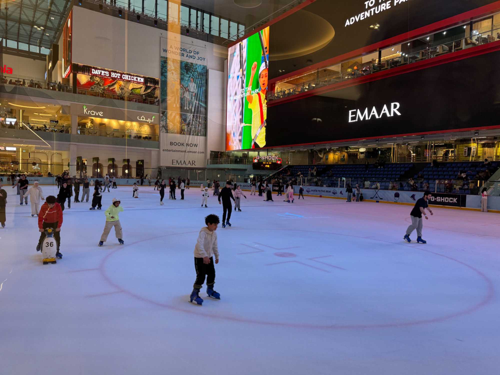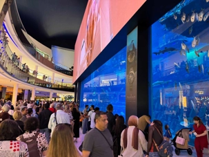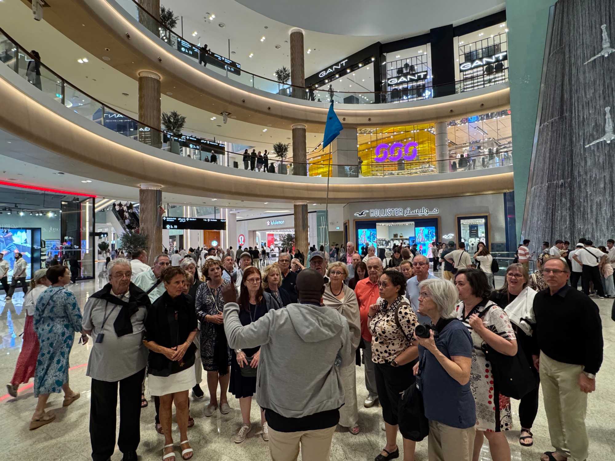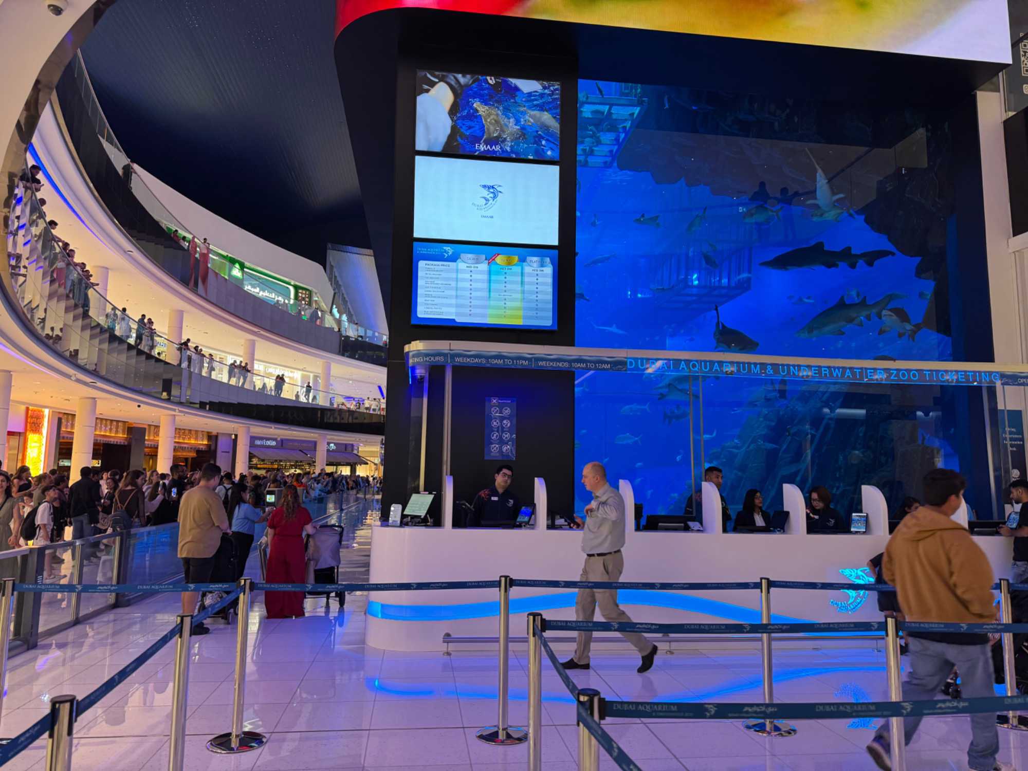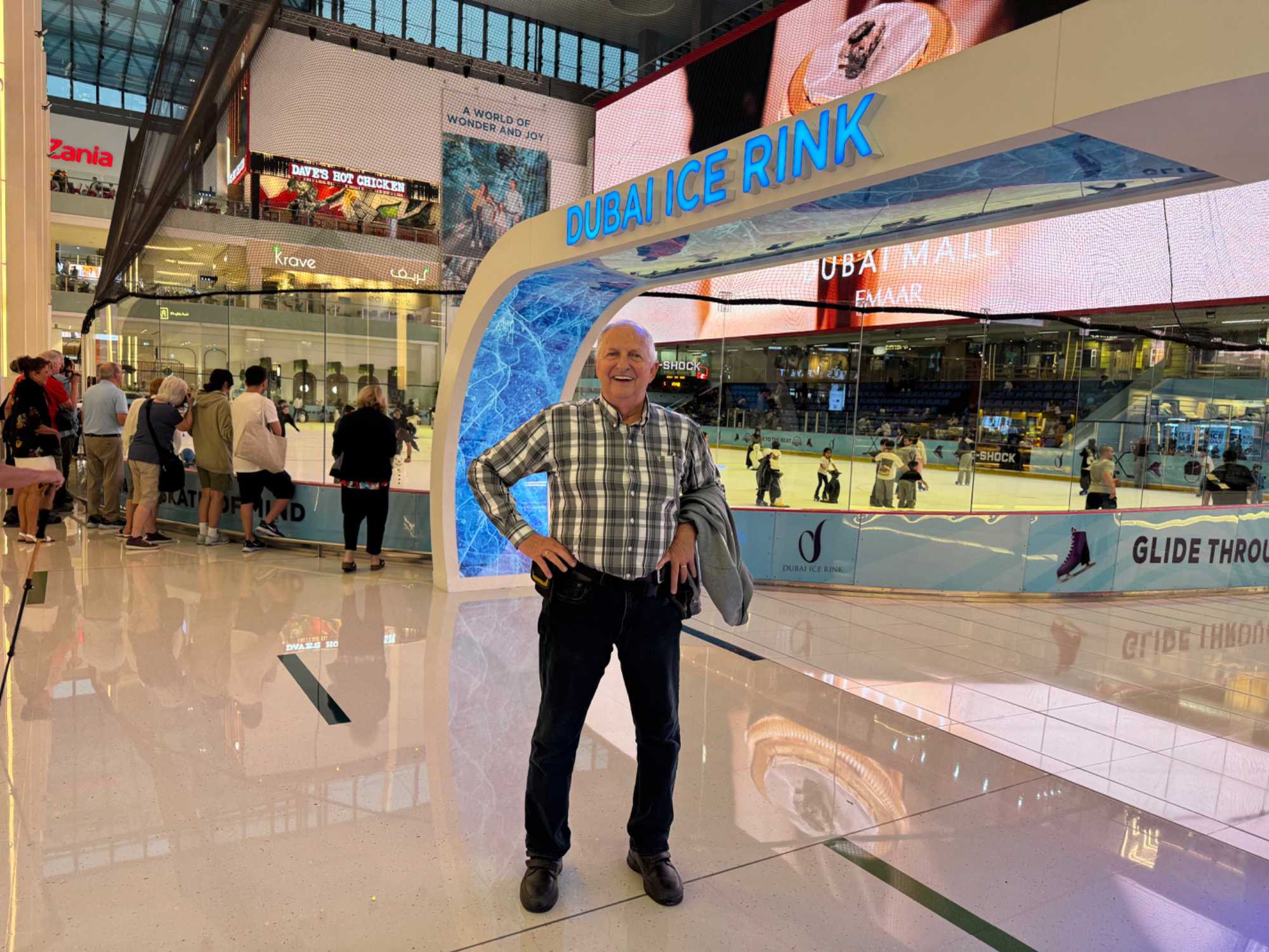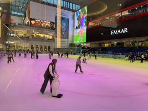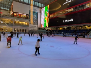 En fin d’après-midi, nous repartons vers le Dubaï Mall, souvent cité comme le plus grand centre commercial au monde par sa superficie d’environ 1,1 million de mètres carrés ! Achille nous mentionne que c’est la destination de shopping et de loisirs la plus visitée au monde accueillant plus de 100 millions de visiteurs par an. On s’arrête quelques minutes pour y voir l’aquarium et la patinoire intérieure.