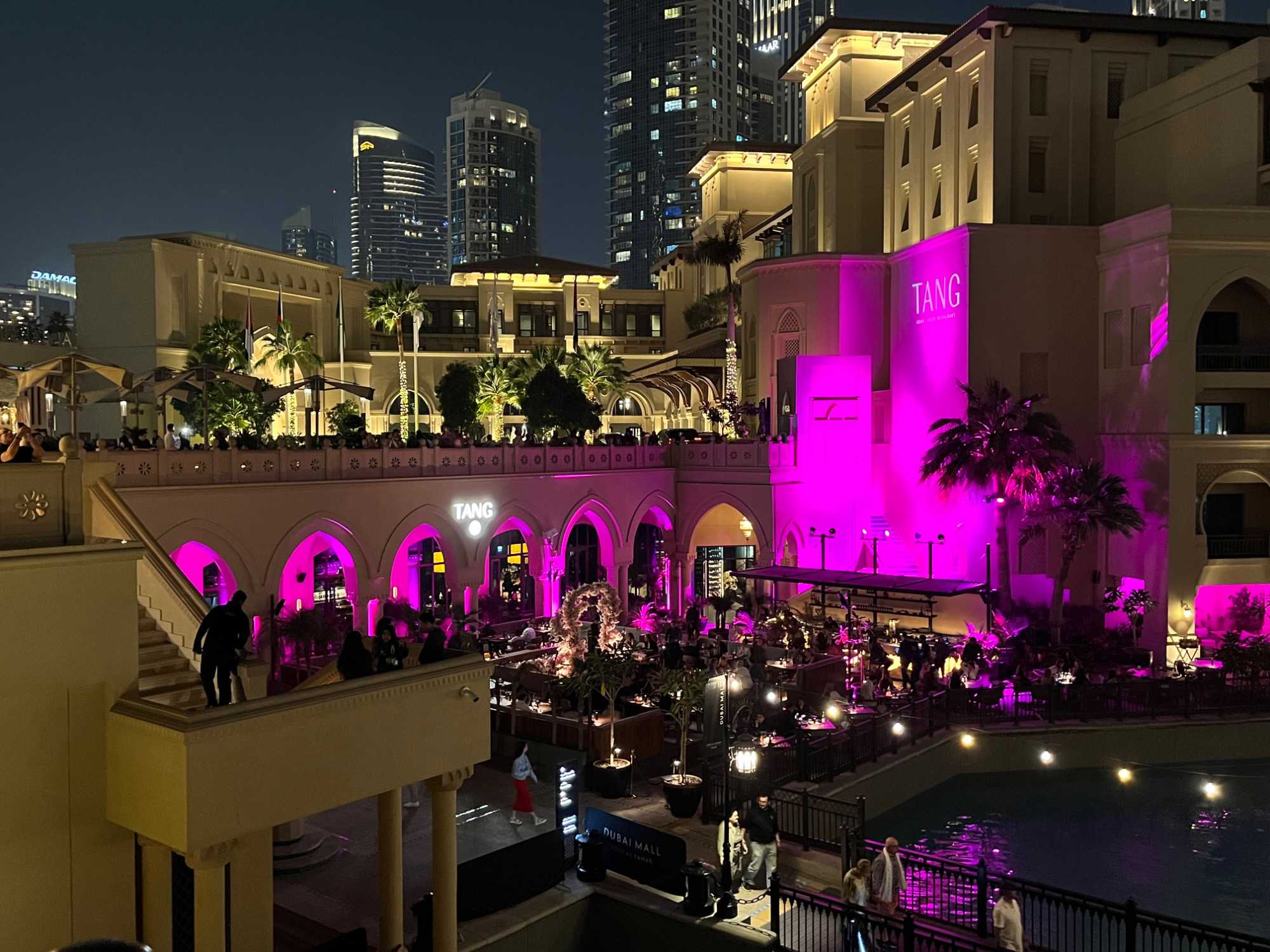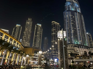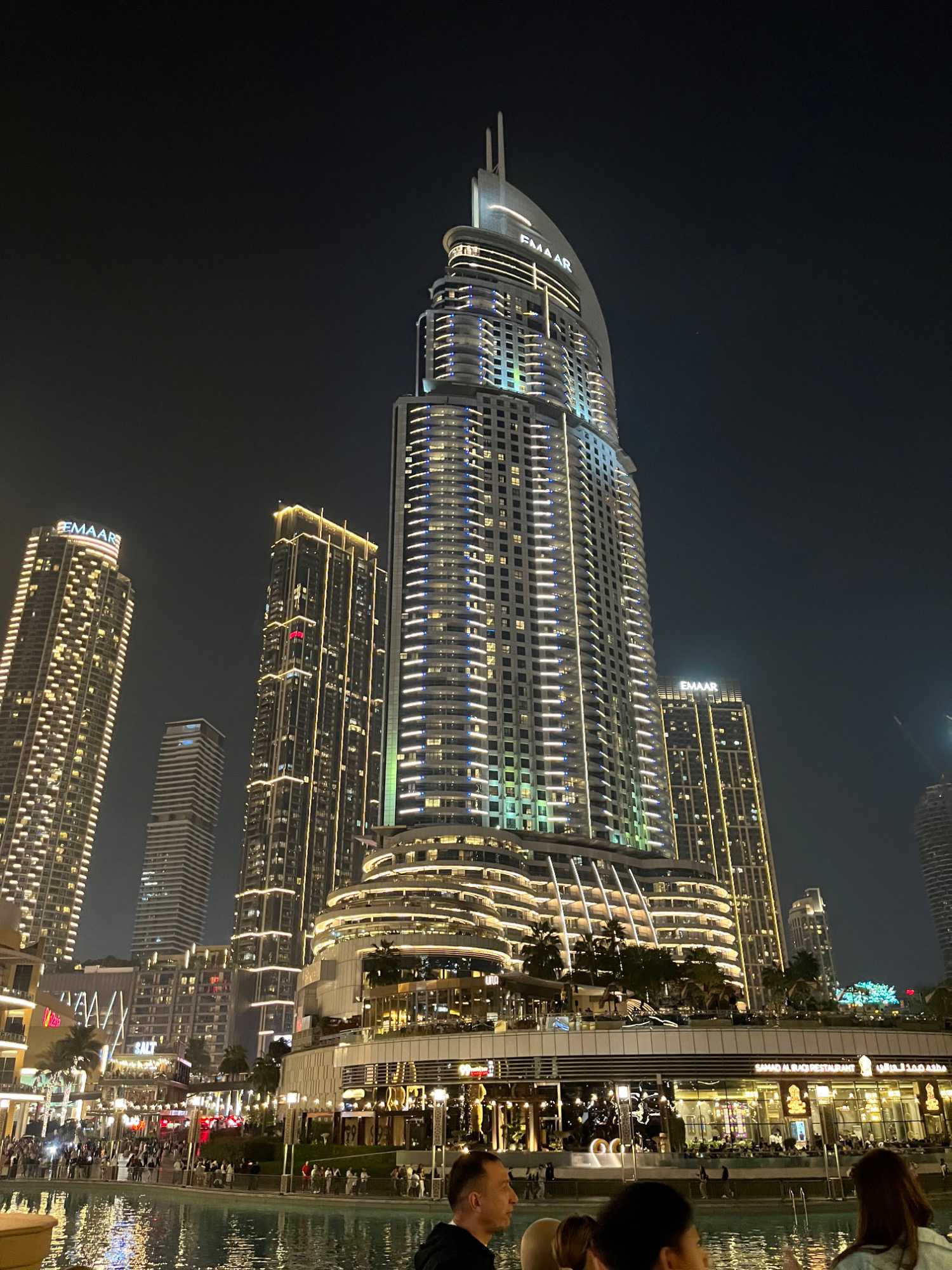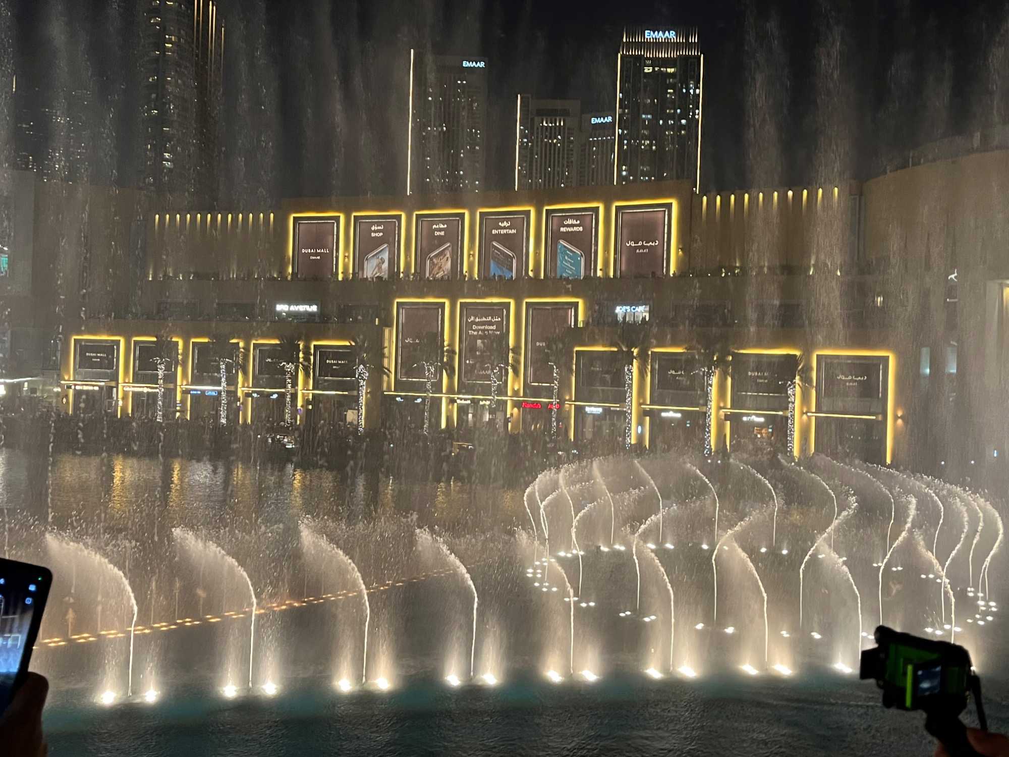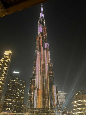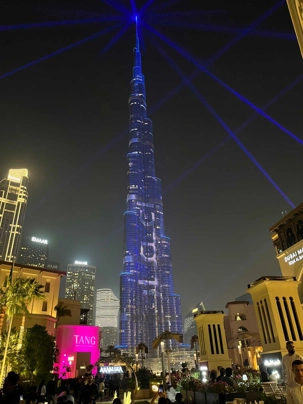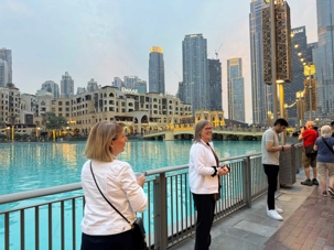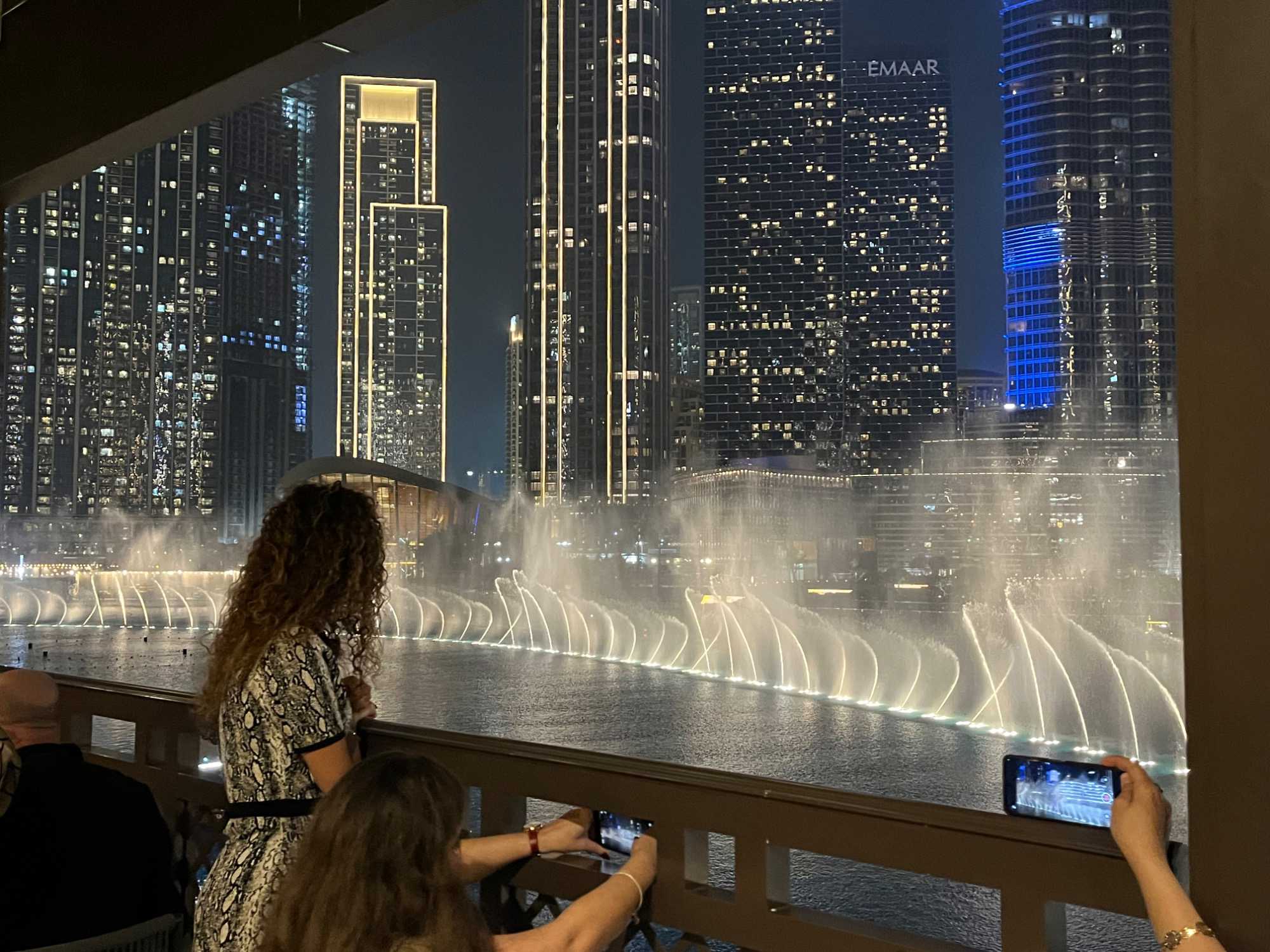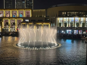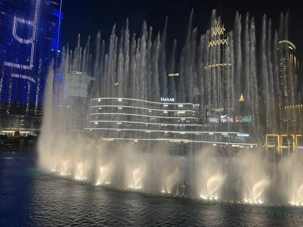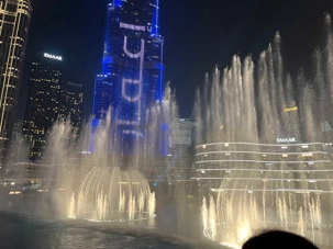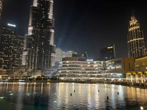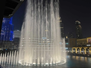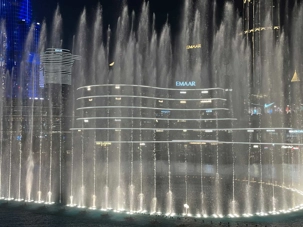 Pour clore cette journée, nous soupons au restaurant Abd El Wahab, situé dans le Souk Al Bahar, face au lac de la Burj Khalifa. Installés aux premières loges, face au lac Burj Khalifa, nous profitons d’un repas dans une ambiance raffinée et nous assistons au célèbre spectacle des fontaines de Dubaï, où jets d’eau, lumières et musique se synchronisent dans un ballet élégant, avec son gratte-ciel illuminée en toile de fond.