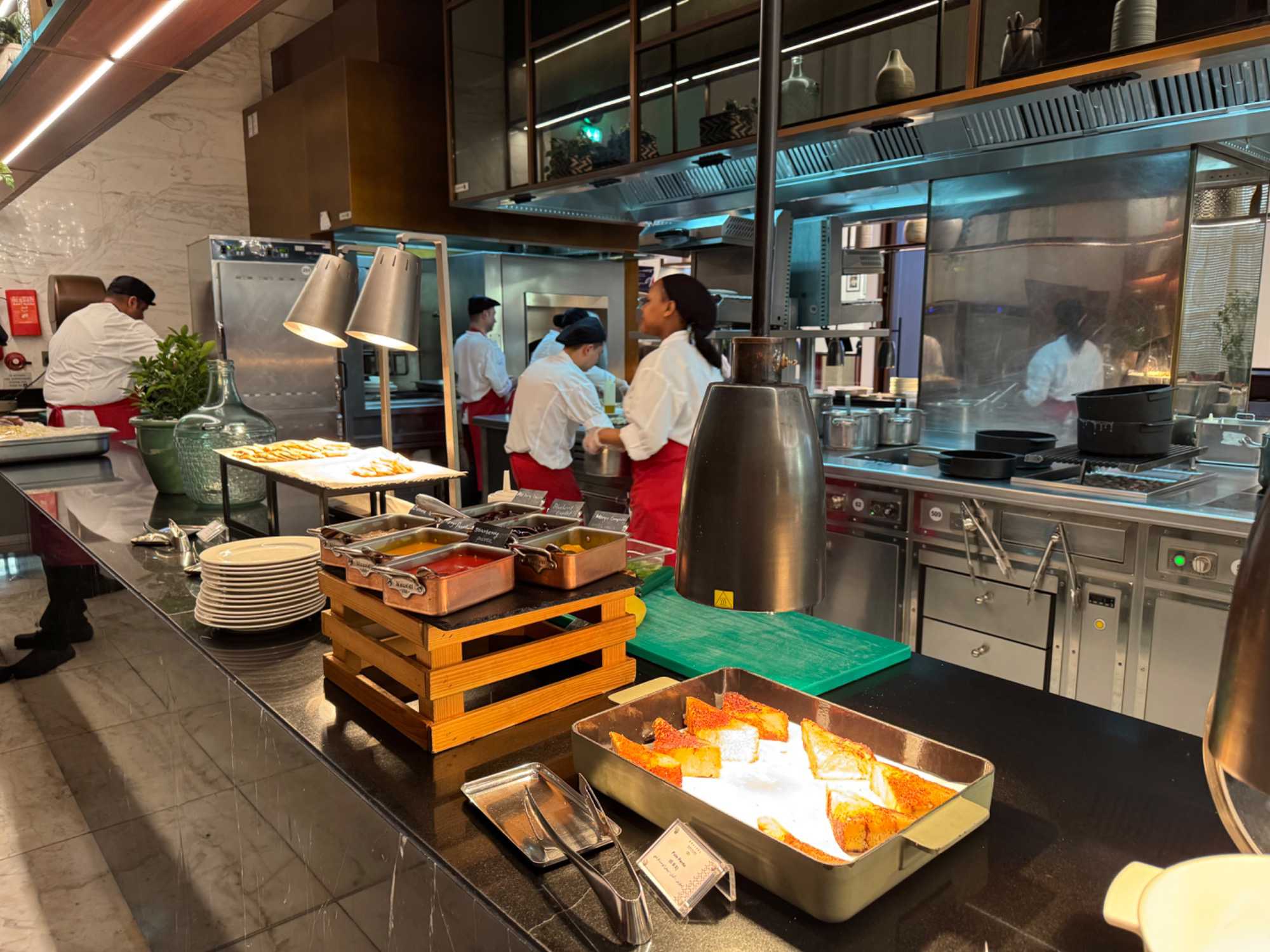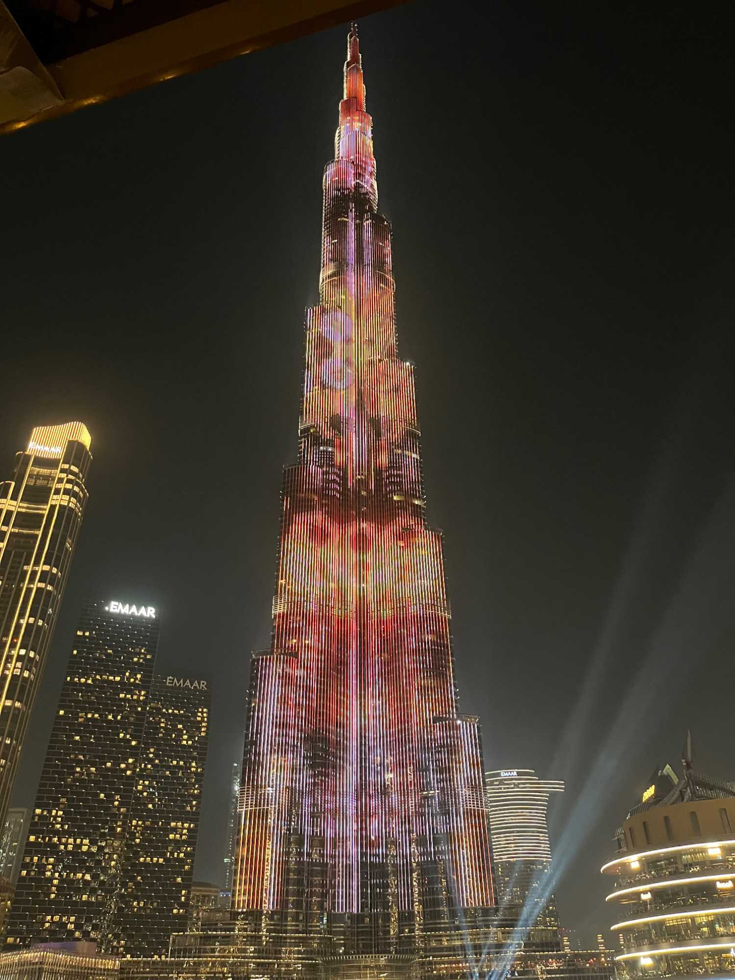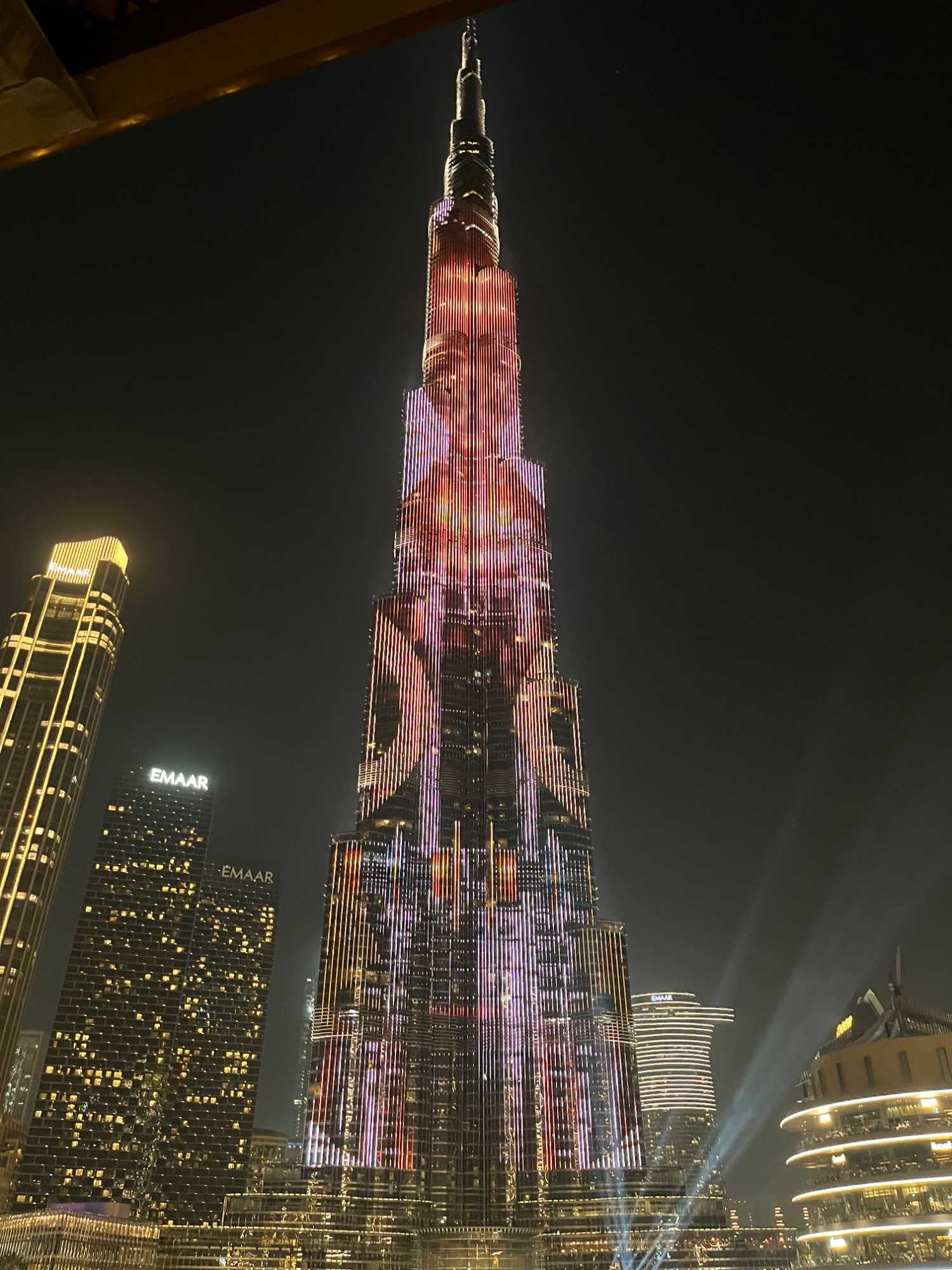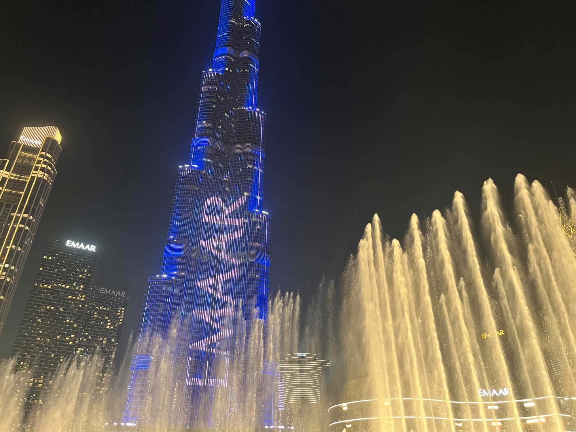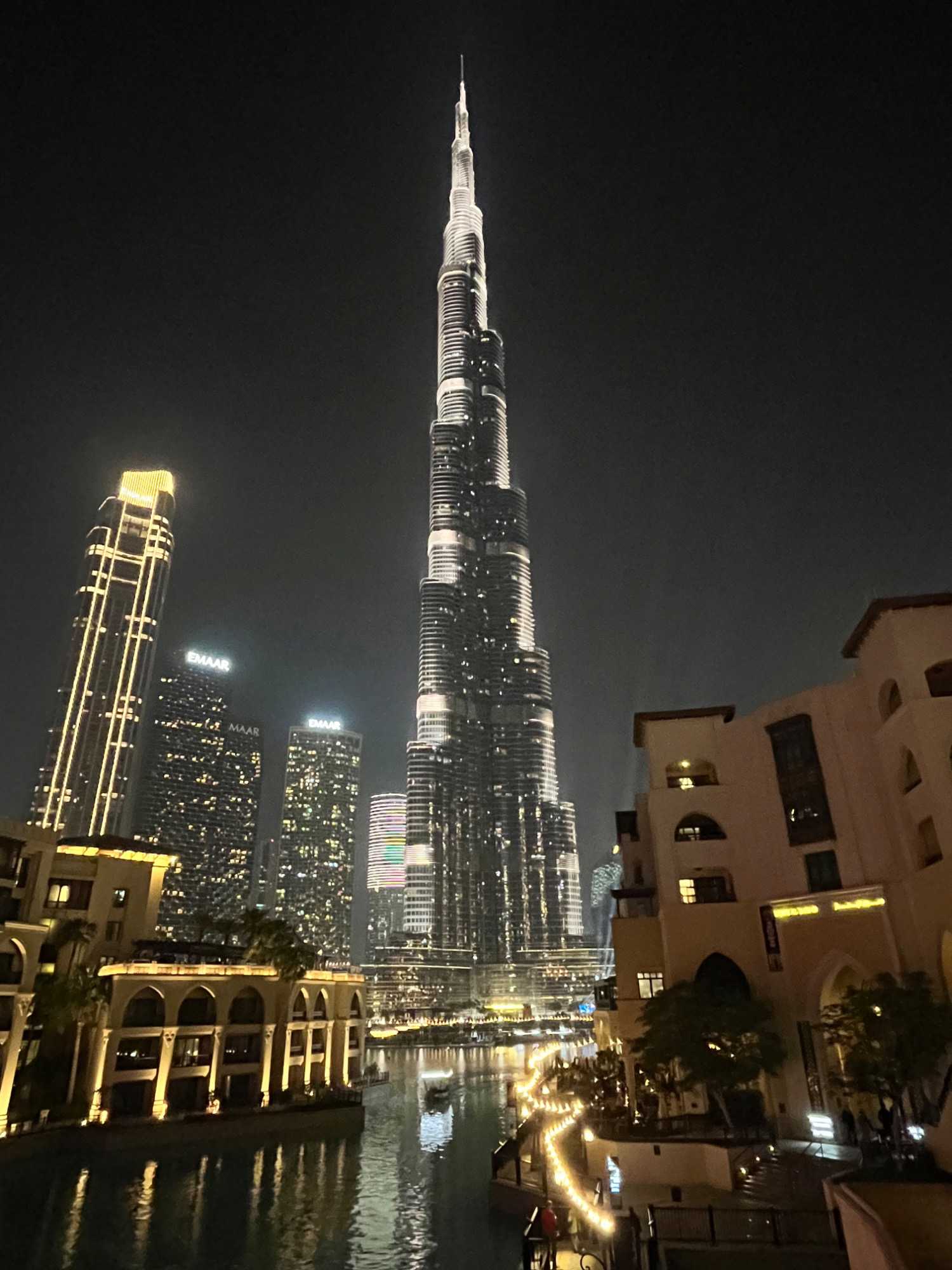 Pour clore cette journée, nous soupons au restaurant Abd El Wahab, situé dans le Souk Al Bahar, face au lac de la Burj Khalifa. Installés aux premières loges, face au lac Burj Khalifa, nous profitons d’un repas dans une ambiance raffinée et nous assistons au célèbre spectacle des fontaines de Dubaï, où jets d’eau, lumières et musique se synchronisent dans un ballet élégant, avec son gratte-ciel illuminée en toile de fond.