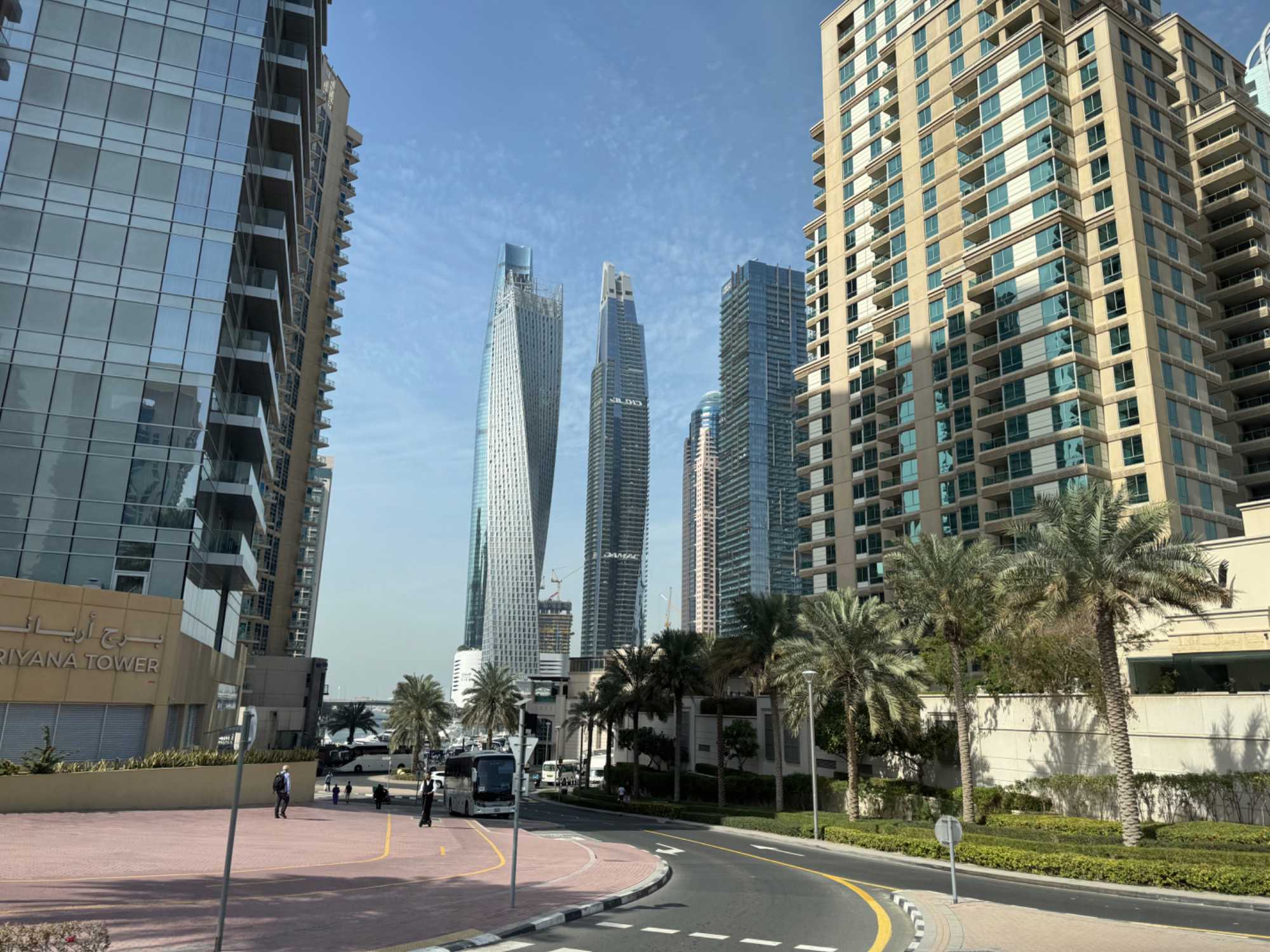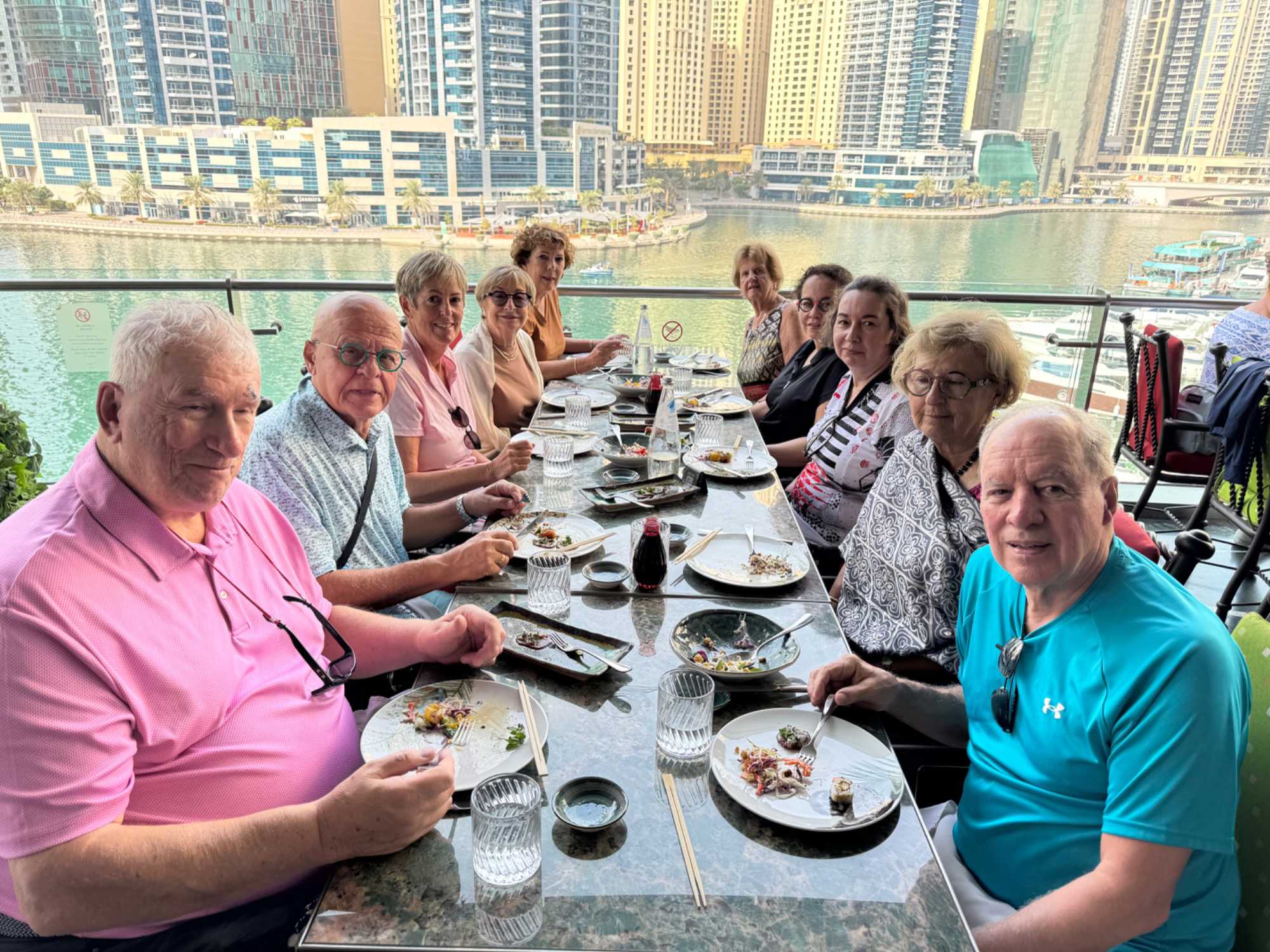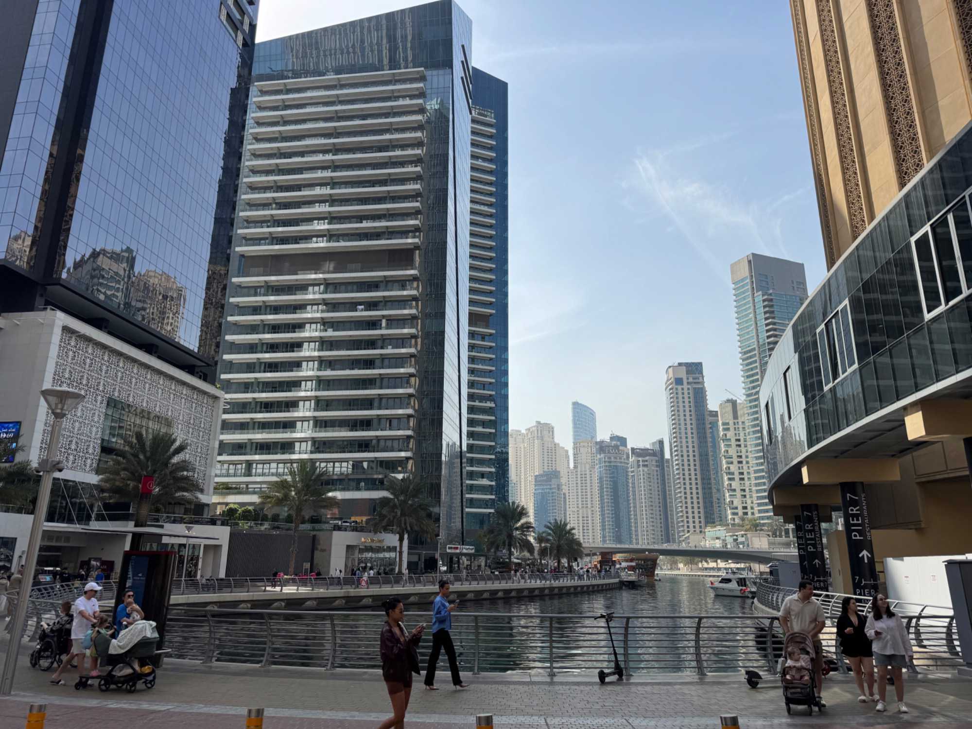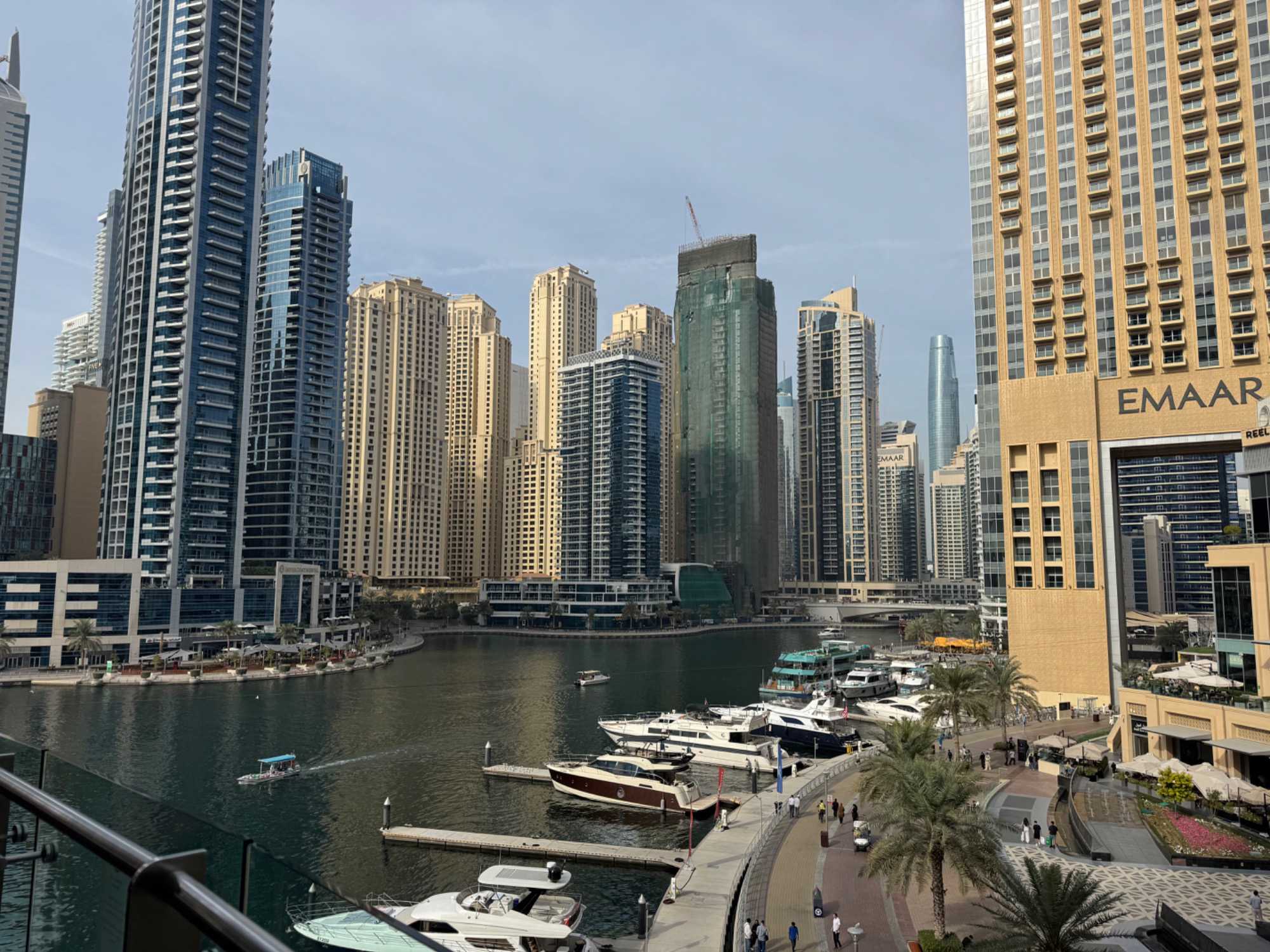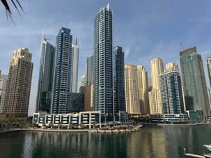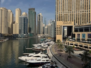 Nous allons ensuite vers la marina de Dubaï, ce quartier ultramoderne où les gratte-ciels se reflètent dans les eaux calmes du canal, bordé de yachts luxueux et de promenades animées. L’ambiance y est à la fois élégante et dynamique.
