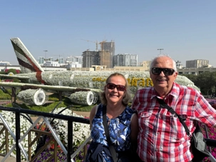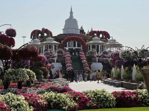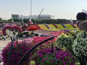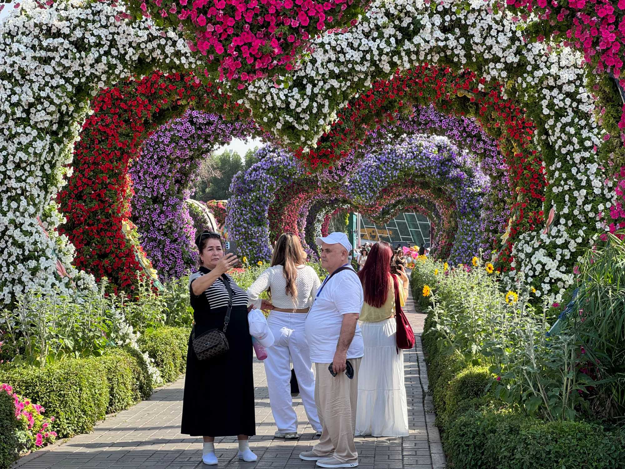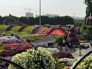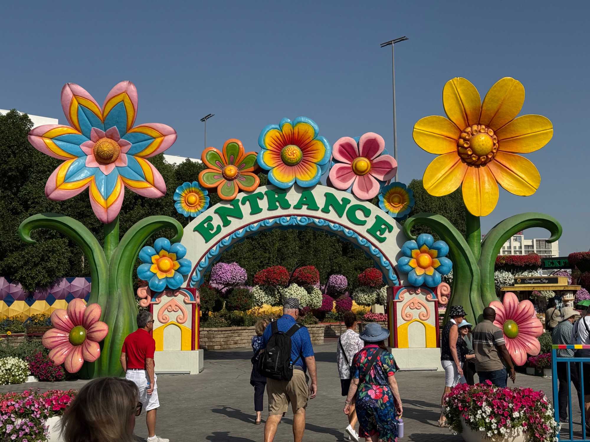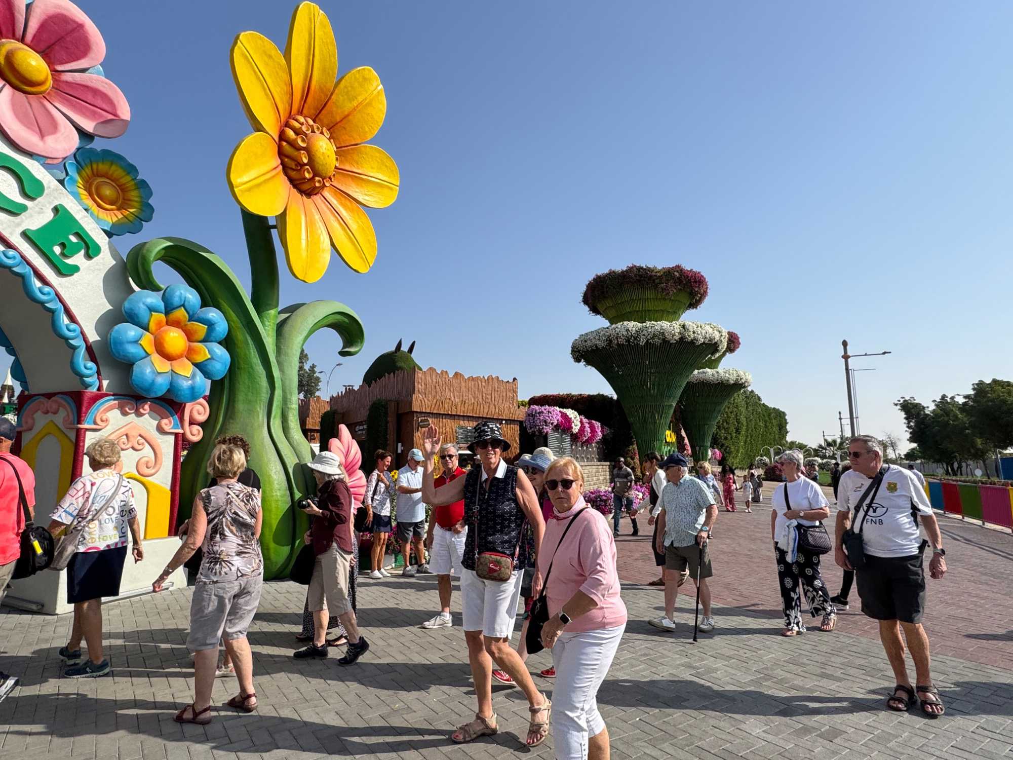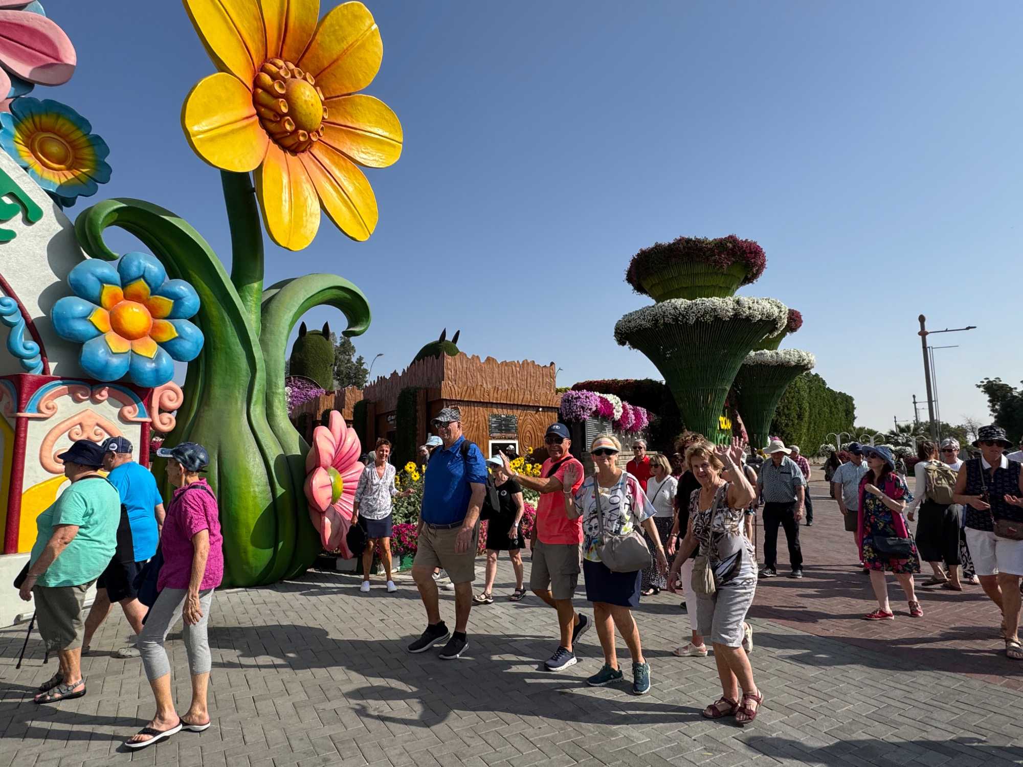 Après un excellent déjeuner à l’hôtel, nous retrouvons notre guide Achille, toujours souriant et de bonne humeur, pour une matinée exceptionnelle au Dubaï Miracle Garden. Situé dans le secteur de Dubailand, ce jardin est reconnu comme le plus grand jardin de fleurs au monde. Il s’étend sur plus de 72 000 m² et rassemble des dizaines de millions de fleurs, savamment disposées en compositions spectaculaires. Chaque année, les installations sont entièrement renouvelées, offrant un foisonnement de couleurs et de créativité.