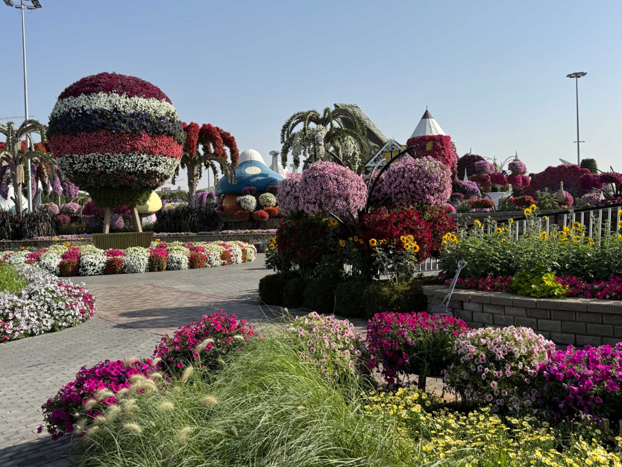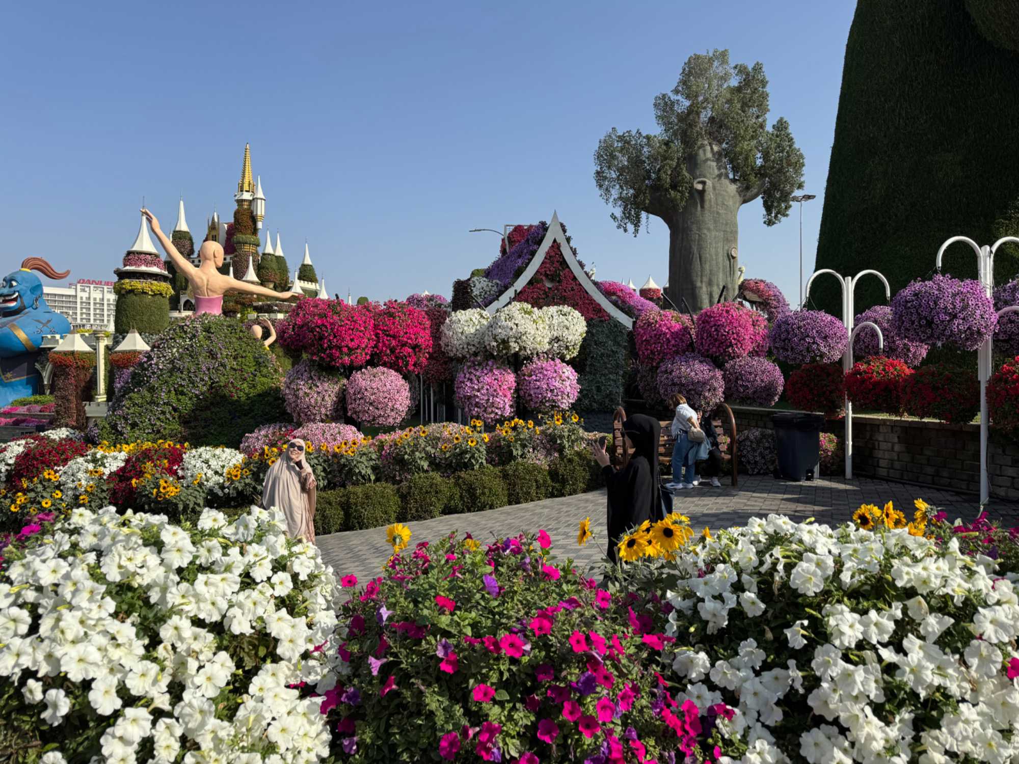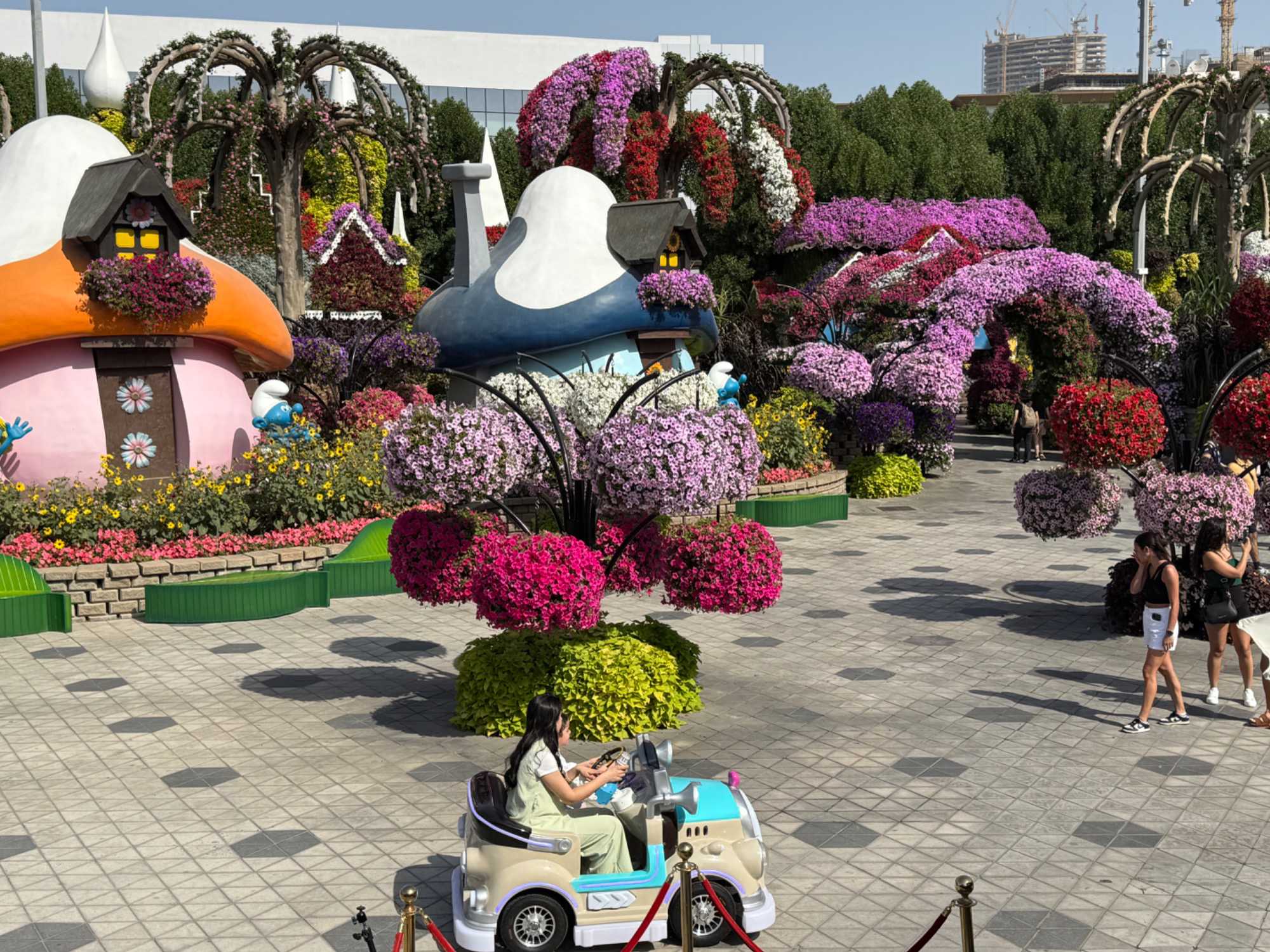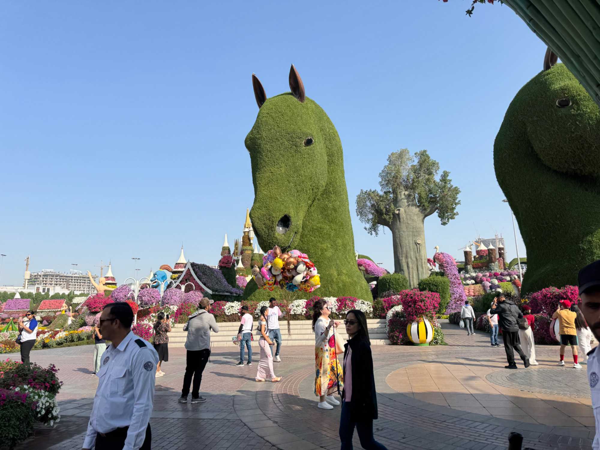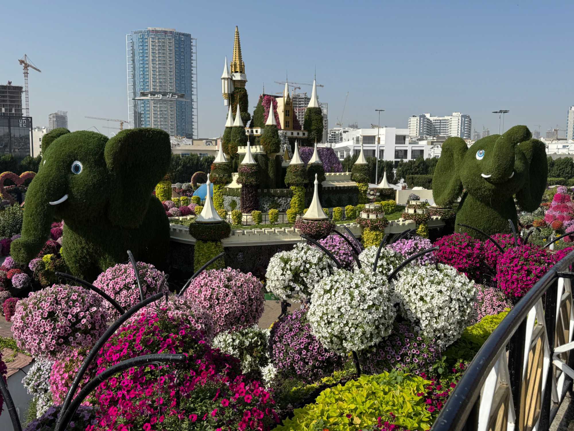 Nous déambulons à travers les allées du parc, découvrant des structures monumentales entièrement recouvertes de fleurs, des arches colorées, des maisons grandeur nature et d’impressionnantes sculptures florales. Conçu en plein désert grâce à des systèmes d’irrigation utilisant de l’eau recyclée, le Miracle Garden illustre parfaitement la capacité de Dubaï à repousser les limites de l’impossible.