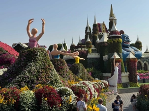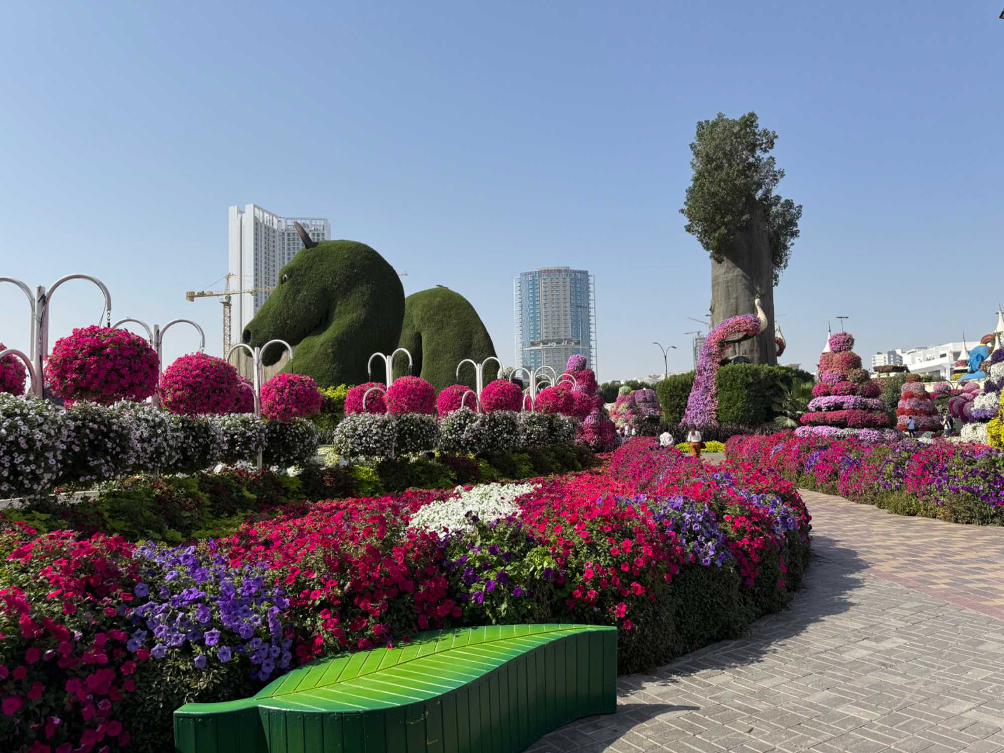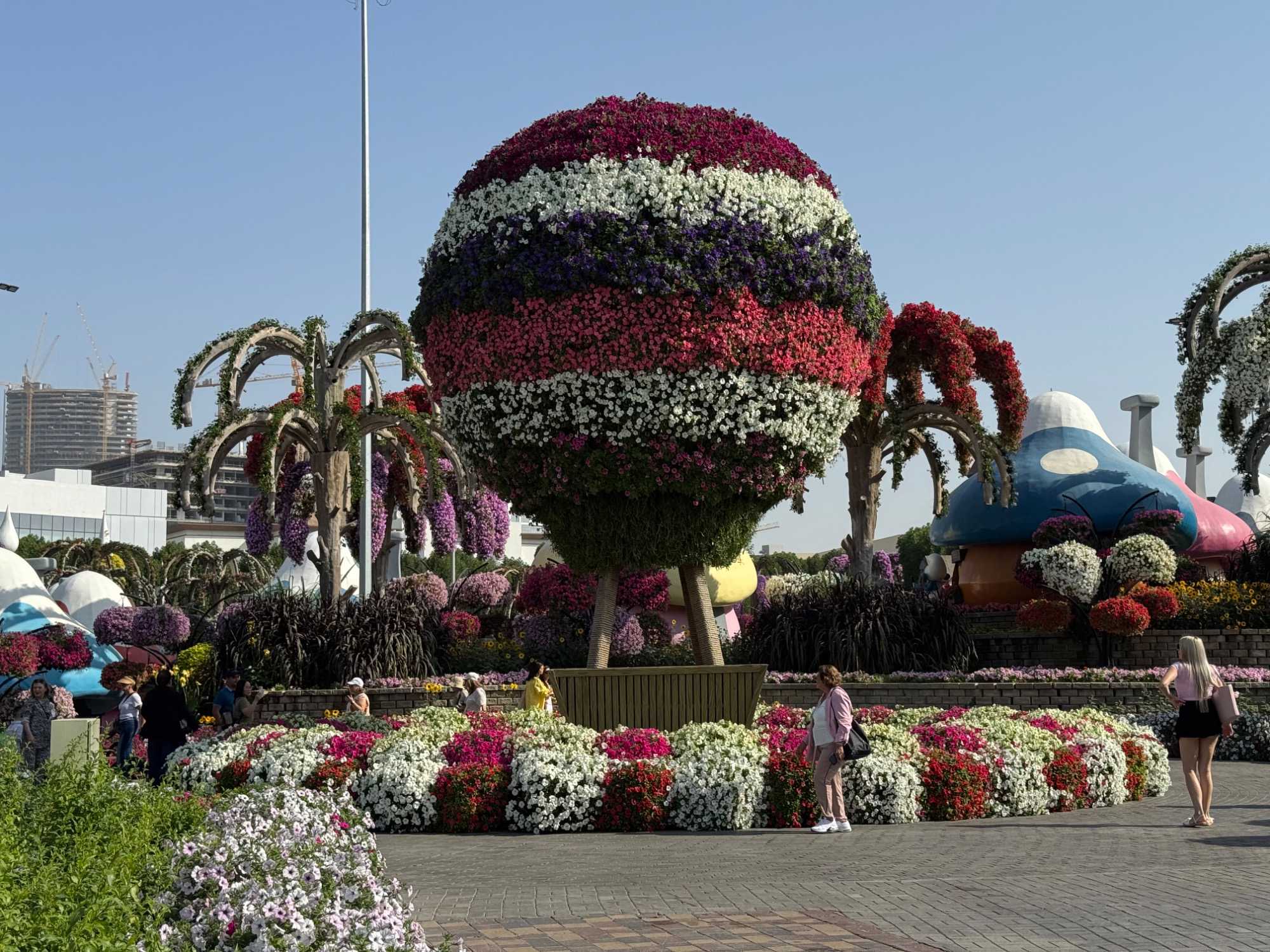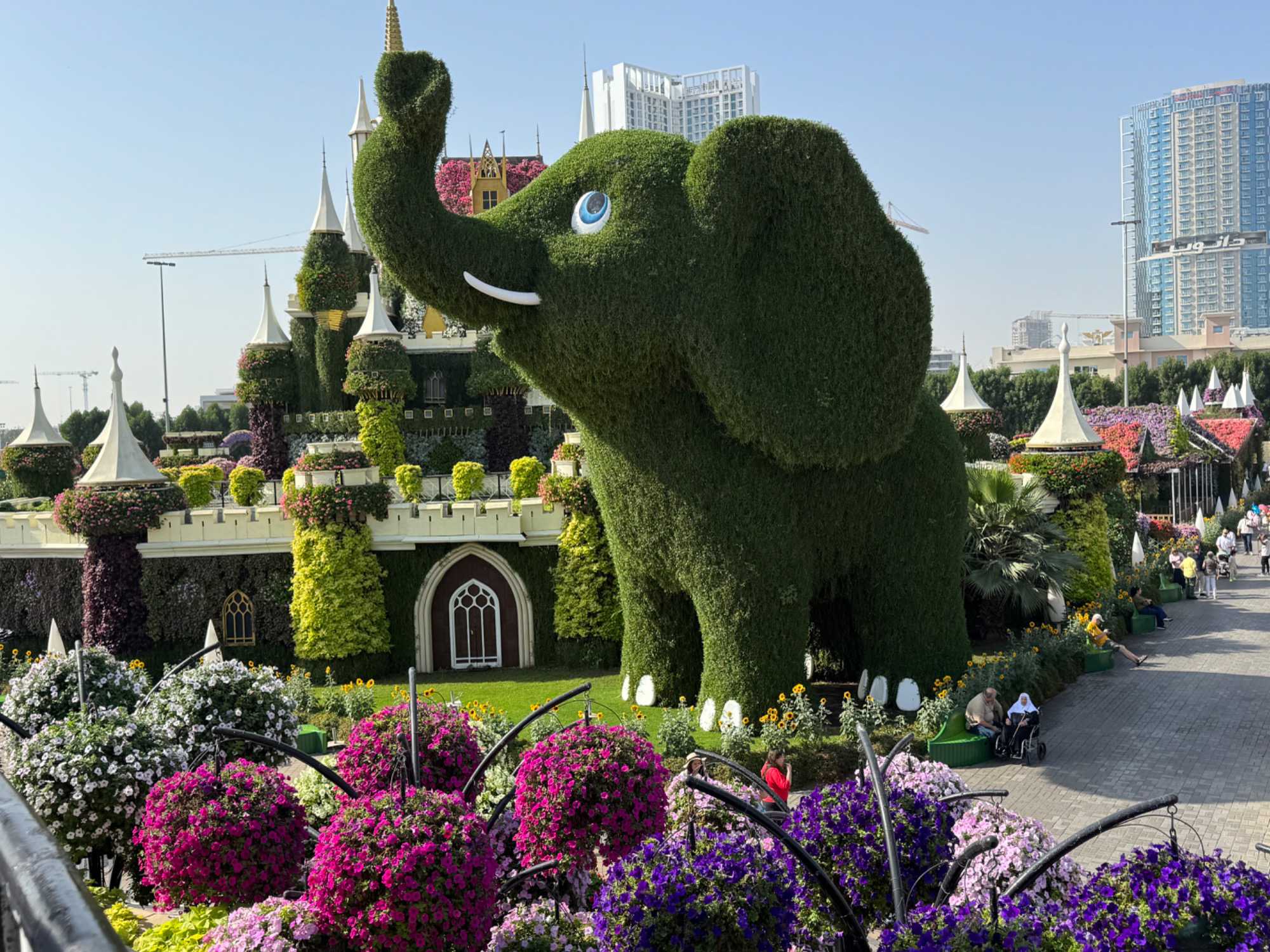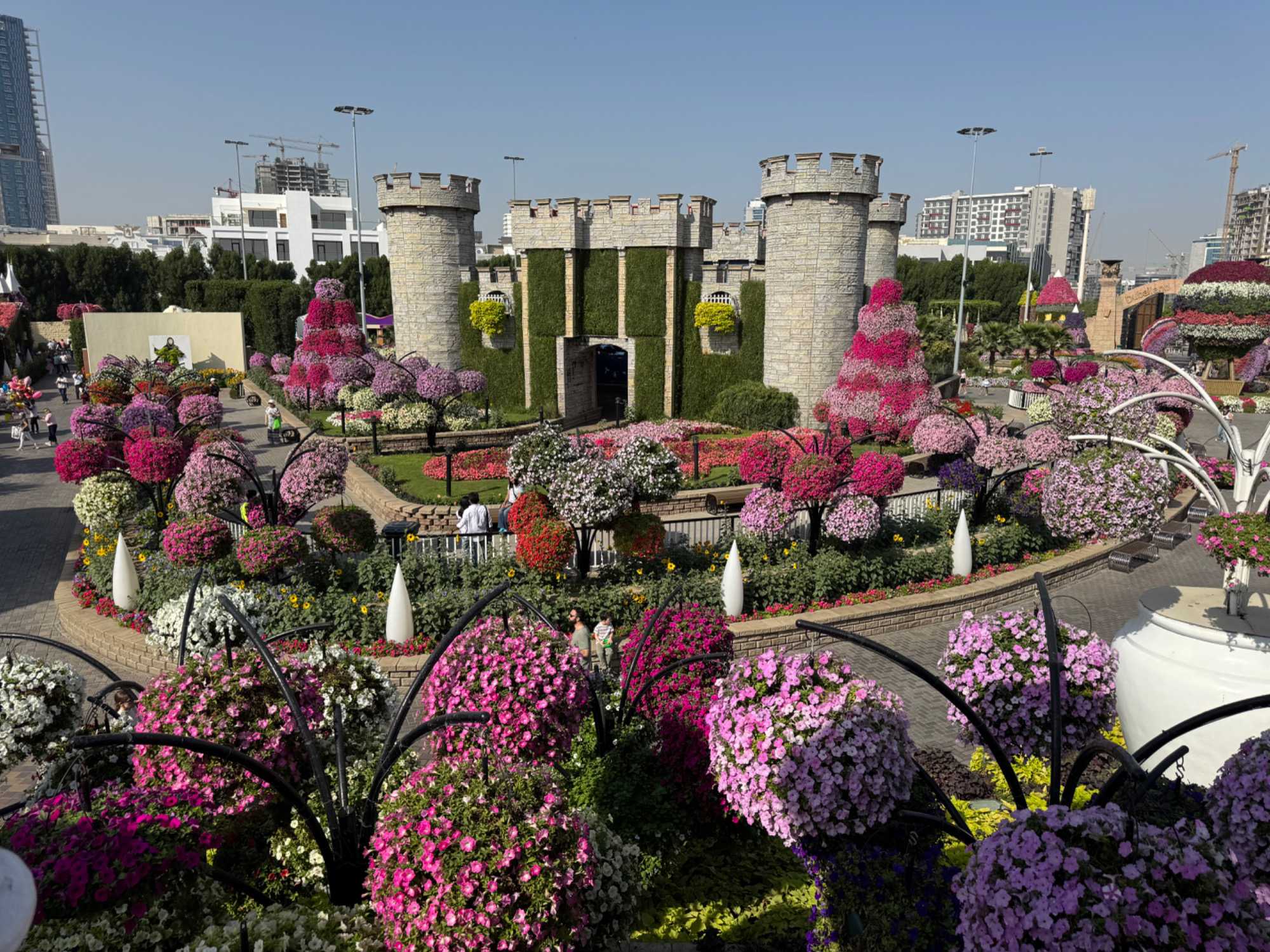 Nous déambulons à travers les allées du parc, découvrant des structures monumentales entièrement recouvertes de fleurs, des arches colorées, des maisons grandeur nature et d’impressionnantes sculptures florales. Conçu en plein désert grâce à des systèmes d’irrigation utilisant de l’eau recyclée, le Miracle Garden illustre parfaitement la capacité de Dubaï à repousser les limites de l’impossible.