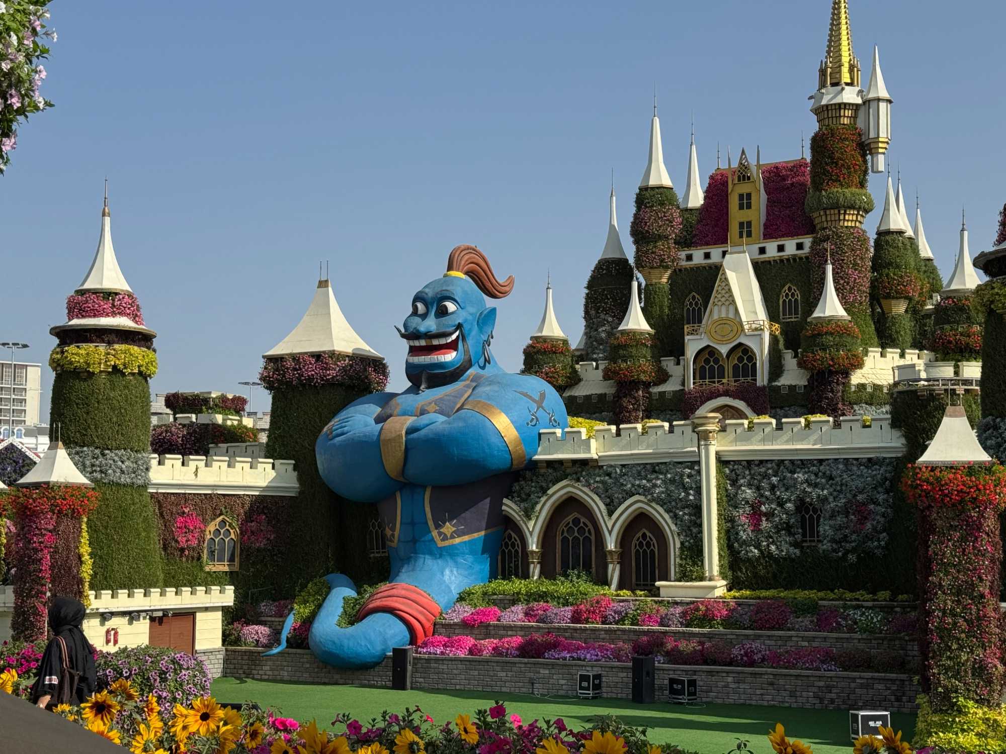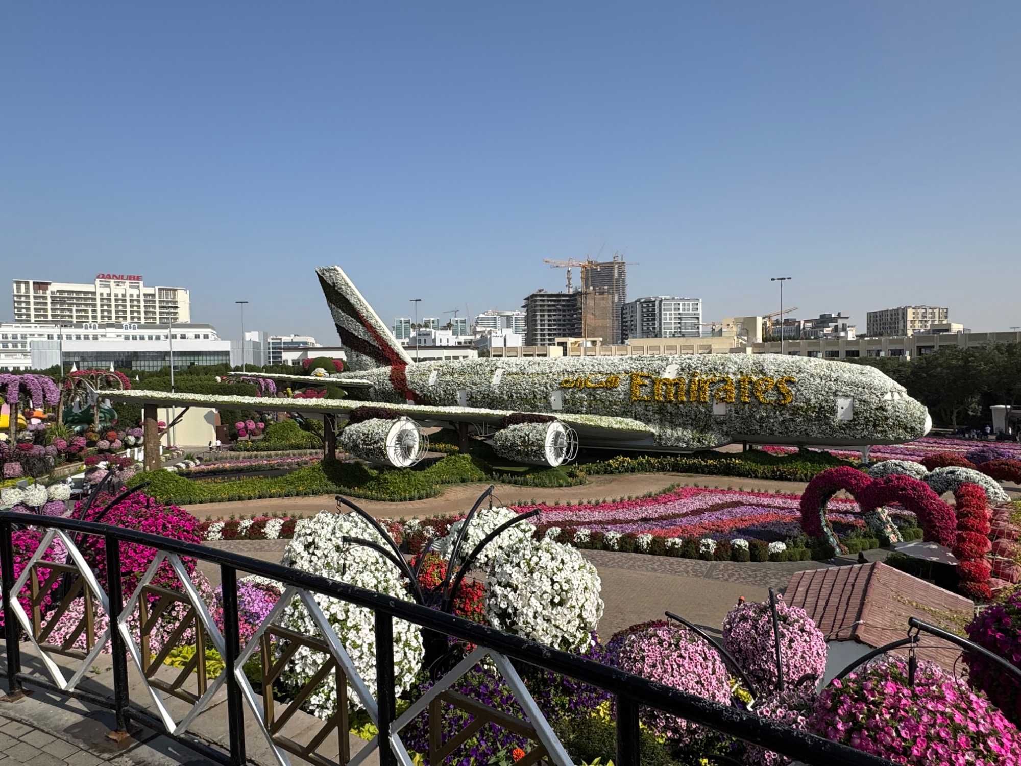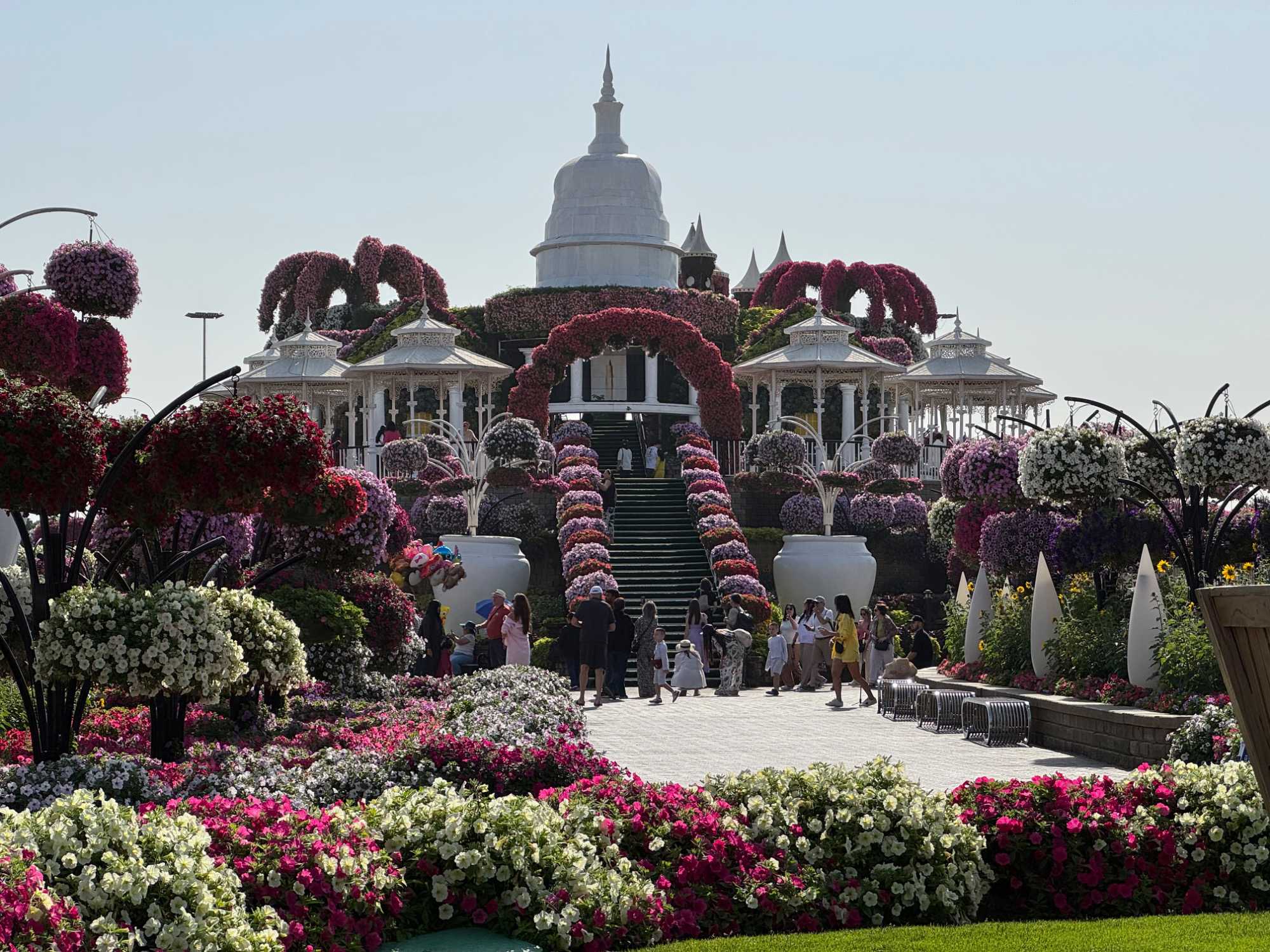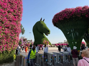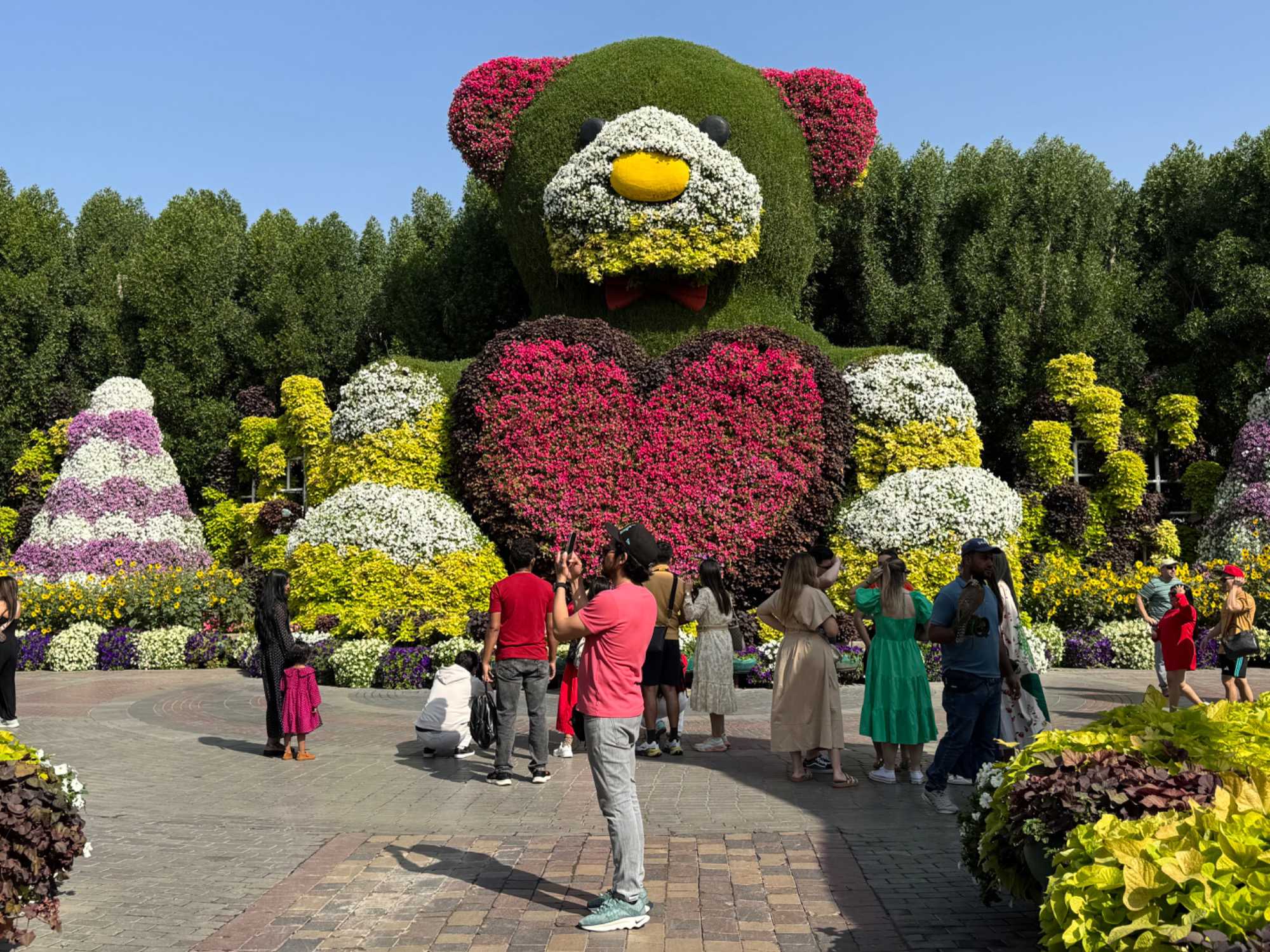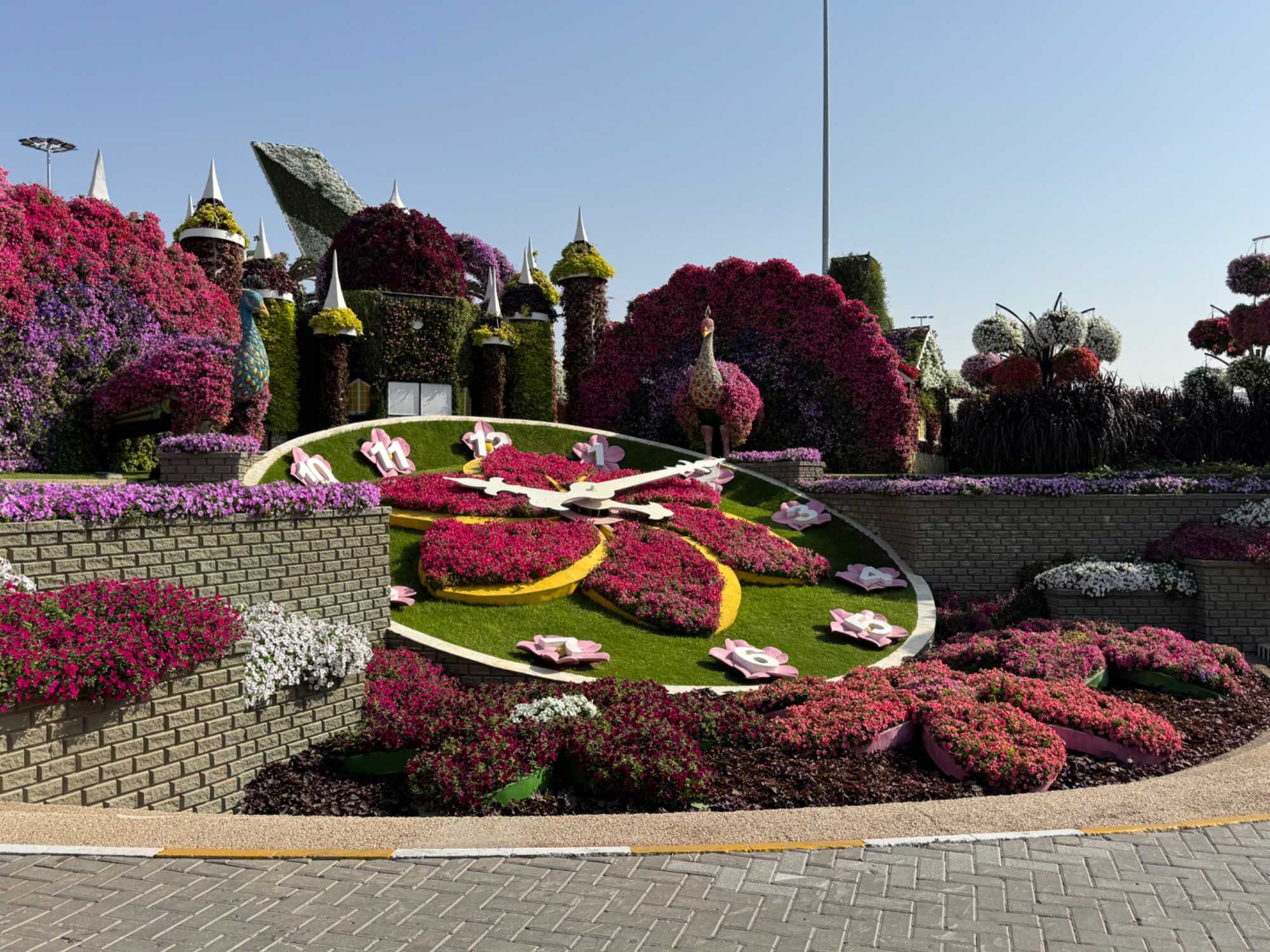 Nous déambulons à travers les allées du parc, découvrant des structures monumentales entièrement recouvertes de fleurs, des arches colorées, des maisons grandeur nature et d’impressionnantes sculptures florales. Conçu en plein désert grâce à des systèmes d’irrigation utilisant de l’eau recyclée, le Miracle Garden illustre parfaitement la capacité de Dubaï à repousser les limites de l’impossible.
