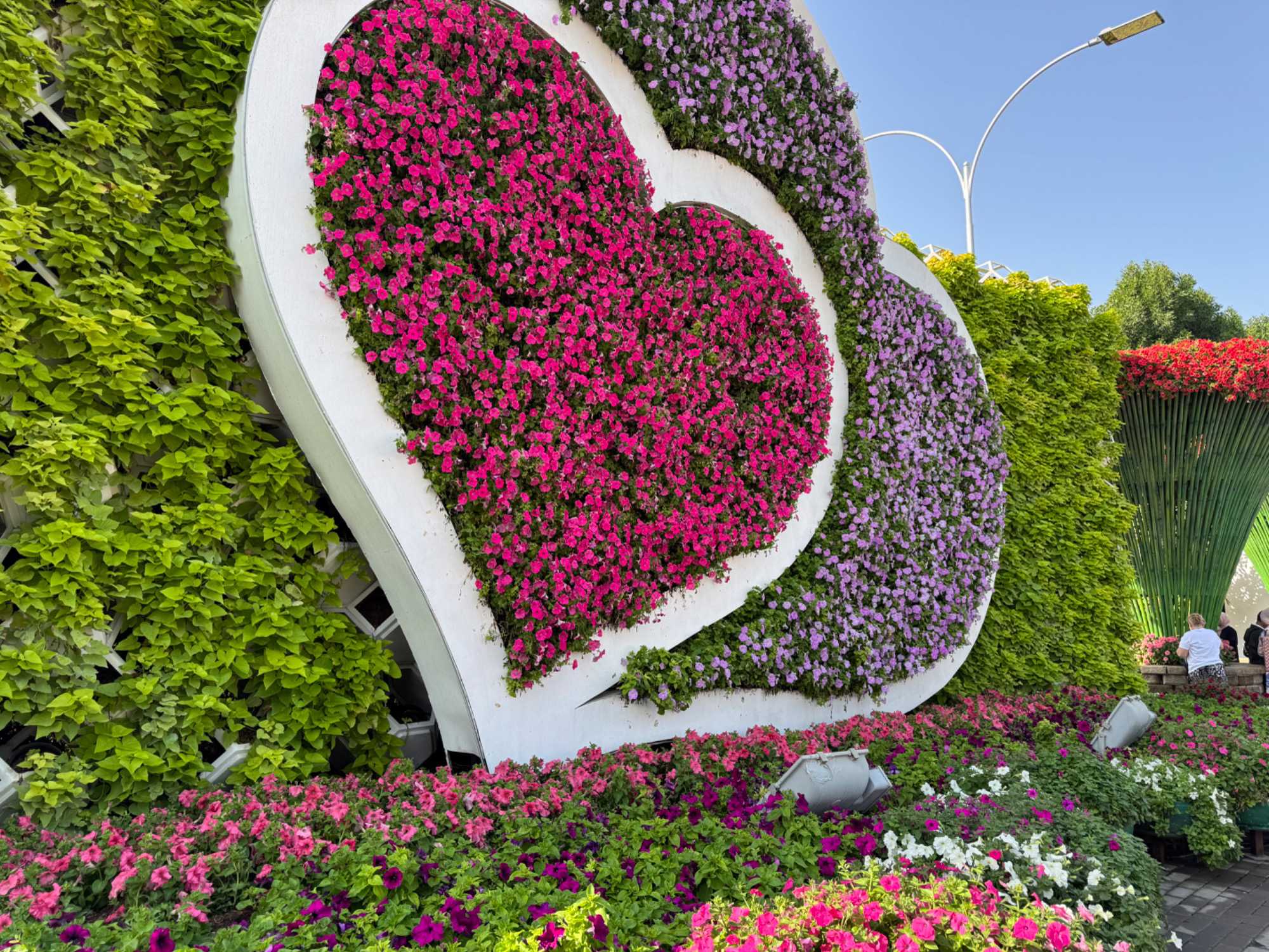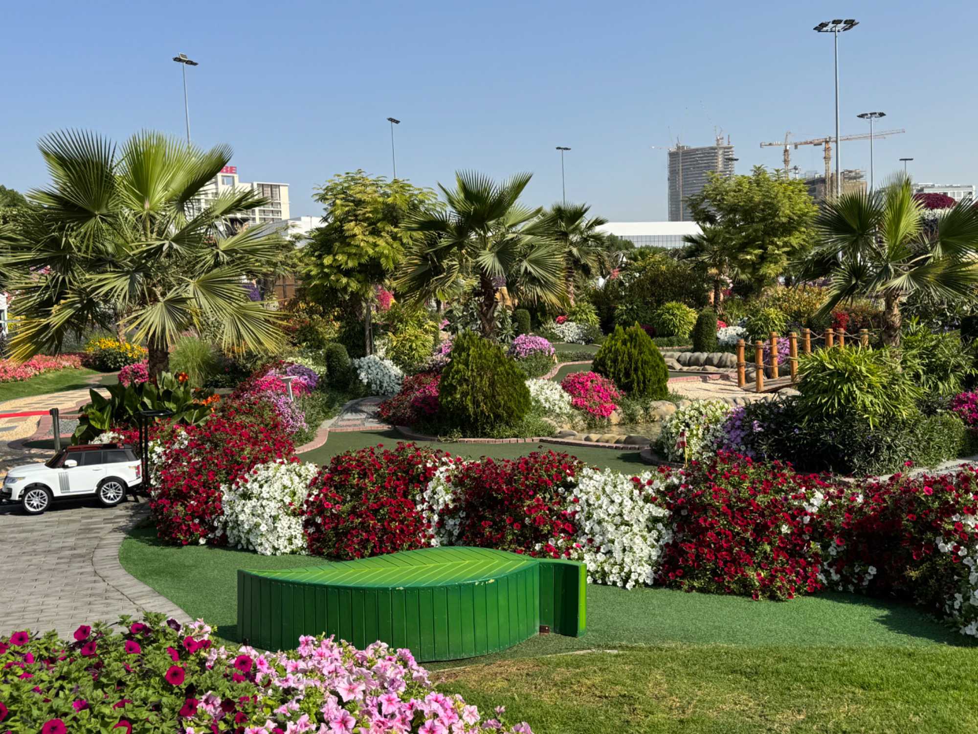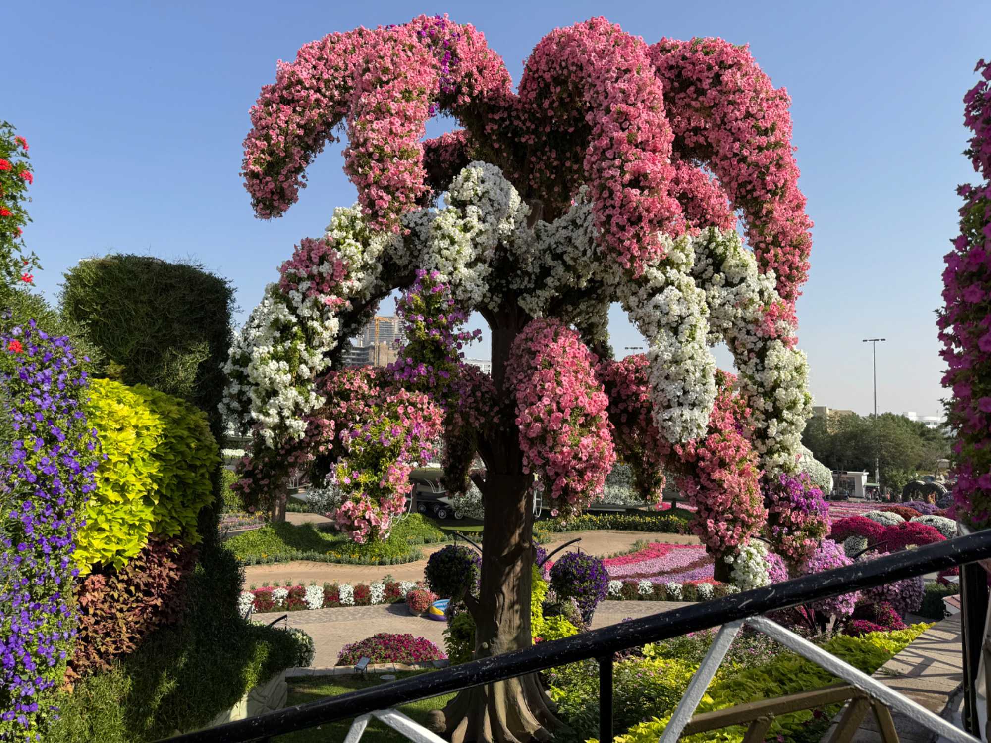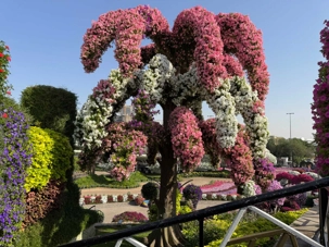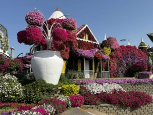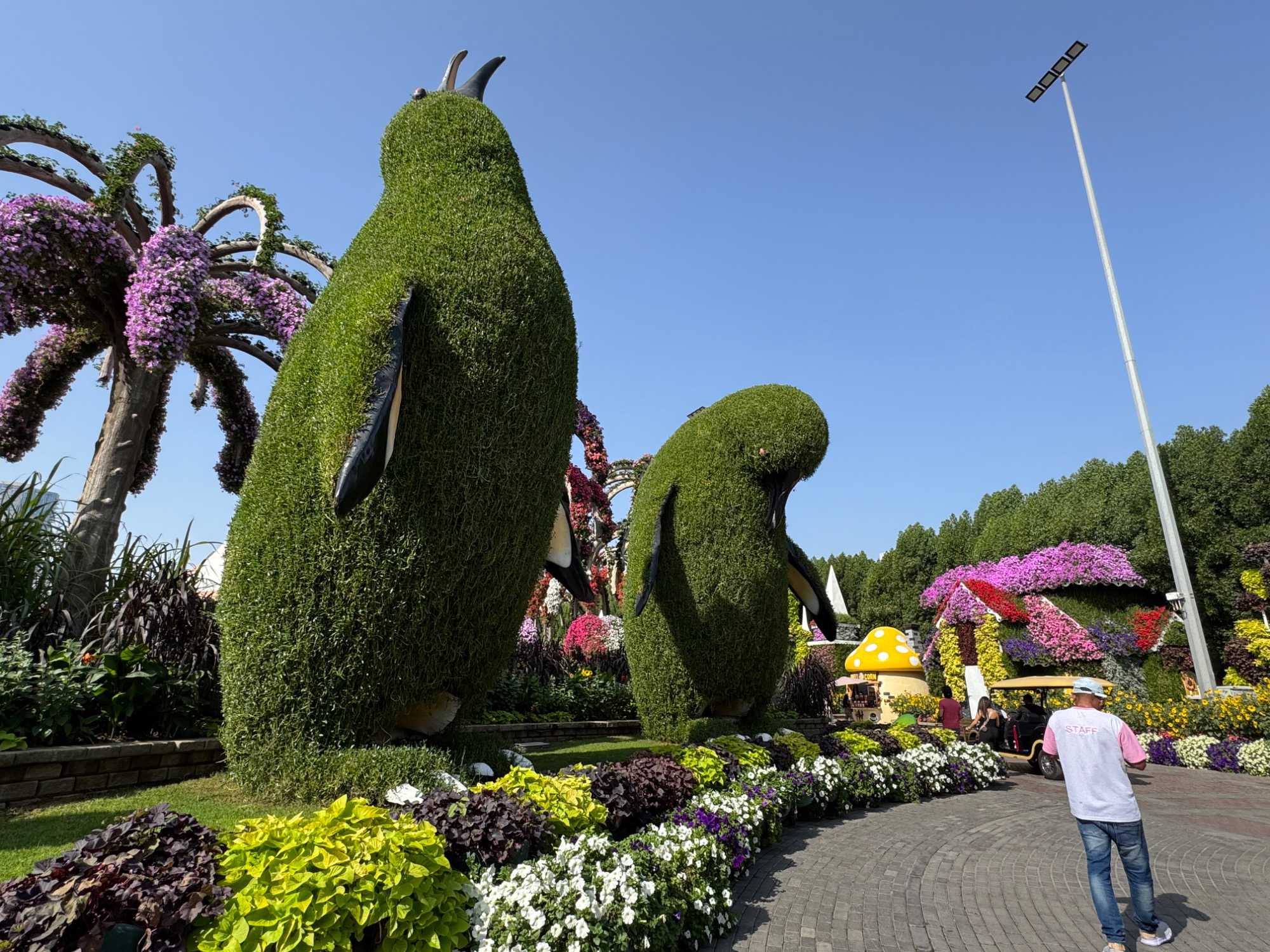 Nous déambulons à travers les allées du parc, découvrant des structures monumentales entièrement recouvertes de fleurs, des arches colorées, des maisons grandeur nature et d’impressionnantes sculptures florales. Conçu en plein désert grâce à des systèmes d’irrigation utilisant de l’eau recyclée, le Miracle Garden illustre parfaitement la capacité de Dubaï à repousser les limites de l’impossible.