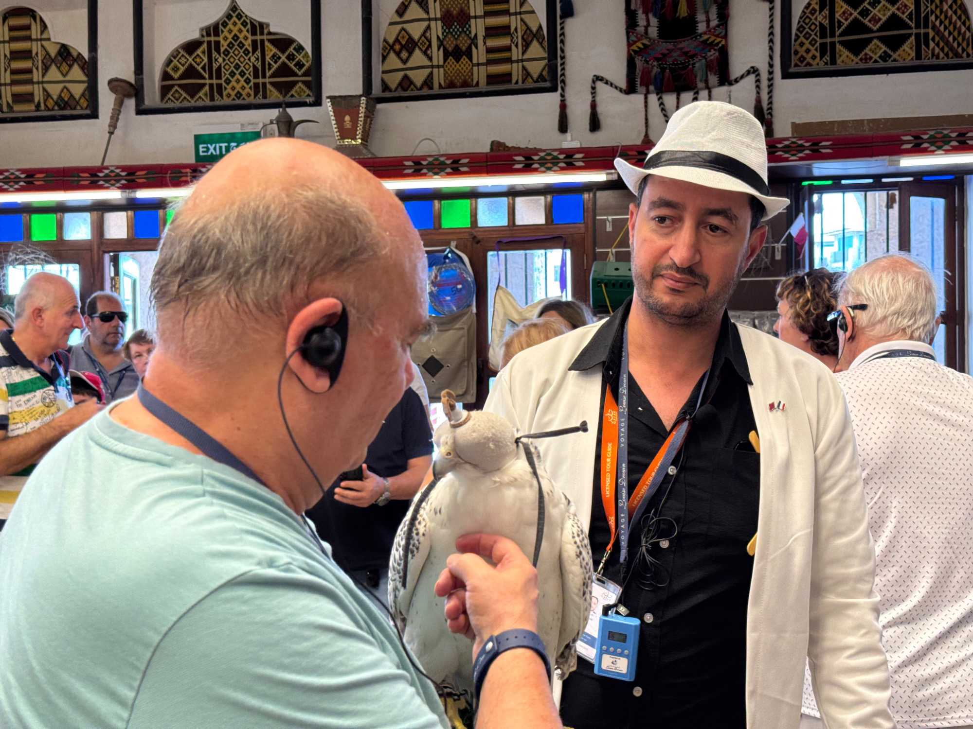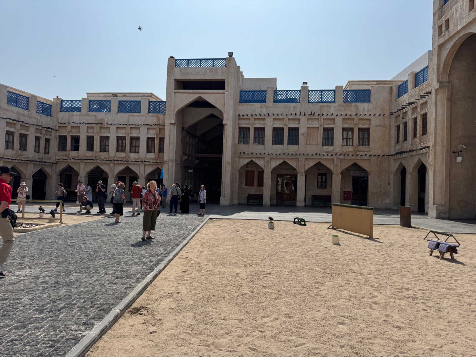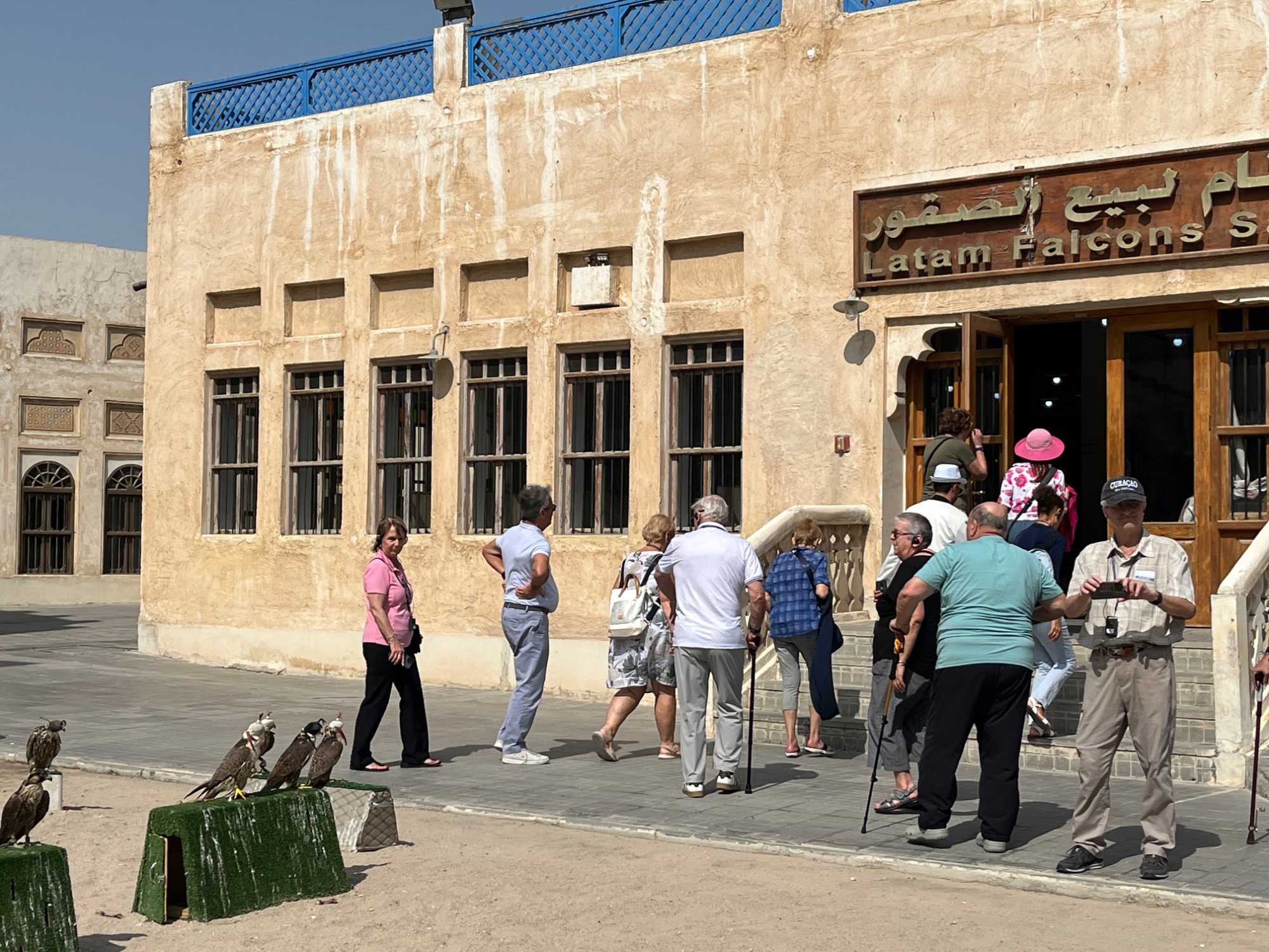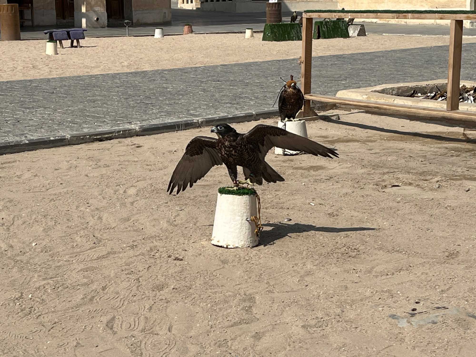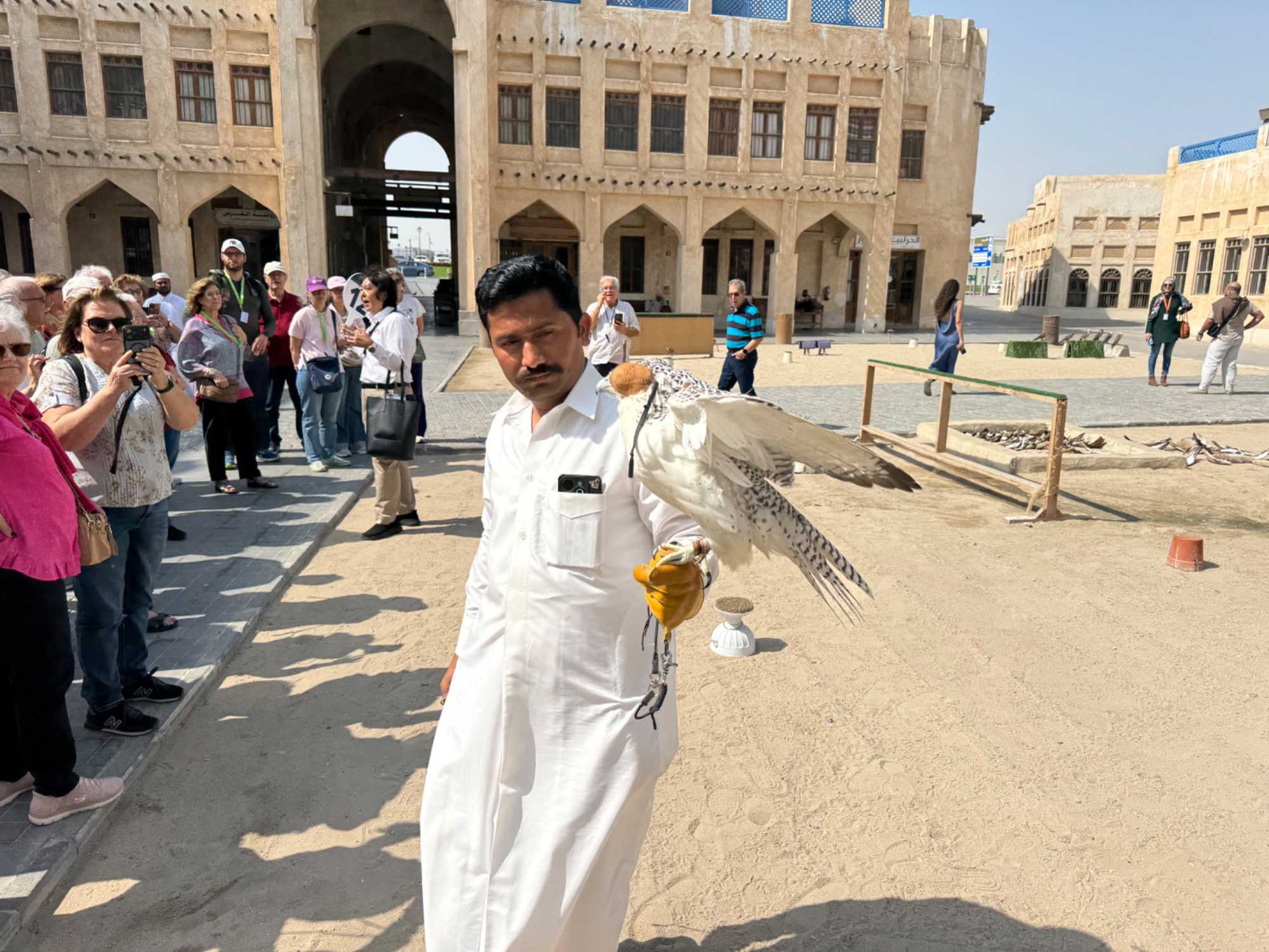 Nous rejoignons ensuite le Souq Waqif, véritable cœur historique et culturel de Doha, où nous passons une grande partie de l’après-midi. Dès l’entrée, l’ambiance change radicalement : ruelles animées, étals d’épices, tissus colorés, parfums d’encens et artisanat local éveillent tous les sens. Le souk offre une atmosphère authentique et vibrante, contrastant agréablement avec les quartiers ultramodernes de la ville. La visite guidée nous mène notamment au marché aux faucons, l’un des moments forts de la journée. Ces oiseaux majestueux, symboles de noblesse et de fierté nationale, occupent une place centrale dans la culture qatarienne. La fauconnerie, transmise depuis des siècles, est bien plus qu’un loisir : c’est un art. Nous apprenons que chaque faucon possède son propre passeport et peut voyager en cabine à bord des compagnies aériennes du Golfe. Selon les disponibilités, la visite de l’hôpital des faucons, entièrement dédié à leurs soins, nous impressionne par le niveau d’attention et de modernité accordé à ces oiseaux d’exception.