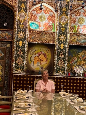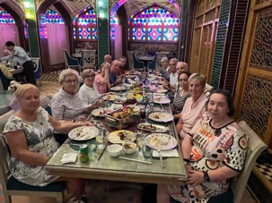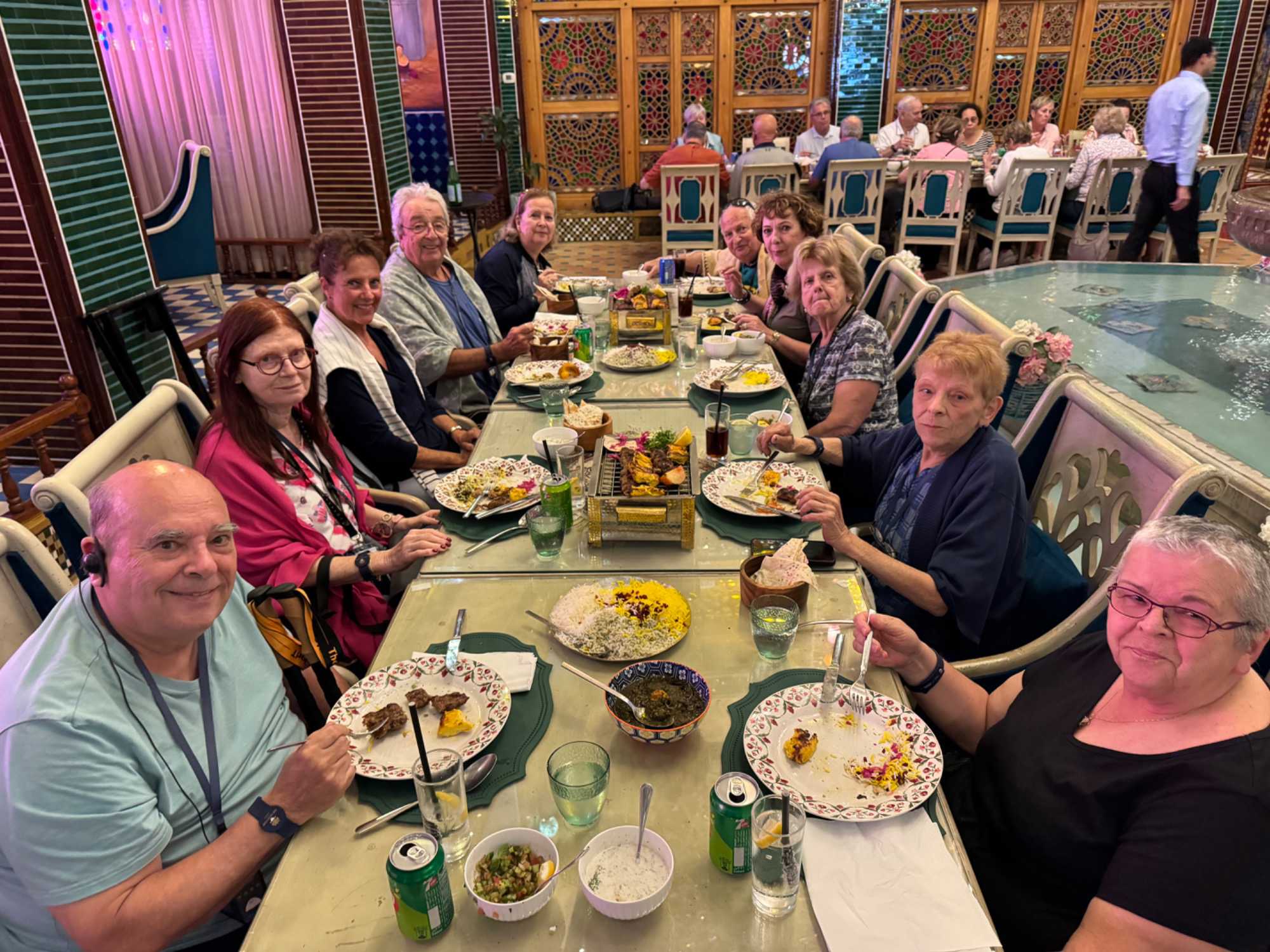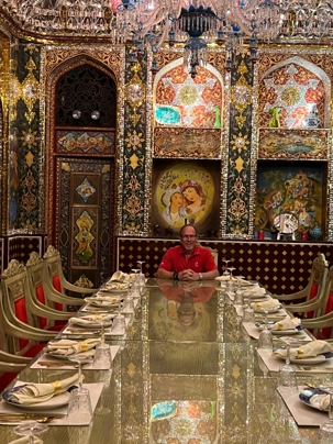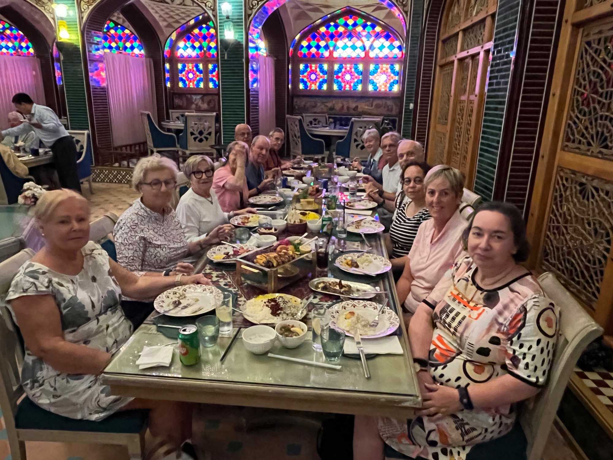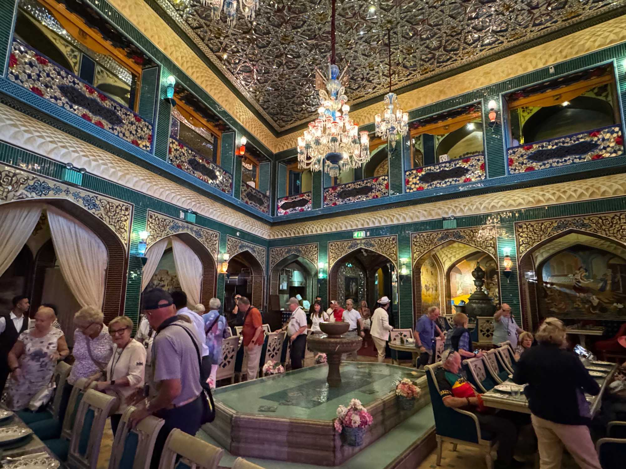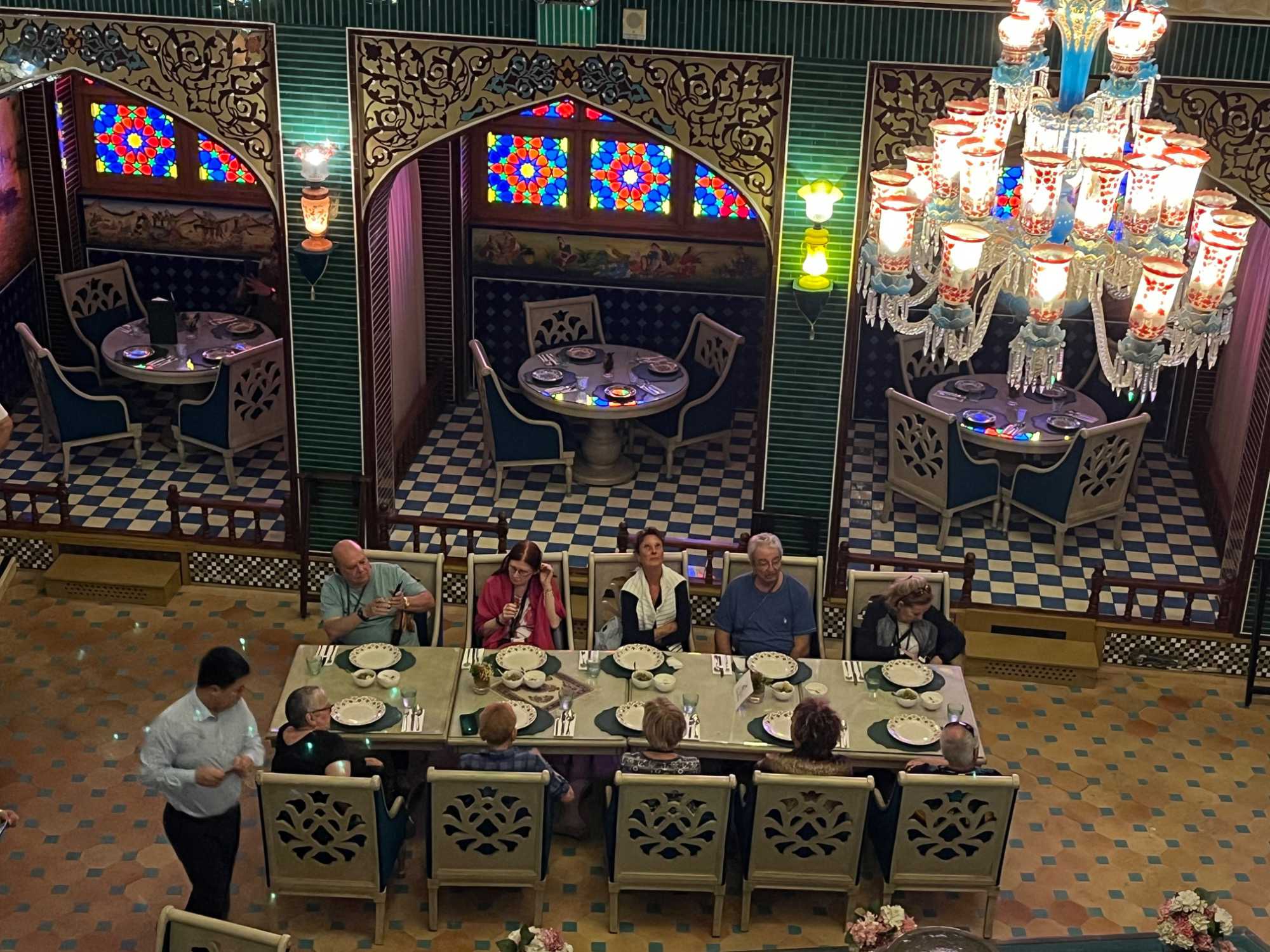 À 13 h, nous partageons le dîner au restaurant Parisa, situé au cœur du souk. Le décor somptueux, richement orné de mosaïques, de miroirs et de détails raffinés, impressionne autant que la cuisine. Les saveurs persanes, délicates et parfumées, font de ce repas un moment particulièrement apprécié par tout le groupe.