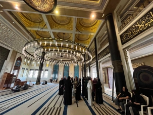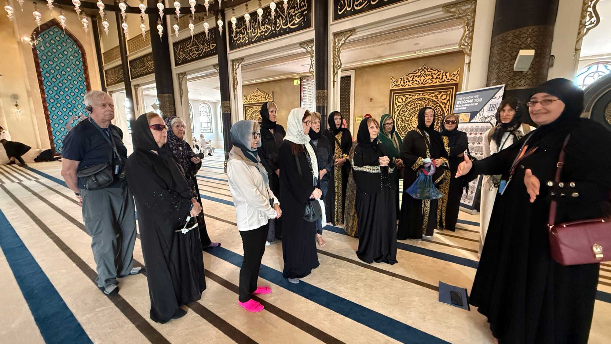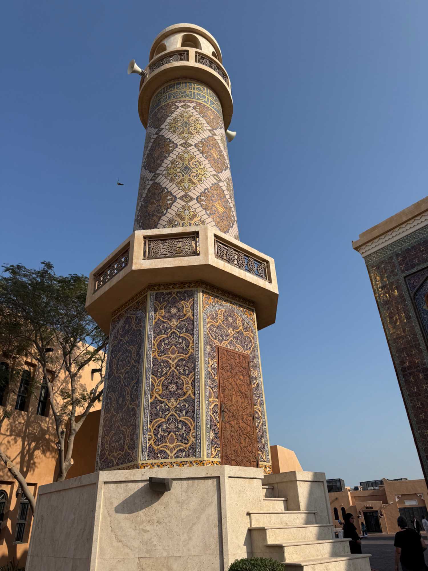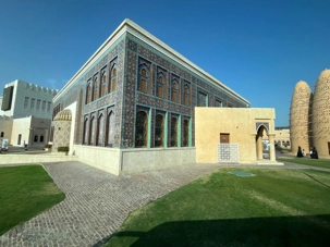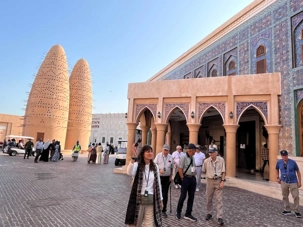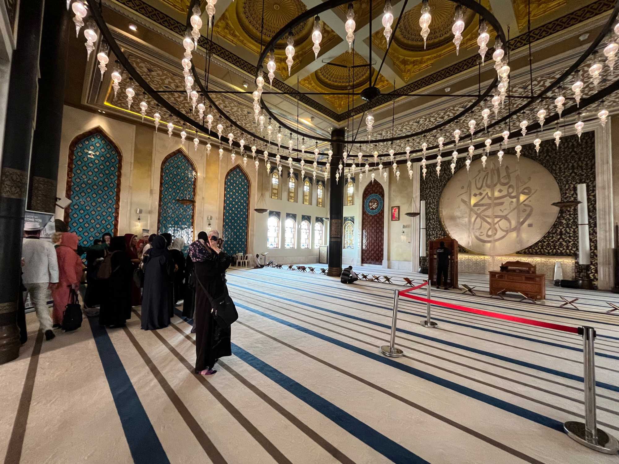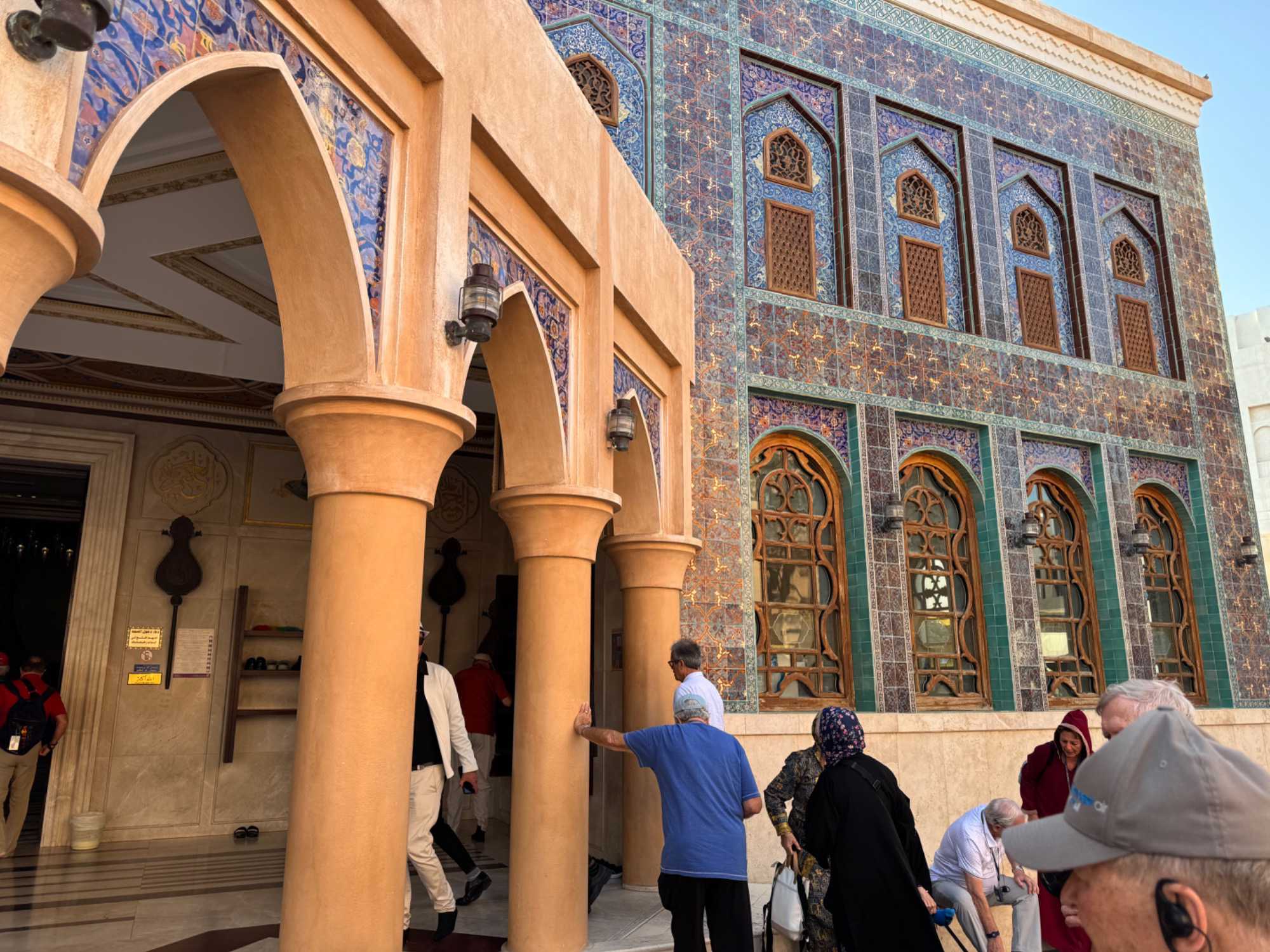 Après ce délicieux dîner, nous poursuivons notre découverte culturelle par la visite de la mosquée Bleue de Katara, également connue sous le nom de mosquée Katara. Située au cœur du village culturel de Katara, cette mosquée se distingue par son architecture raffinée et son décor somptueux. Recouverte de magnifiques mosaïques bleues et turquoise inspirées des traditions ottomanes et persanes, elle capte immédiatement le regard et invite au recueillement. À l’intérieur, nos guides nous expliquent les fondements de l’islam, les cinq piliers de la foi, ainsi que les rituels de la prière. Le calme et la sérénité du lieu contrastent avec l’animation du souk visité plus tôt, offrant un moment de pause spirituelle et culturelle très apprécié par le groupe. Cette visite nous permet de mieux comprendre la place centrale de la religion dans la vie quotidienne qatarienne, tout en admirant un joyau architectural d’une grande élégance.