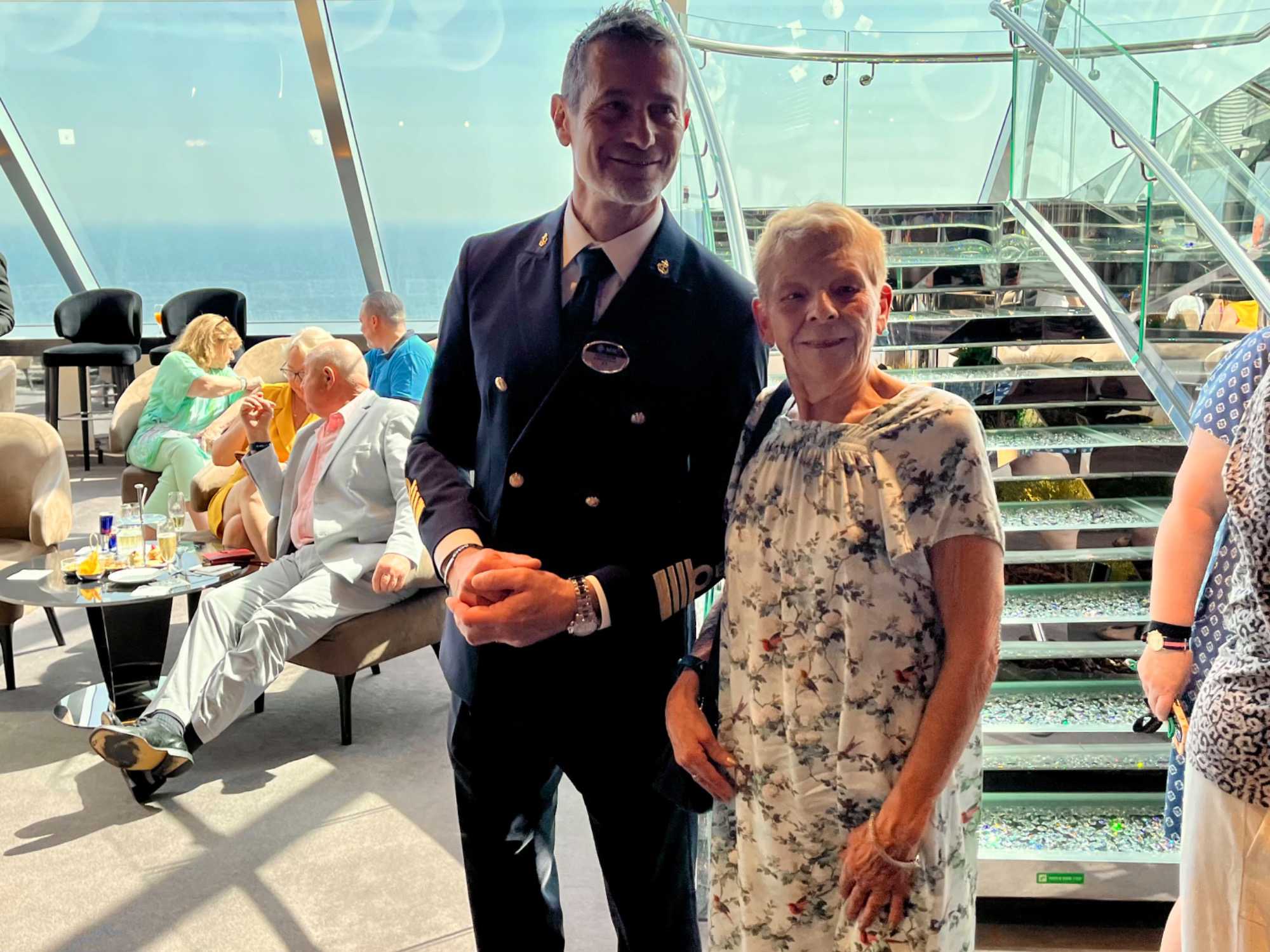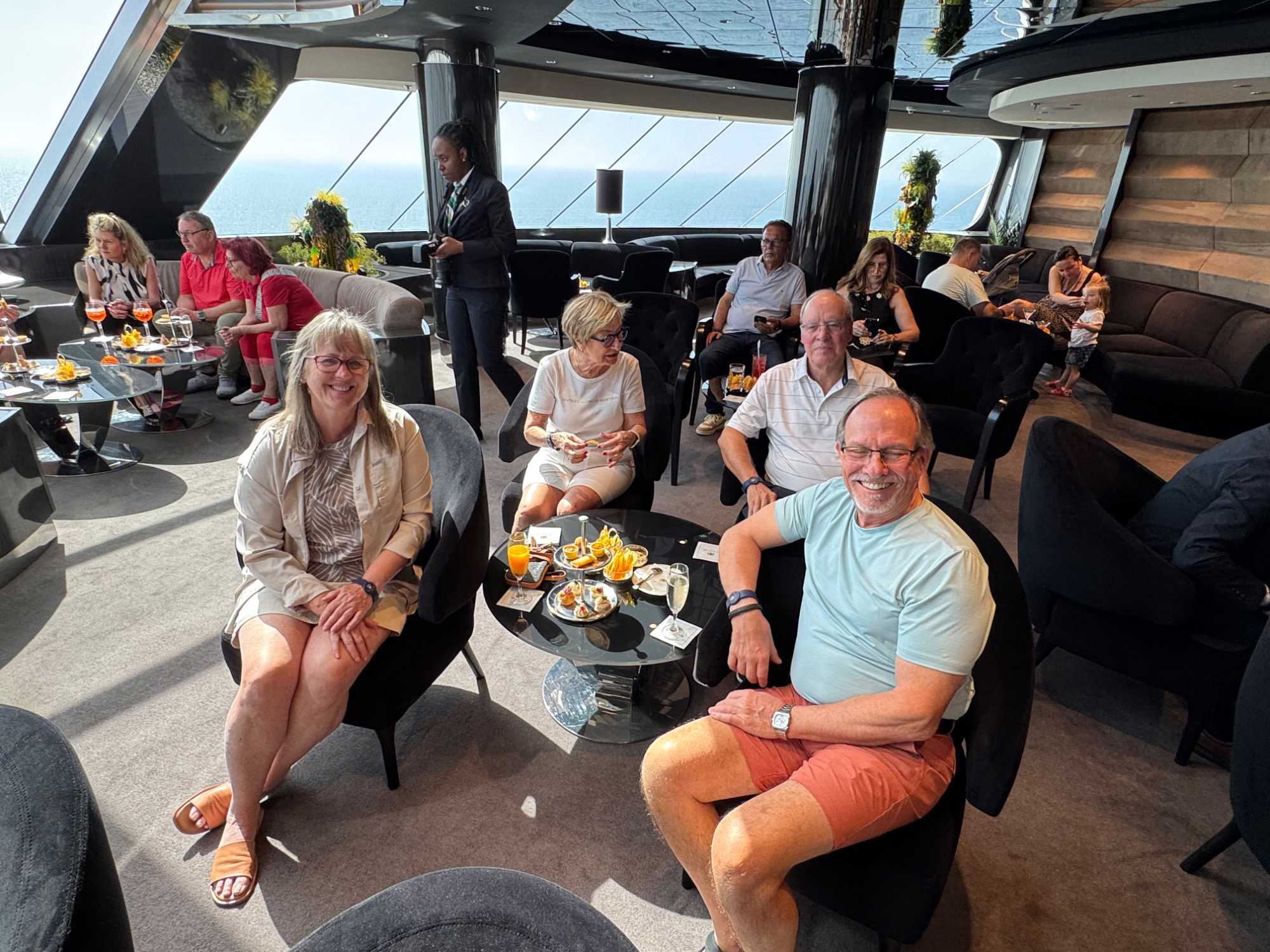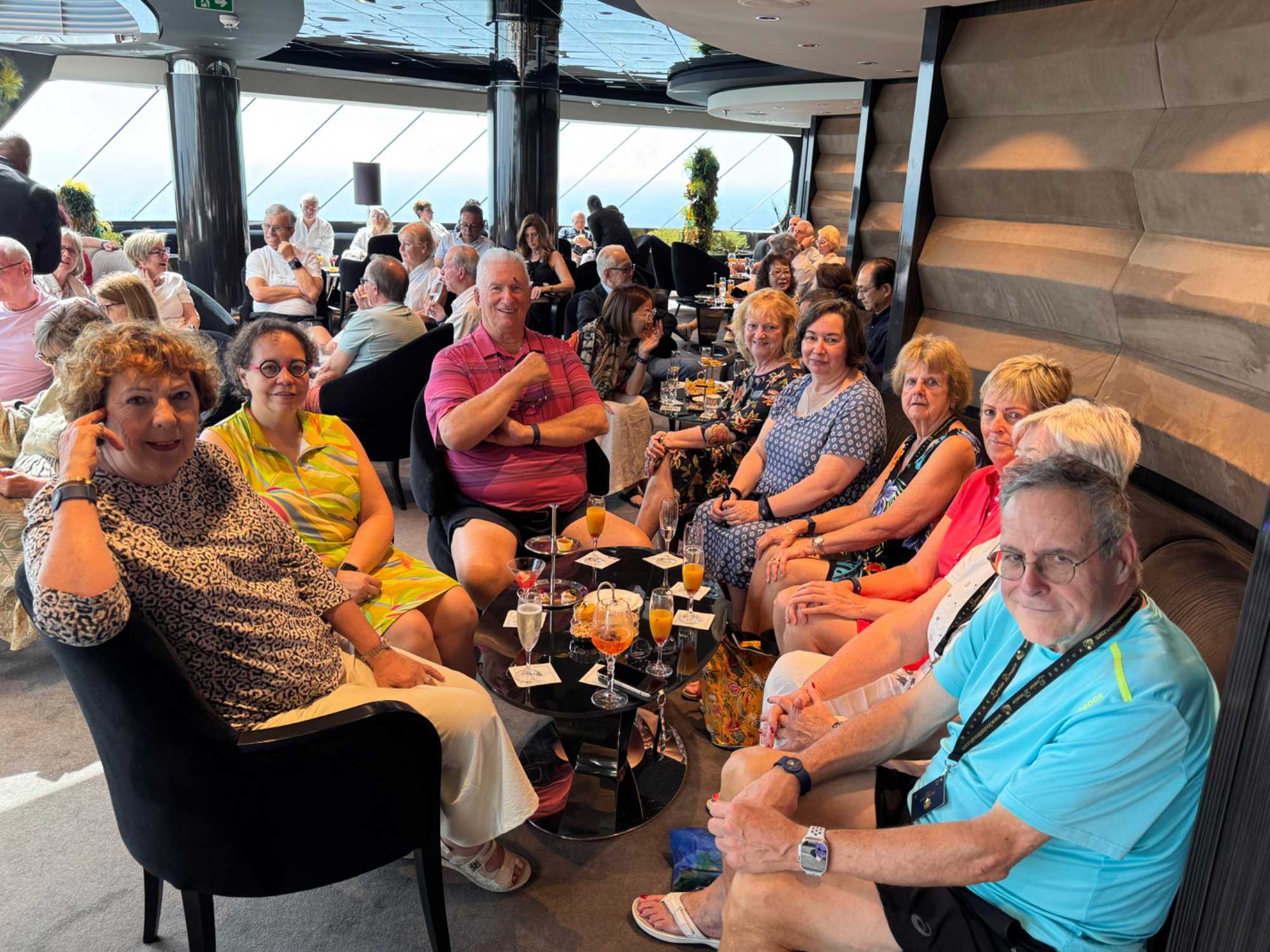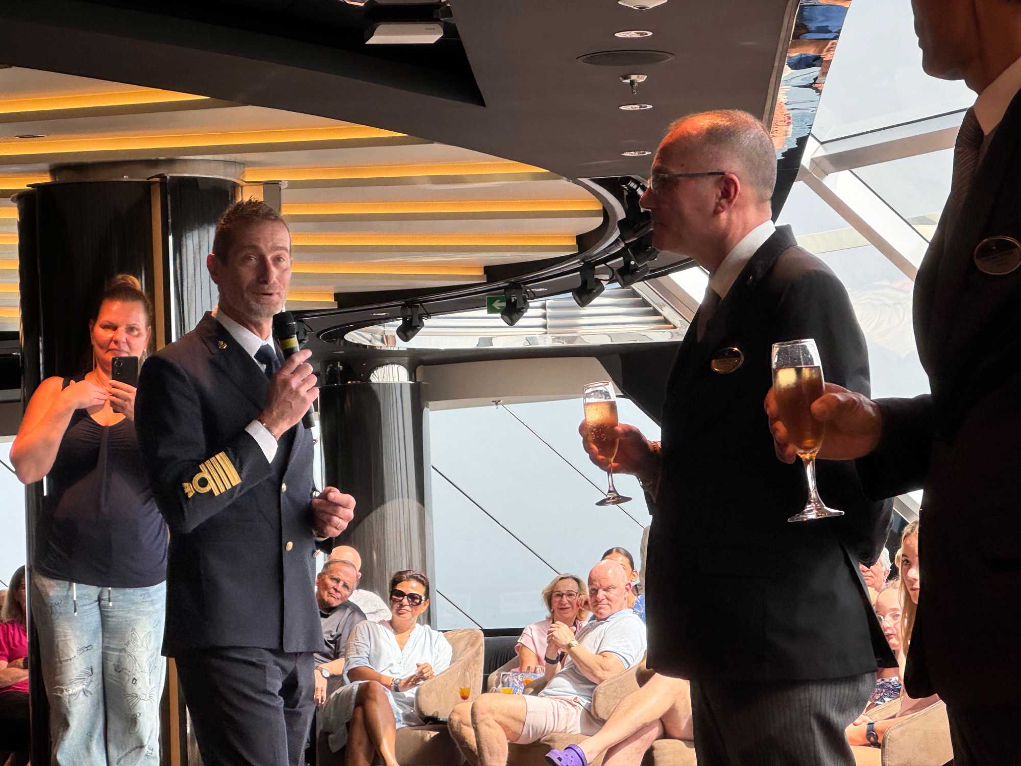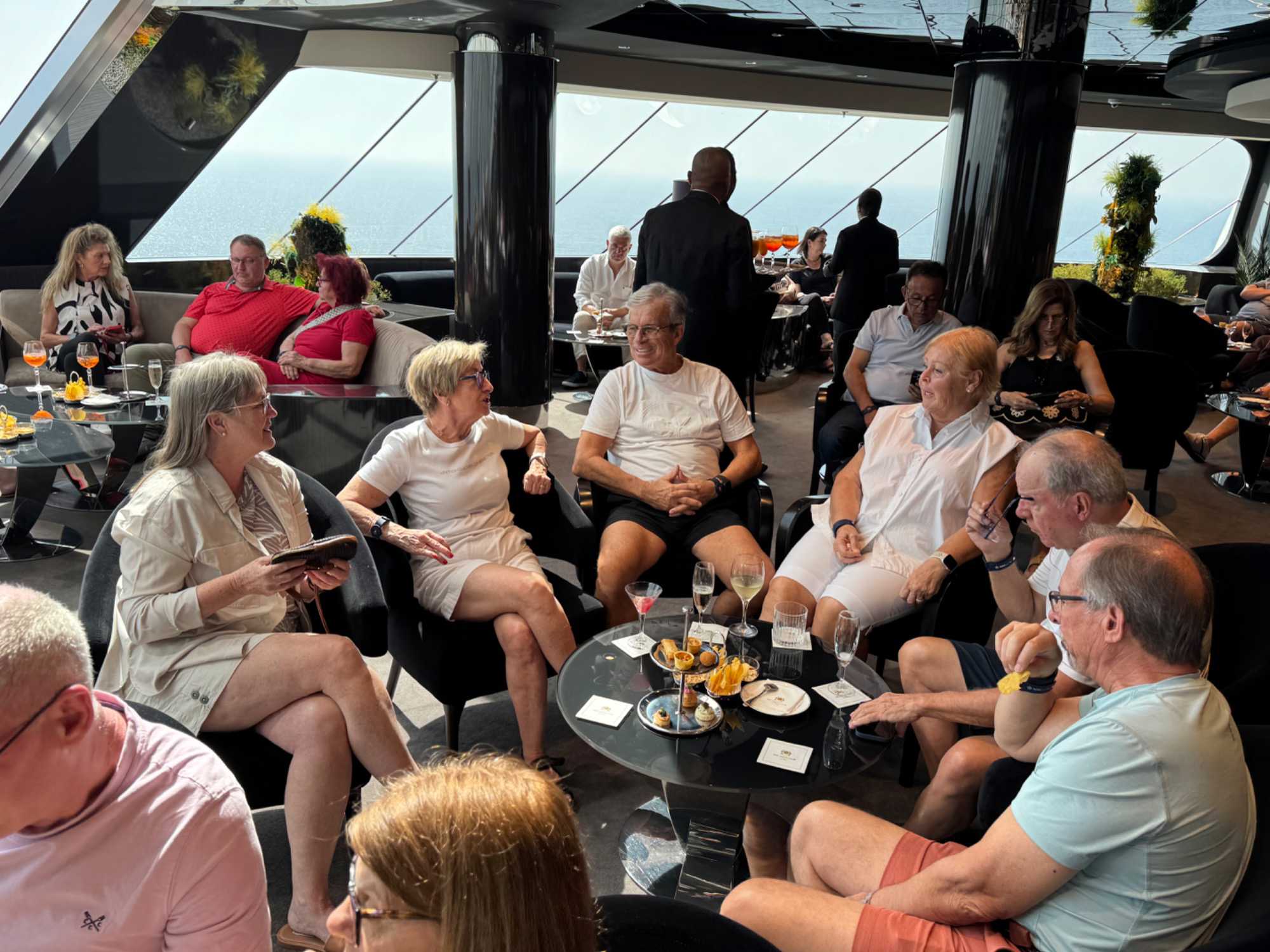 En fin de matinée, les passagers du Yacht Club sont conviés à un cocktail officiel dans le superbe salon privé. Ce moment privilégié permet de rencontrer l’équipe du Yacht Club, dont le professionnalisme, la gentillesse et l’attention constante se démarquent une fois de plus. Le commandant du navire prend également le temps de venir saluer les invités et de souhaiter la bienvenue, un geste fort apprécié. Le service, élégant et chaleureux, reflète parfaitement l’esprit du Yacht Club, où l’on se sent véritablement accueilli avec soin et considération. La présence du français à bord, tant dans les menus que dans le service, contribue grandement au confort et au sentiment de bien-être de tous.